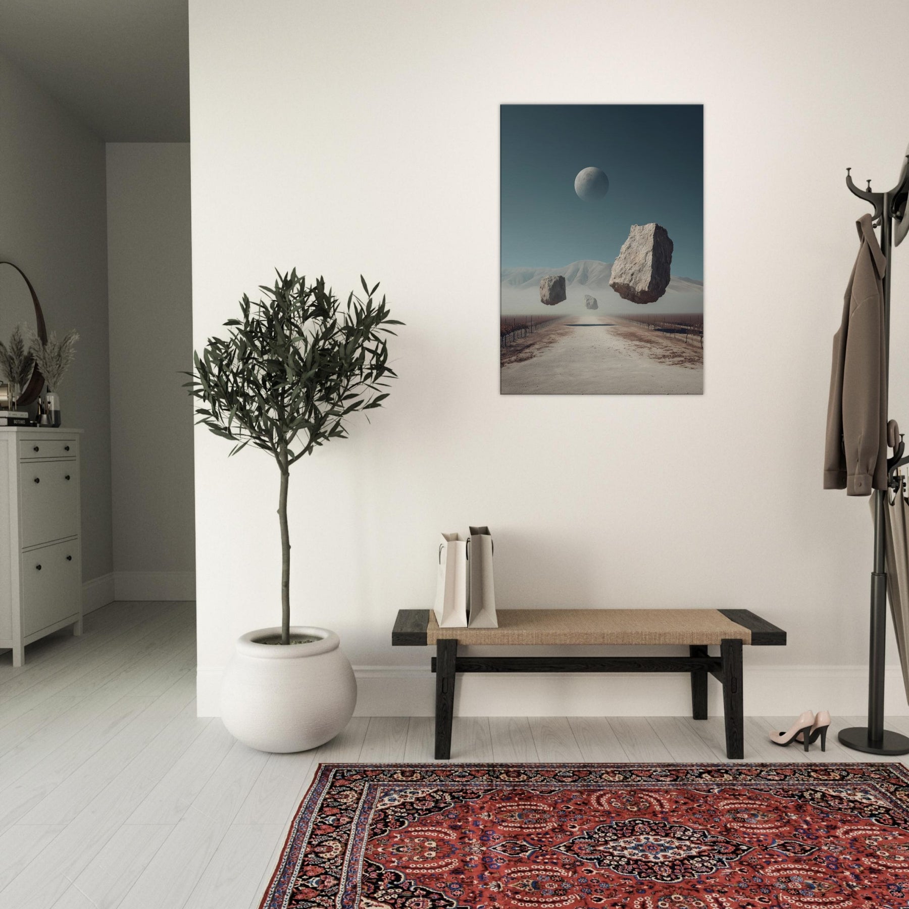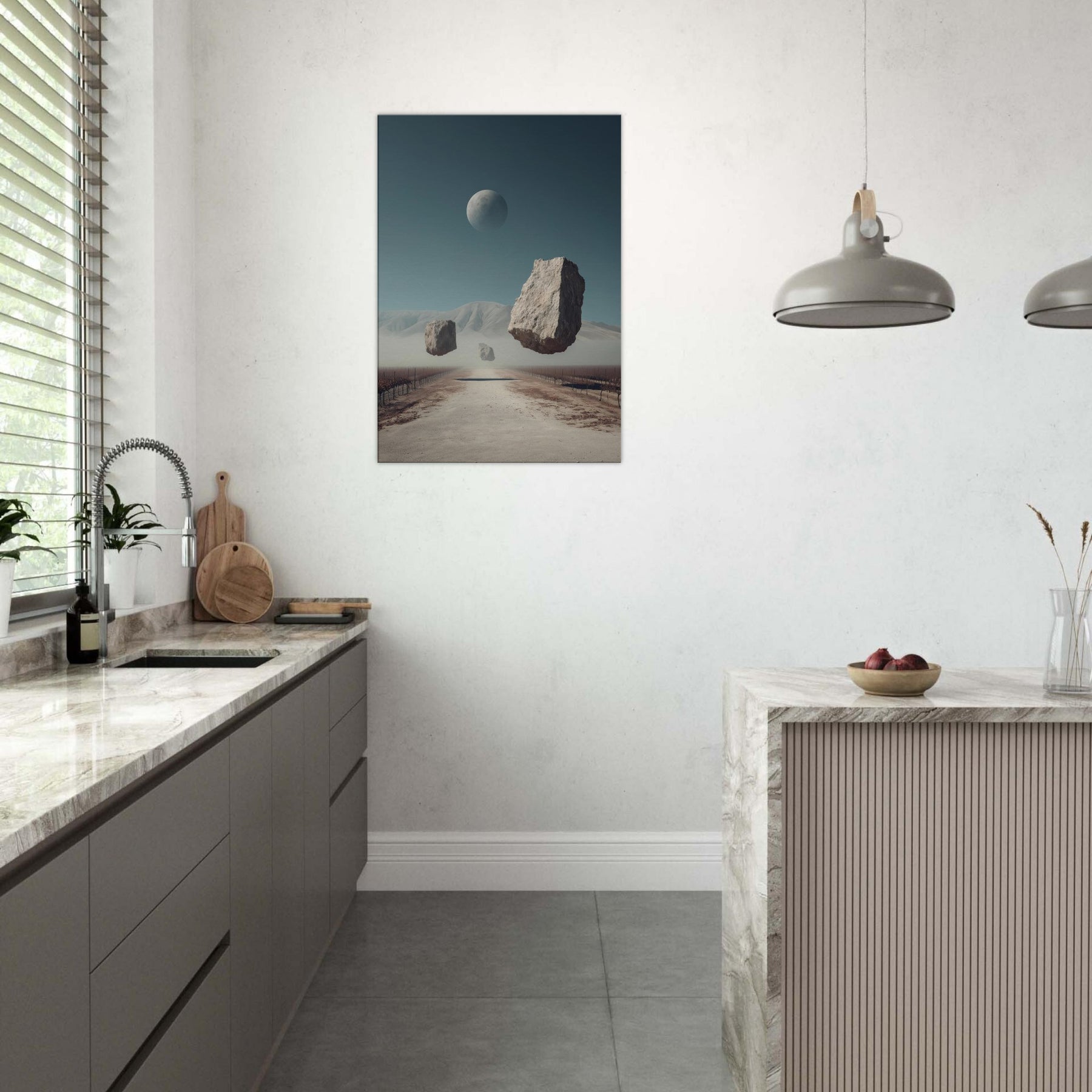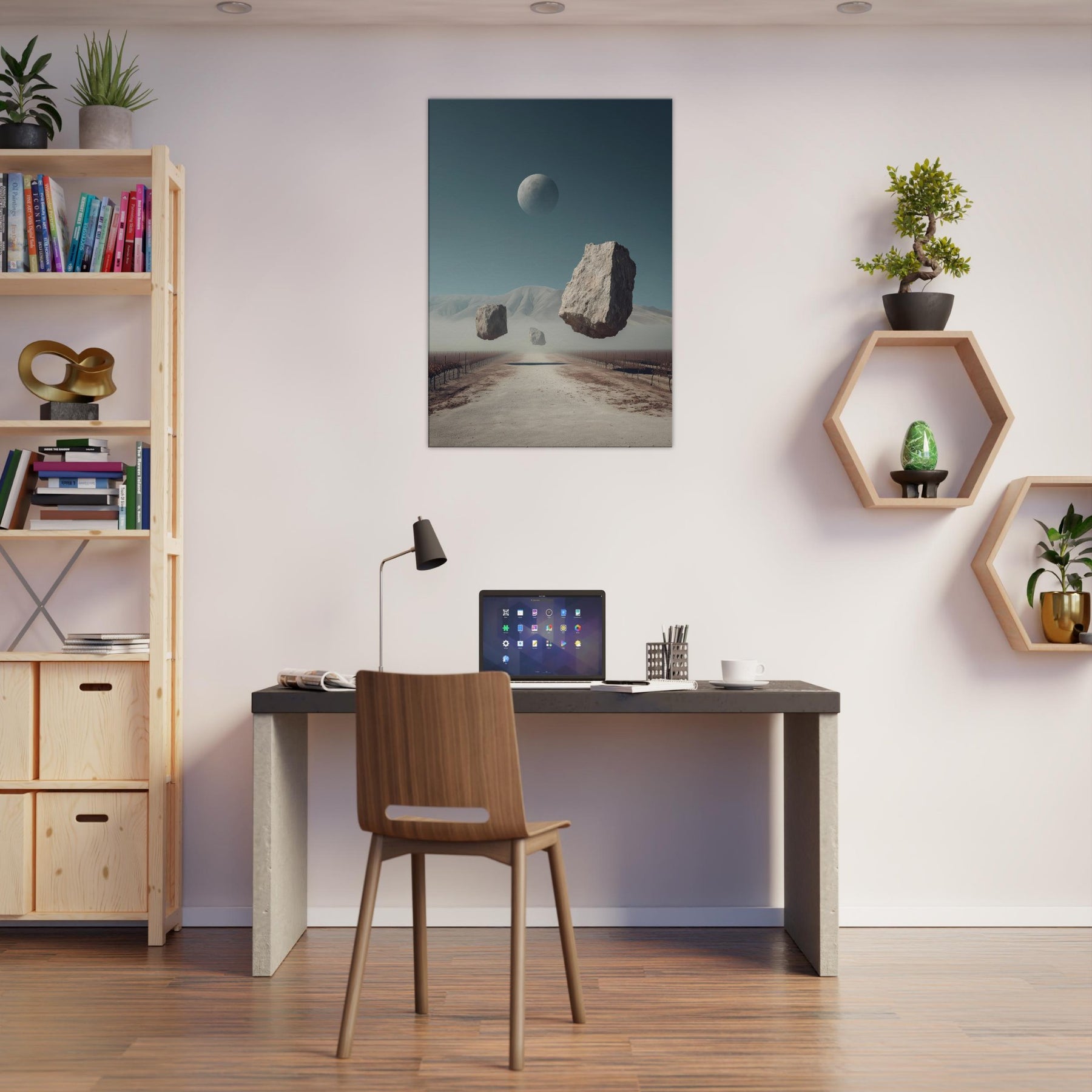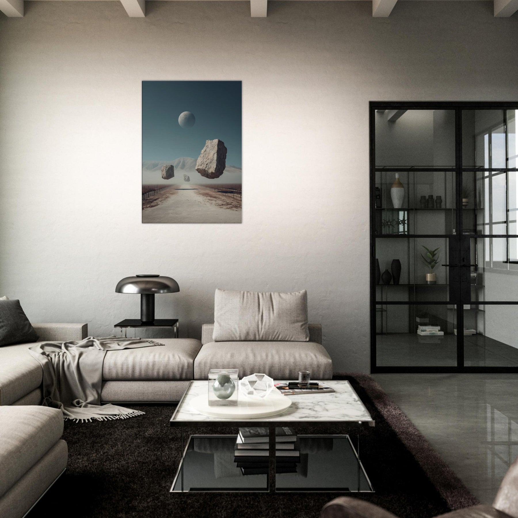 Within a dream tinged , the Vineyard reveals itself as a quiet cosmos: levitating boulders hover above a pale road, a distant vineyard row recedes into fog, and a cool moon sinks into a velvet sky. The scene bathes a room in ethereal light, inviting stillness, curiosity, and spaciousness. This surreal composition turns everyday space into a portal of wonder, perfect for a living room or study where conversation drifts like wind between rock and vine.