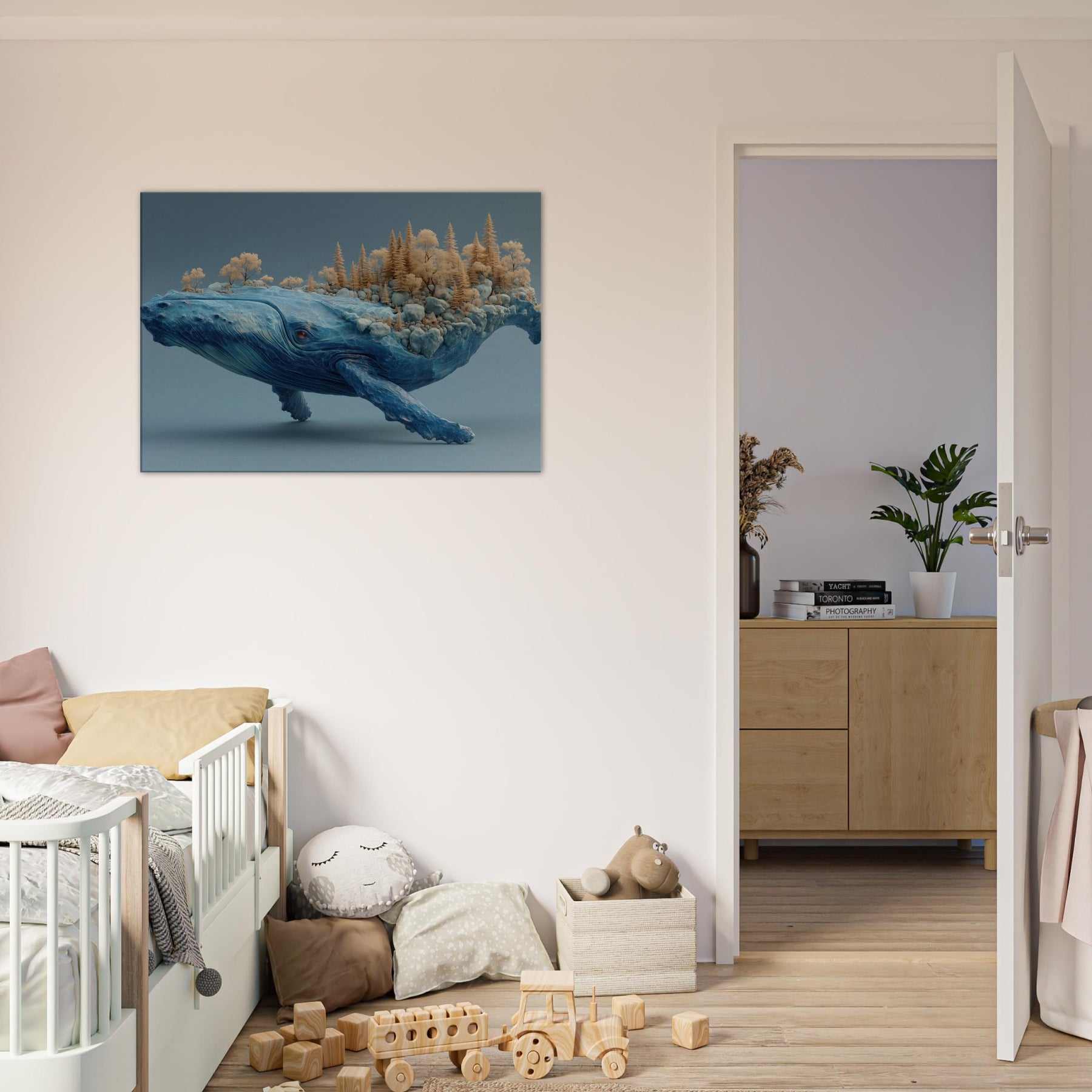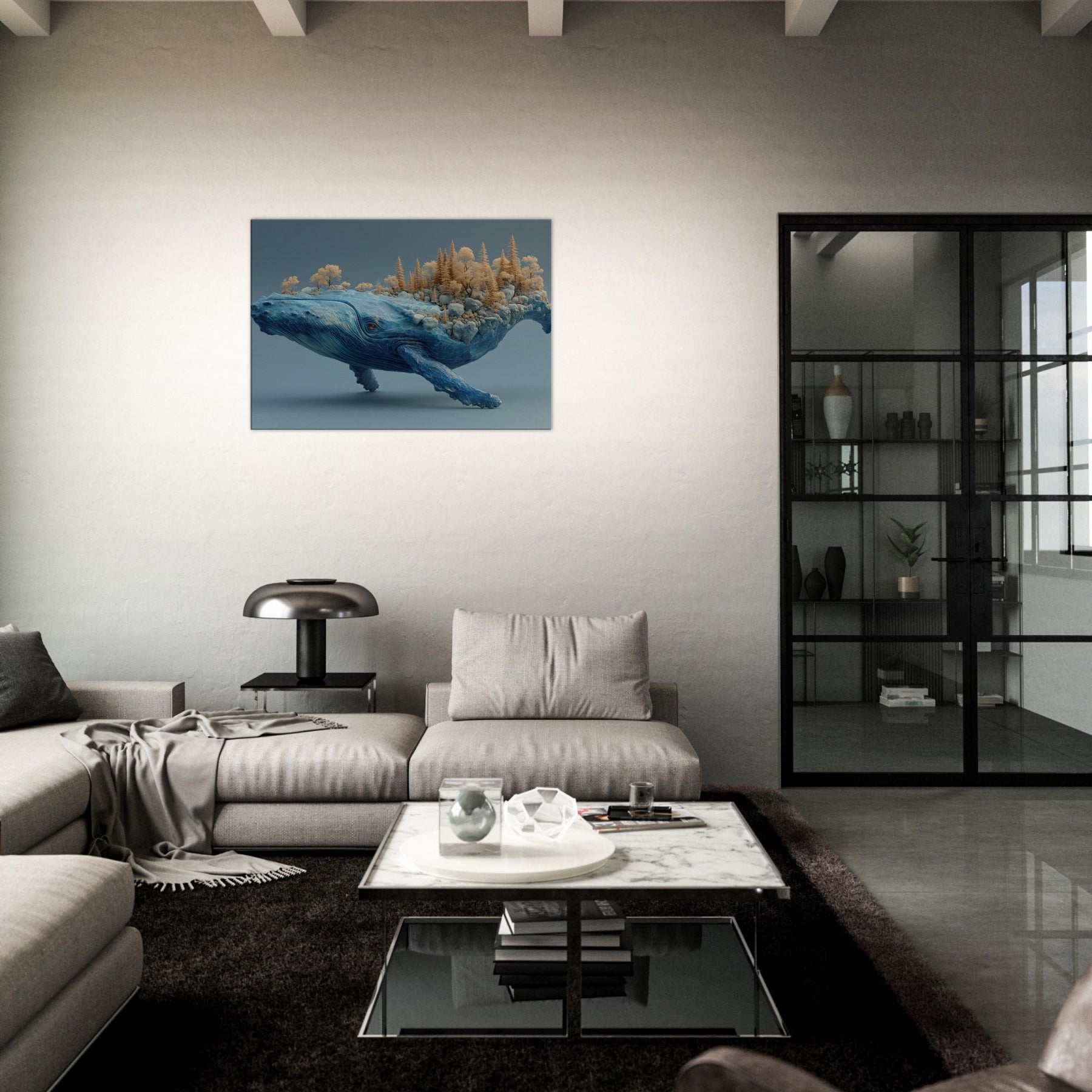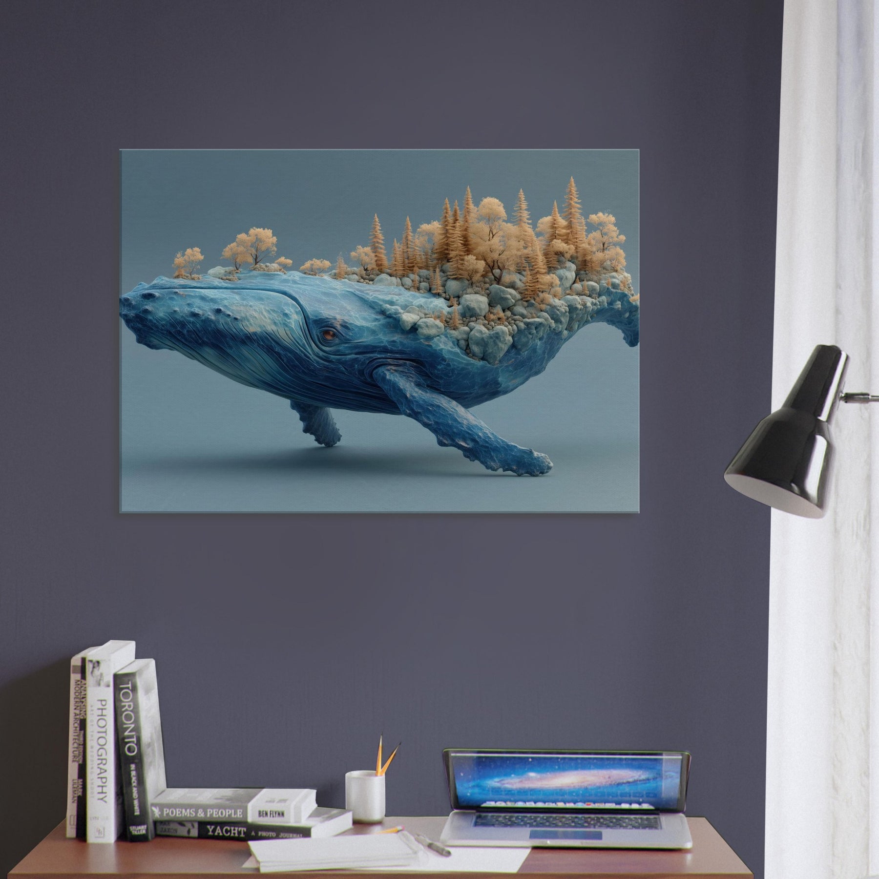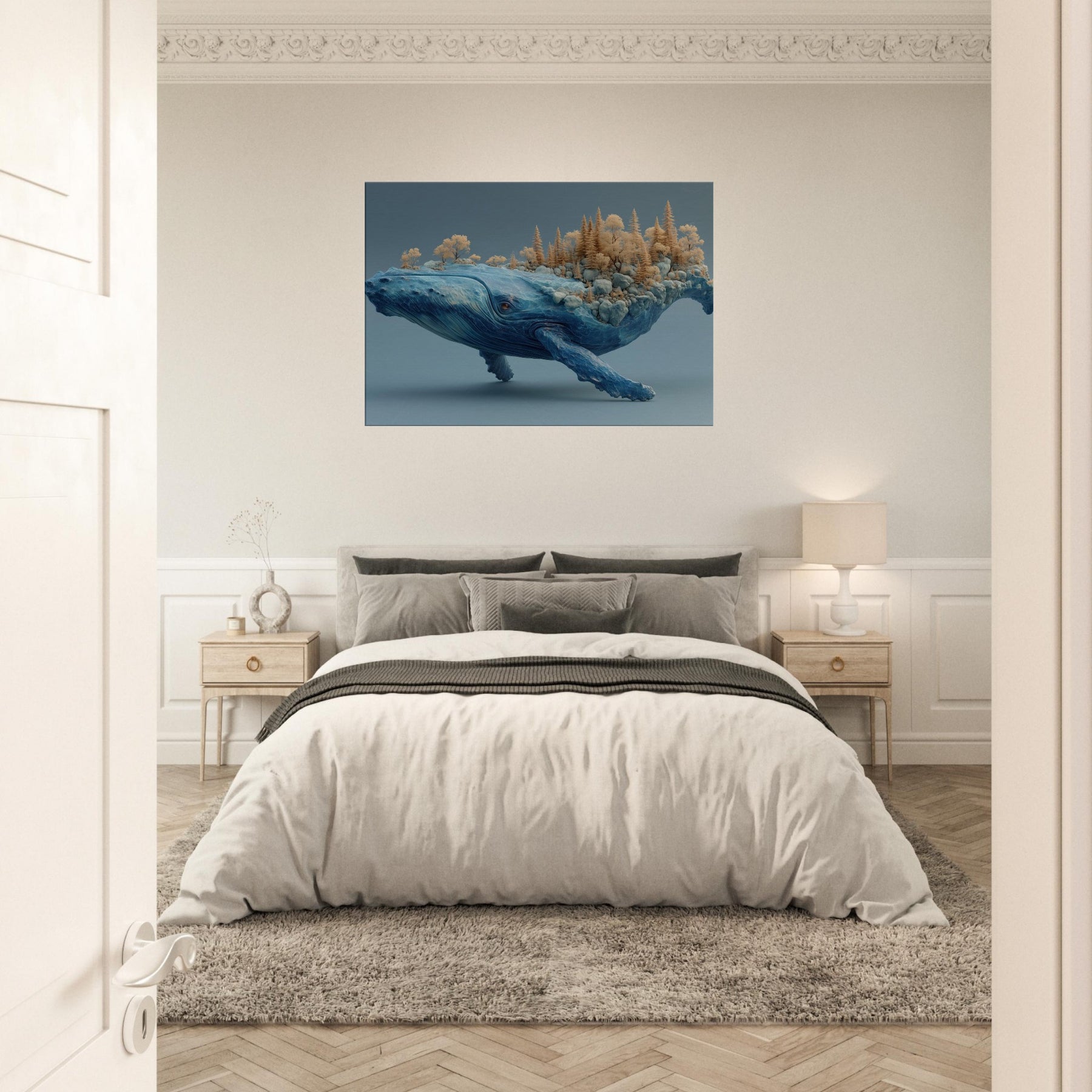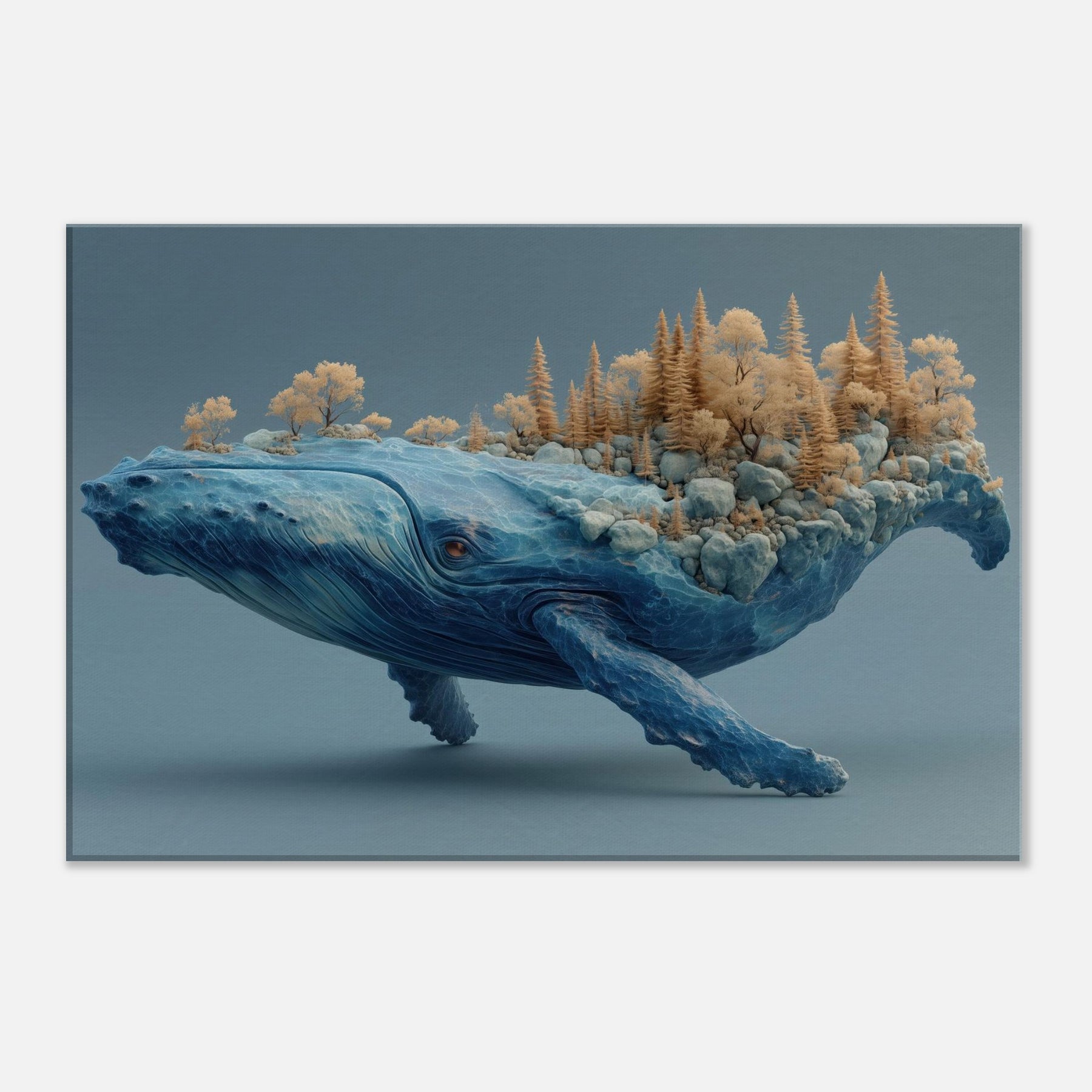 An improbable shoreline drifts along the whale's back, where terraced rocks cradle a tiny forest of golden trees. The creature's vast blue form hums with oceanic memory, every crease a tide, every ripple a whisper. Lighting soft as dawn spills across marble skies, inviting calm and wonder into a living room or study. This piece turns a wall into a voyage a meditative horizon that invites slow breathing, conversation, and the feeling that nature can ride within us.