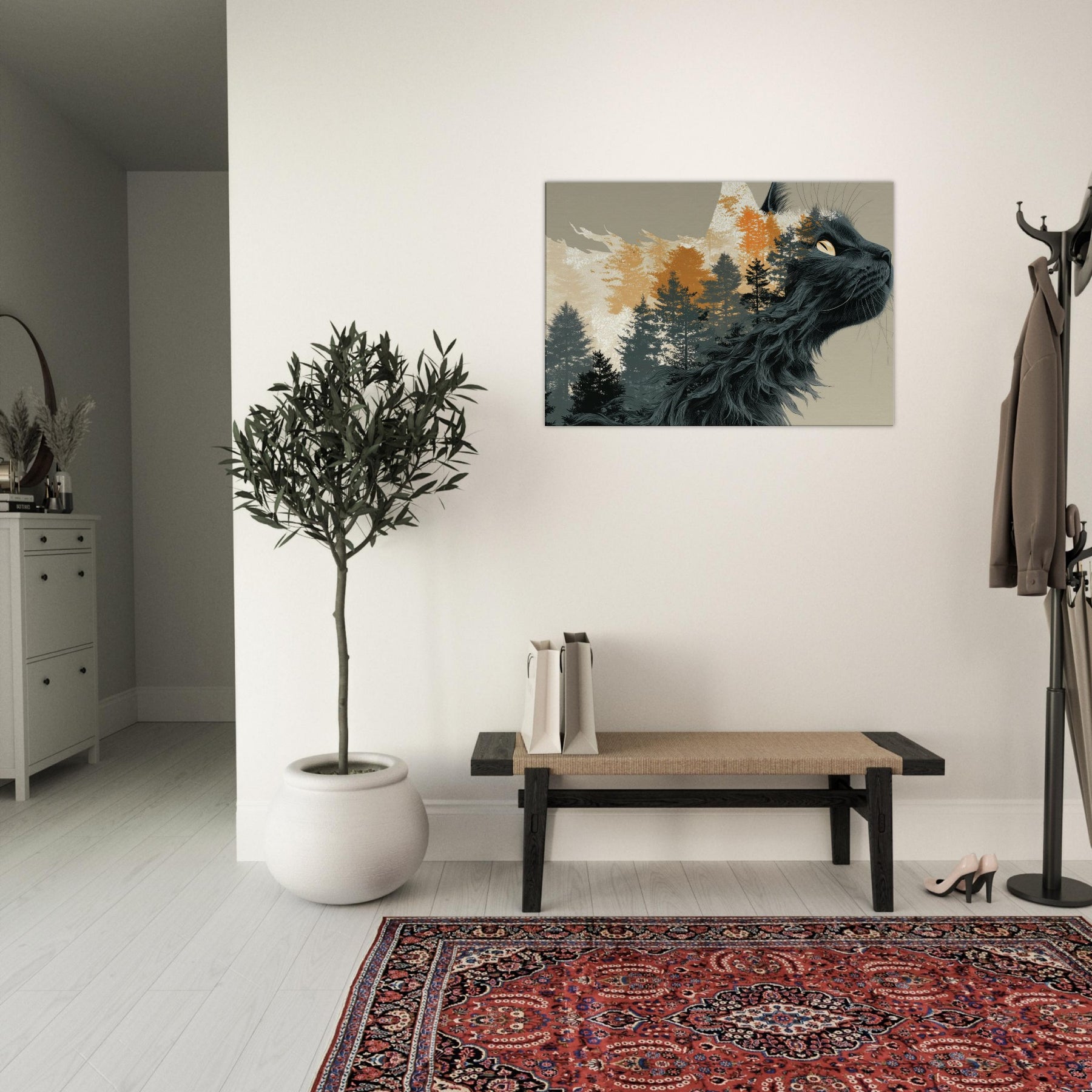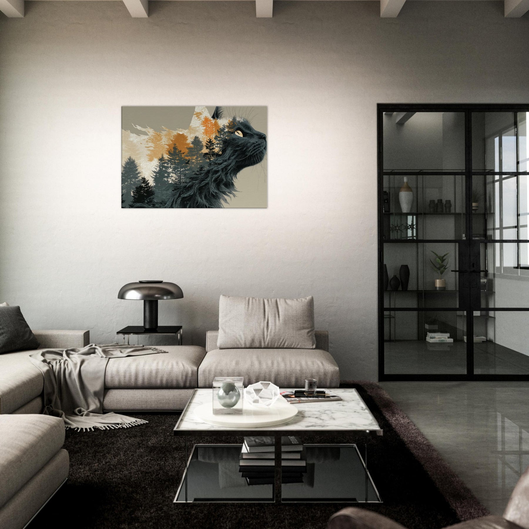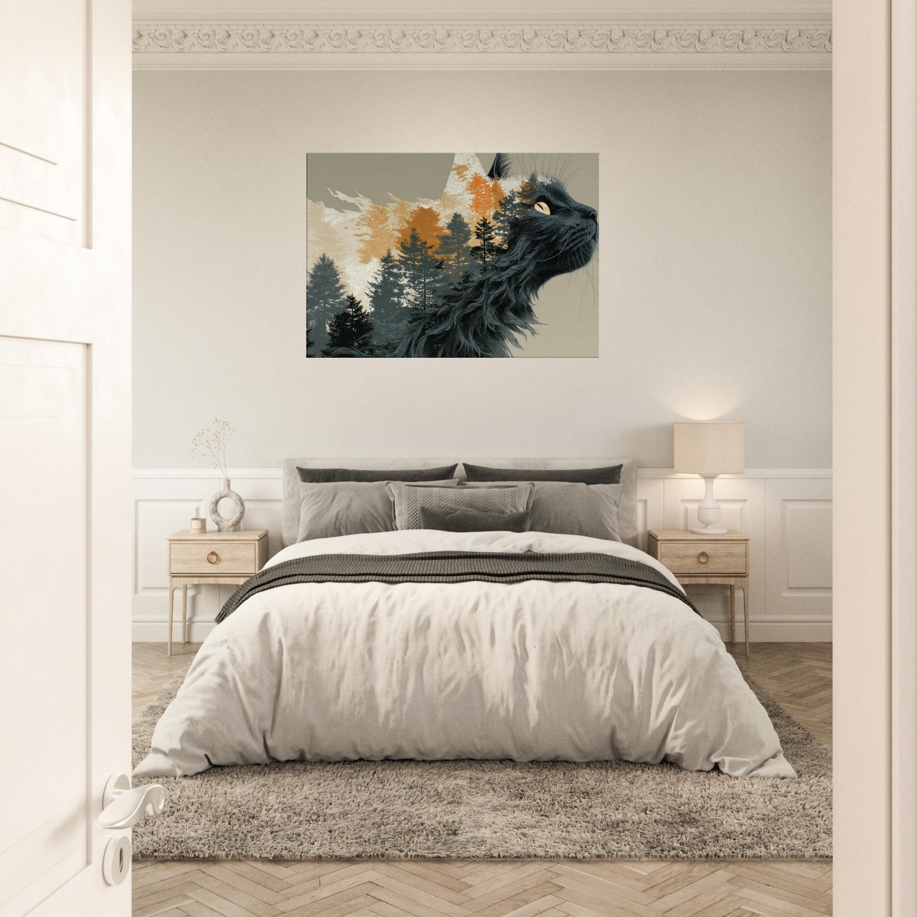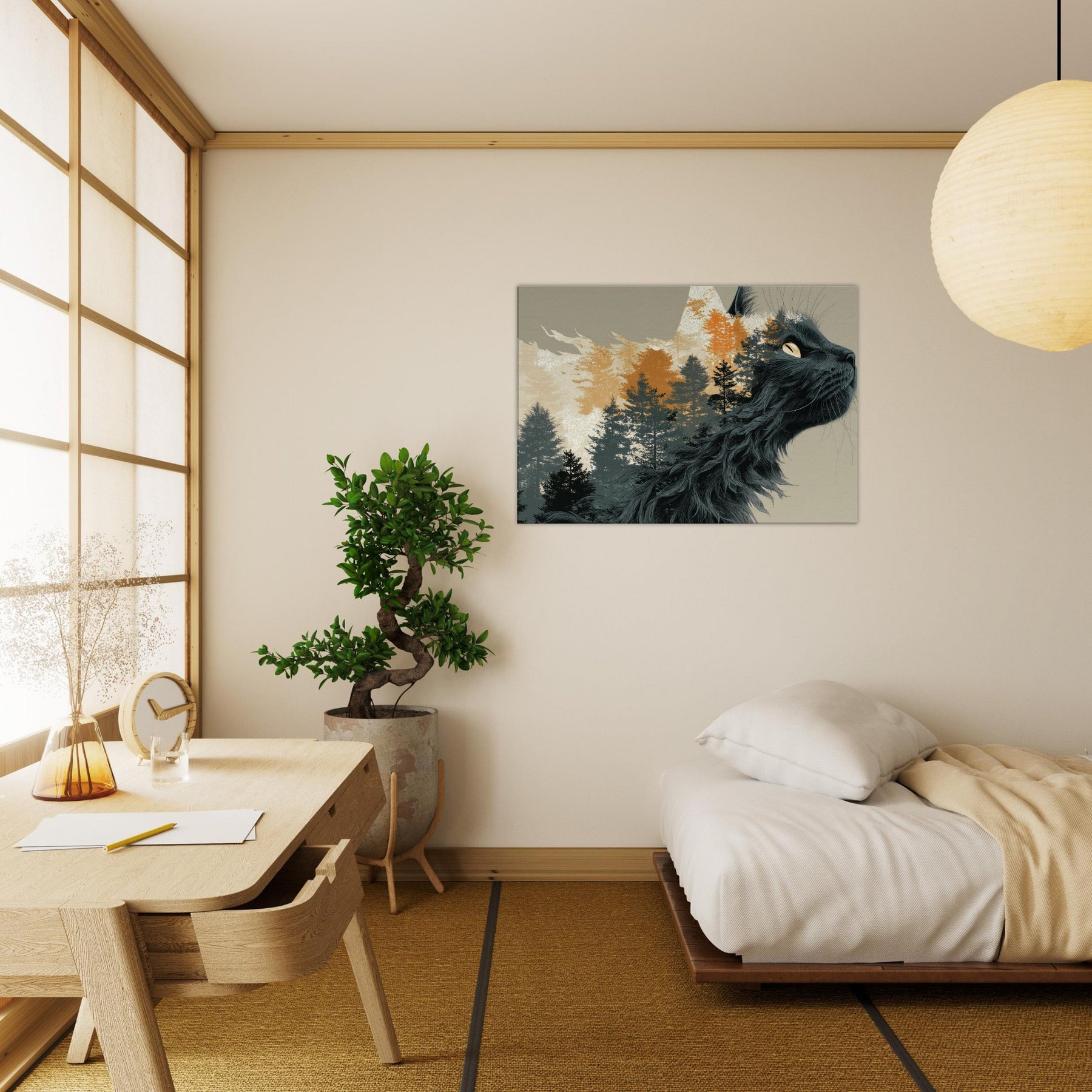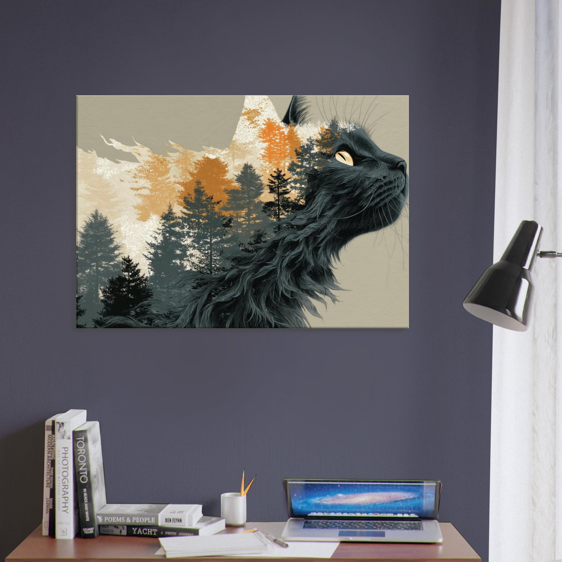 Between dream and daylight, this Cat rises over a forest that breathes in layers of shadow and flame. The surreal panorama blends charcoal fur with orange and ivory pines, inviting the eye to wander and rest. Its reverent gaze catches the room's light, turning walls into a gentle dusk. A statement piece that echoes the hush of a late afternoon, it enriches a reading nook or gallery wall with texture, depth, and a whisper of otherworldly calm.