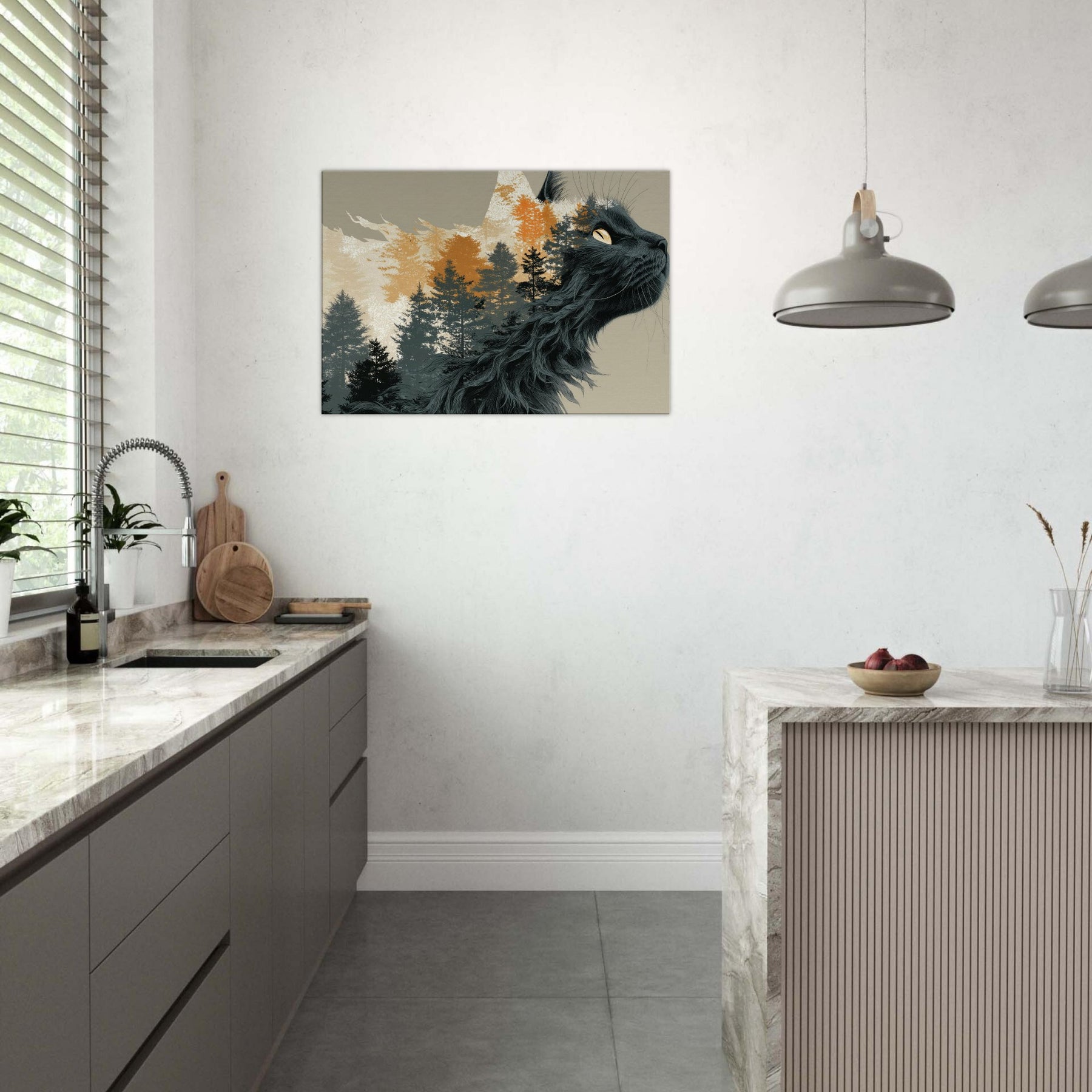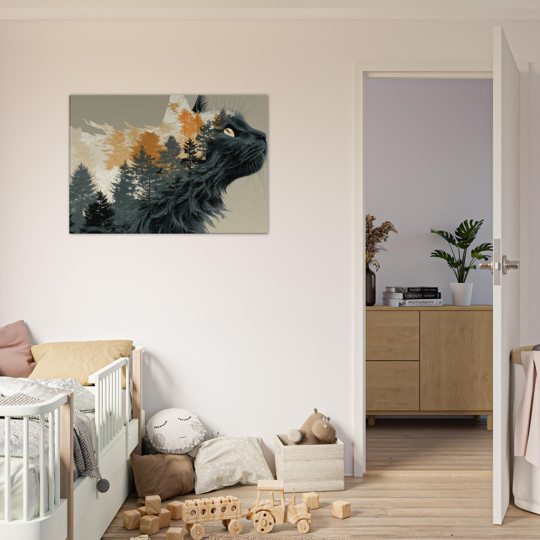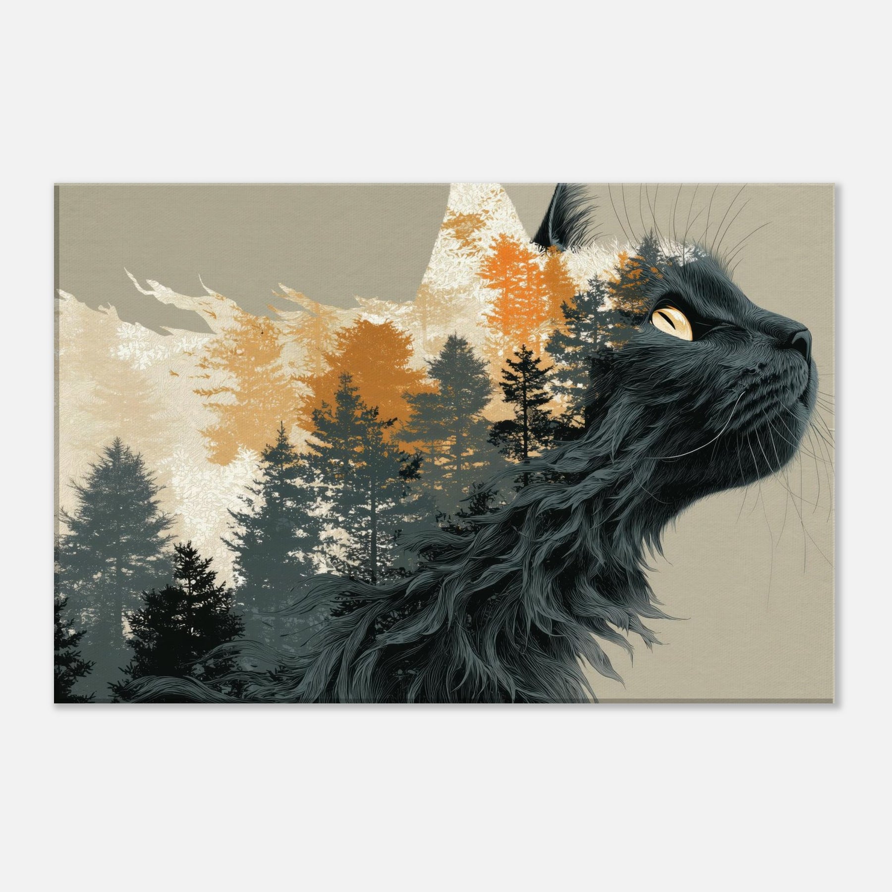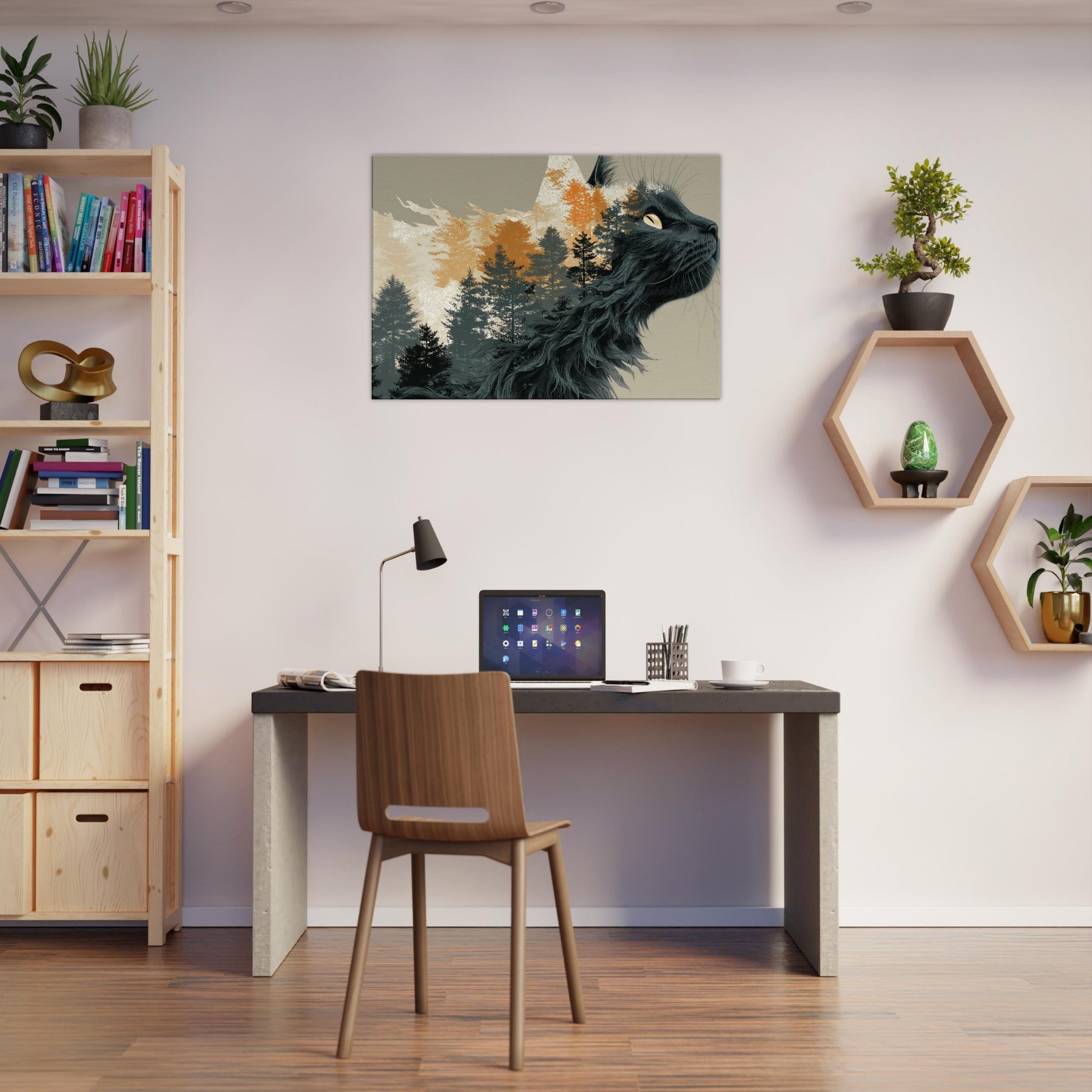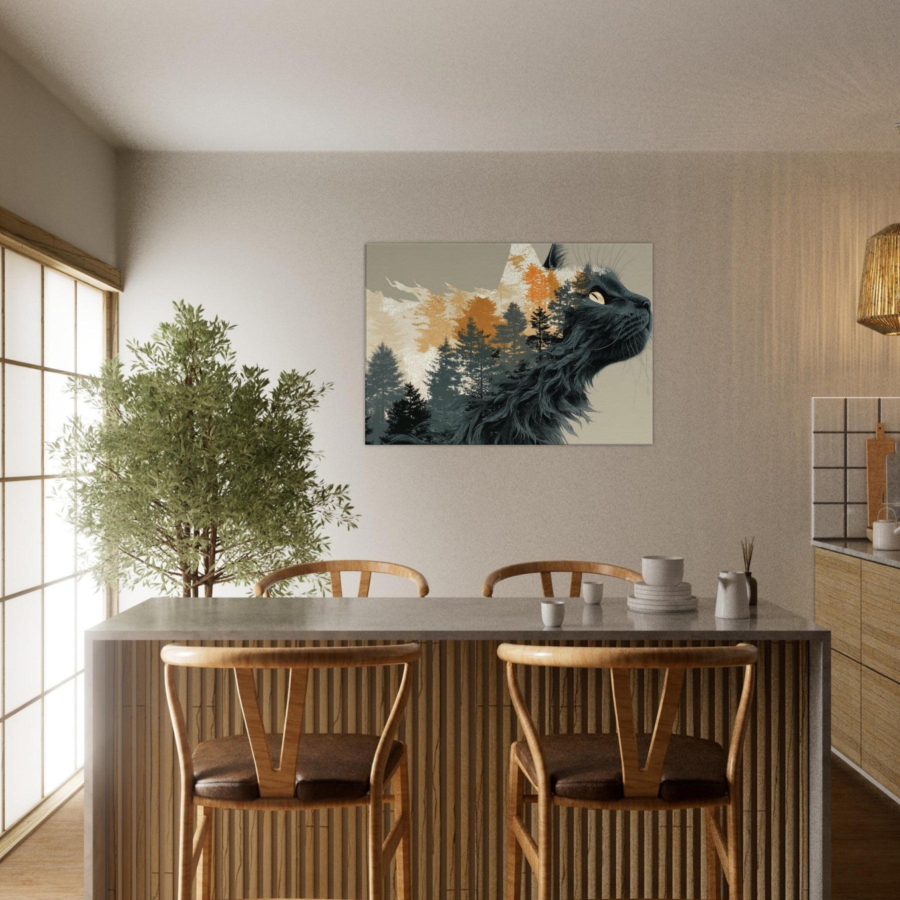 Between dream and daylight, this Cat rises over a forest that breathes in layers of shadow and flame. The surreal panorama blends charcoal fur with orange and ivory pines, inviting the eye to wander and rest. Its reverent gaze catches the room's light, turning walls into a gentle dusk. A statement piece that echoes the hush of a late afternoon, it enriches a reading nook or gallery wall with texture, depth, and a whisper of otherworldly calm.
