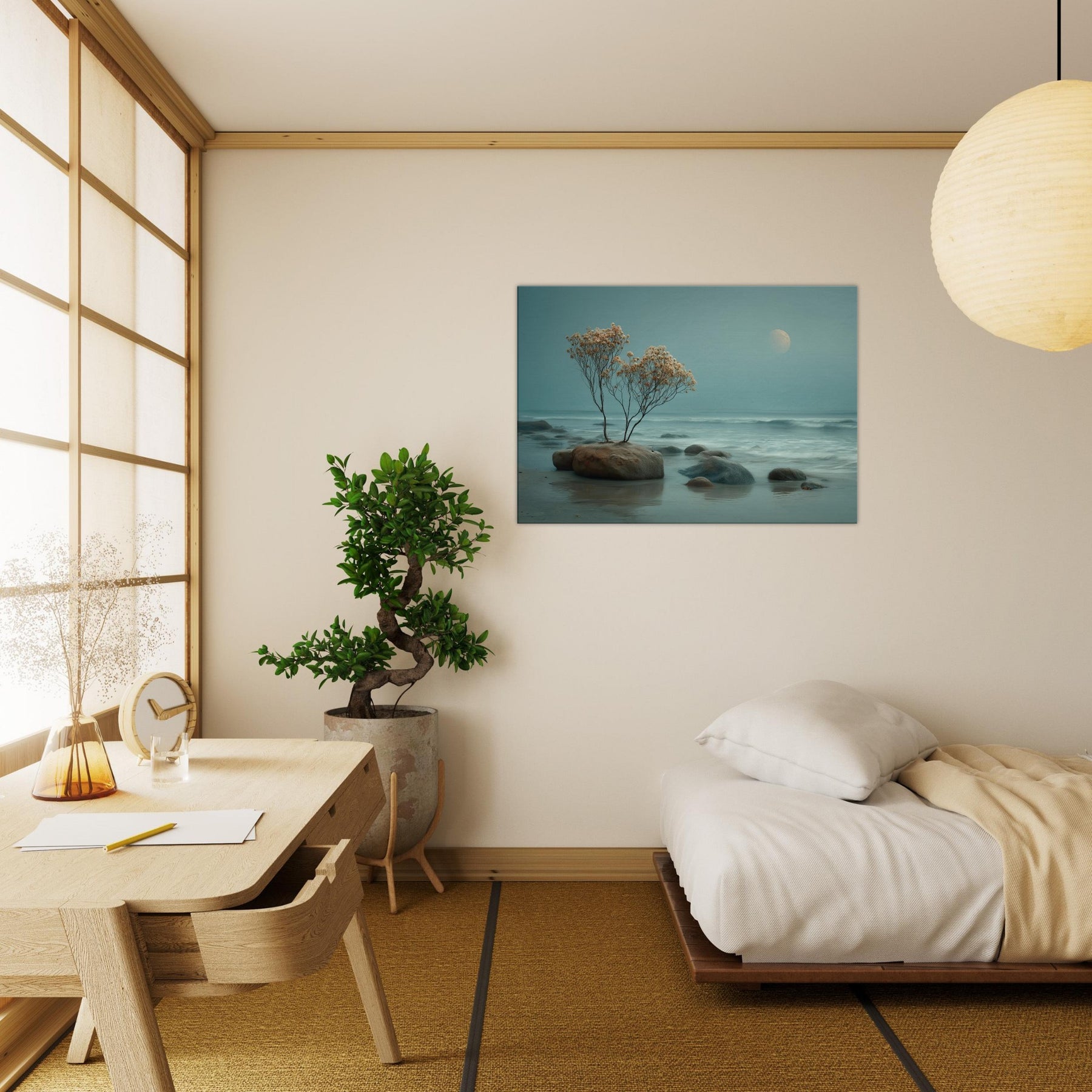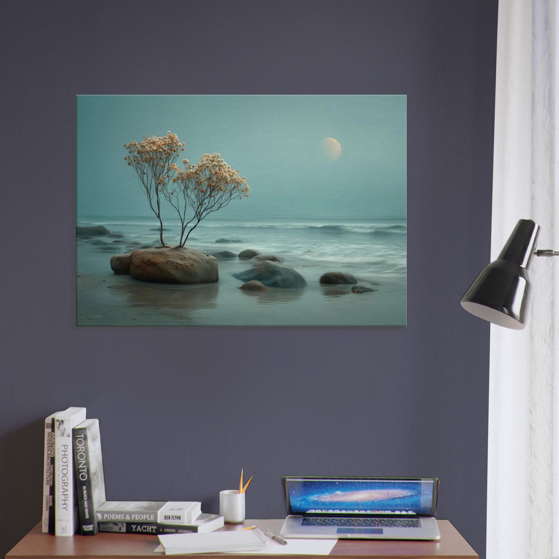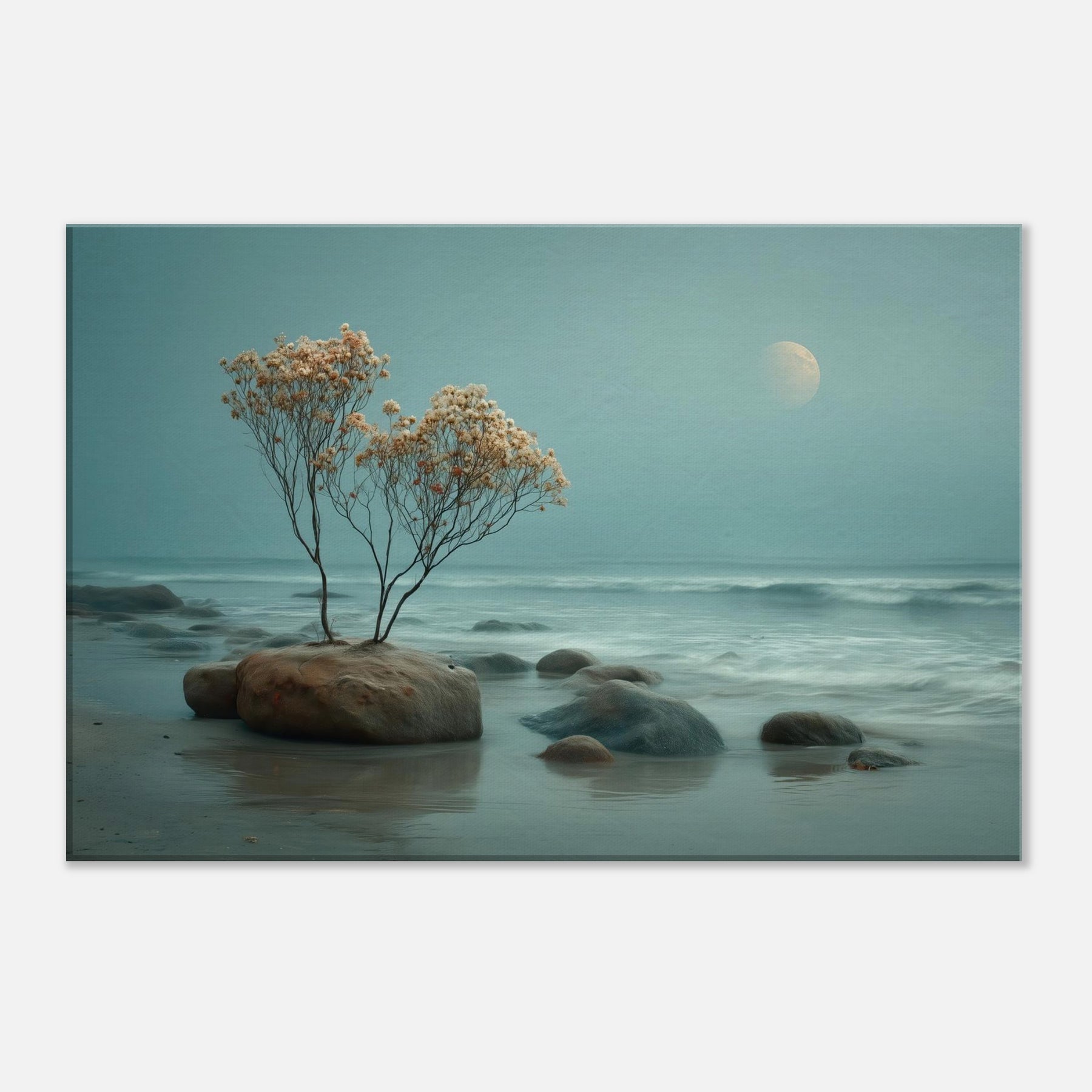 On a solitary rock, a delicate tree leans toward a sea of glass, branches scattering blossoms like distant stars. This surreal Beach scene invites the mind to drift beyond shoreline boundaries, where tide and time blur. The atmosphere hums with pale turquoise light, and the moon lingers as a silent witness to a gentle, improbable miracle. Hang it in a living room or studio to soften corners with dreamlike calm and invite quiet reflection.