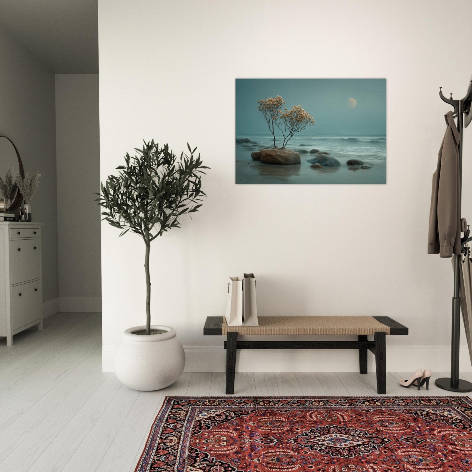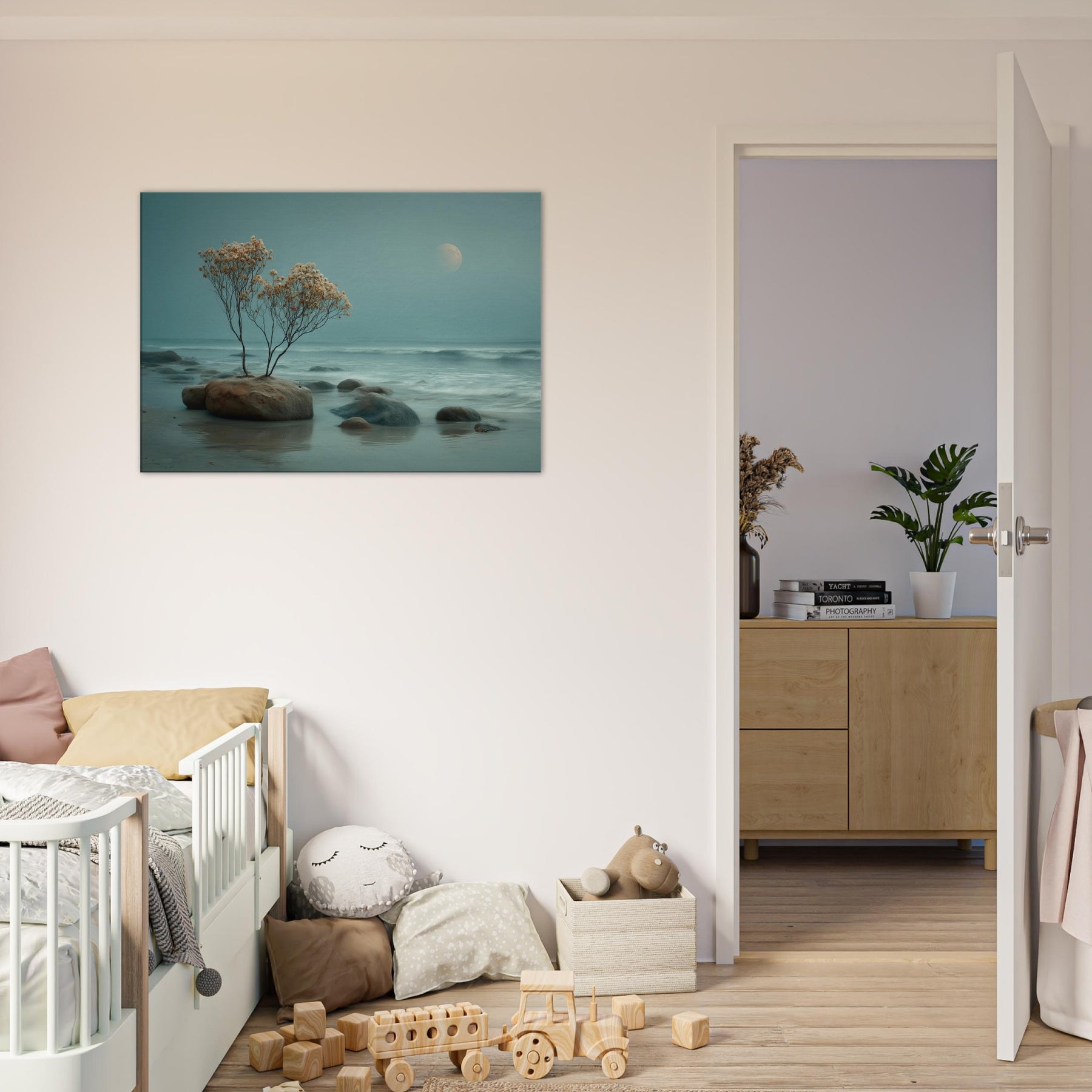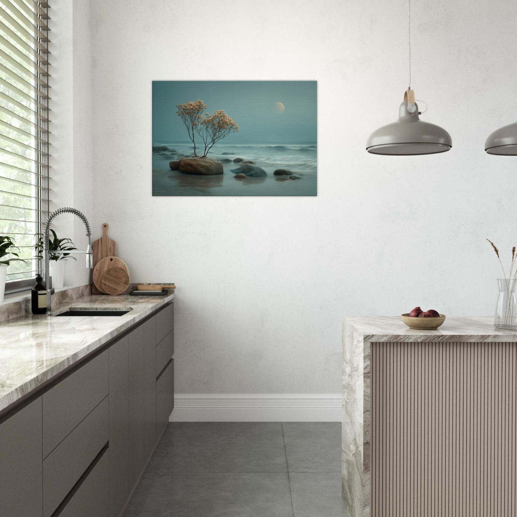 On a solitary rock, a delicate tree leans toward a sea of glass, branches scattering blossoms like distant stars. This surreal Beach scene invites the mind to drift beyond shoreline boundaries, where tide and time blur. The atmosphere hums with pale turquoise light, and the moon lingers as a silent witness to a gentle, improbable miracle. Hang it in a living room or studio to soften corners with dreamlike calm and invite quiet reflection.