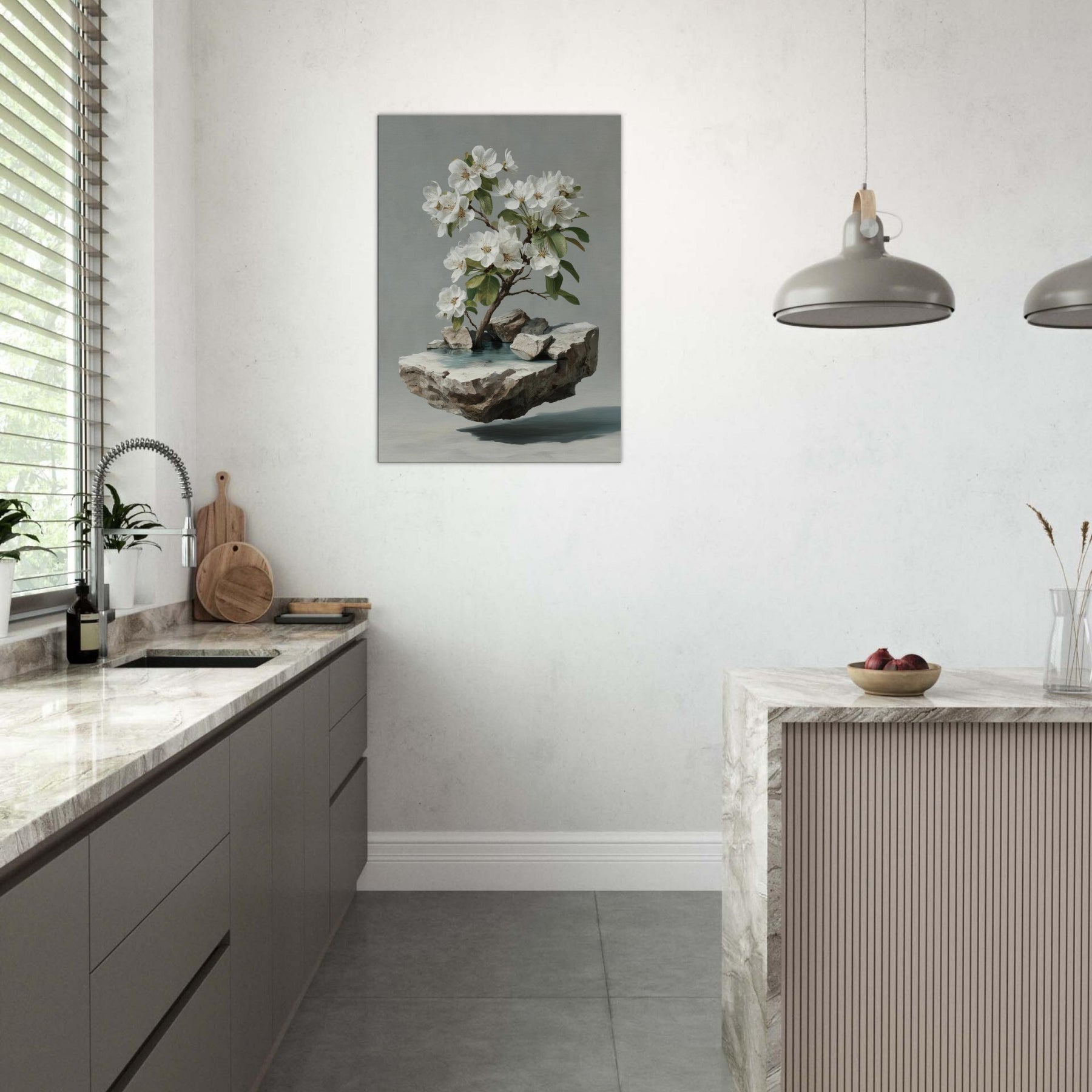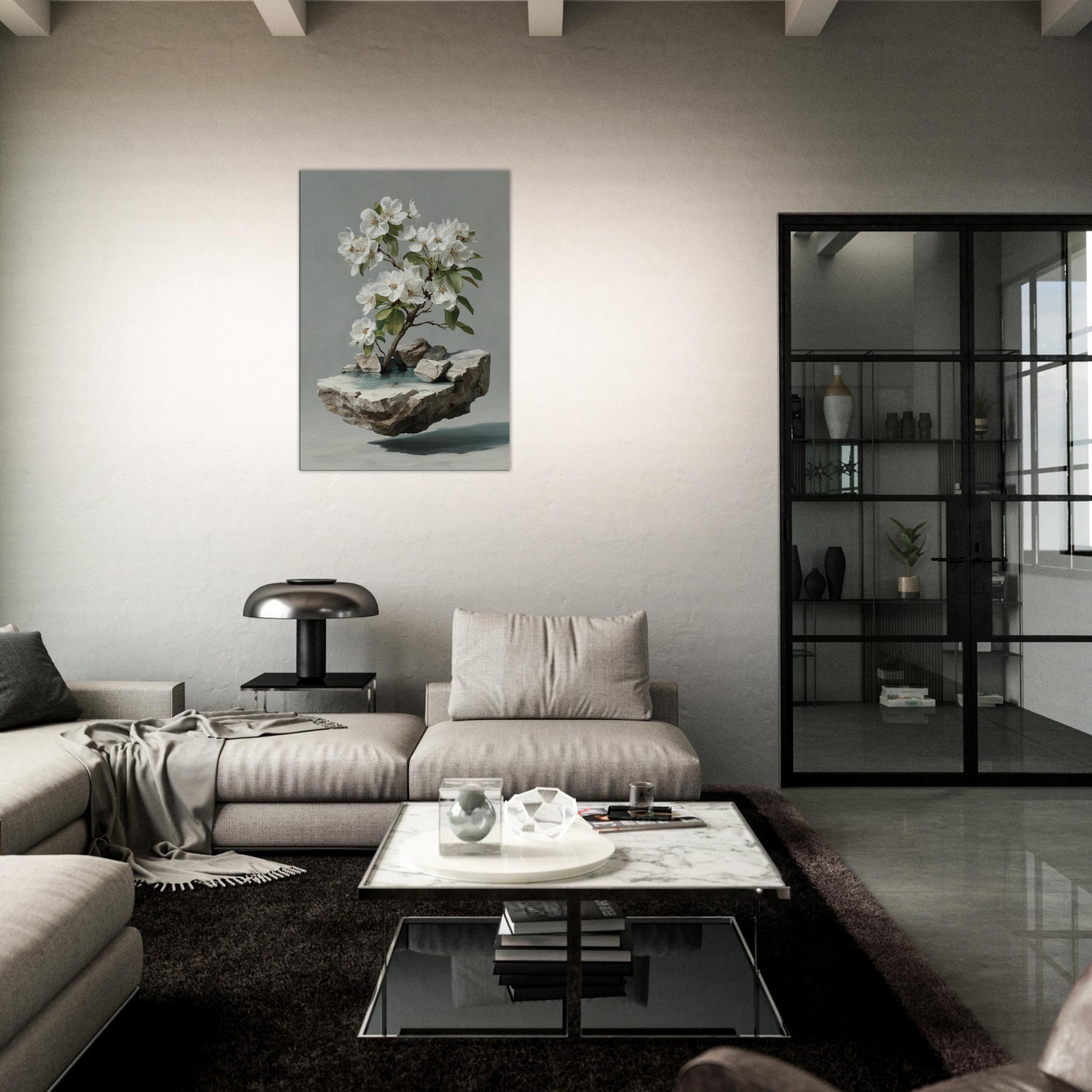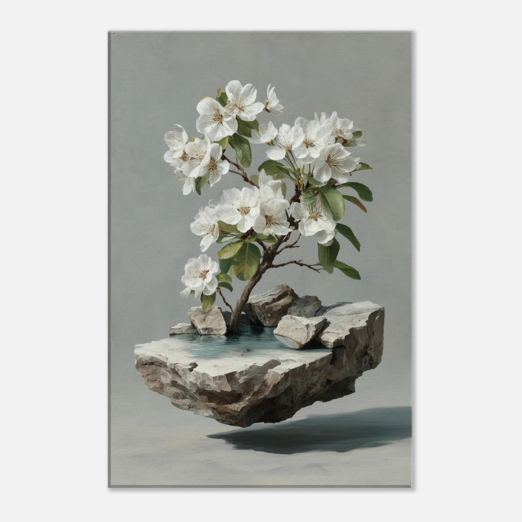 A dreamlike duet of growth and gravity, this piece presents a Plum Blossom tree sprouting from a jagged rock that floats above a quiet pool. The white blossoms glow with soft light, while shadow and mineral texture ground the scene in tangible tenderness. In a living room, it becomes a whispering window an invitation to slow breath, to notice resilience, and to feel the delicate balance between fragility and strength. A surreal nature meditation that elevates space with calm, poetic presence.