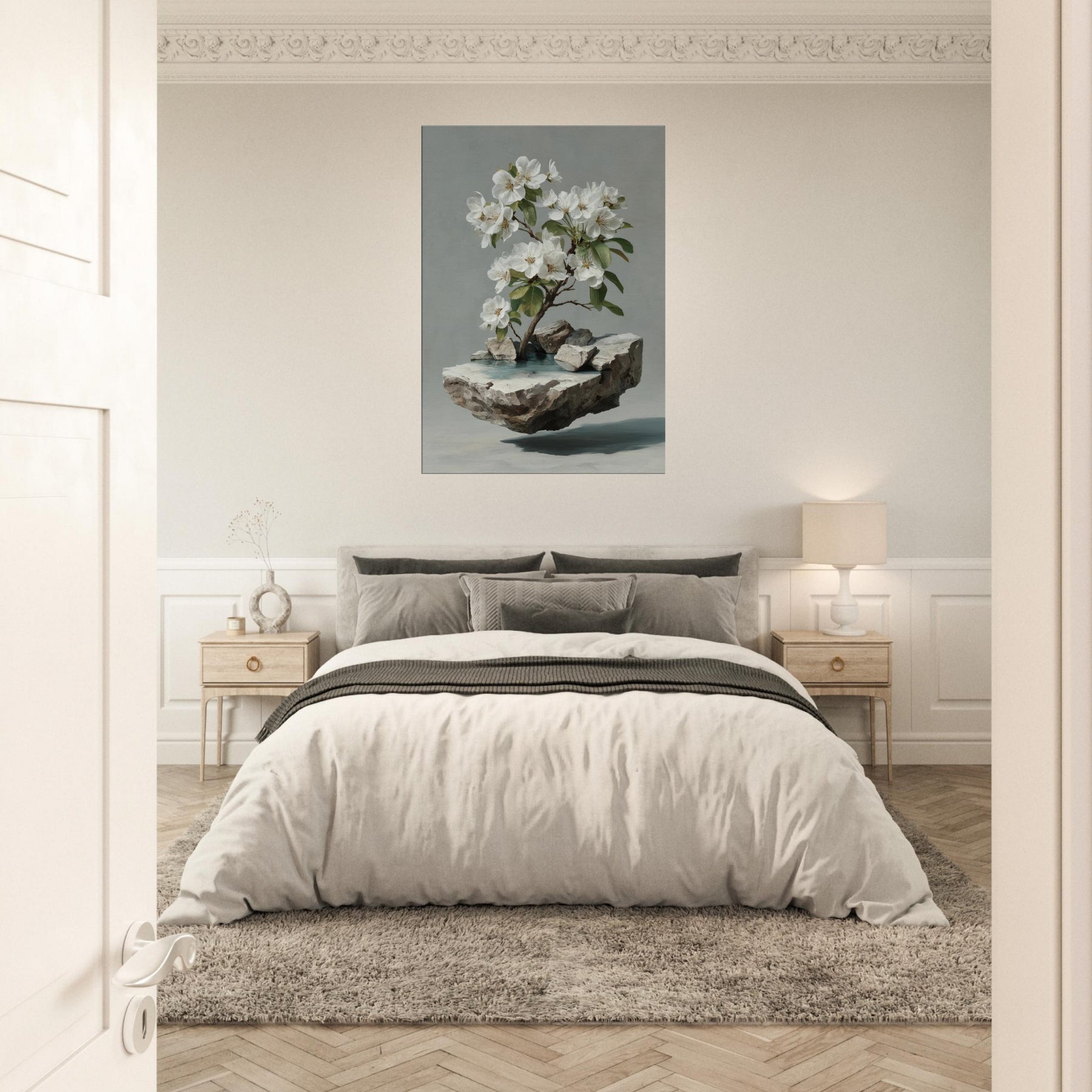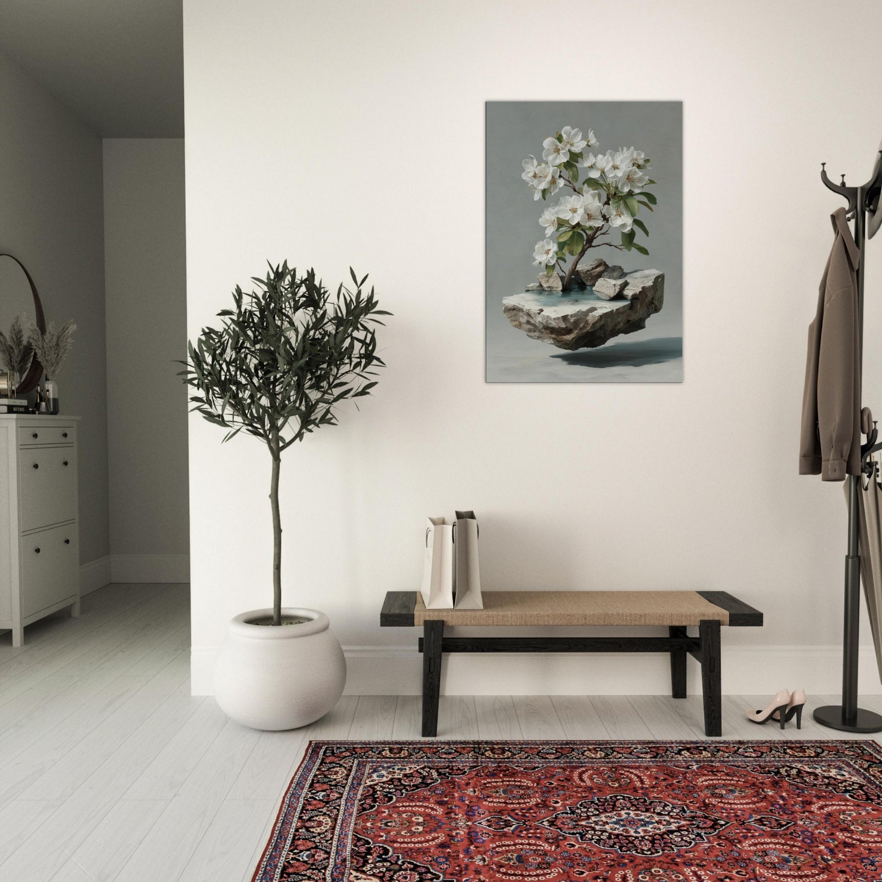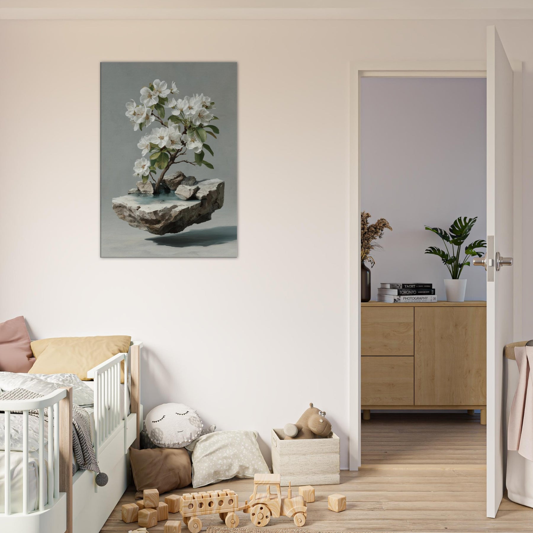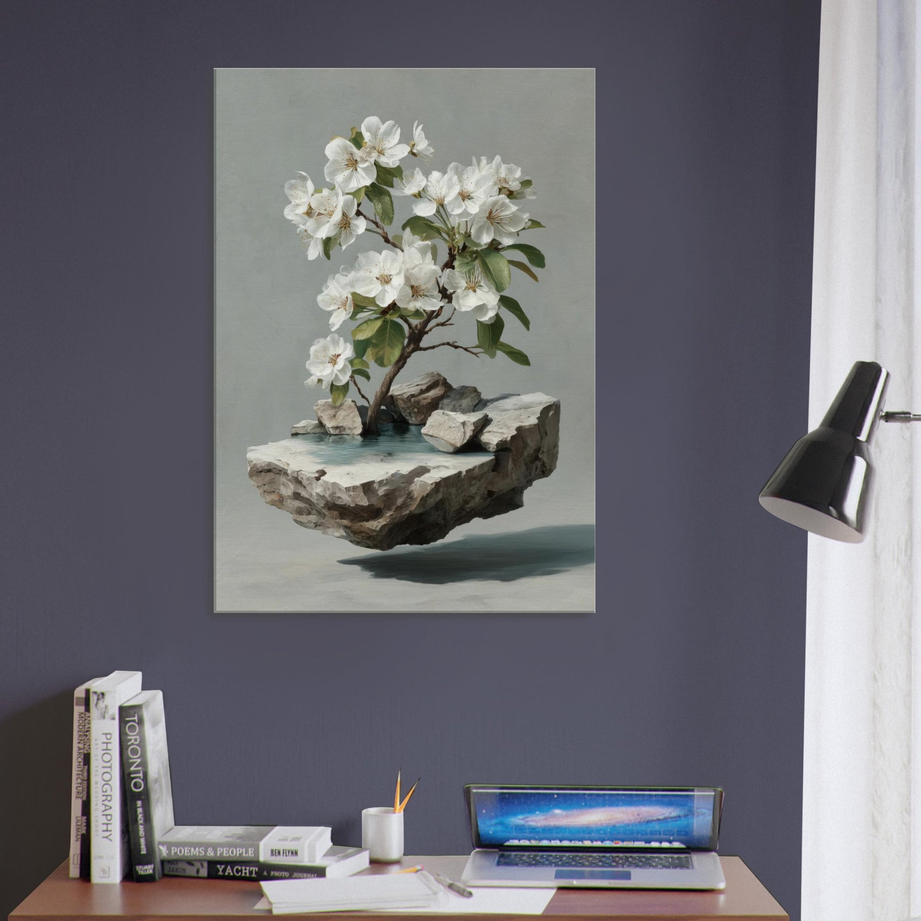 A dreamlike duet of growth and gravity, this piece presents a Plum Blossom tree sprouting from a jagged rock that floats above a quiet pool. The white blossoms glow with soft light, while shadow and mineral texture ground the scene in tangible tenderness. In a living room, it becomes a whispering window an invitation to slow breath, to notice resilience, and to feel the delicate balance between fragility and strength. A surreal nature meditation that elevates space with calm, poetic presence.