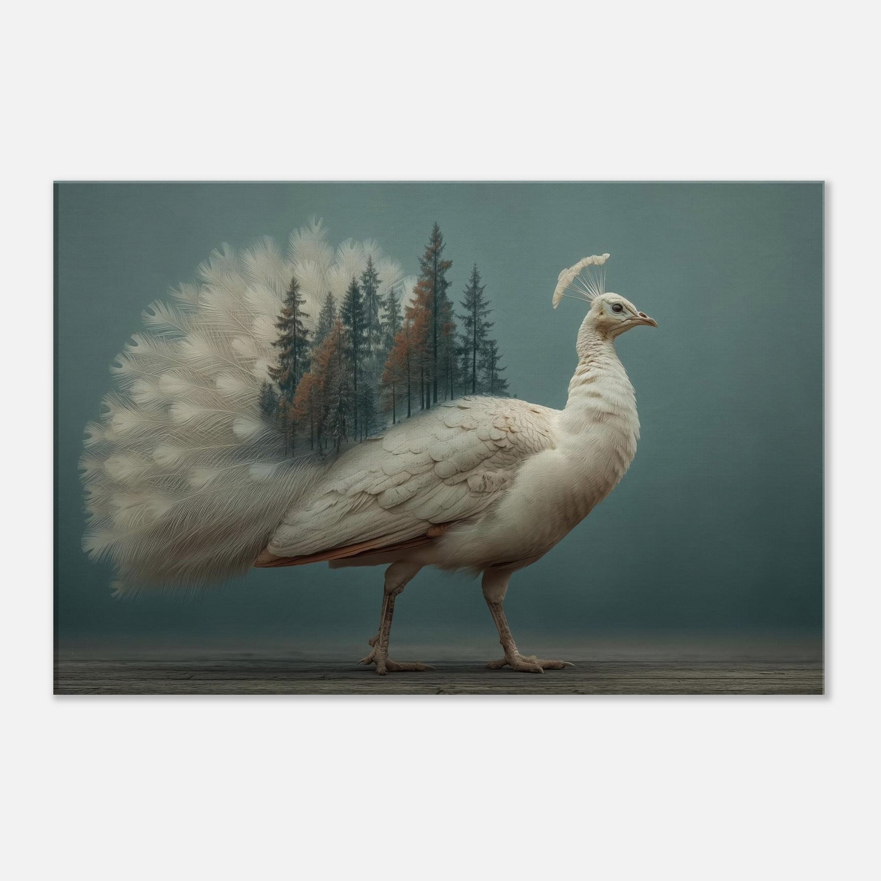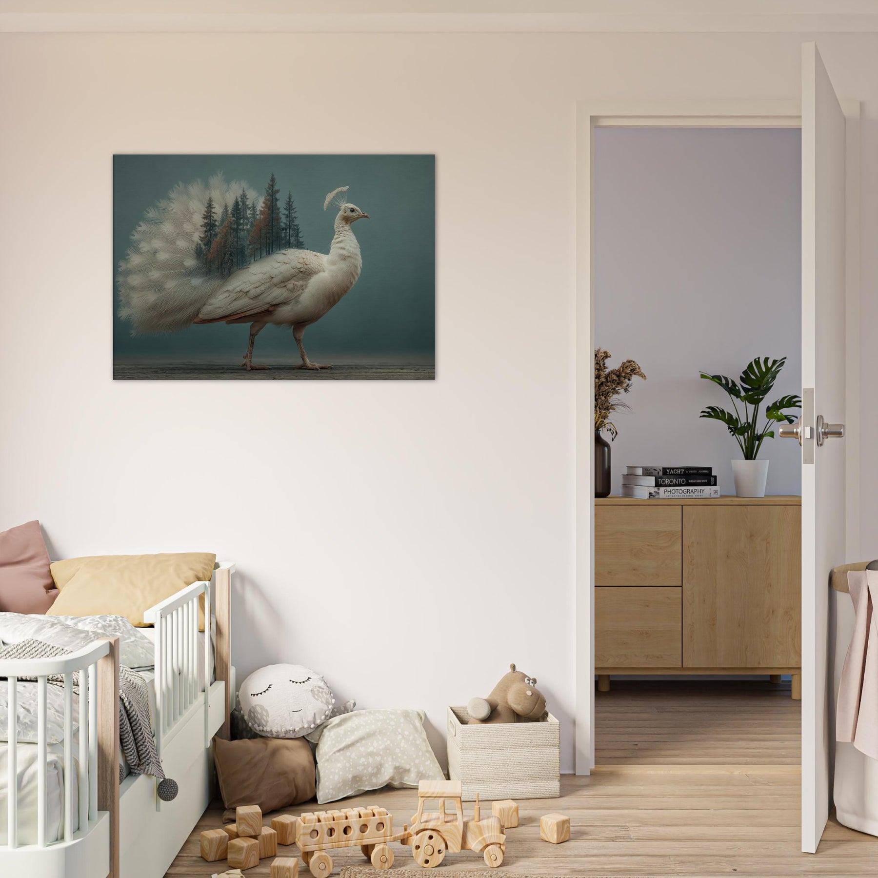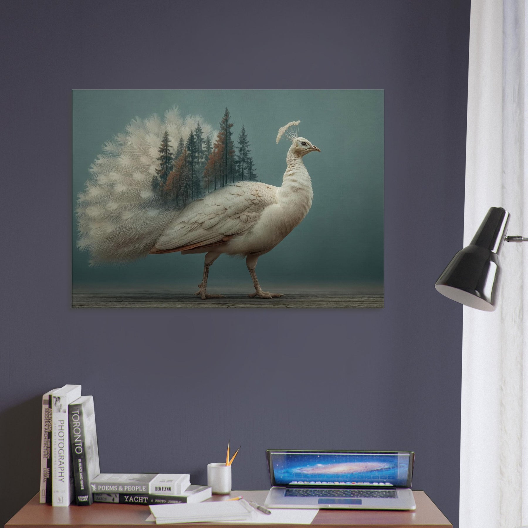 An ethereal peacock stands at the threshold between dream and daylight, its plume unfurling into a quiet forestscape. In this surreal composition, the bird’s tail becomes a living panorama of trees, soft needles and mist woven light, inviting calm and contemplation. The creature’s poised gaze anchors the room, while the forested plume lends texture and breath to blank walls. Printed with luminous detail, it bathes living spaces in nuanced color and mood, turning a hallway or lounge into a tranquil sanctuary where wonder lives.
