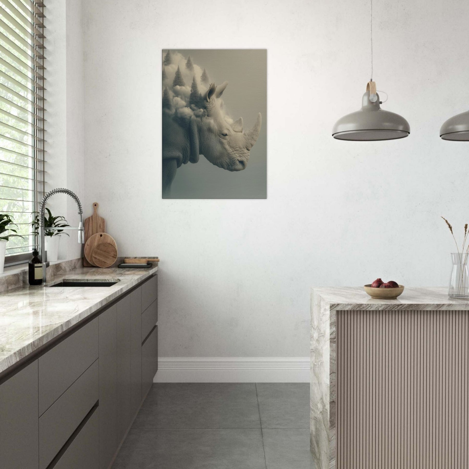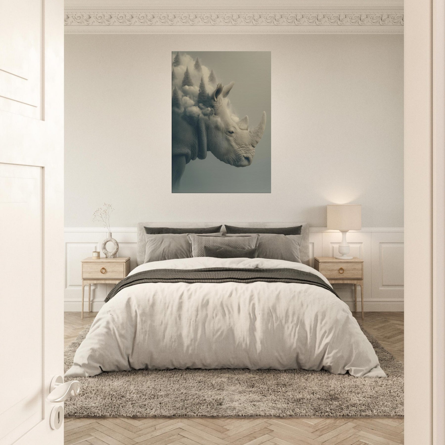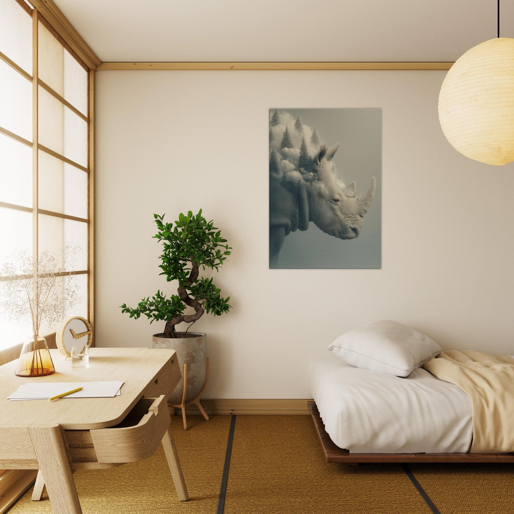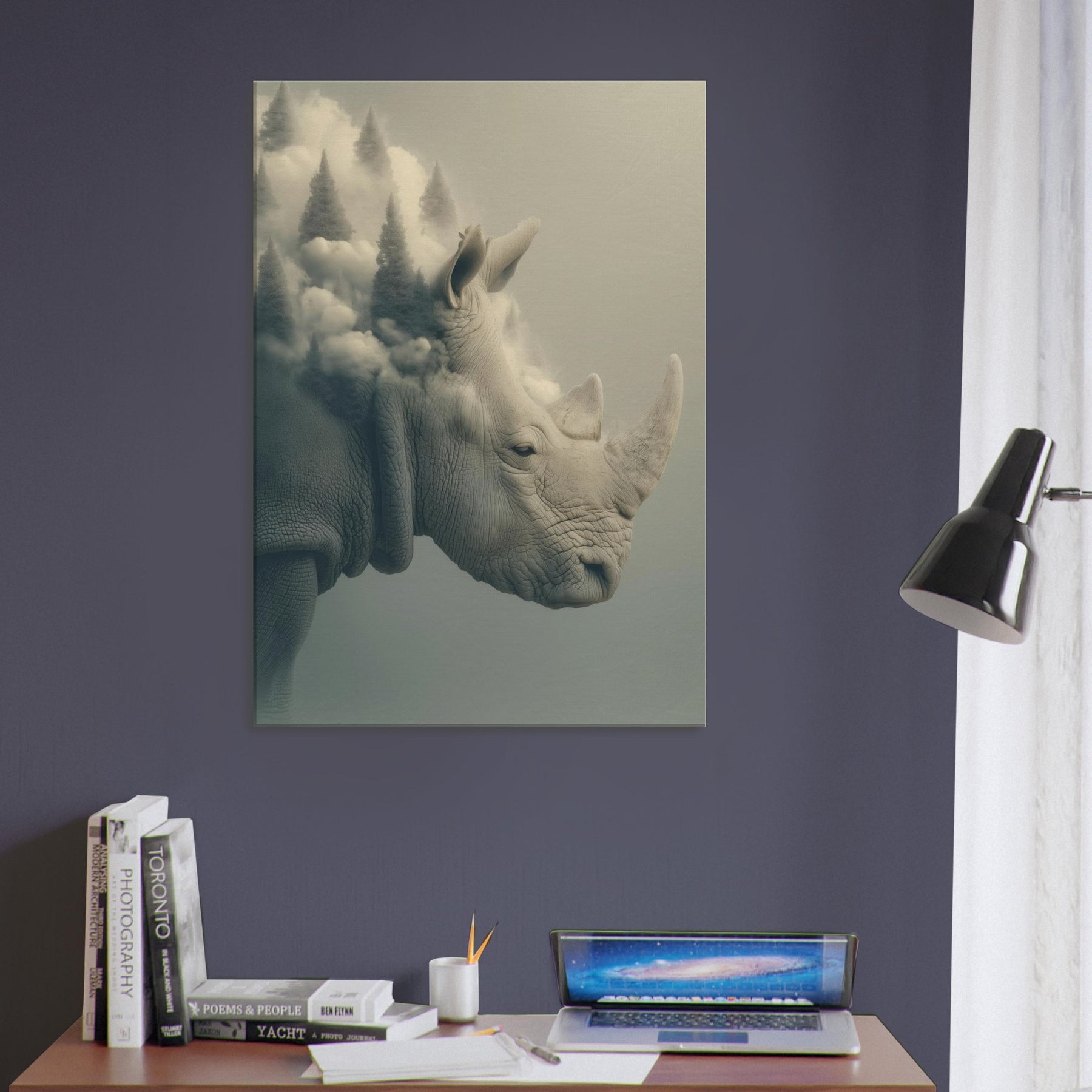 Step into a dream where land and cloud become one. This Rhinoceros centered artwork blends mist, pine, and rugged skin into a single, living image, infusing any room with calm drama and luminous hush. The surreal fusion of forest textures with the creature's silhouette evokes stillness, making it ideal for a serene living room or study. Printed with archival inks on premium canvas, it invites slow, contemplative moments as light shifts across its otherworldly surface.