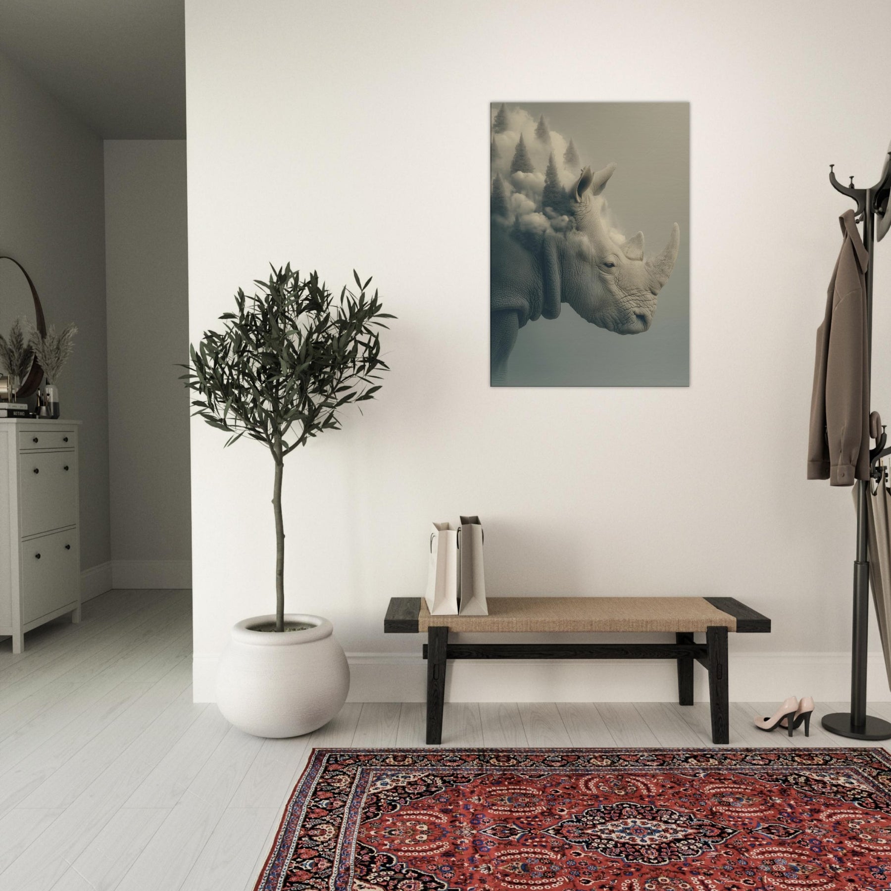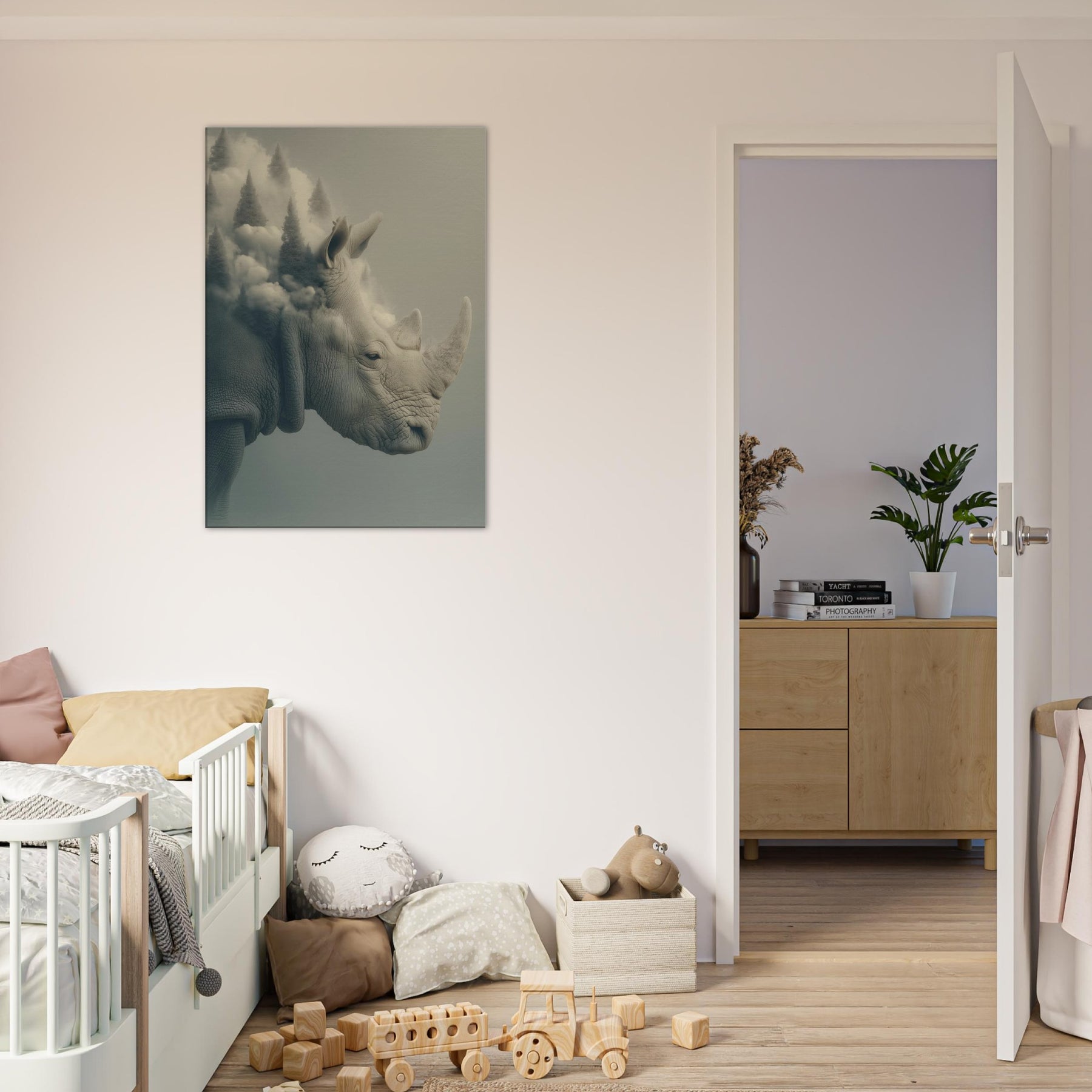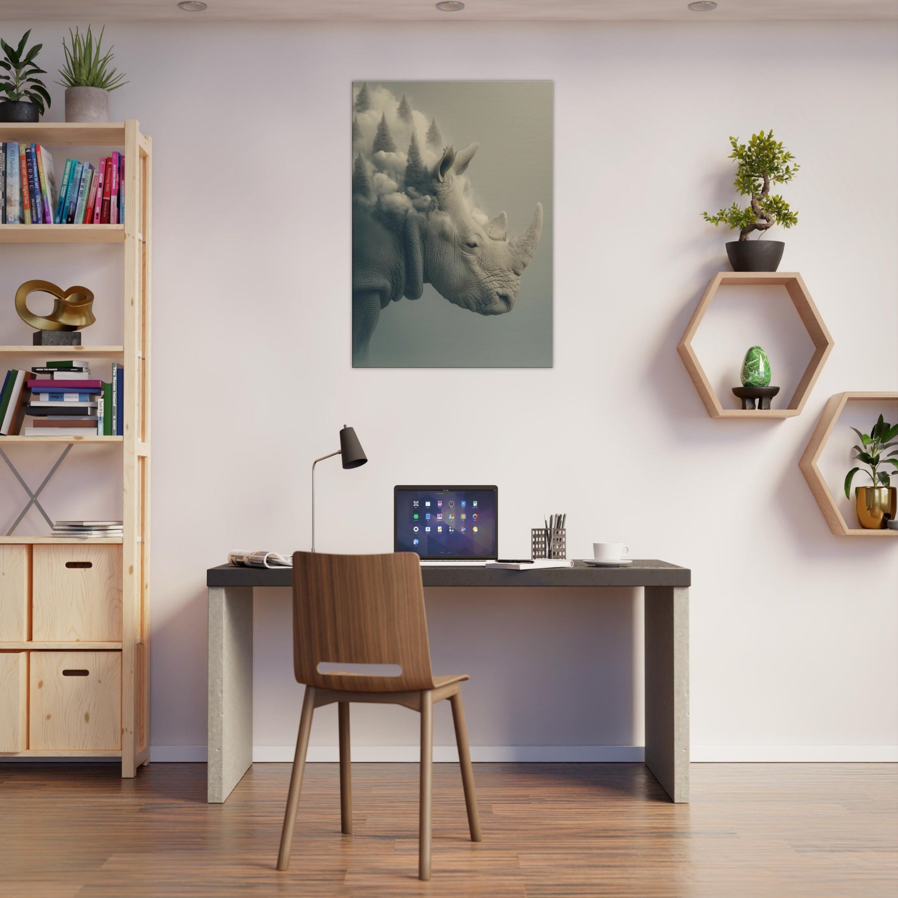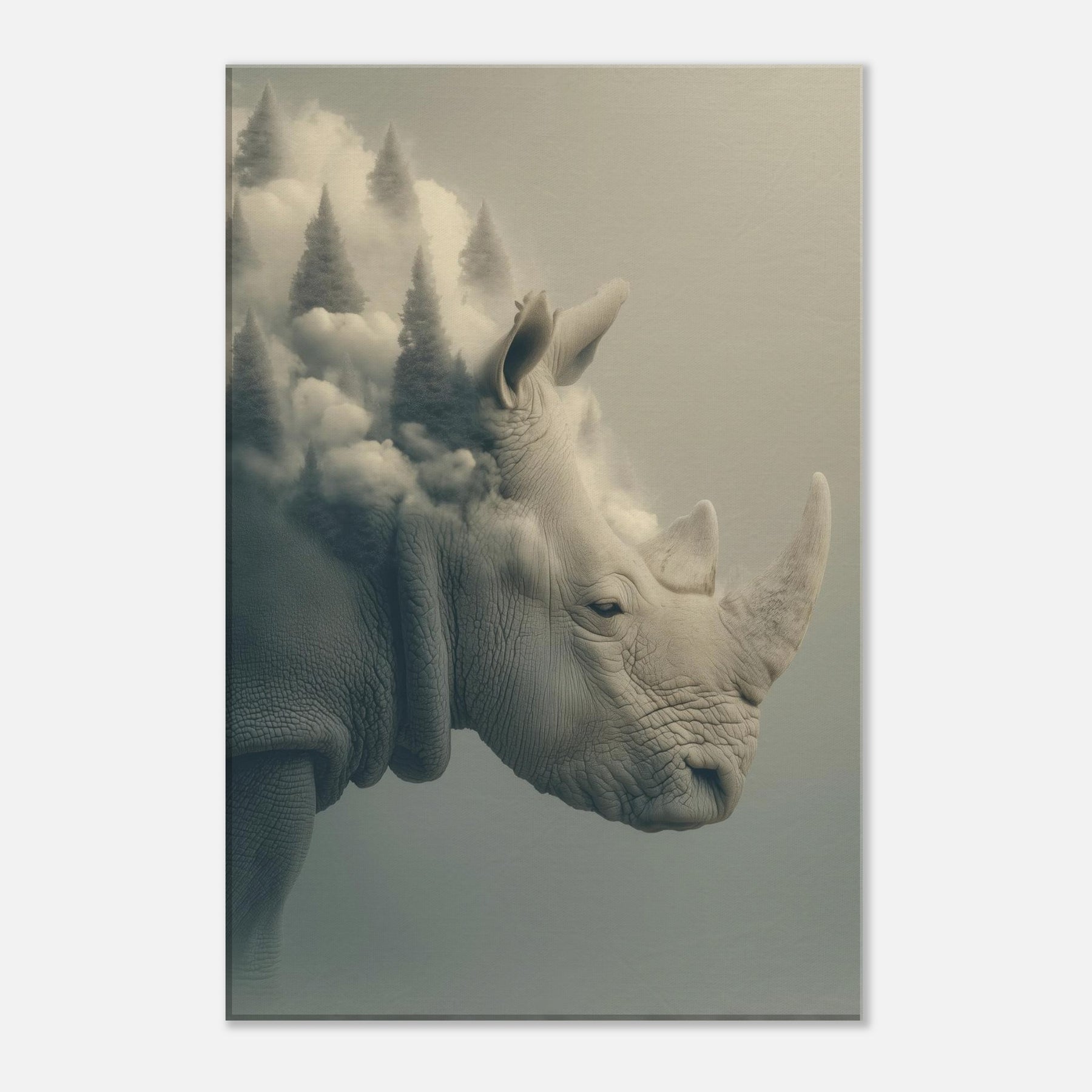 Step into a dream where land and cloud become one. This Rhinoceros centered artwork blends mist, pine, and rugged skin into a single, living image, infusing any room with calm drama and luminous hush. The surreal fusion of forest textures with the creature's silhouette evokes stillness, making it ideal for a serene living room or study. Printed with archival inks on premium canvas, it invites slow, contemplative moments as light shifts across its otherworldly surface.
