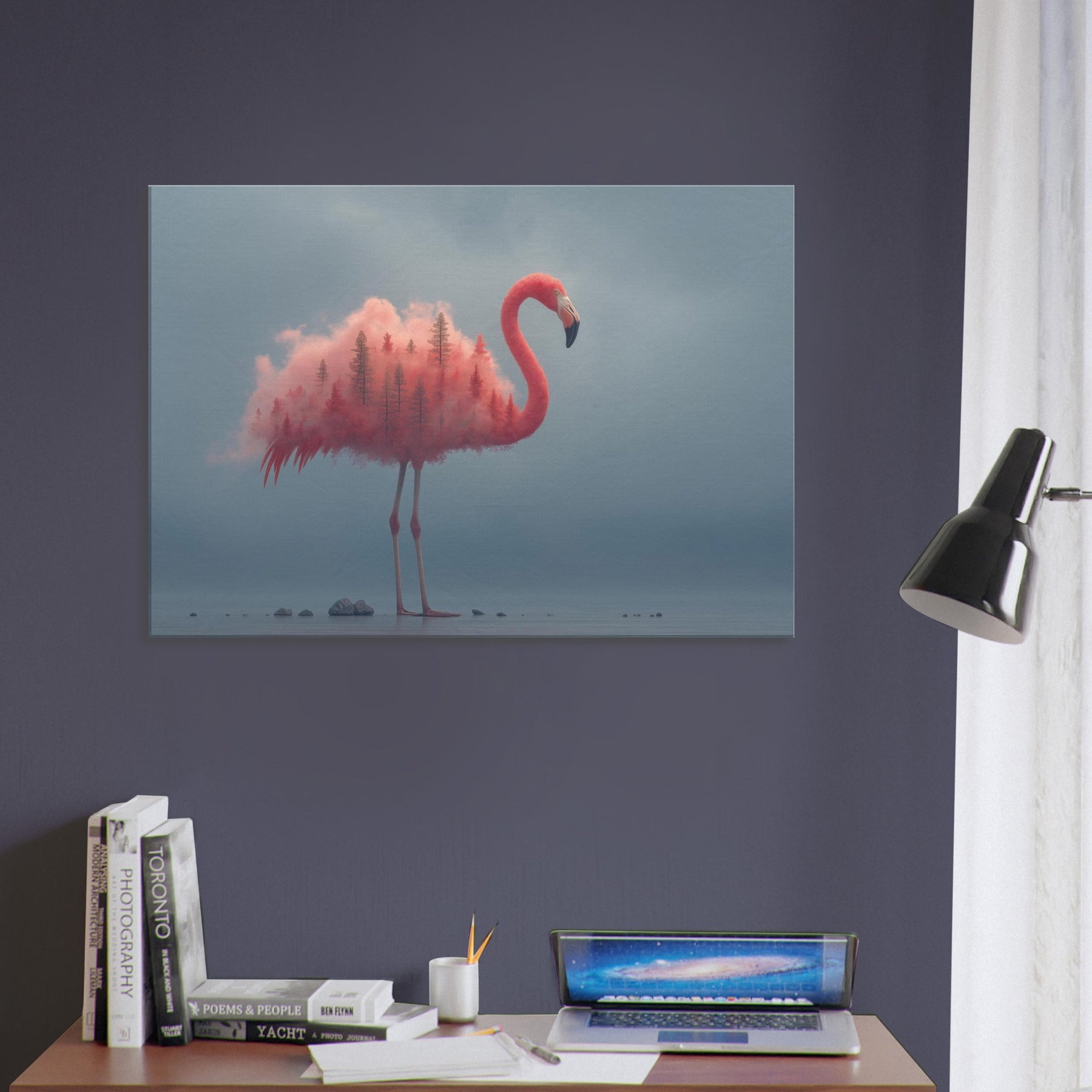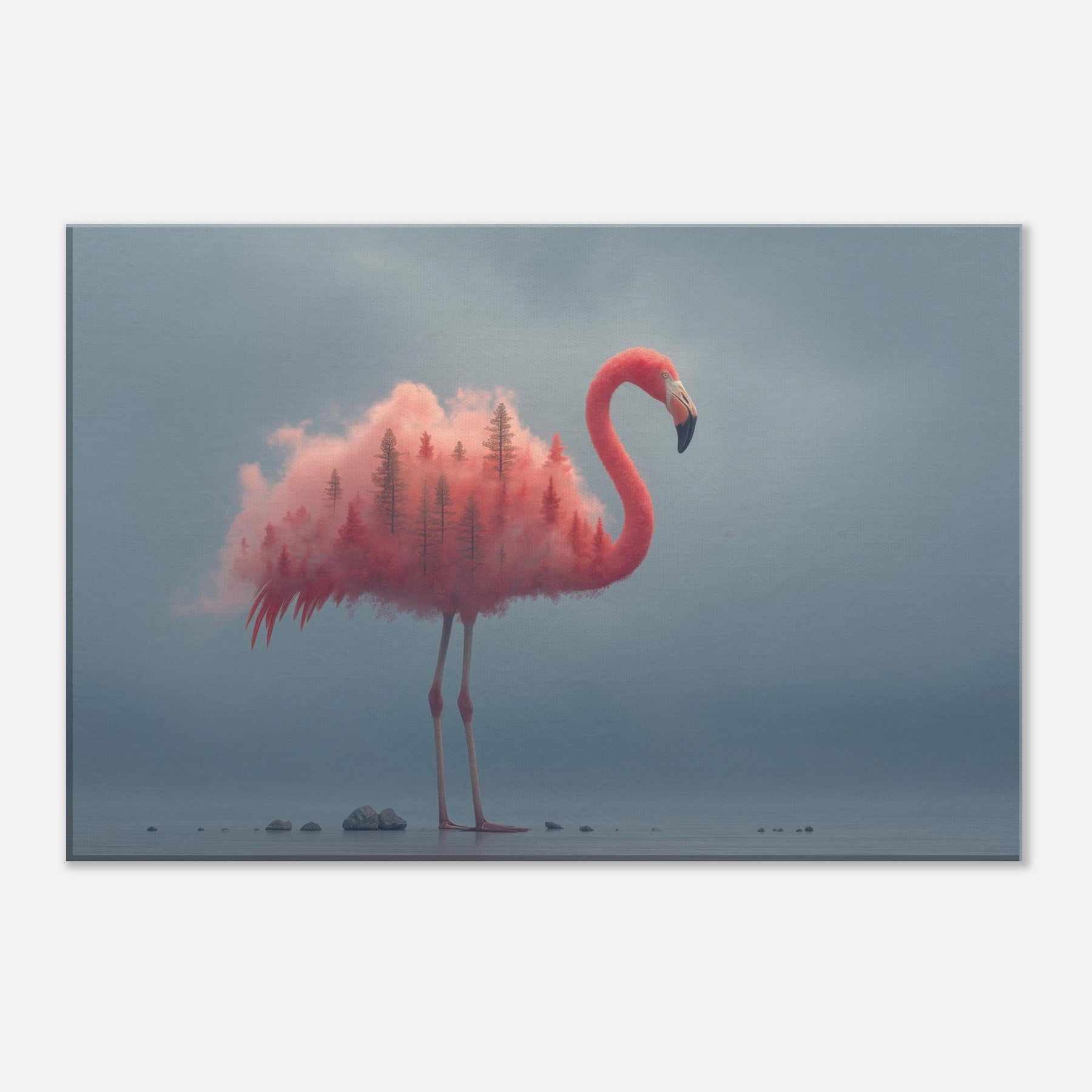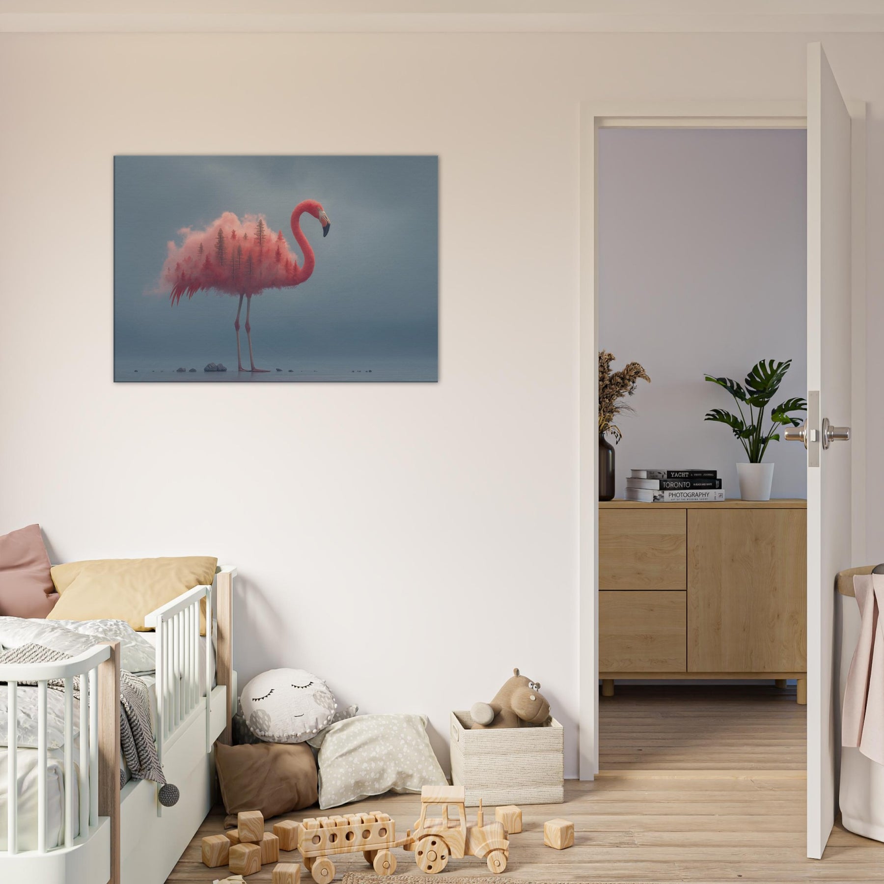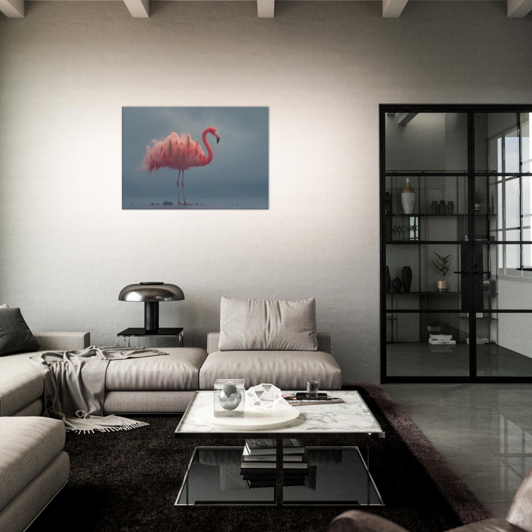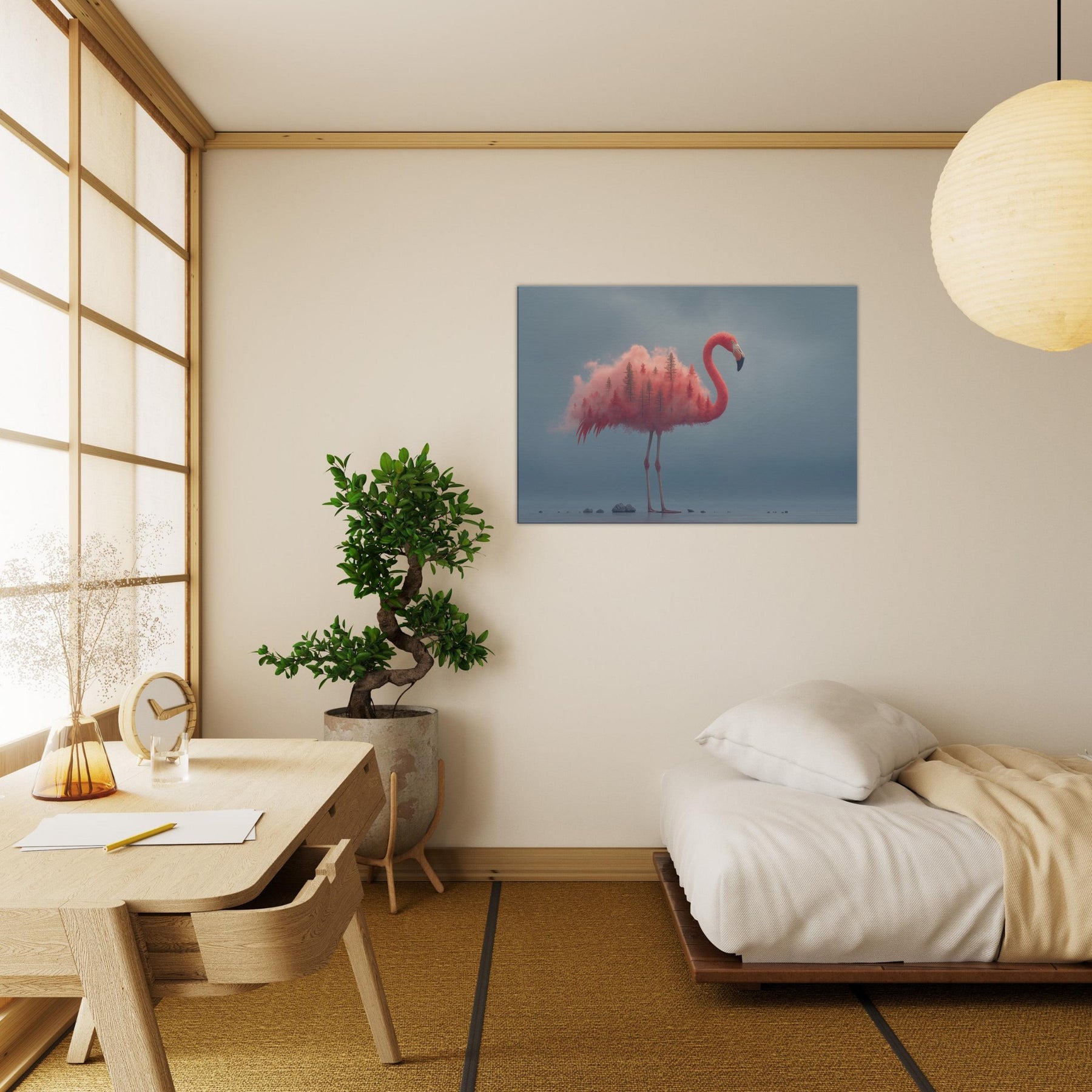 Like a distant dream, the Flamingo stands as a sentinel of grace while the form dissolves into pink fog and slender forest silhouettes. This surreal composition blends nature and memory, inviting the viewer to breathe with the image rather than merely look at it. The piece radiates a soft, otherworldly light that makes a living room feel suspended between dusk and dawn, quiet, luminous, and endlessly poetic. It's an artful invitation to slow moments and savor atmosphere.