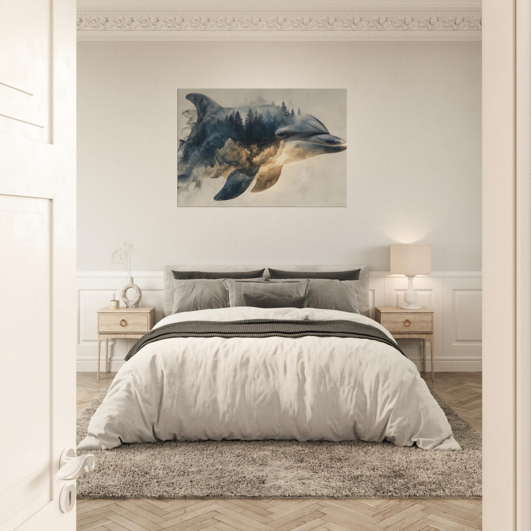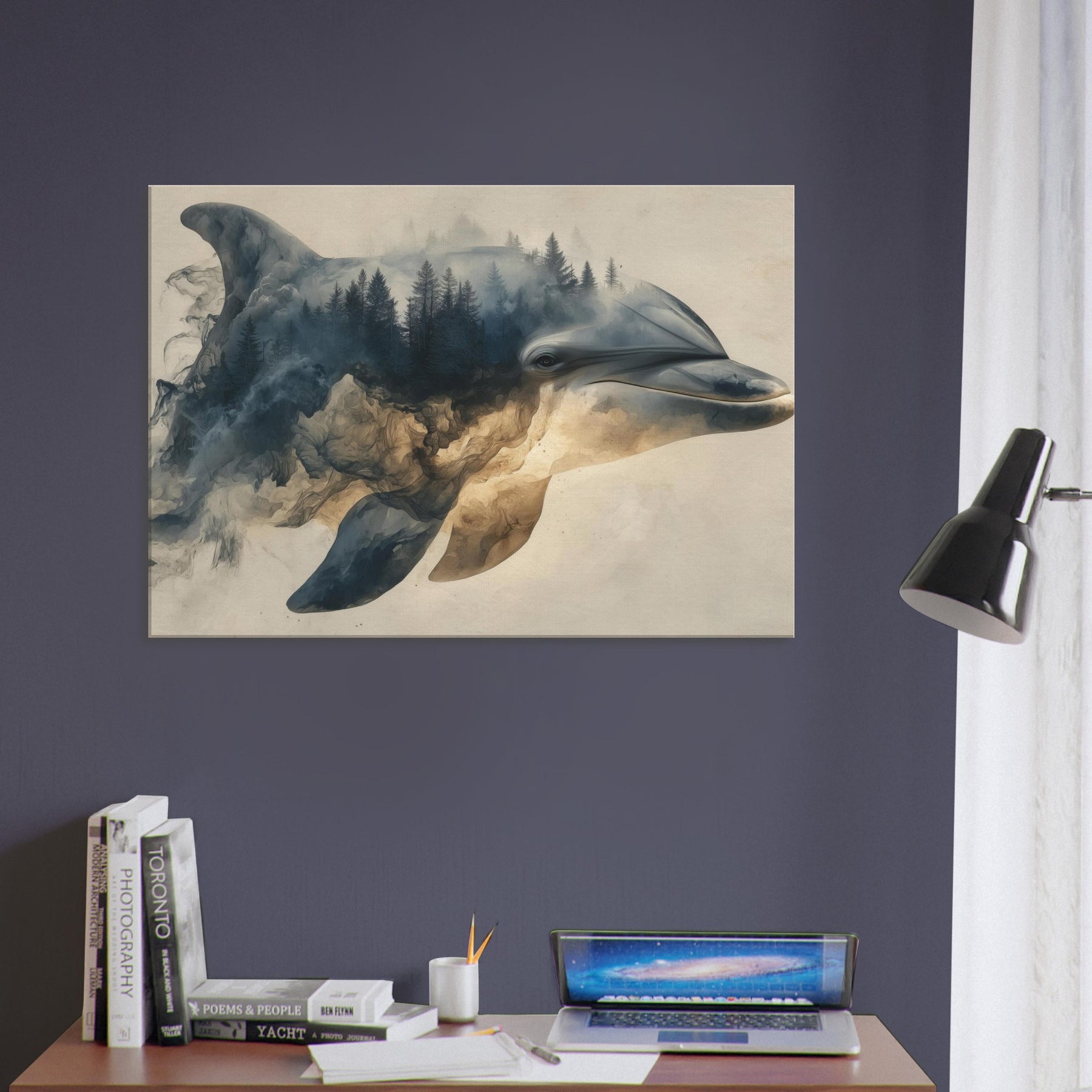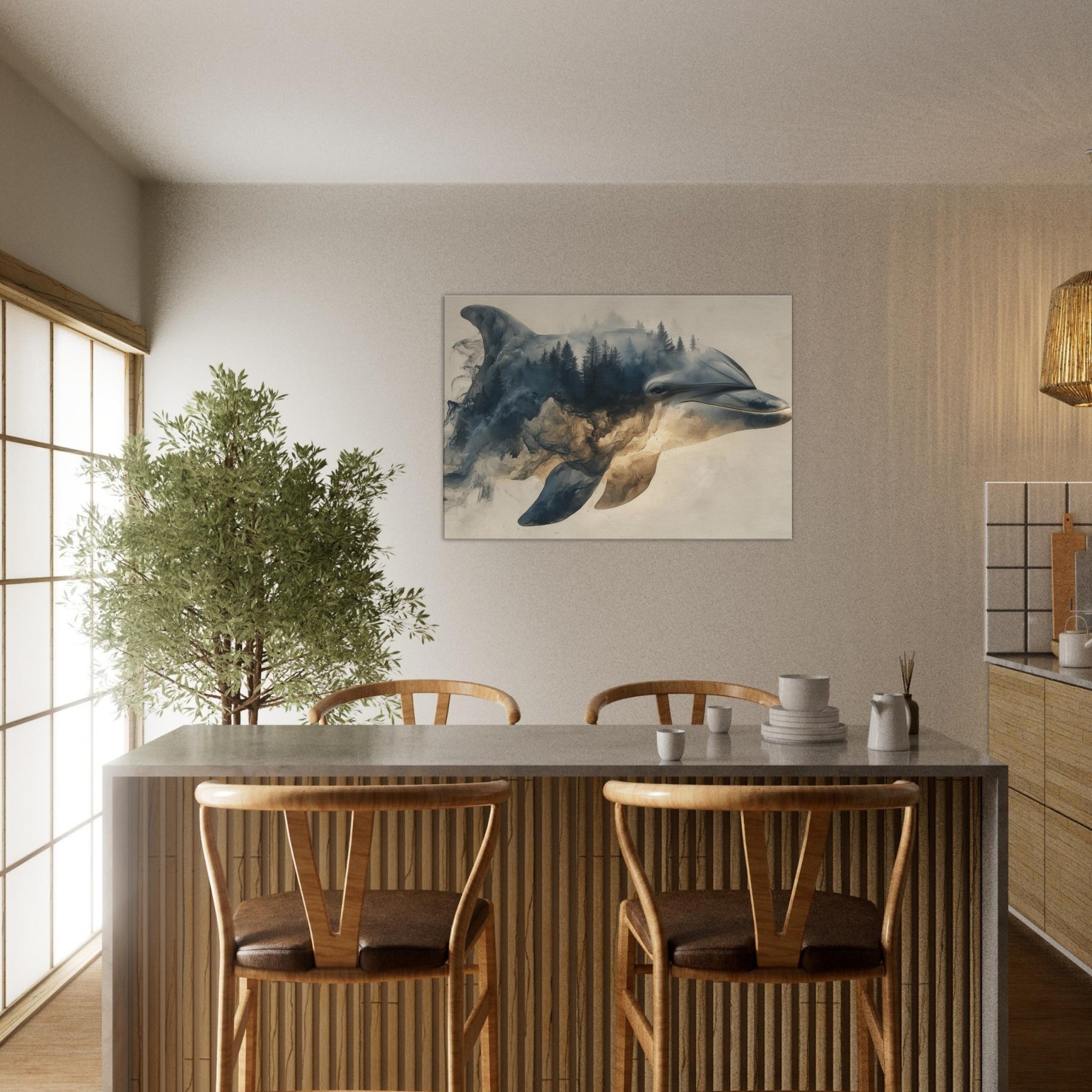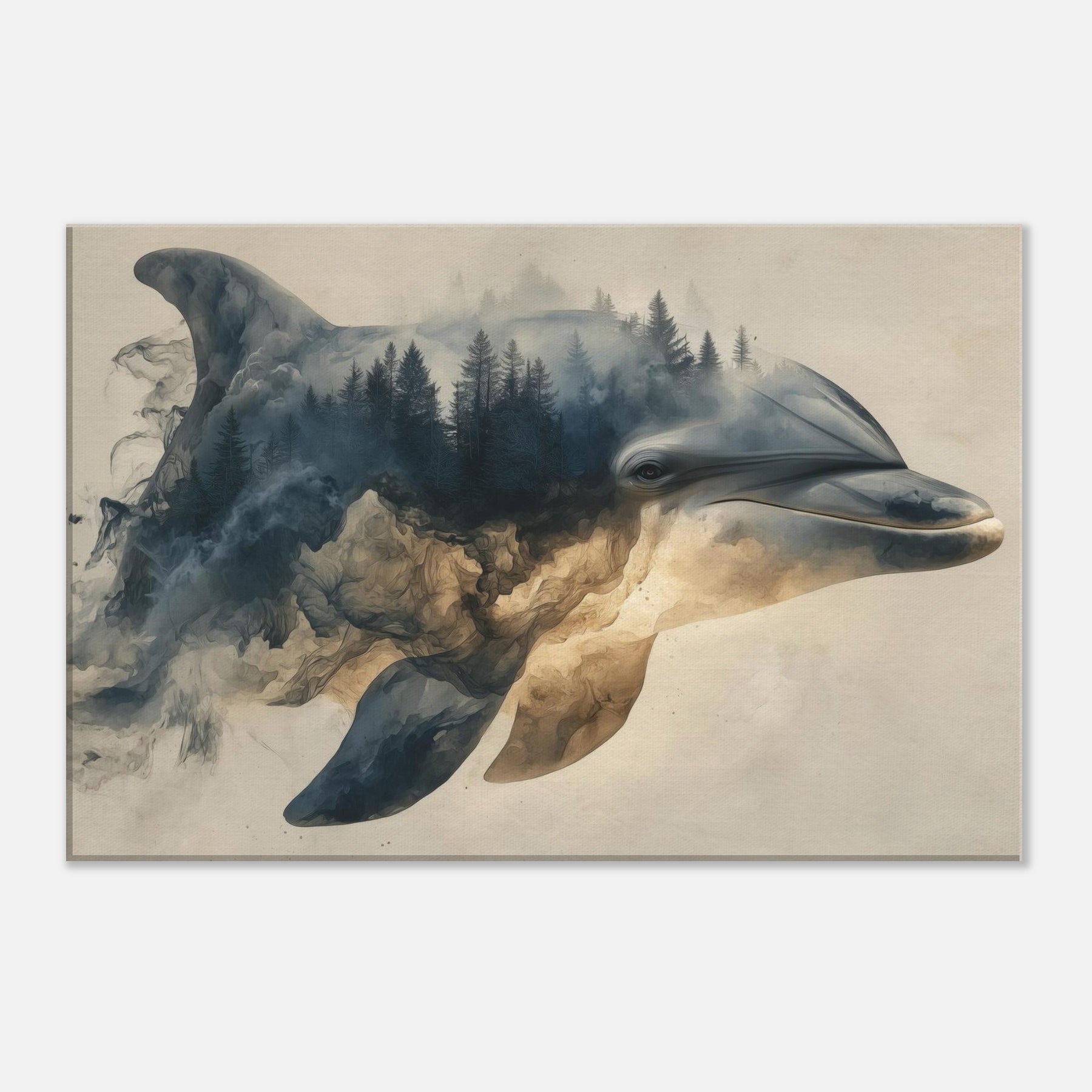 Let a Dolphin drift through a dreamscape where forests bleed into sea blue light. Surreal, soft edged shapes swirl around its gallant profile, turning shorelines into memory and water into weathered stone. The atmosphere is hushed, like a late afternoon in a hidden gallery; you feel the room soften, the walls pulse with tide and timber. Hang this piece to invite calm, curiosity, and a sense of otherworldly companionship into living spaces.