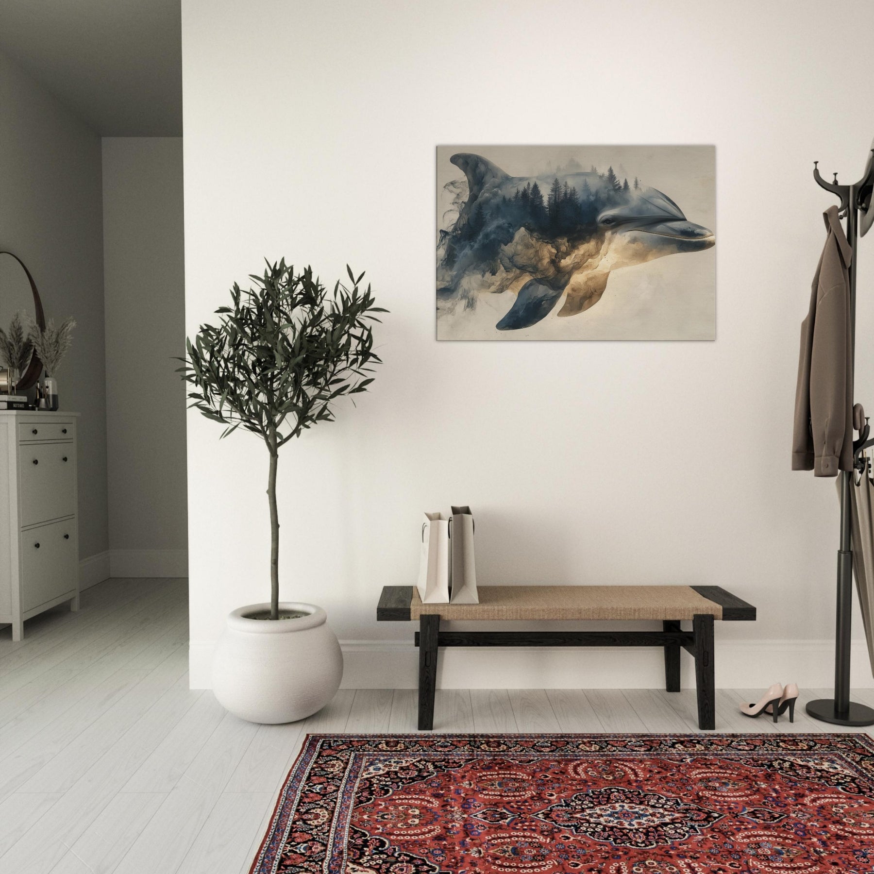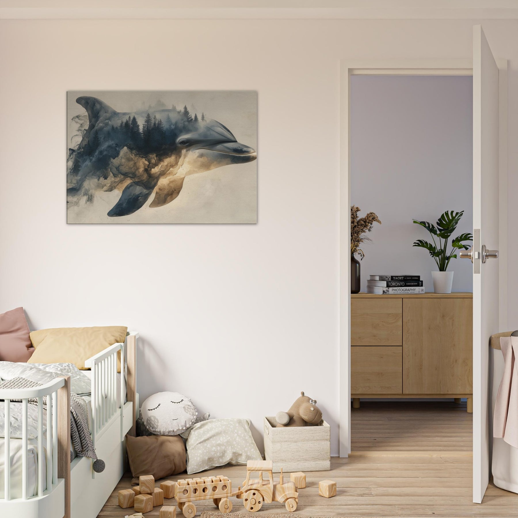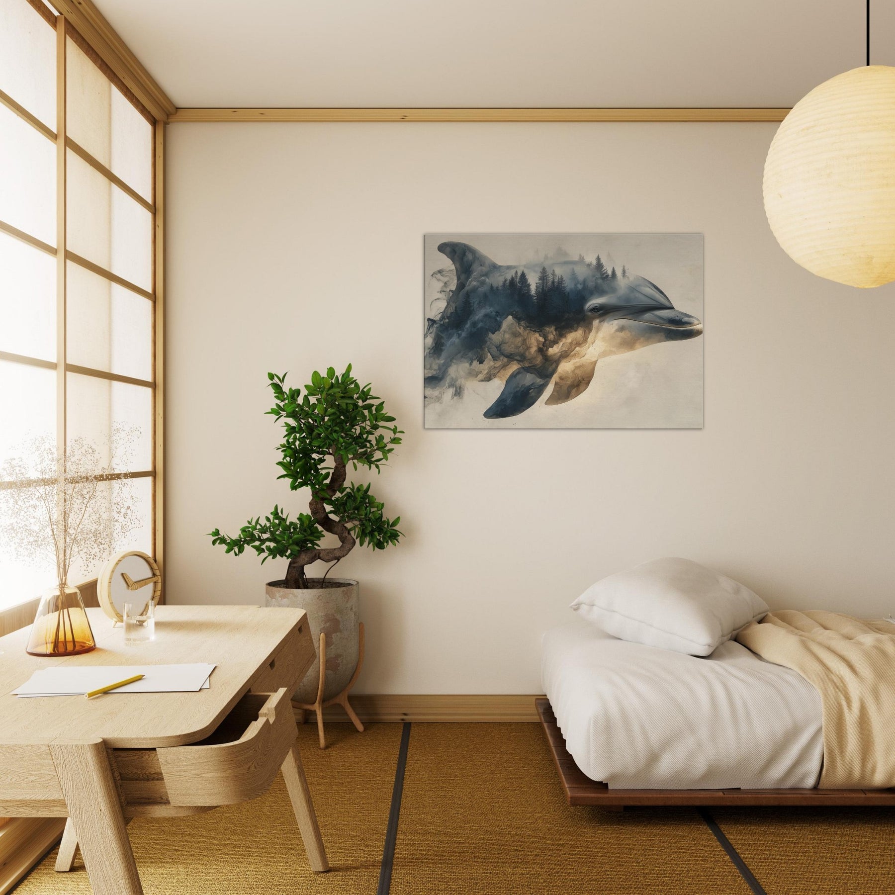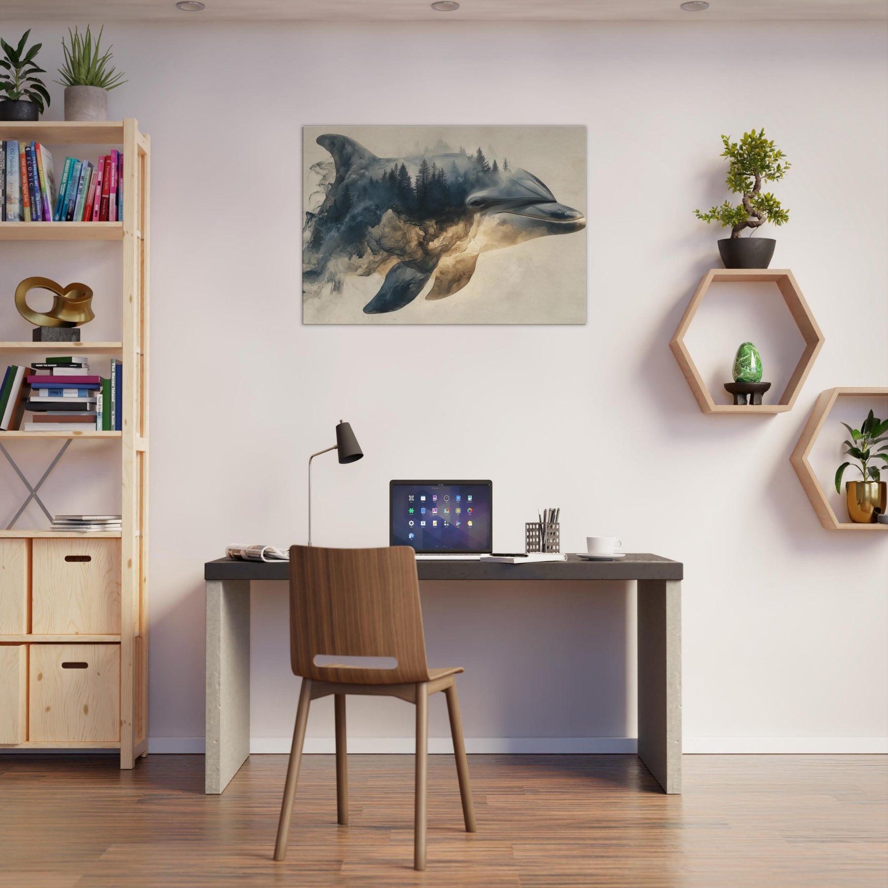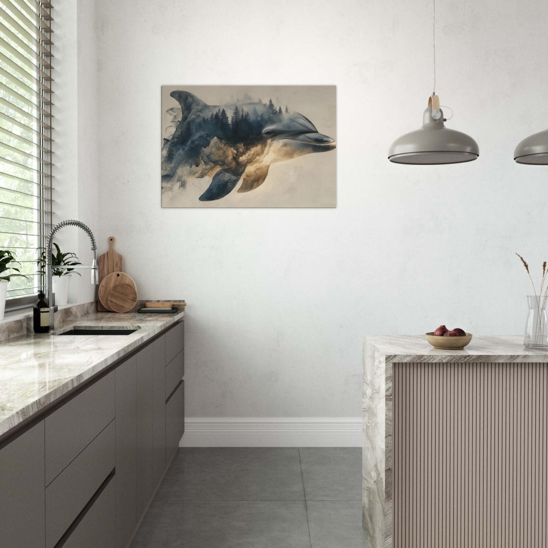 Let a Dolphin drift through a dreamscape where forests bleed into sea blue light. Surreal, soft edged shapes swirl around its gallant profile, turning shorelines into memory and water into weathered stone. The atmosphere is hushed, like a late afternoon in a hidden gallery; you feel the room soften, the walls pulse with tide and timber. Hang this piece to invite calm, curiosity, and a sense of otherworldly companionship into living spaces.
