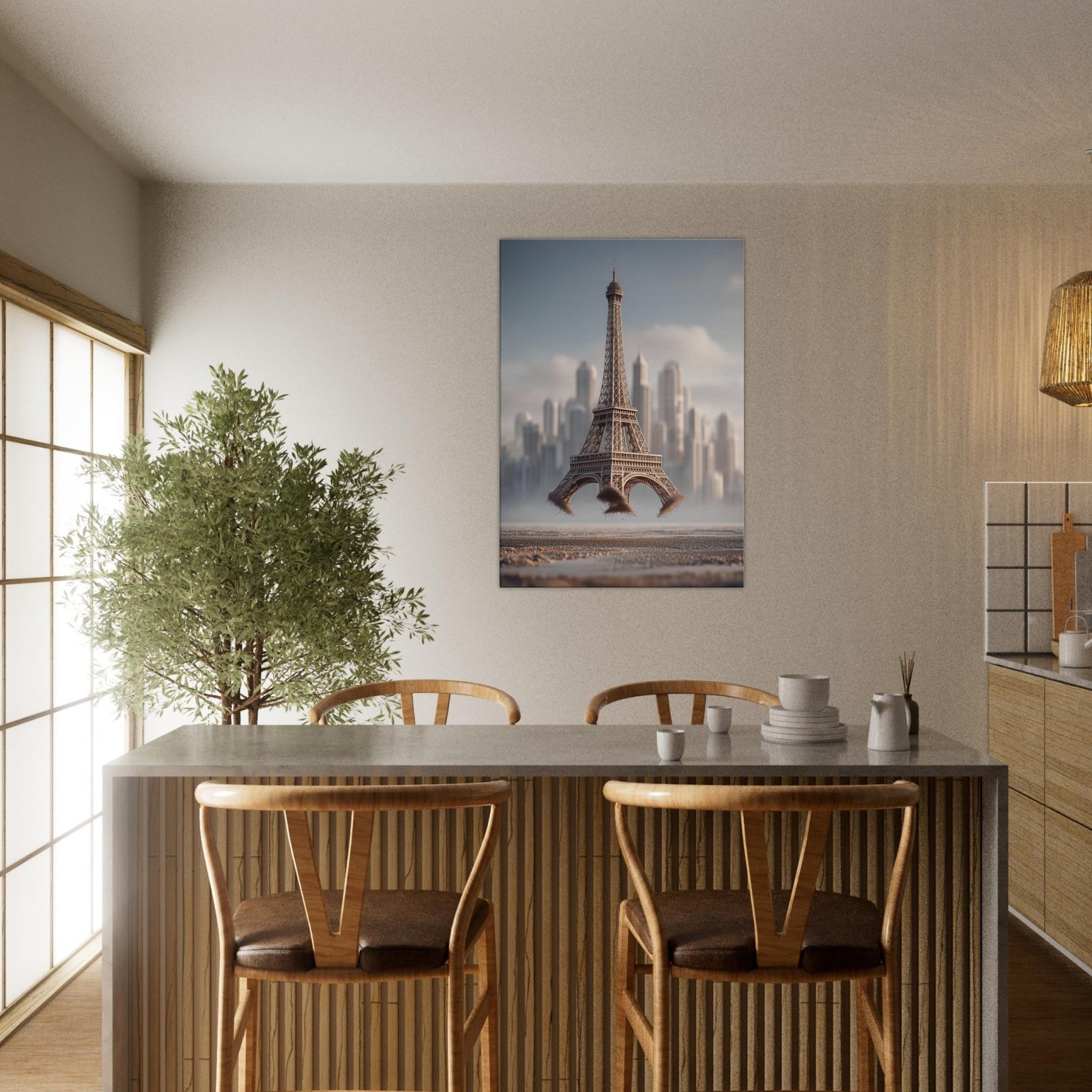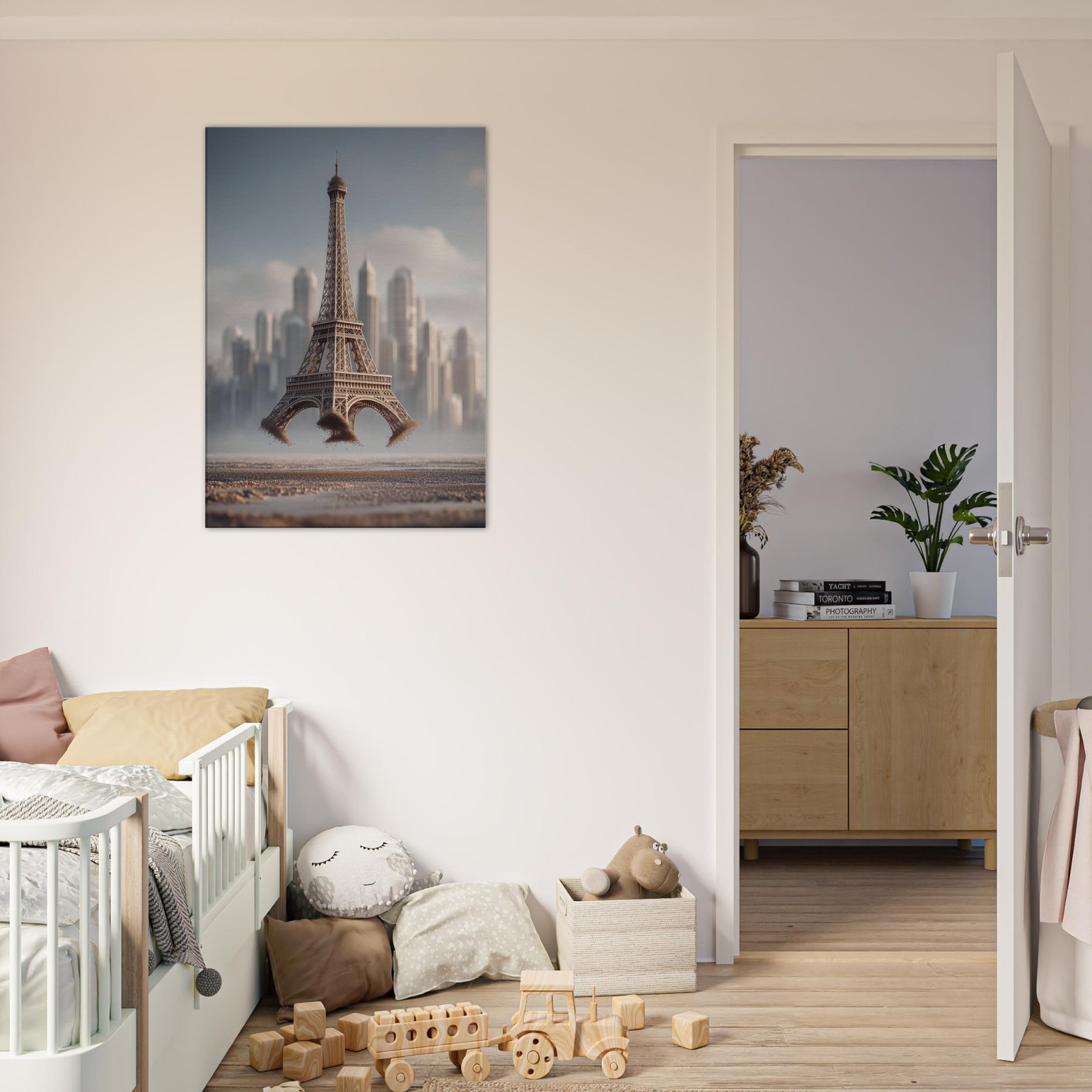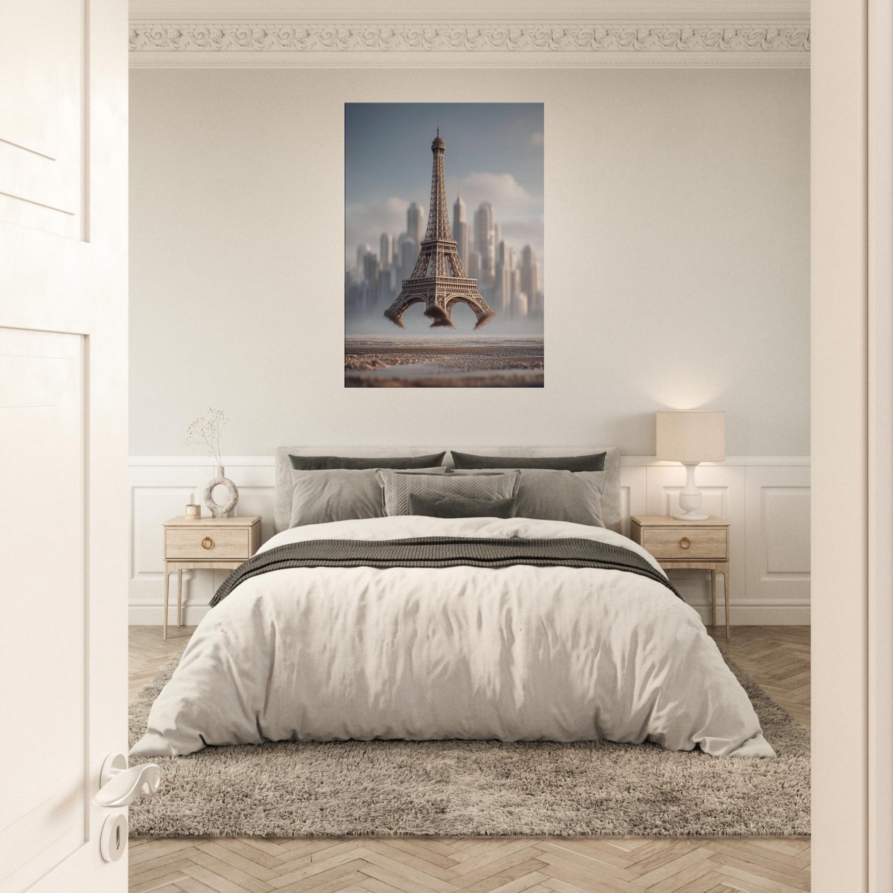 Step into a breathless dream where metal lace and mist meet the city. This surrealist composition centers the Eiffel Tower as a beacon rising from a soft, fog kissed shoreline, with a distant urban horizon dissolving into hazy light. The atmosphere feels both nostalgic and forward looking, like a memory you can walk into. Hang this in your living room or study to invite calm, curiosity, and wonder a sculptural, cinematic presence that makes every day feel tinted with possibility.