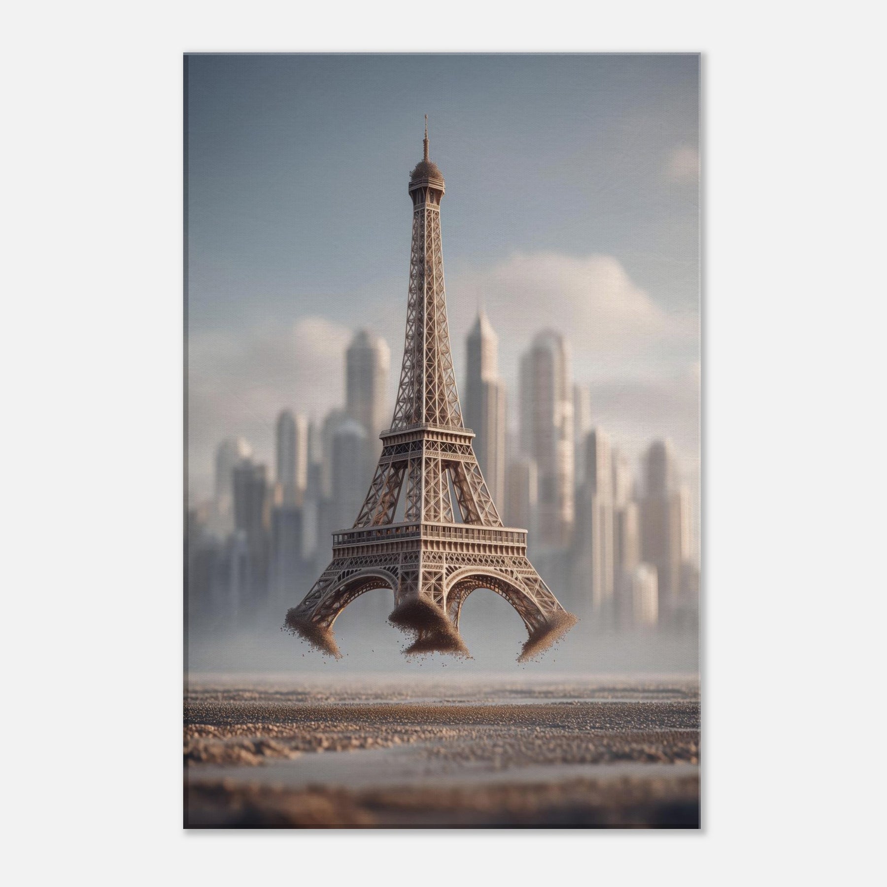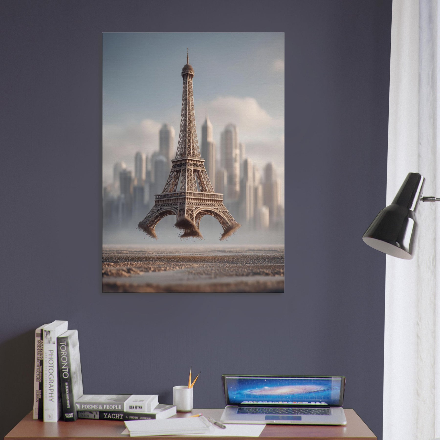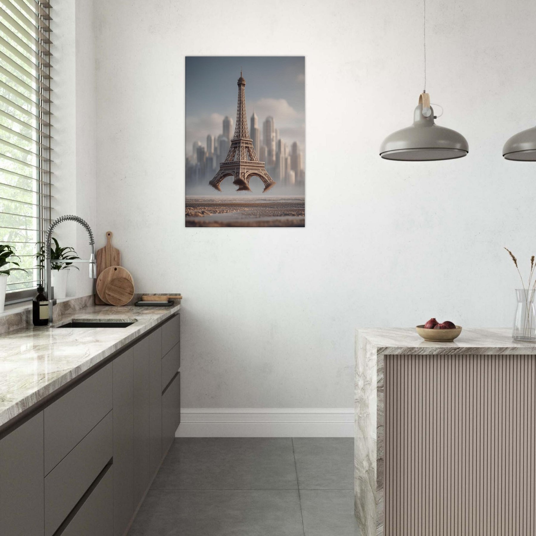 Step into a breathless dream where metal lace and mist meet the city. This surrealist composition centers the Eiffel Tower as a beacon rising from a soft, fog kissed shoreline, with a distant urban horizon dissolving into hazy light. The atmosphere feels both nostalgic and forward looking, like a memory you can walk into. Hang this in your living room or study to invite calm, curiosity, and wonder a sculptural, cinematic presence that makes every day feel tinted with possibility.