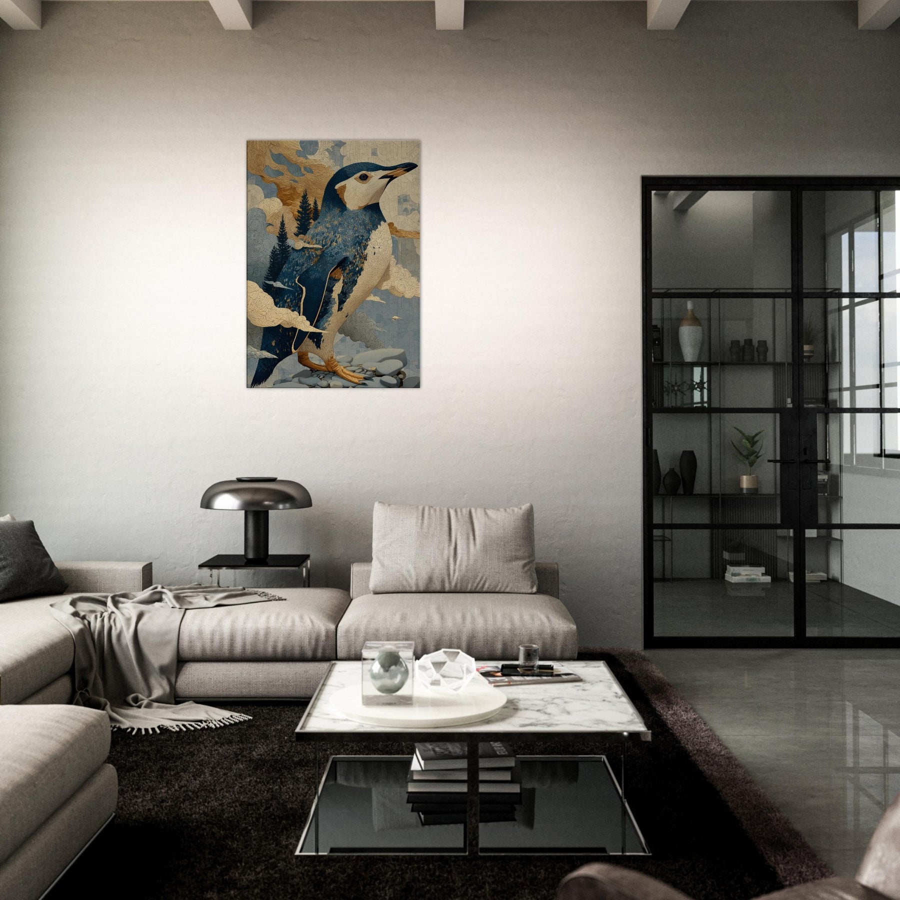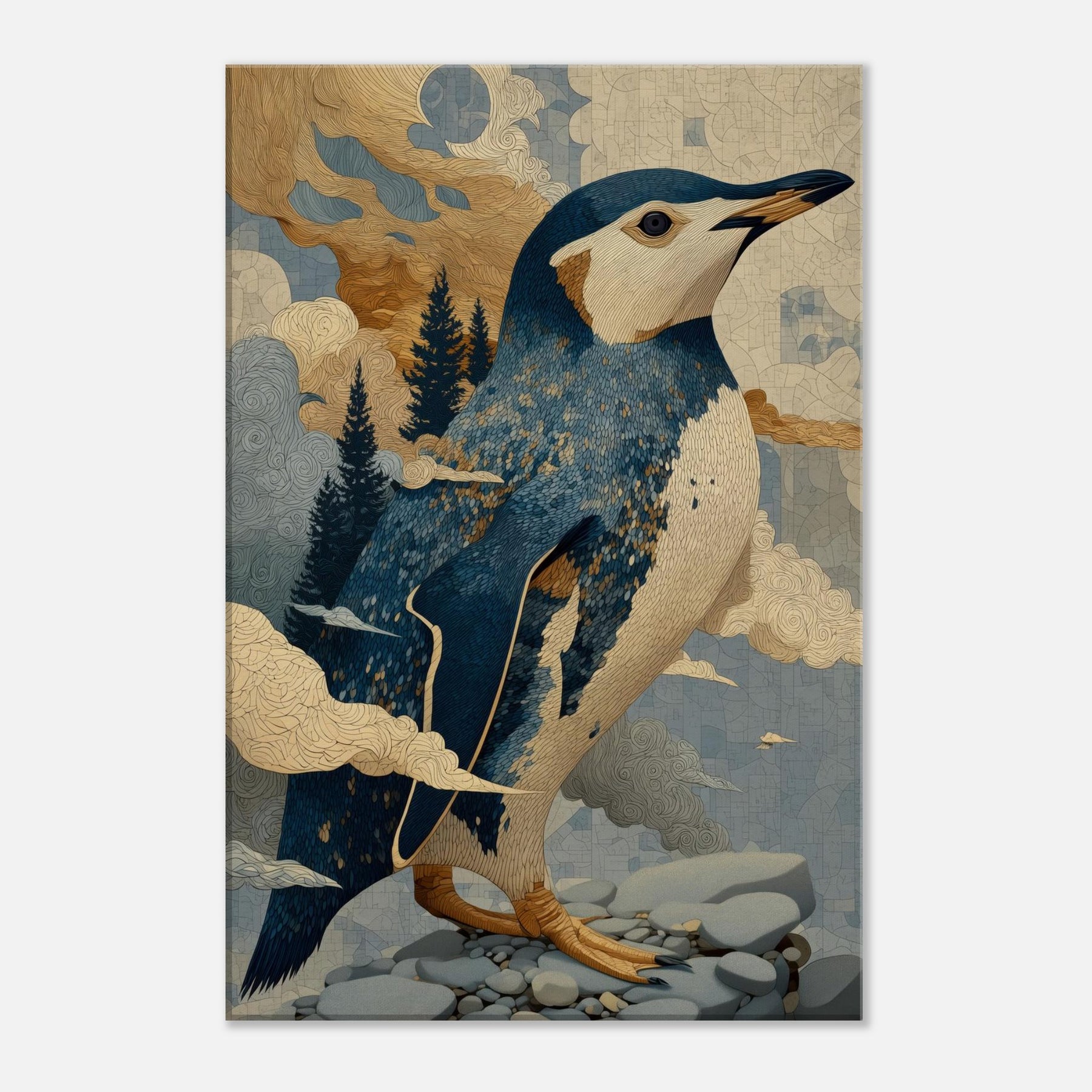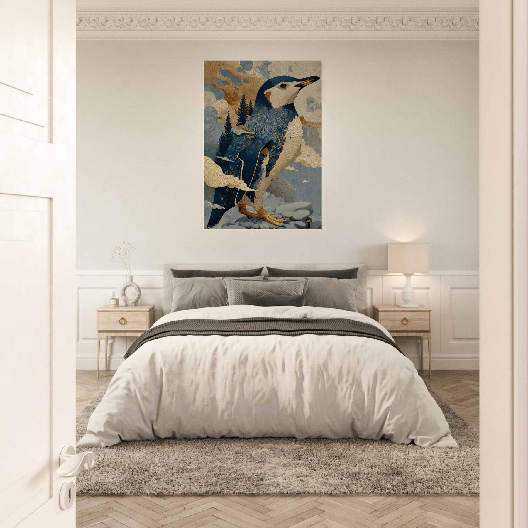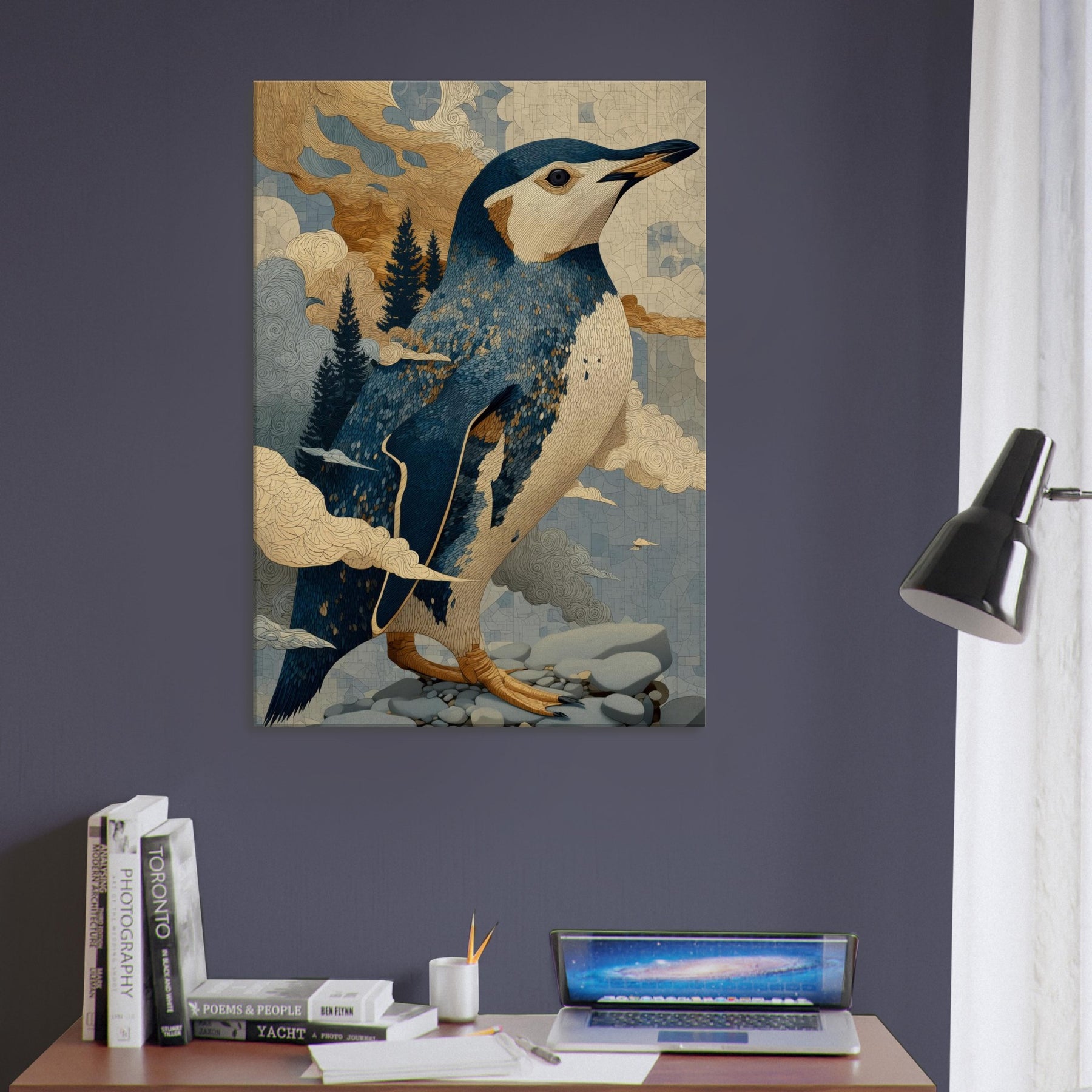 Step into a tide of quiet marvel where a Penguin stands crowned by wind sculpted clouds and a gold toned horizon. This surreal scene threads steel blue feathers, warm ochre light, and textured weather into one contemplative moment. The artwork invites slow breaths, soft corners, and a pause between days, turning a wall into a window of polar imagination. Perfect for a living room or study, it anchors color with calm confidence and a whisper of wonder.