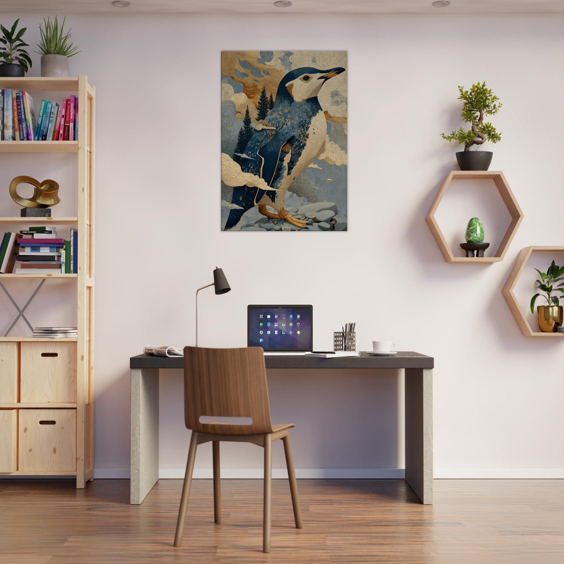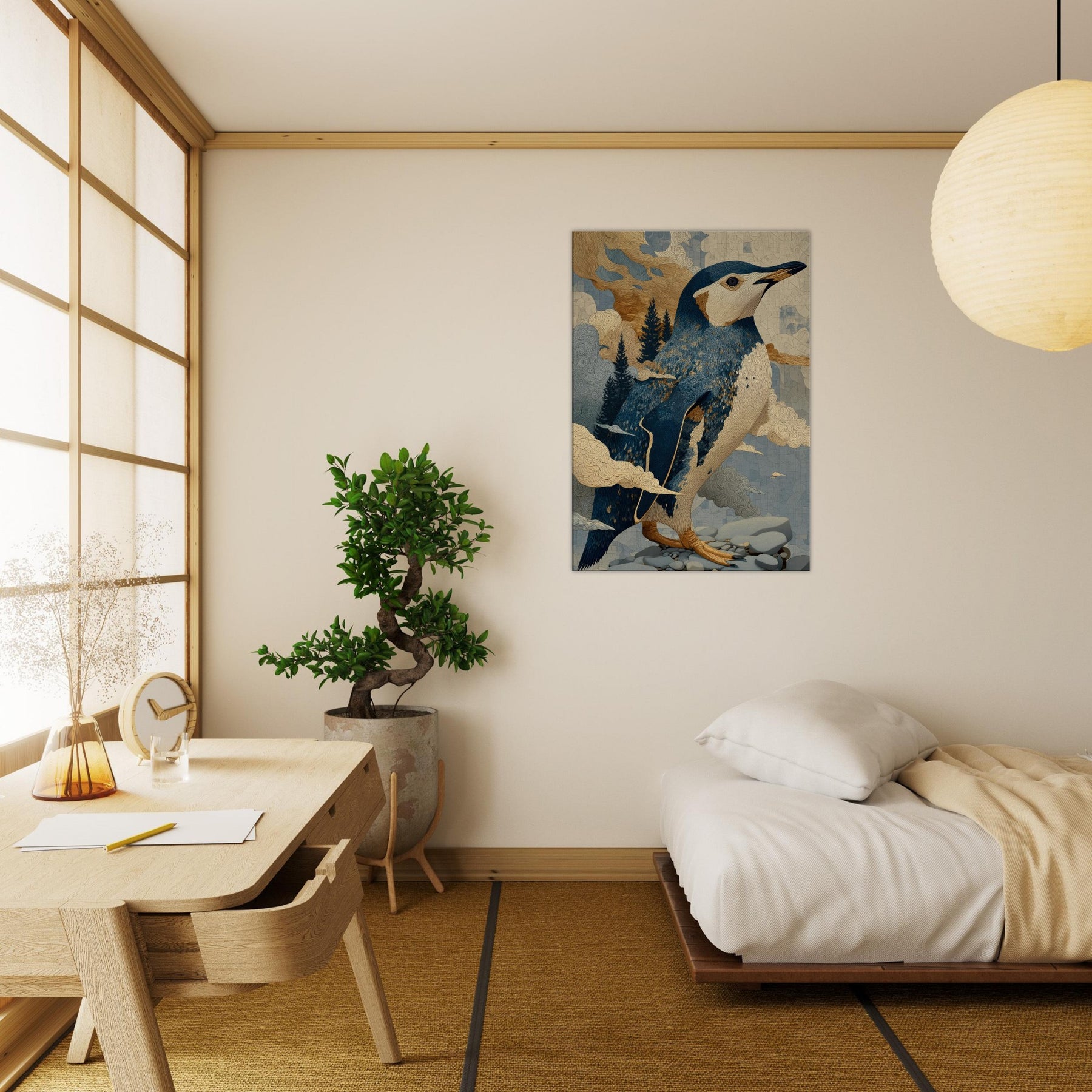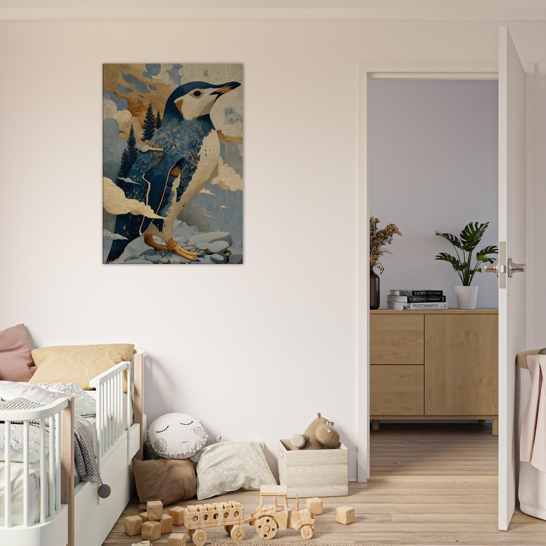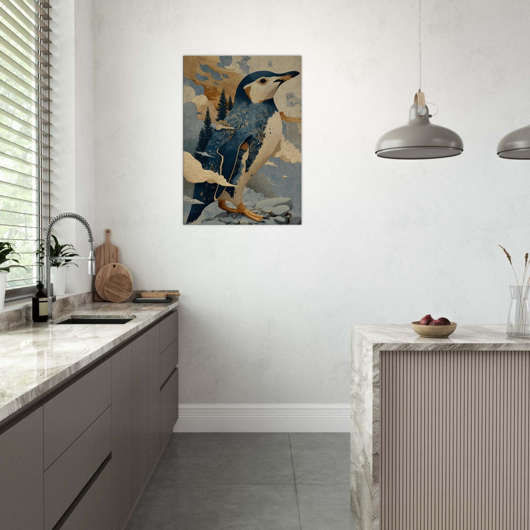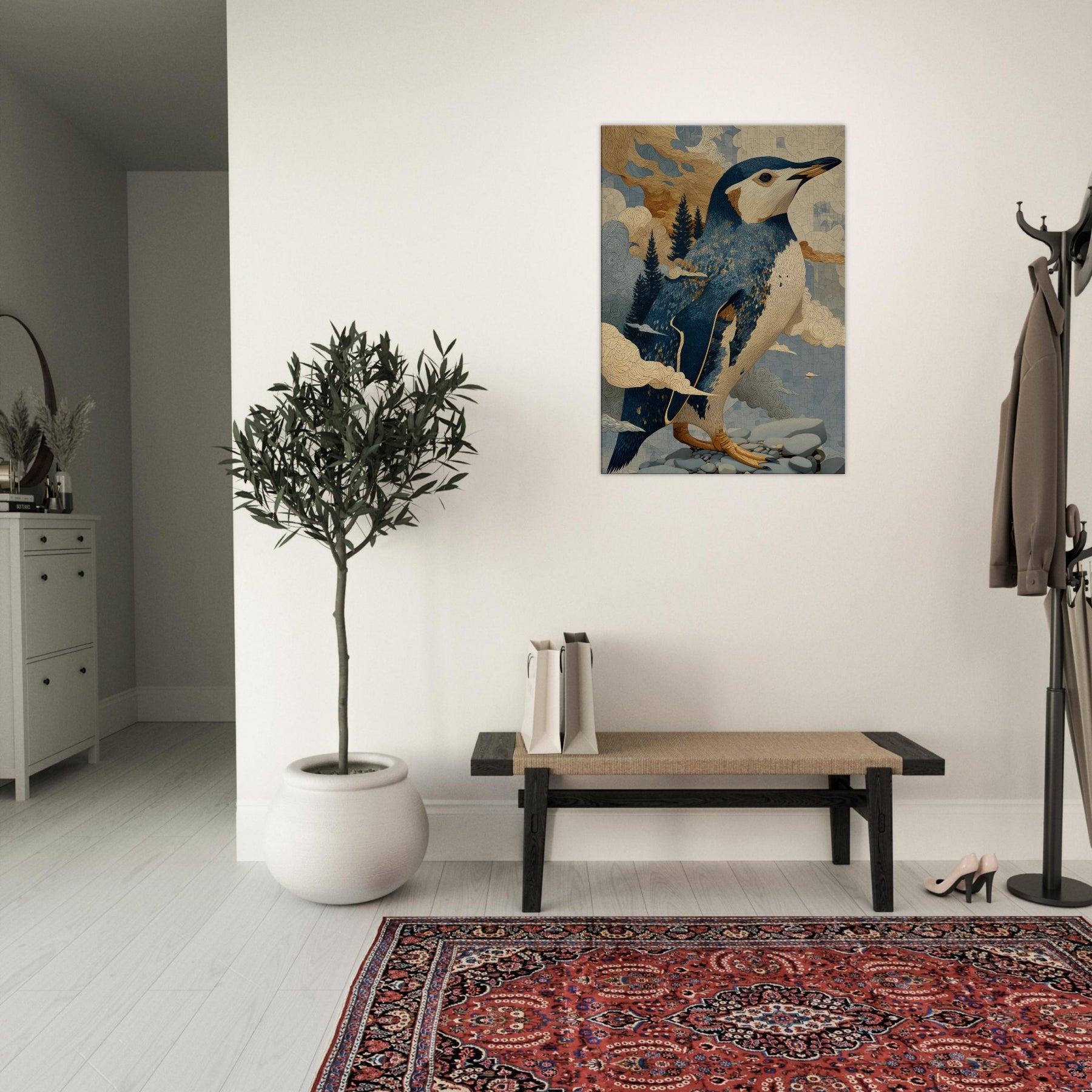 Step into a tide of quiet marvel where a Penguin stands crowned by wind sculpted clouds and a gold toned horizon. This surreal scene threads steel blue feathers, warm ochre light, and textured weather into one contemplative moment. The artwork invites slow breaths, soft corners, and a pause between days, turning a wall into a window of polar imagination. Perfect for a living room or study, it anchors color with calm confidence and a whisper of wonder.