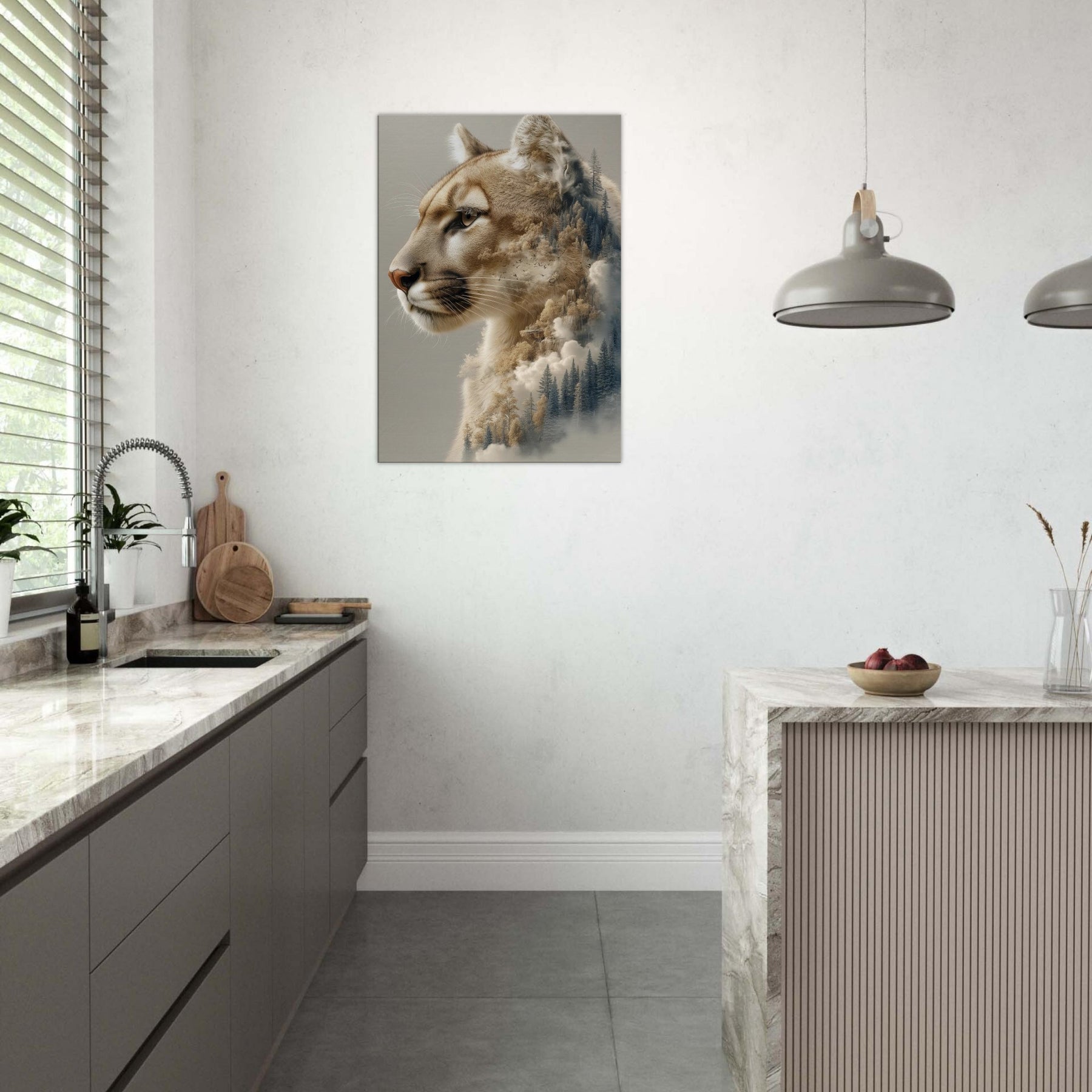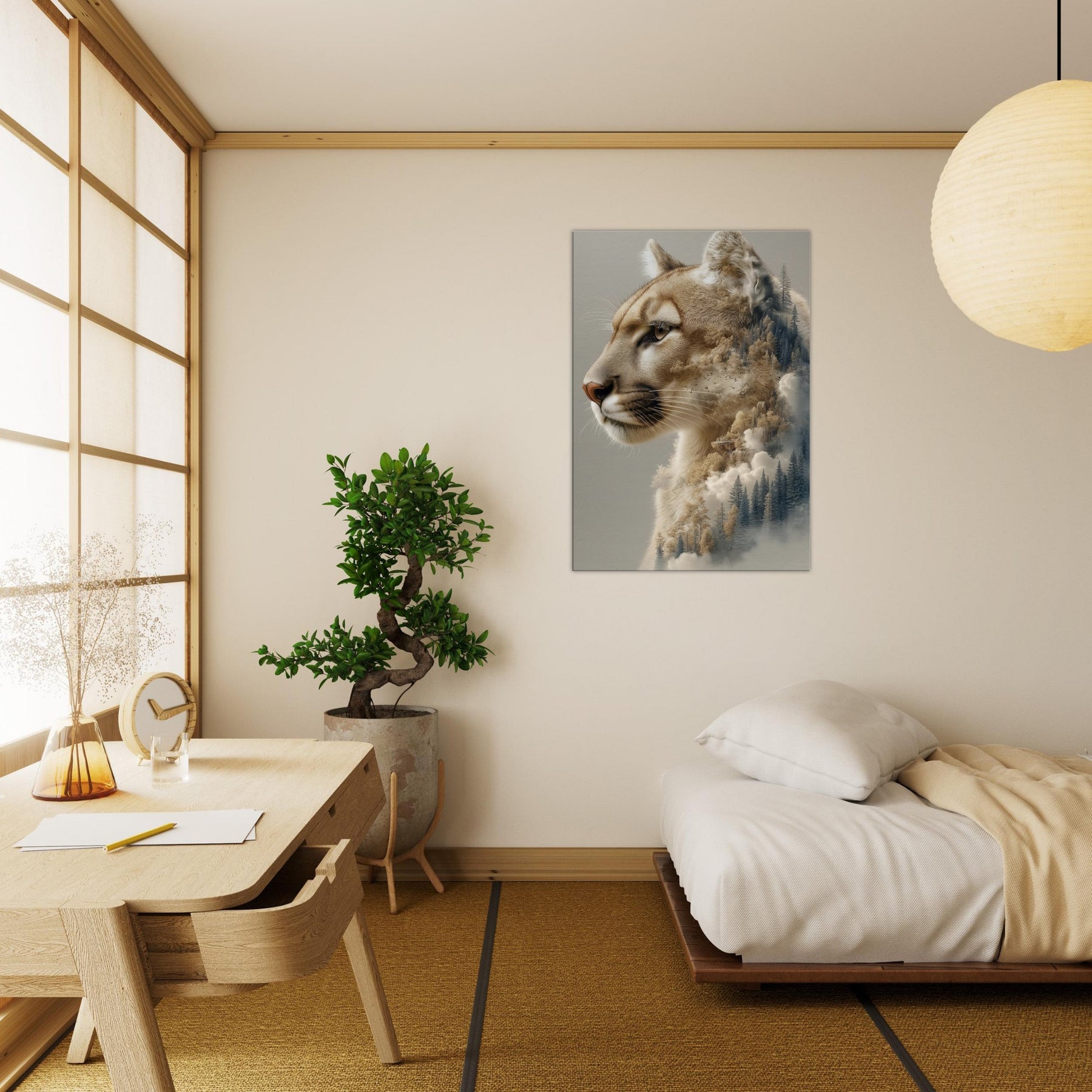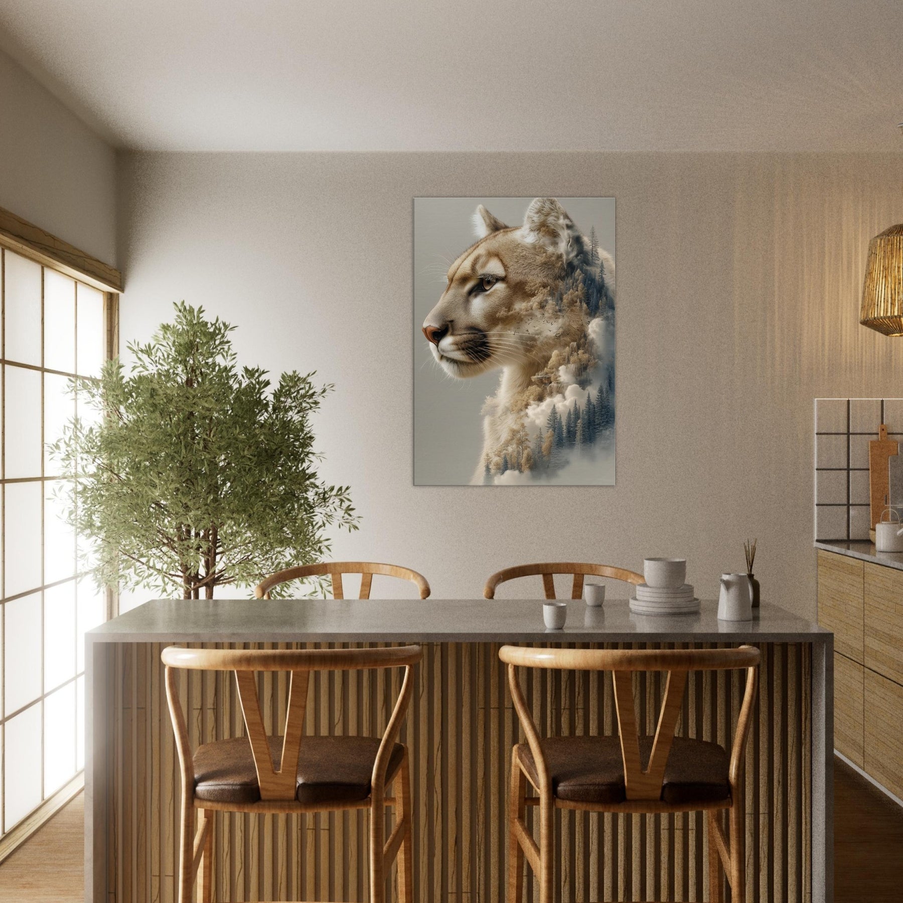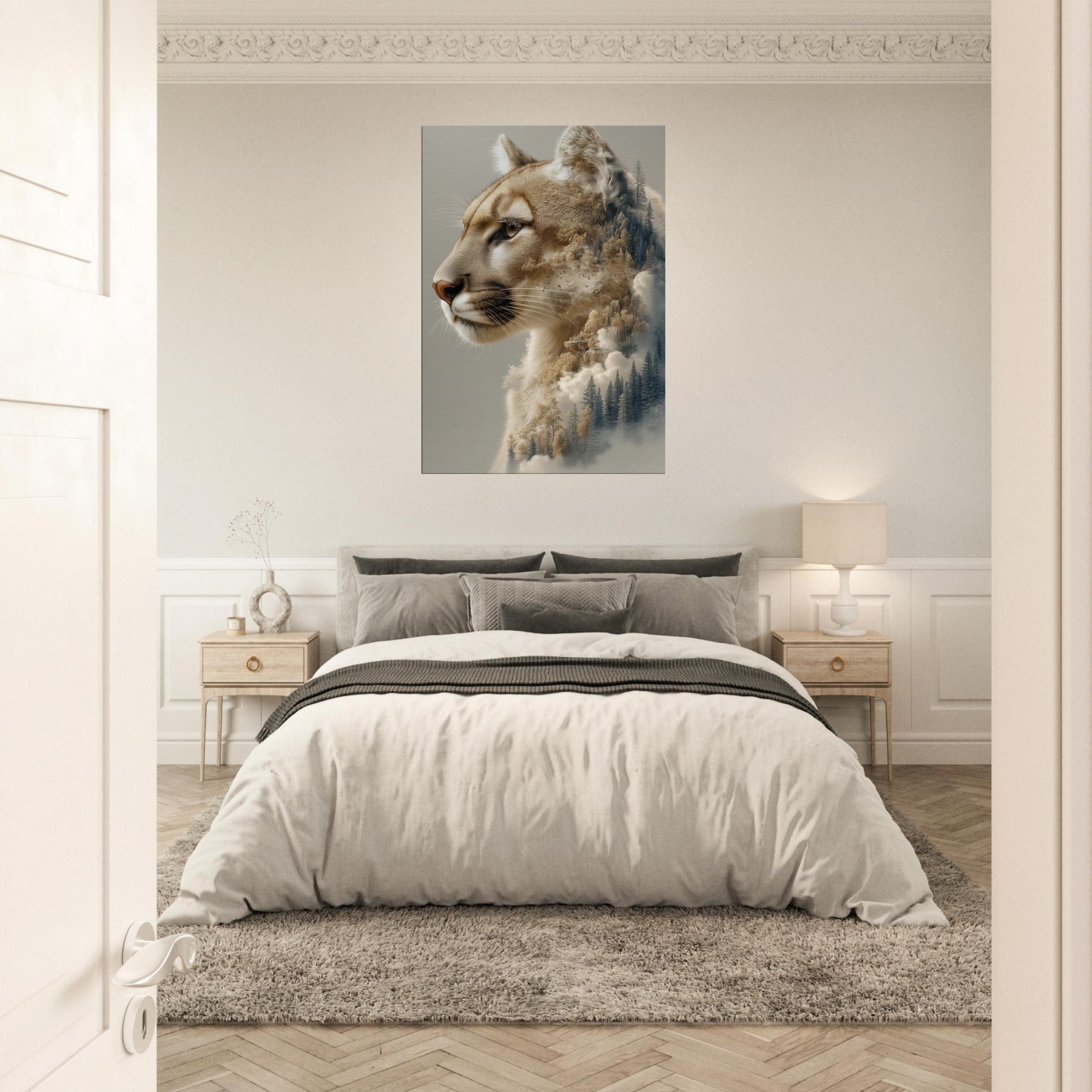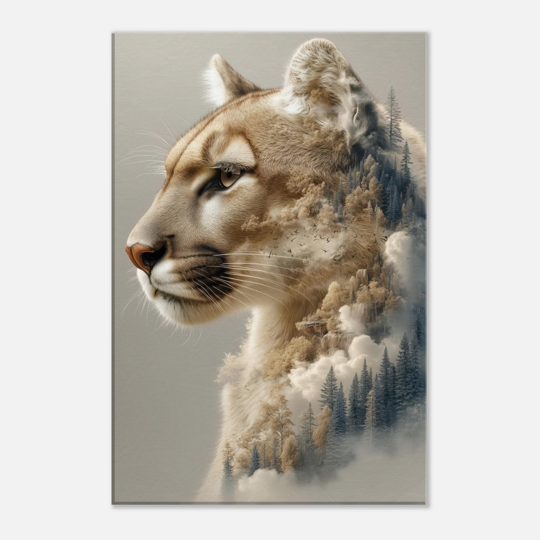 Step into a twilight where the panther patrols a dreamscape of pines and mist. This surreal composition fuses the animal’s quiet majesty with a forest’s tremulous textures, as if breath and wind become one image. The warm, caramel tones against cool evergreens invite calm focus, turning a wall into a window of contemplation. Perfect for a living room or study, it invites slow gazes, soft light, and a sense of restraint turned expansive an artful reminder that wilderness lives inside daylight walls.
