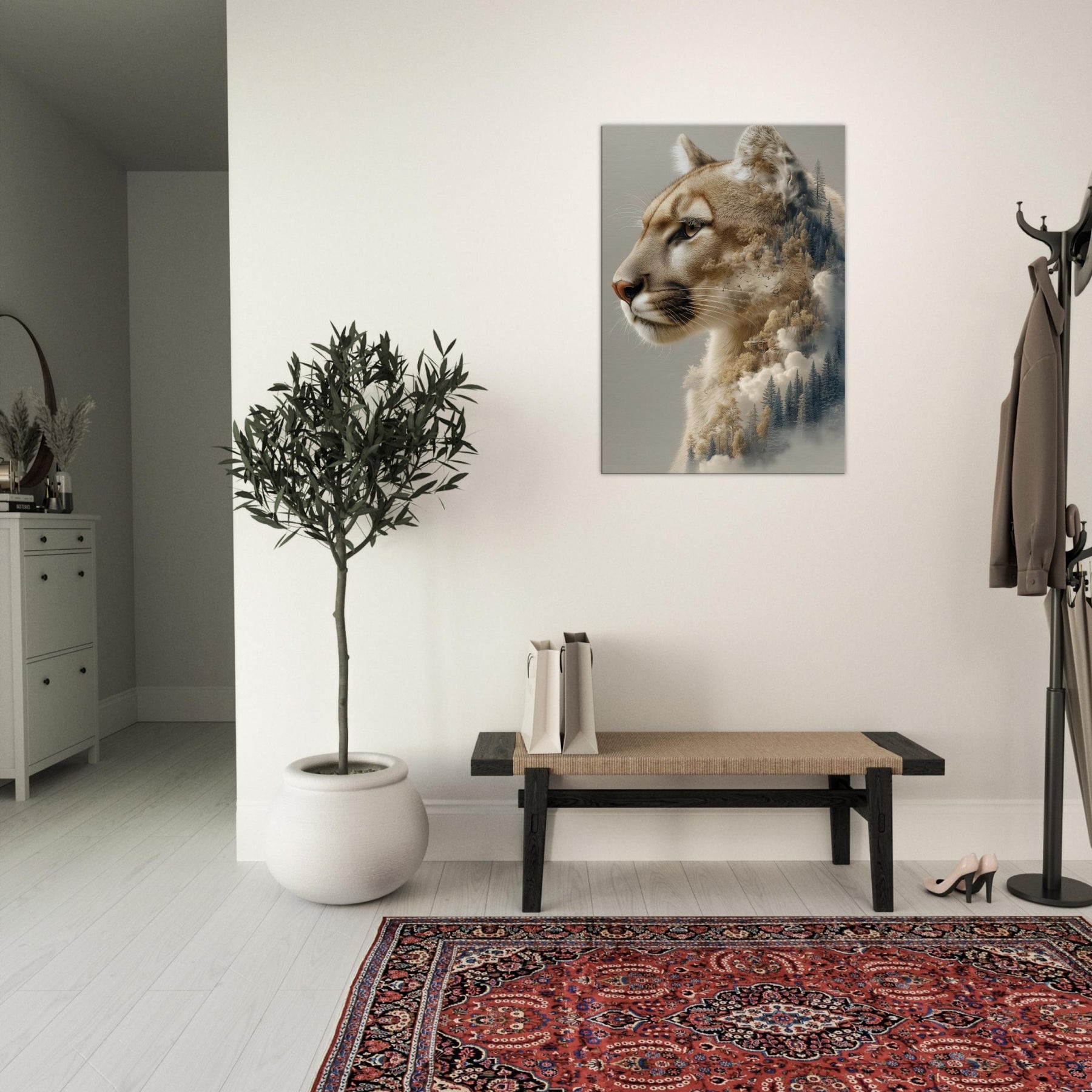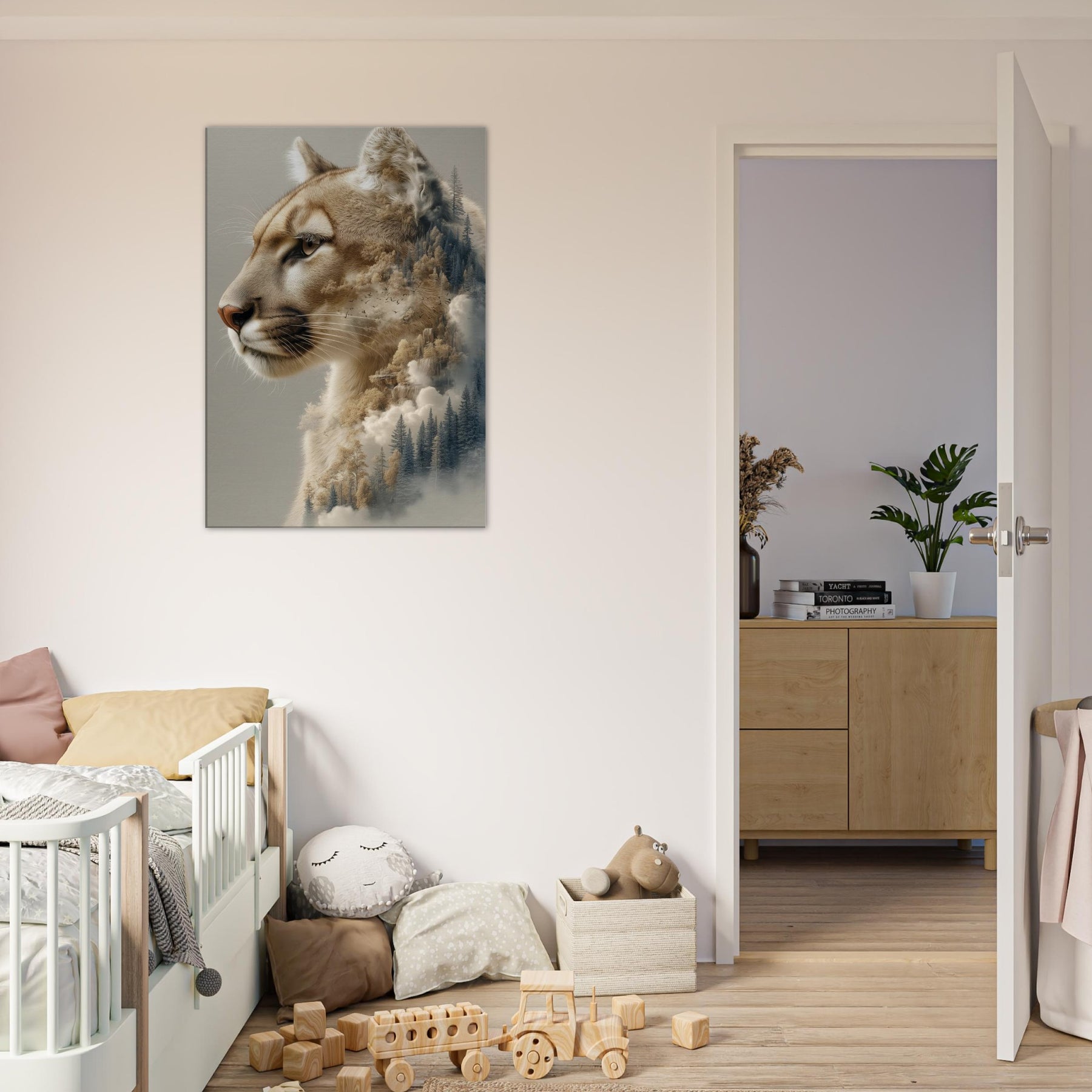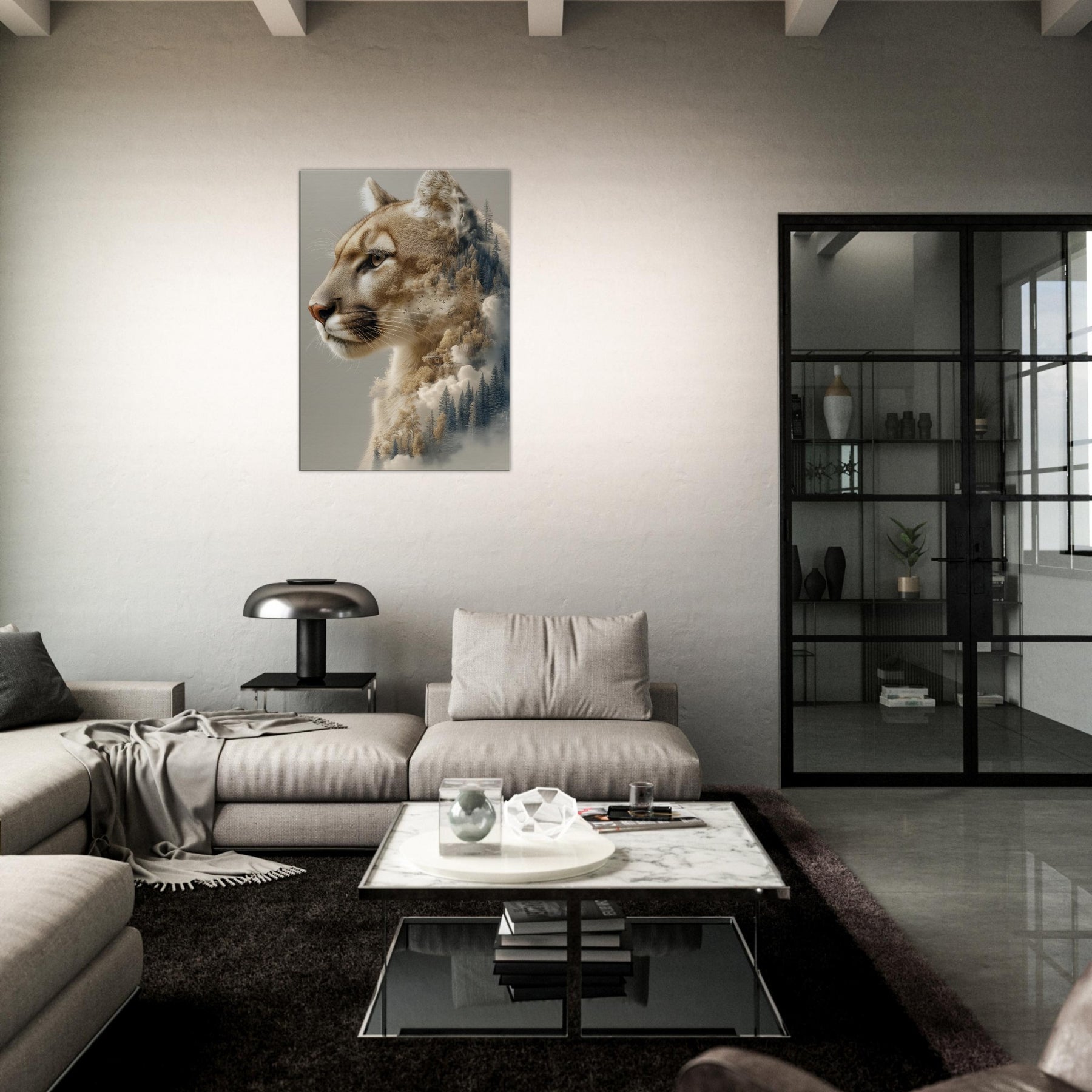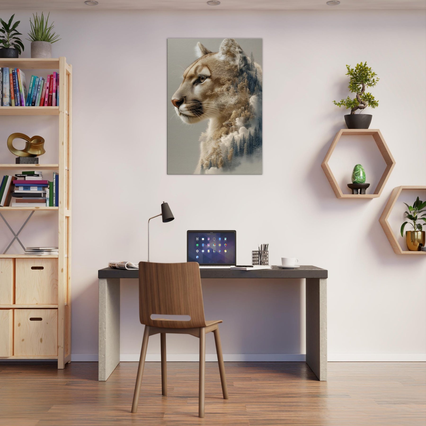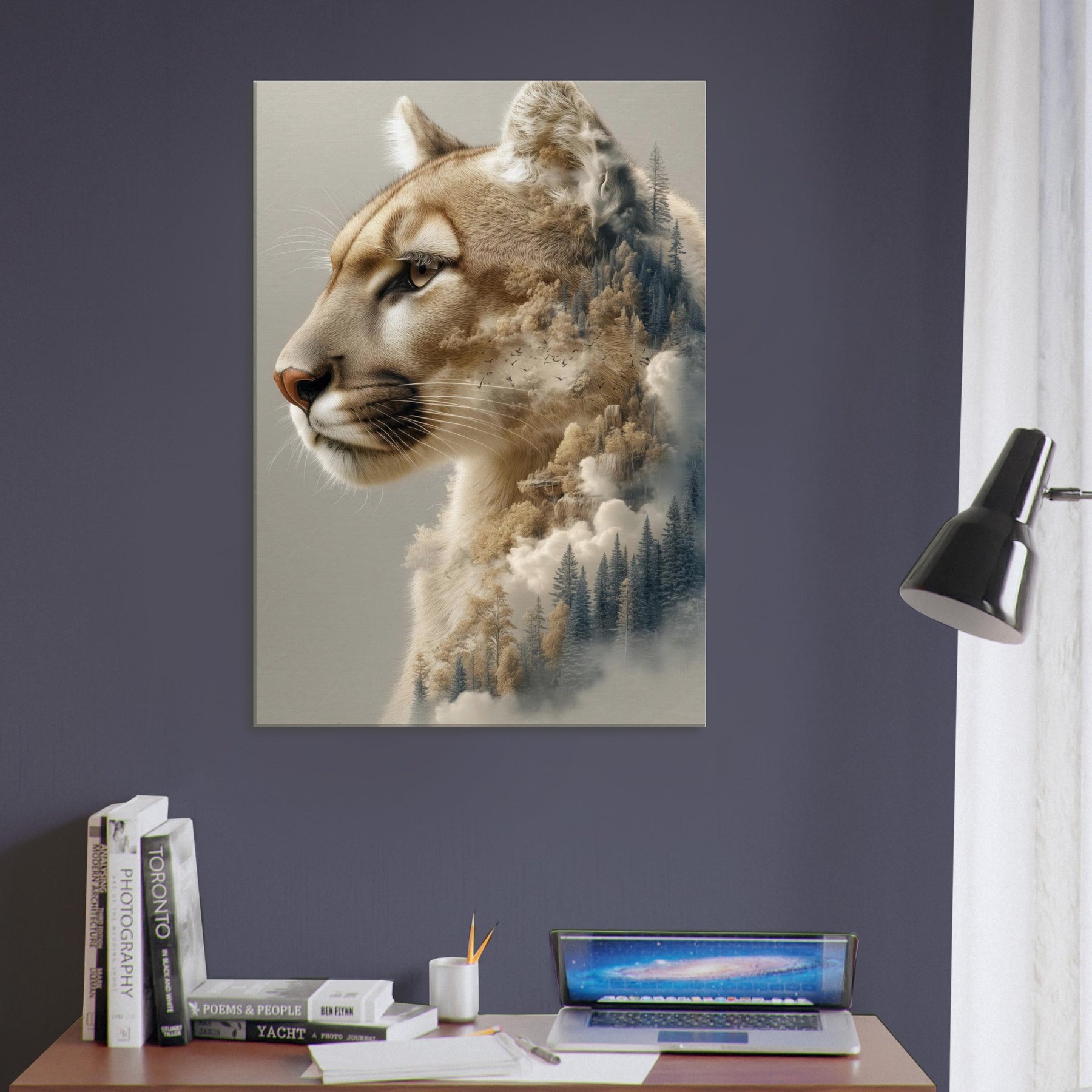 Step into a twilight where the panther patrols a dreamscape of pines and mist. This surreal composition fuses the animal’s quiet majesty with a forest’s tremulous textures, as if breath and wind become one image. The warm, caramel tones against cool evergreens invite calm focus, turning a wall into a window of contemplation. Perfect for a living room or study, it invites slow gazes, soft light, and a sense of restraint turned expansive an artful reminder that wilderness lives inside daylight walls.