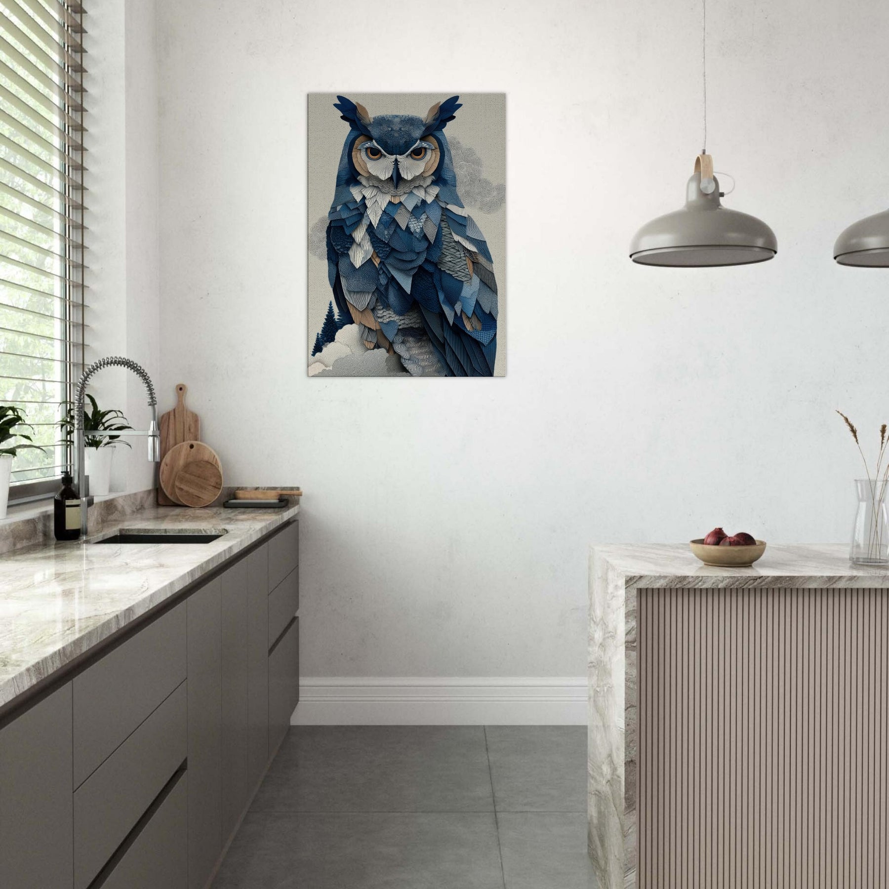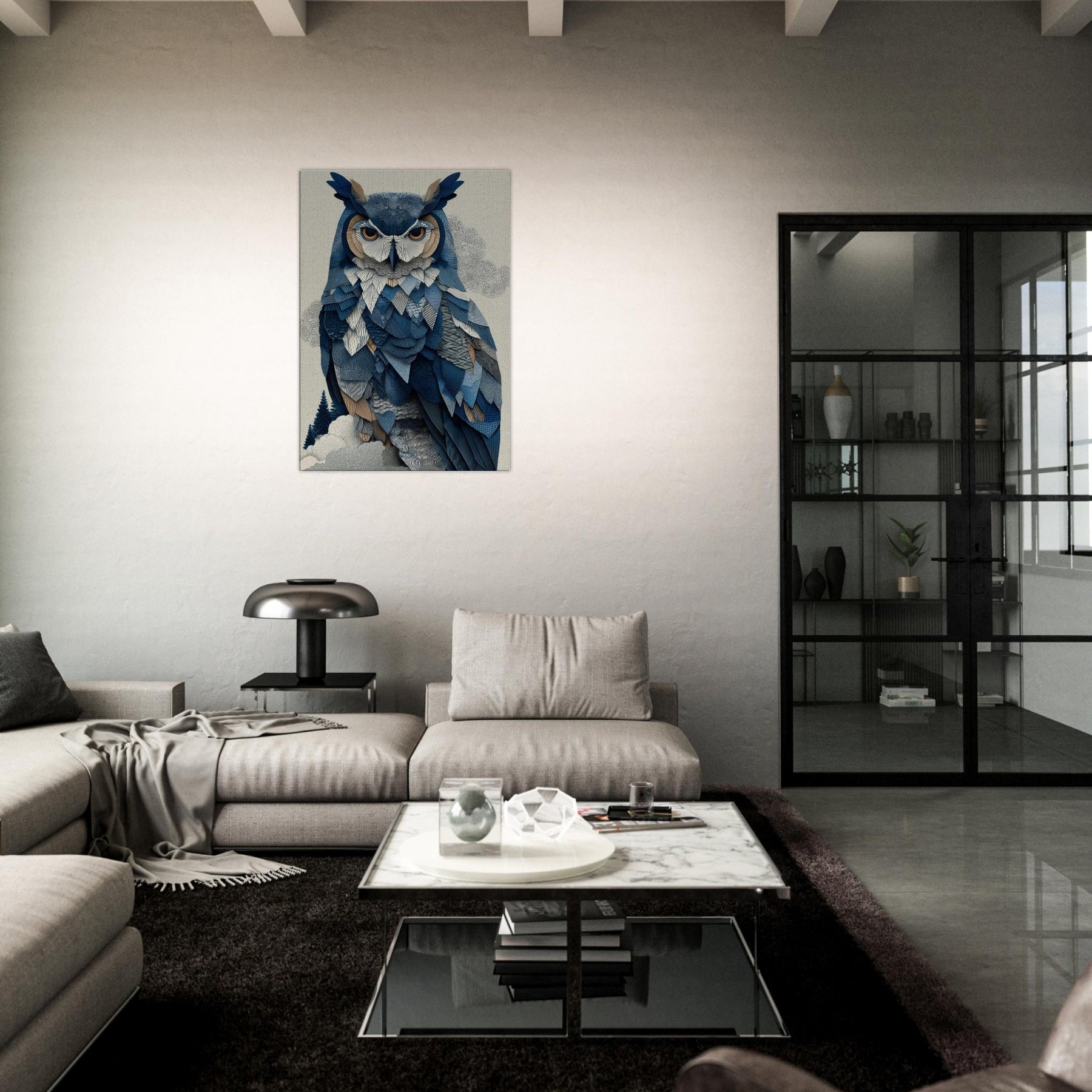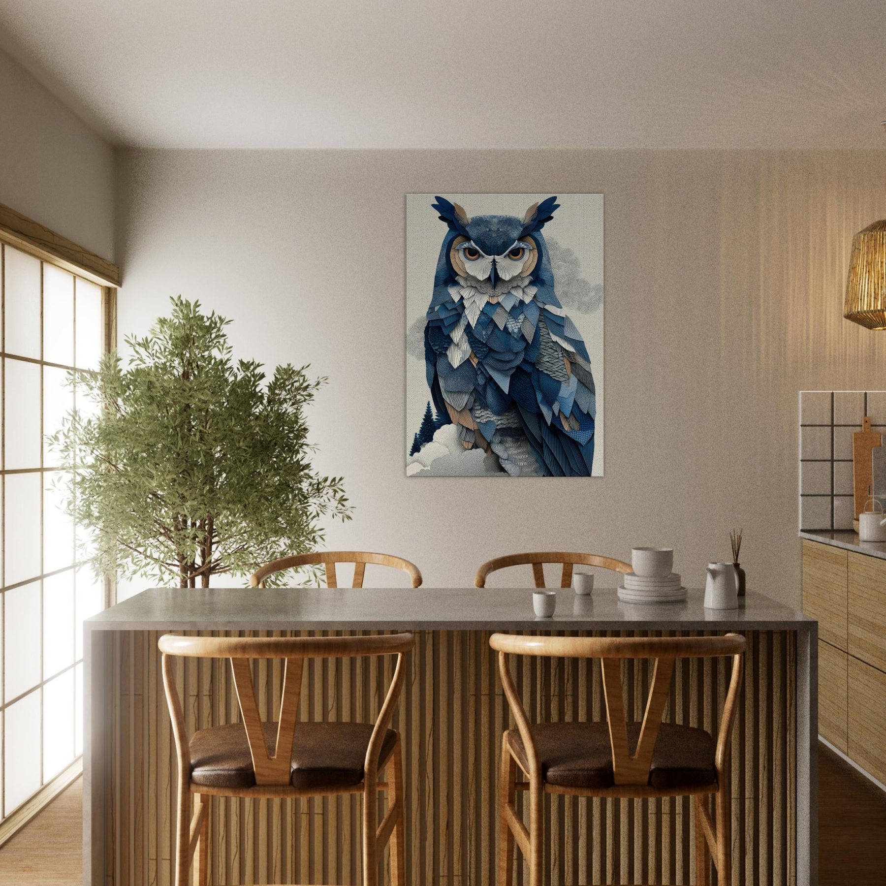 An Owl rises from a mosaic of folded planes, its eyes a lantern of focus in a blue dusk. This surreal threads memory into texture, transforming feathers into geometric motifs that shimmer with quiet radiance. The layered blues, taupes, and slate tones conjure moonlit forests and whispering winds, shaping a mood of thoughtful mystery. In a living space, it adds tactile depth and contemplative calm, inviting stillness, curiosity, and dreamlike conversation. The Owl anchors the room with nocturnal grace and refined, modern allure.