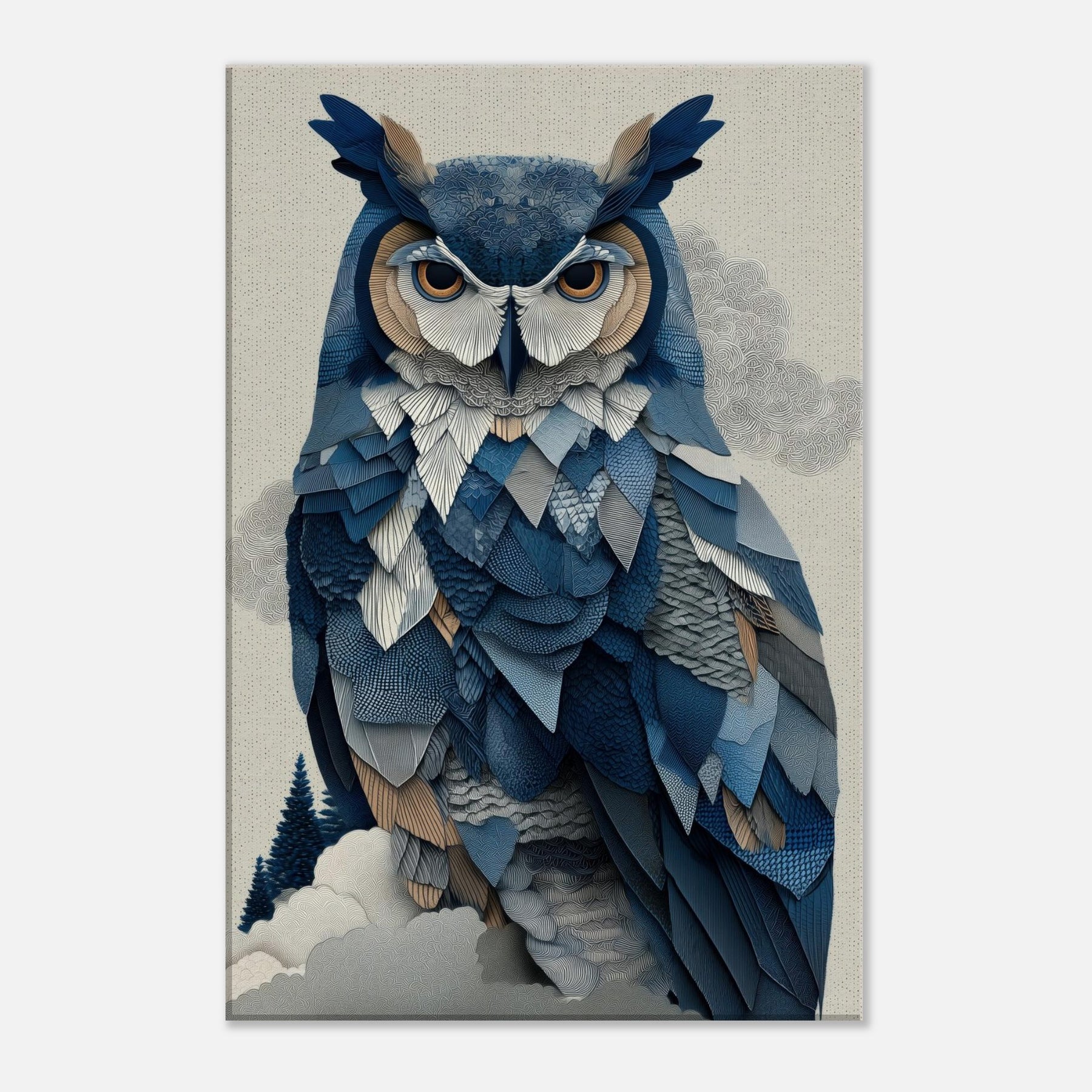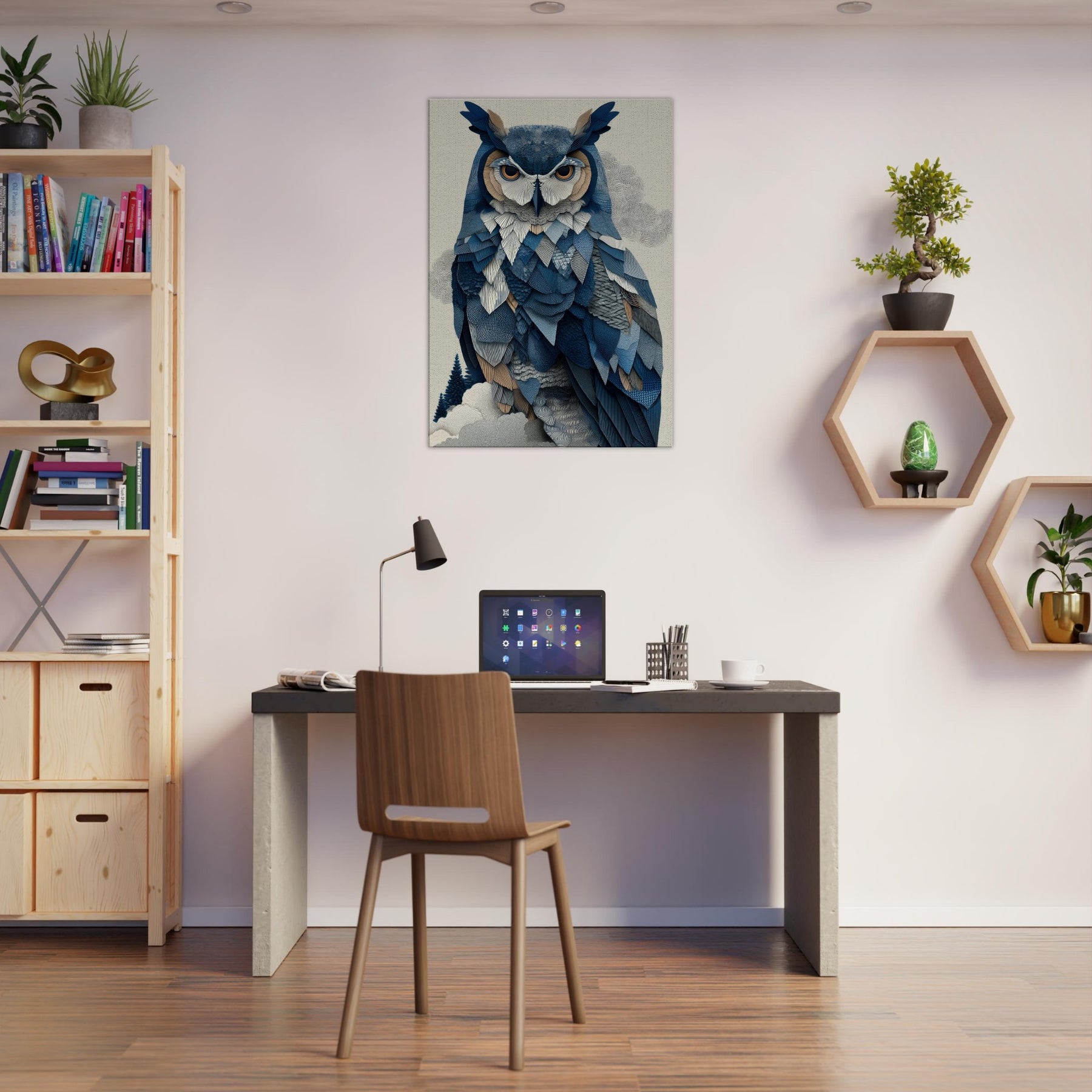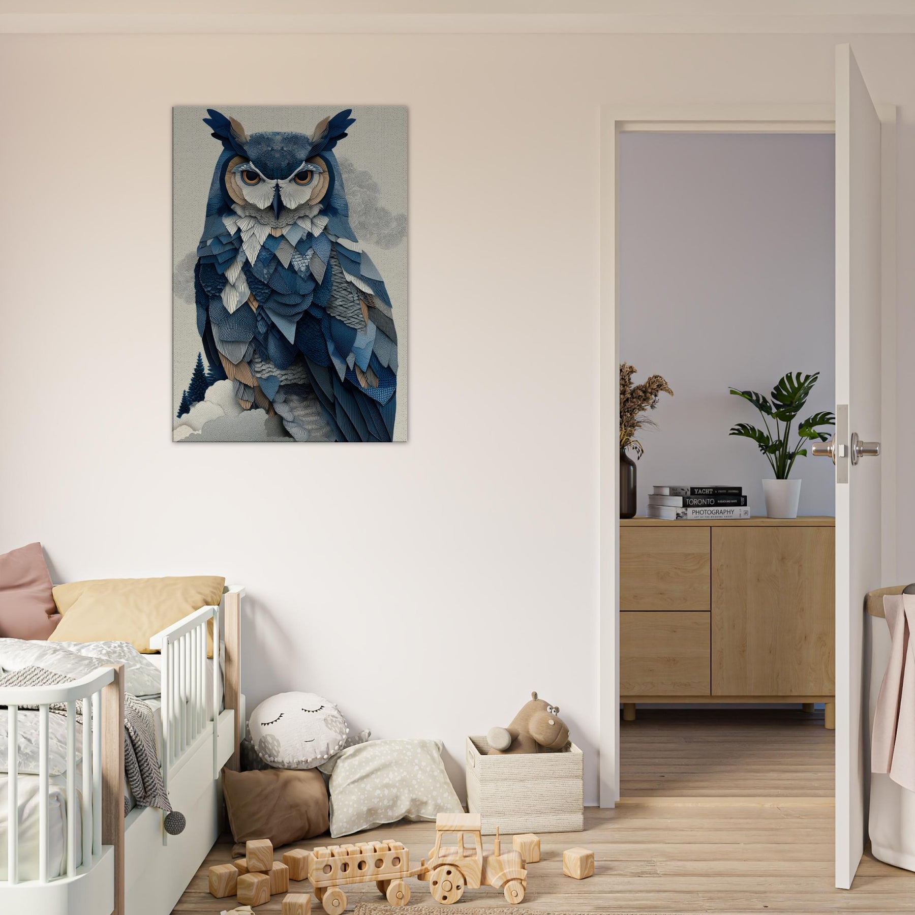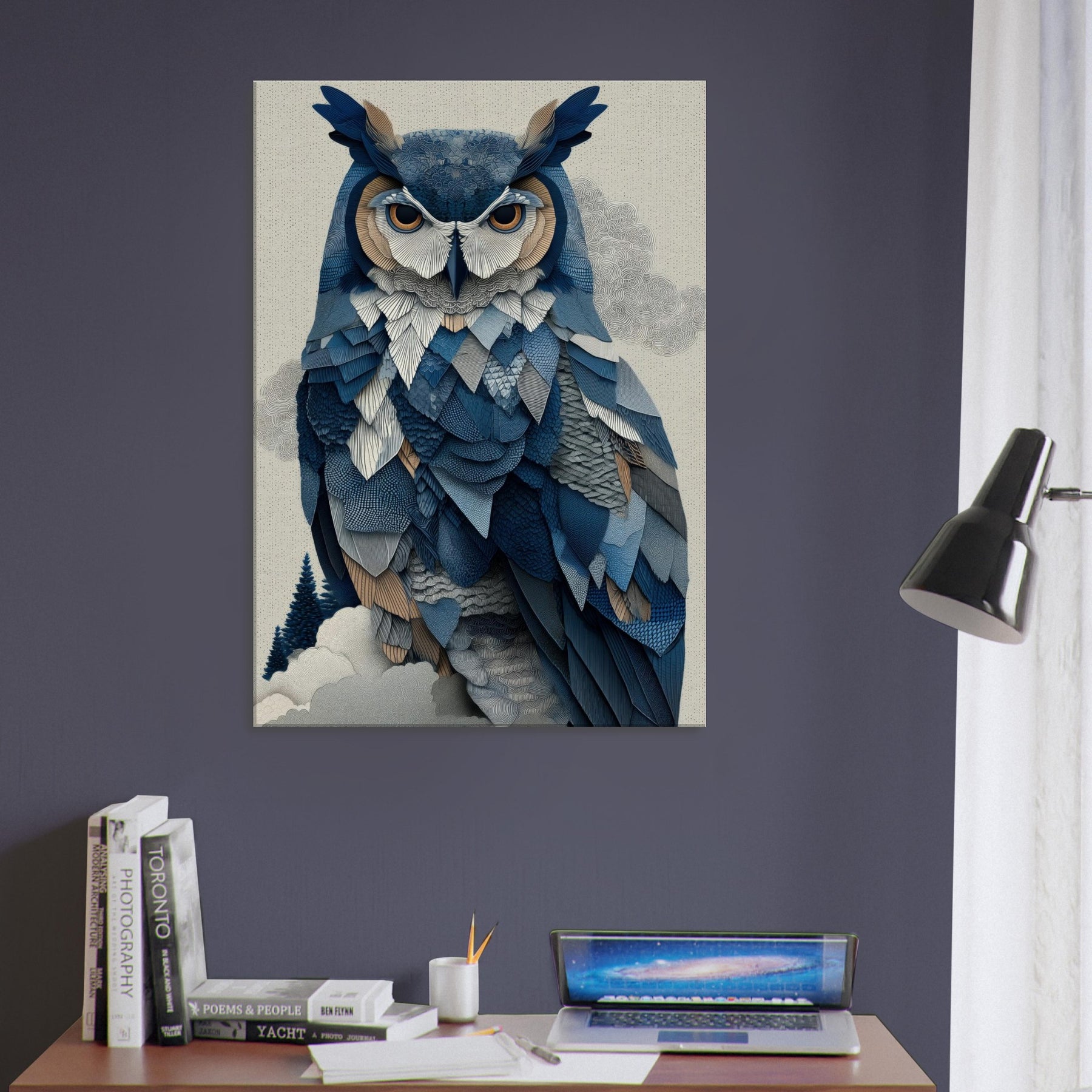 An Owl rises from a mosaic of folded planes, its eyes a lantern of focus in a blue dusk. This surreal threads memory into texture, transforming feathers into geometric motifs that shimmer with quiet radiance. The layered blues, taupes, and slate tones conjure moonlit forests and whispering winds, shaping a mood of thoughtful mystery. In a living space, it adds tactile depth and contemplative calm, inviting stillness, curiosity, and dreamlike conversation. The Owl anchors the room with nocturnal grace and refined, modern allure.