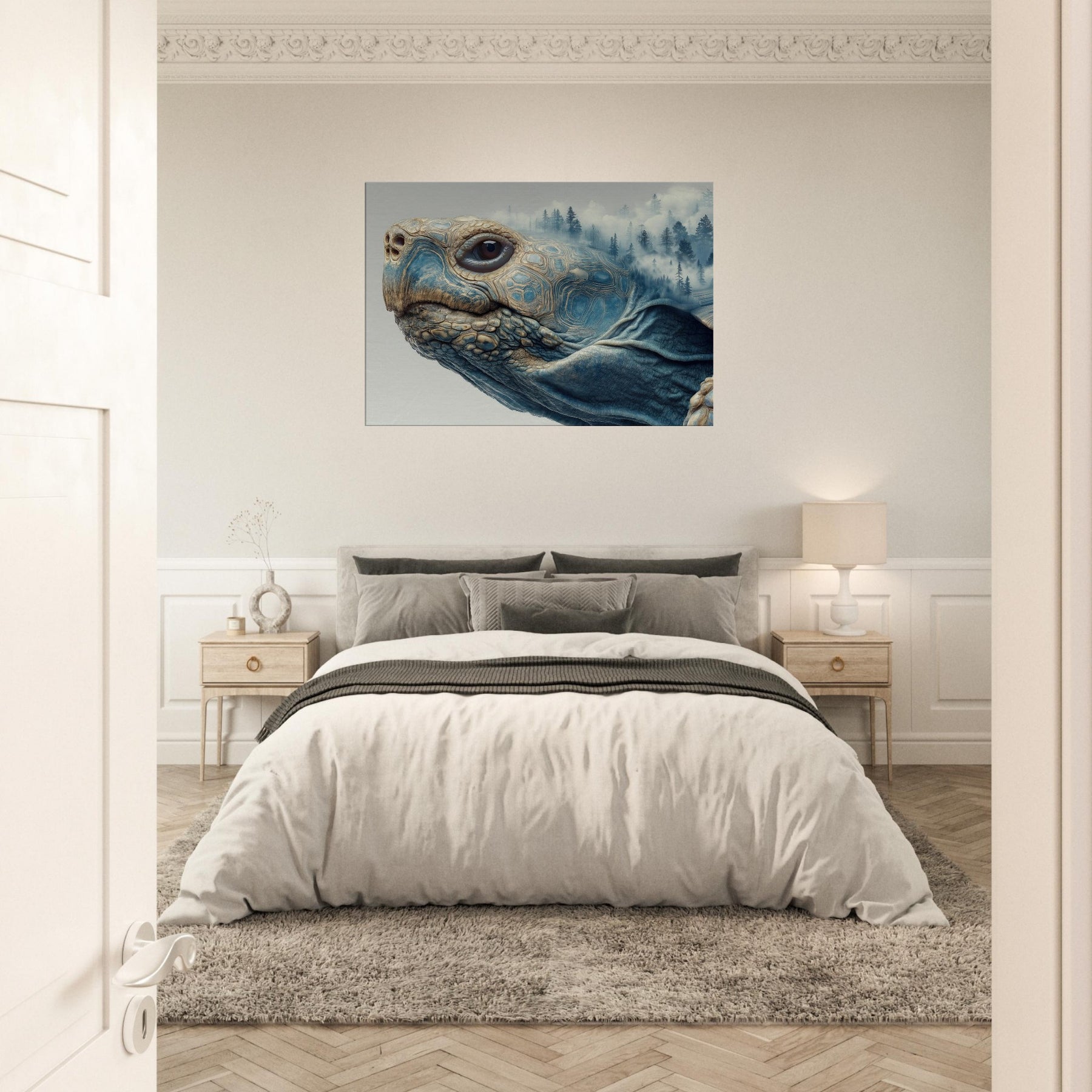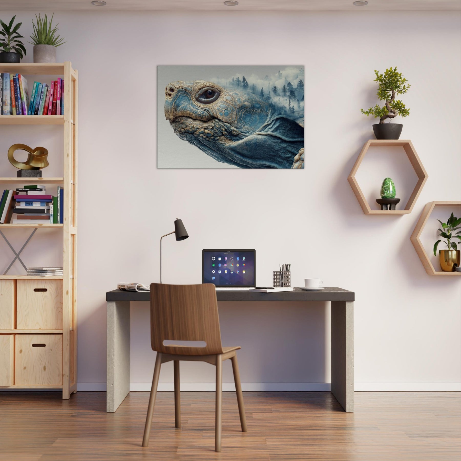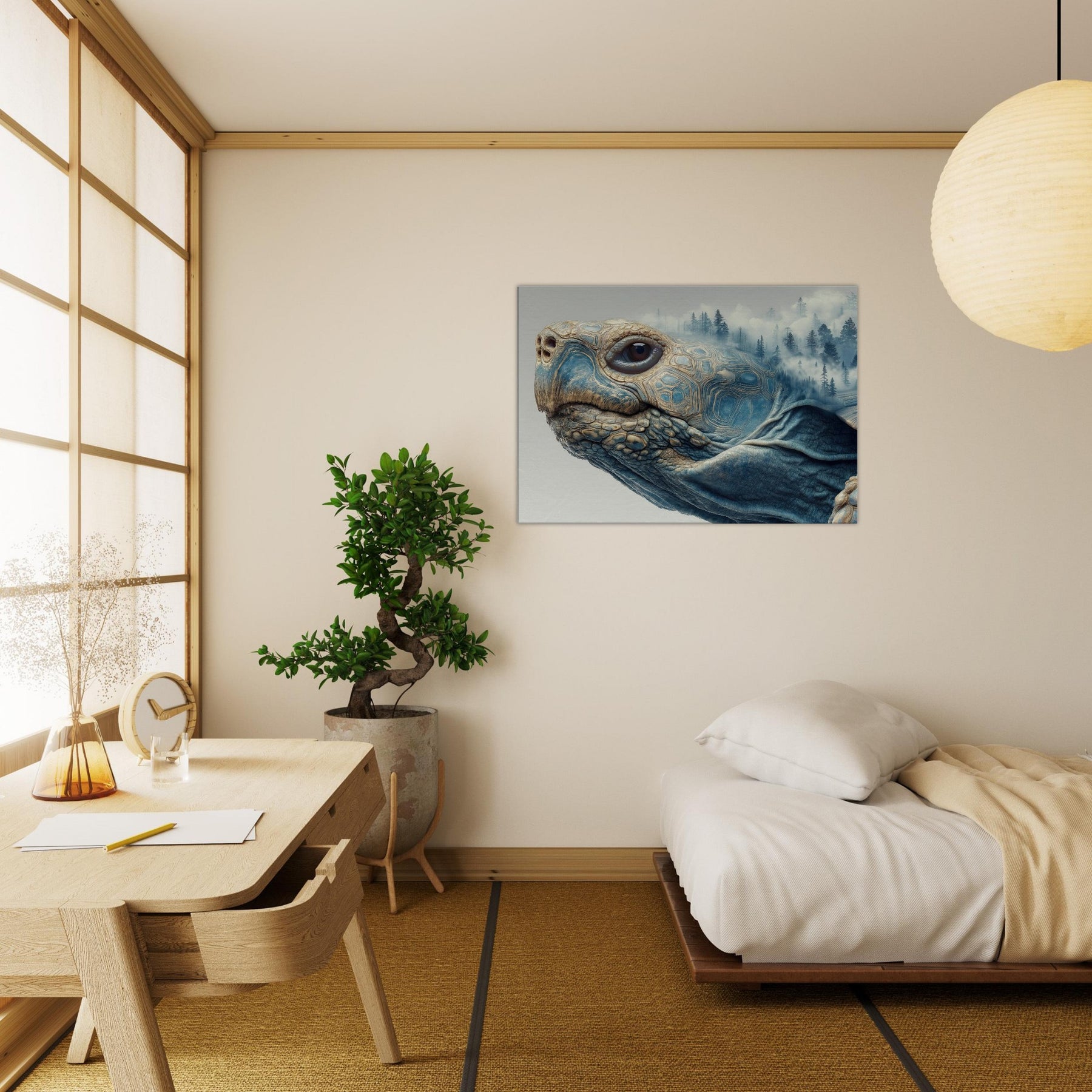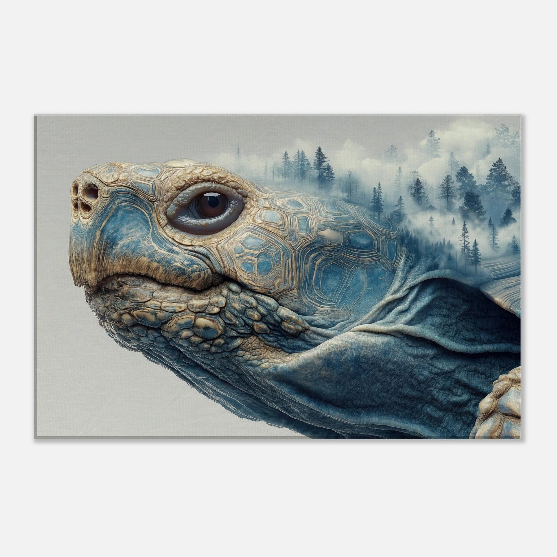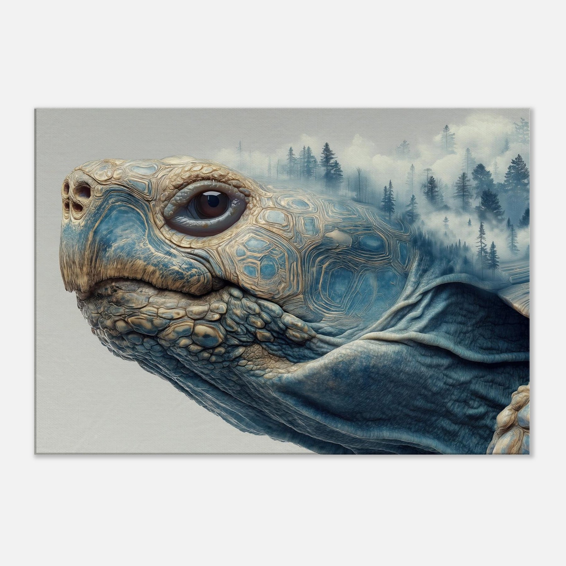 This surreal scene folds a forest into the shell of a contemplative Turtle, where mist drifts between pine silhouettes and the geometry of its carapace tessellates into dreamlike landscapes. The soft blues and warm earth tones glow with quiet energy, inviting calm and curiosity. Placed in a living room or bedroom, it acts as a horizon between daydream and daylight, grounding the space while lifting the gaze and sparking slow, meaningful conversation.