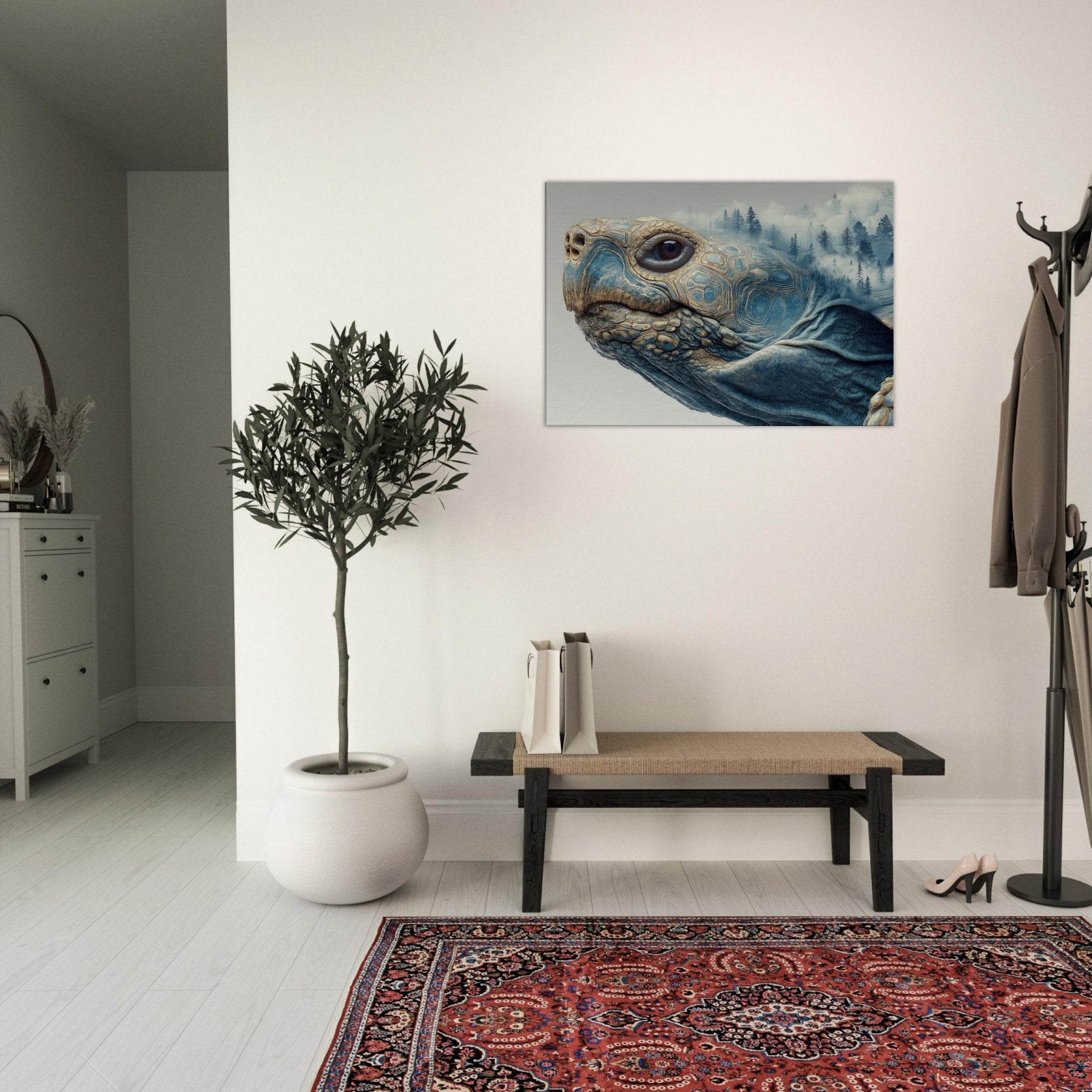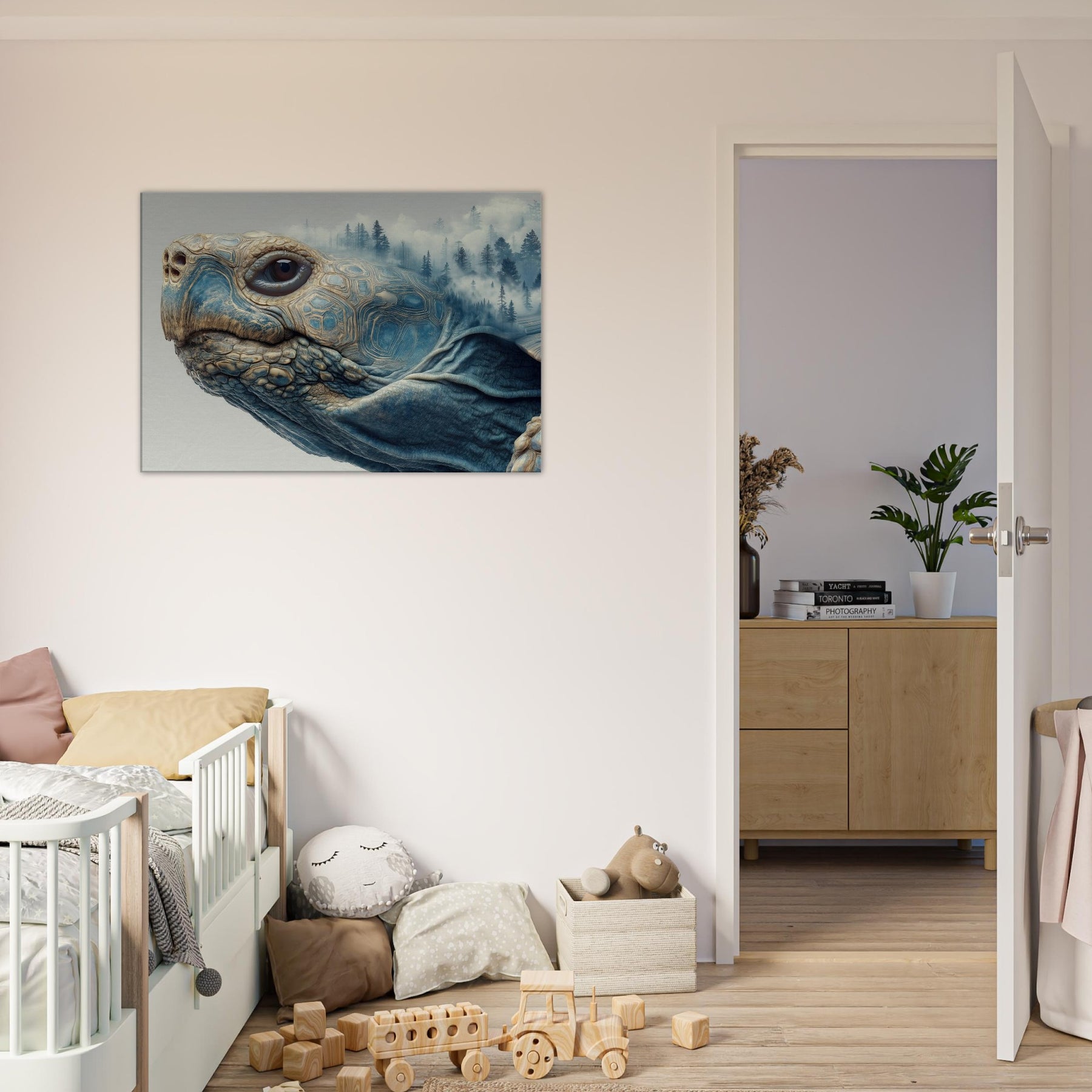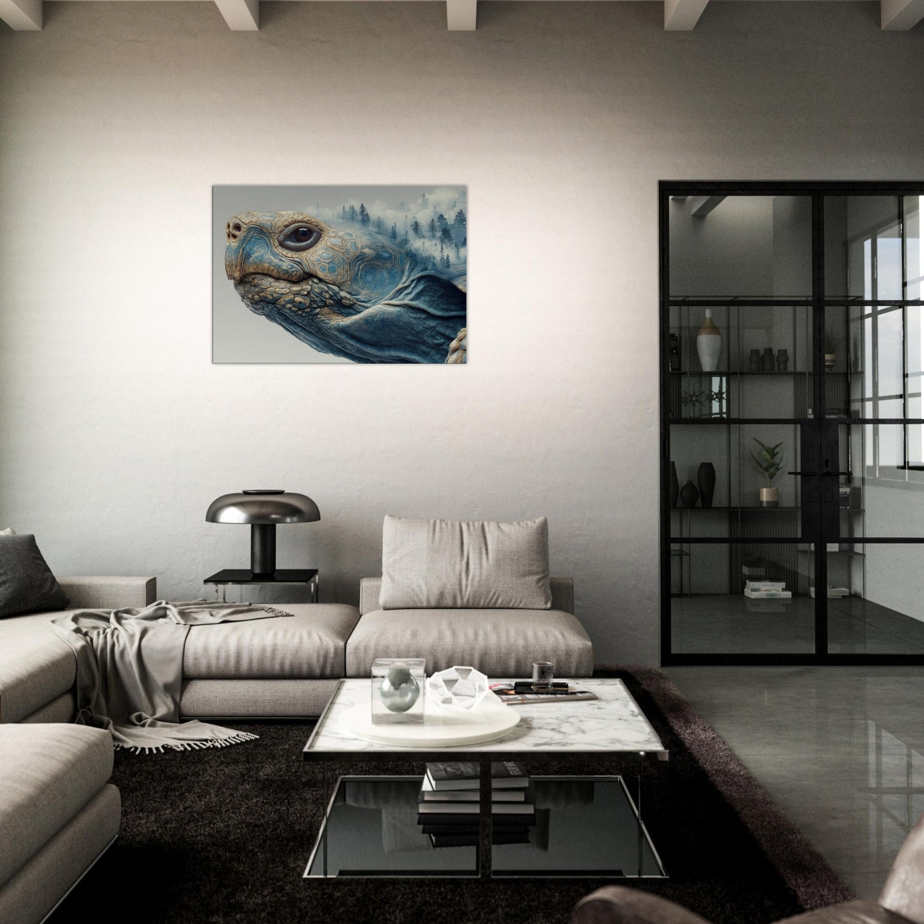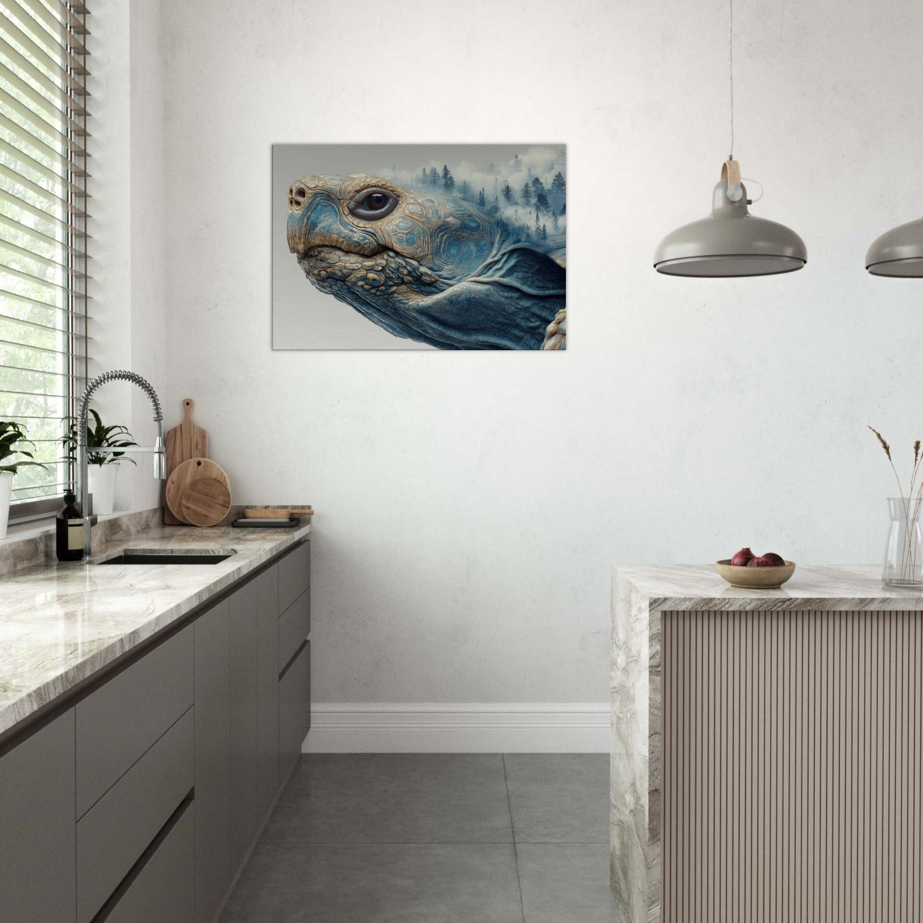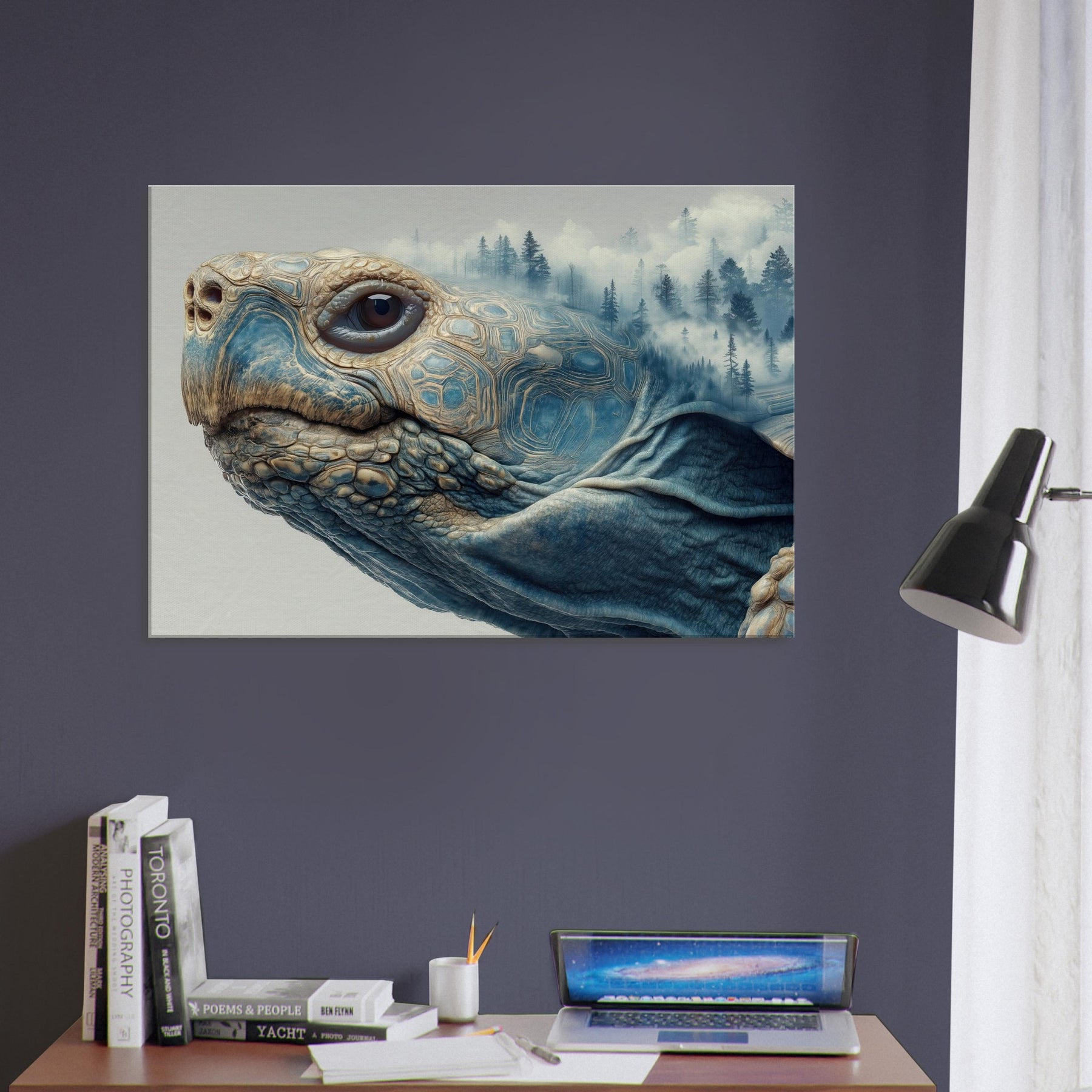 This surreal scene folds a forest into the shell of a contemplative Turtle, where mist drifts between pine silhouettes and the geometry of its carapace tessellates into dreamlike landscapes. The soft blues and warm earth tones glow with quiet energy, inviting calm and curiosity. Placed in a living room or bedroom, it acts as a horizon between daydream and daylight, grounding the space while lifting the gaze and sparking slow, meaningful conversation.