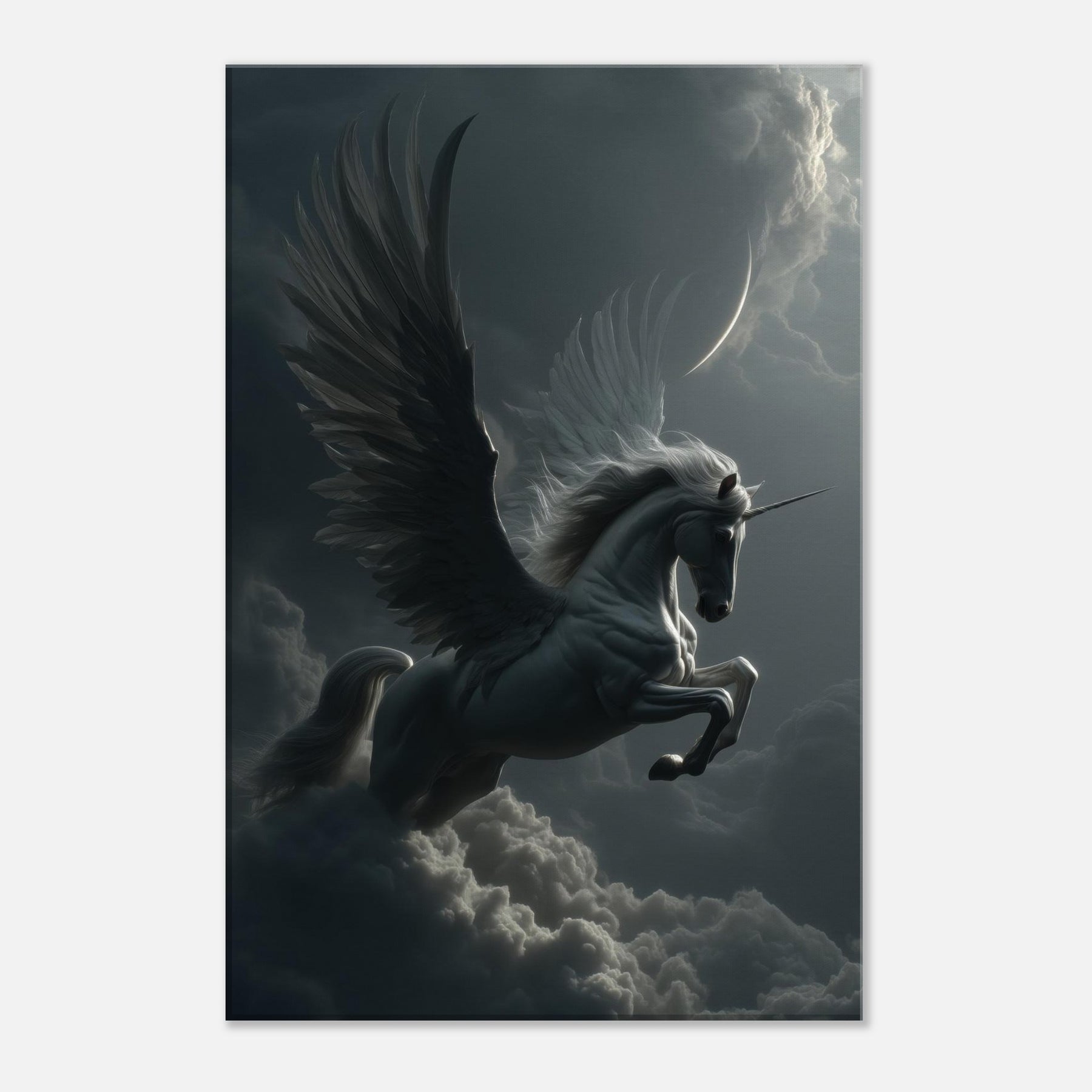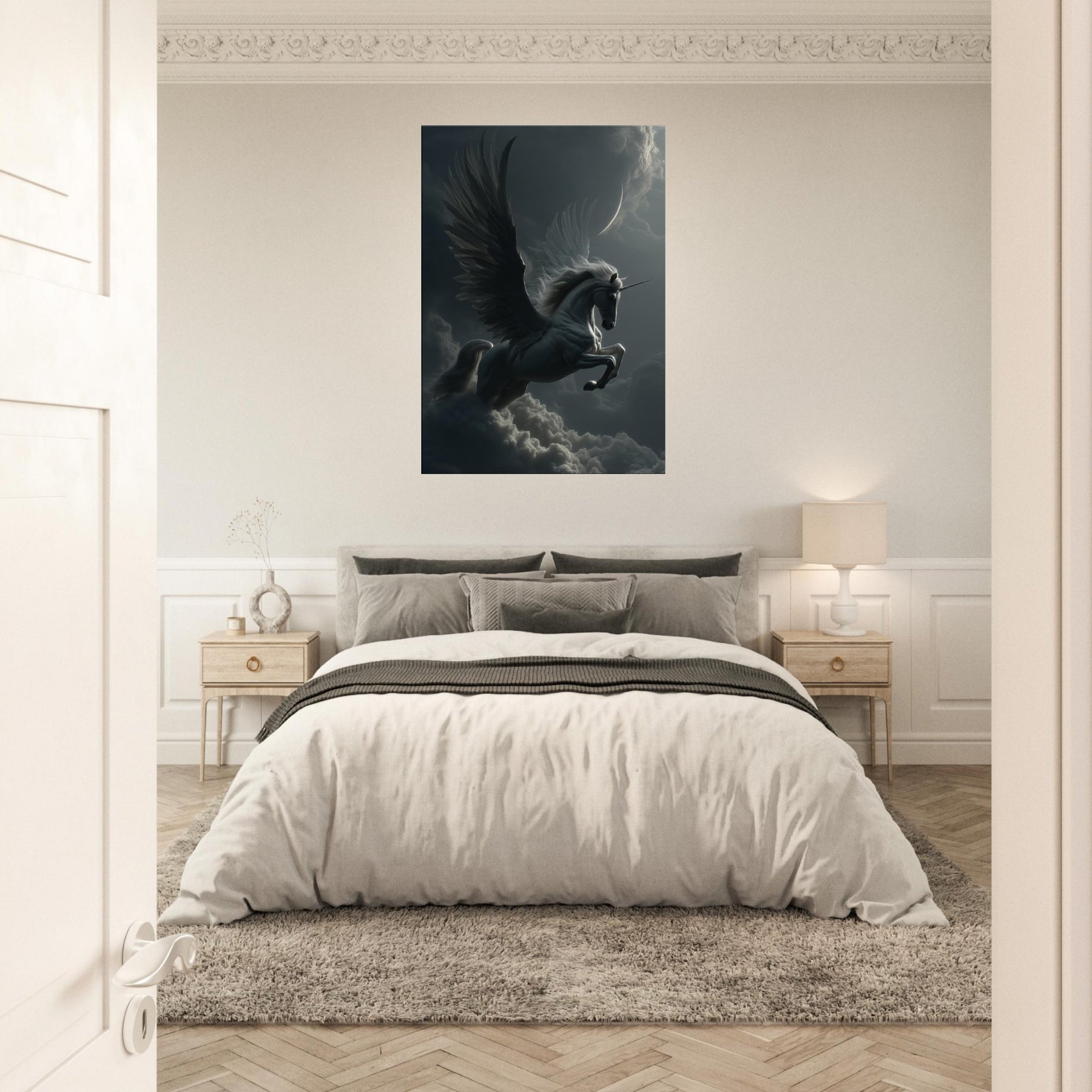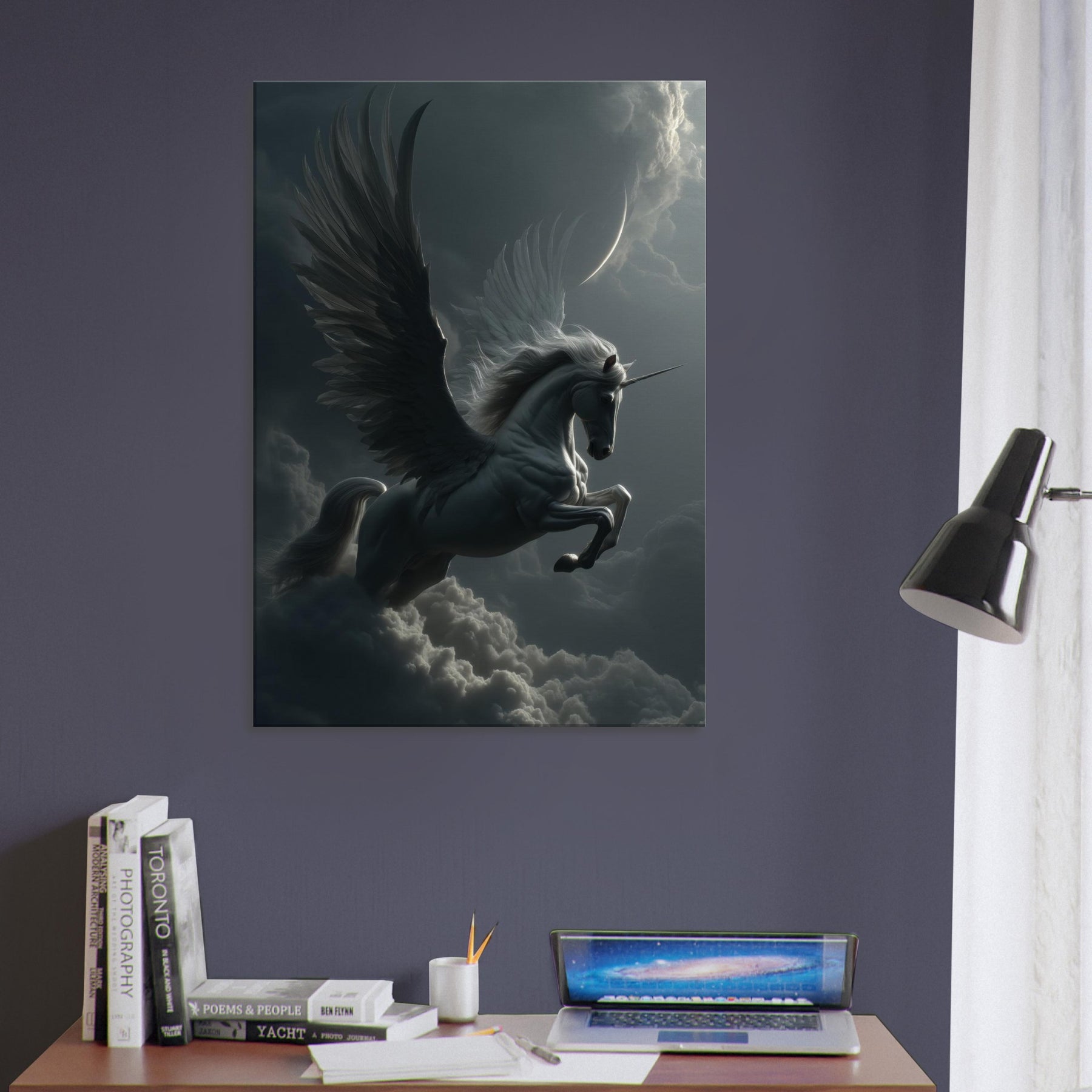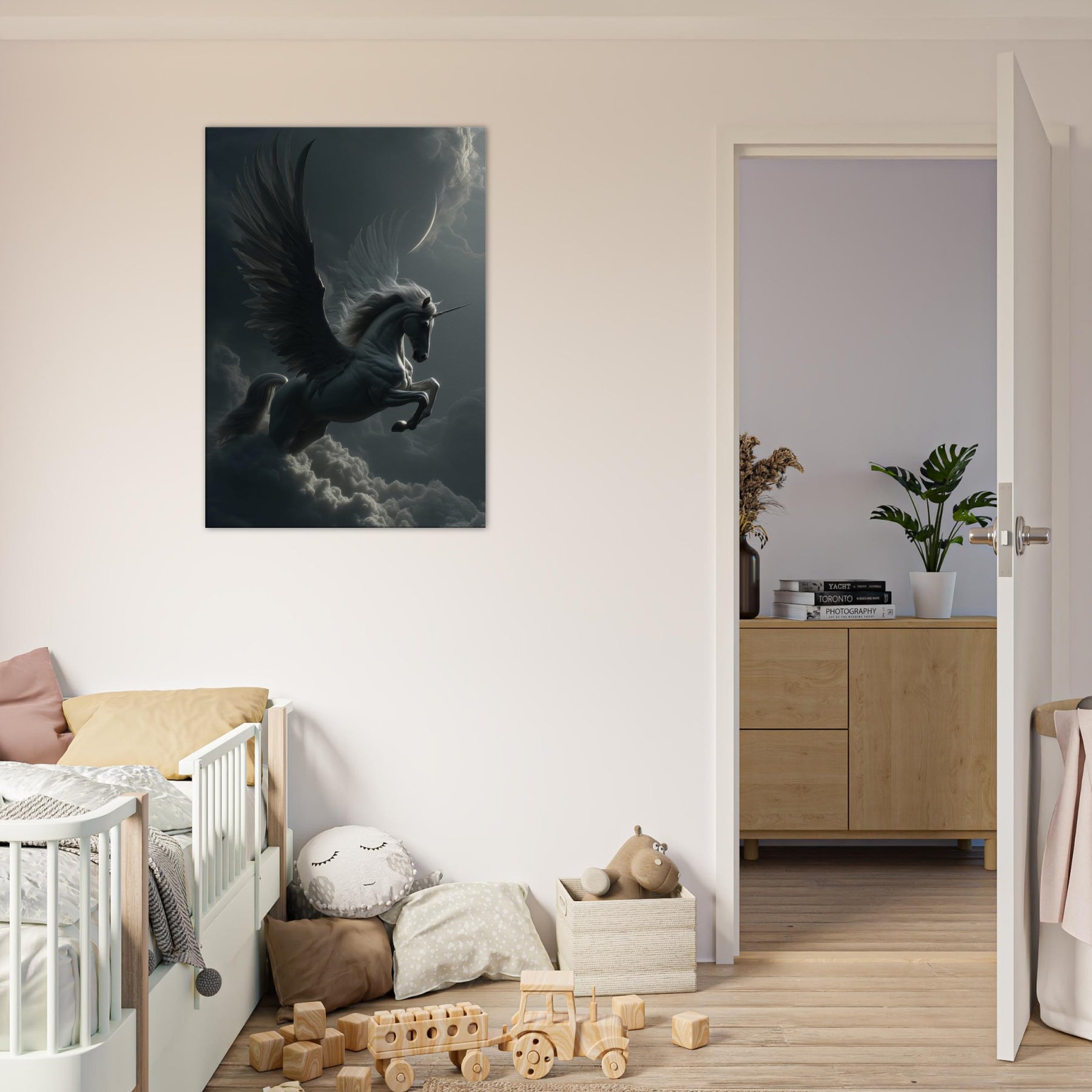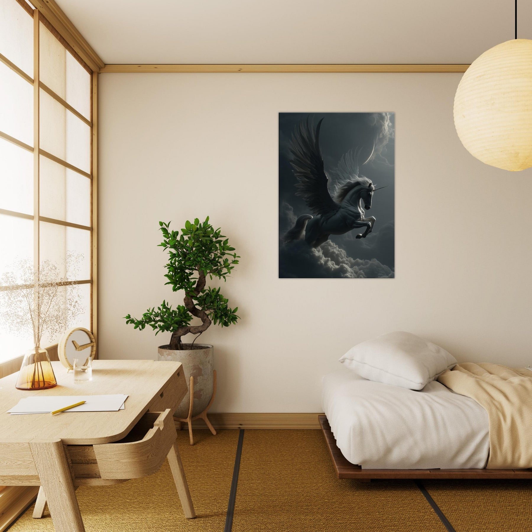 Immerse your living space in a moment between breath and wind as a luminous celestial horse glides above a sea of billowing clouds. The Surrealist composition folds light and shadow into a dreamlike corridor of dusk, where silver wings cut through moonlit air. The atmosphere is both tranquil and electric, inviting quiet reflection or bold conversation. Displaying Celestial Pegasus Flying Through Clouds, this piece transforms walls into a portal a quiet epic that elevates a lounge, study, or bedroom with mythic grace and wordless wonder.