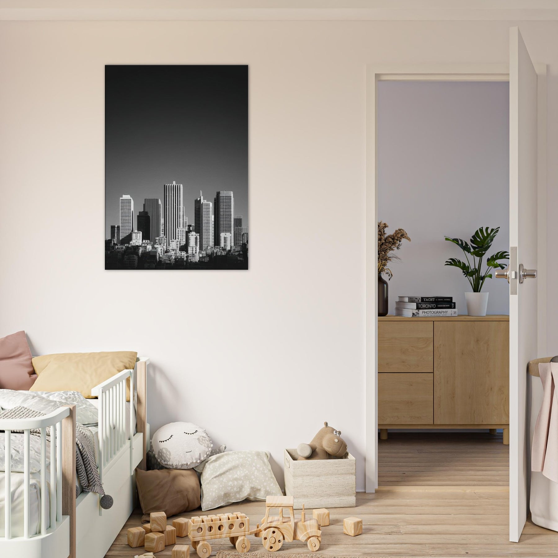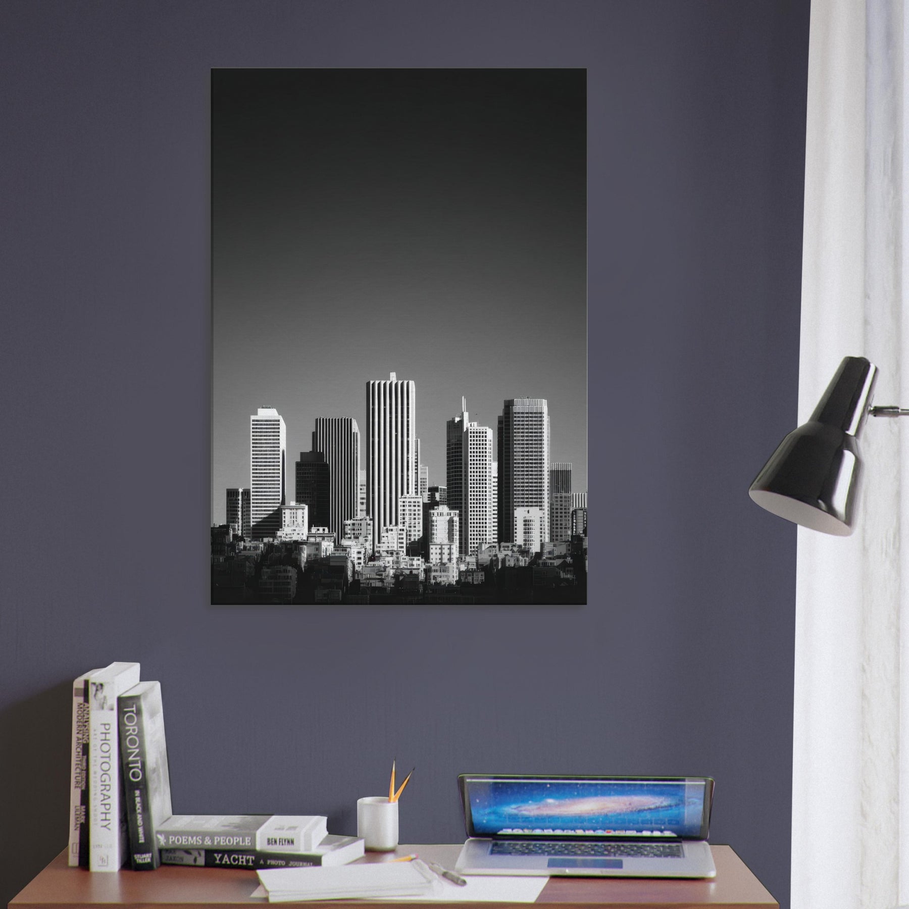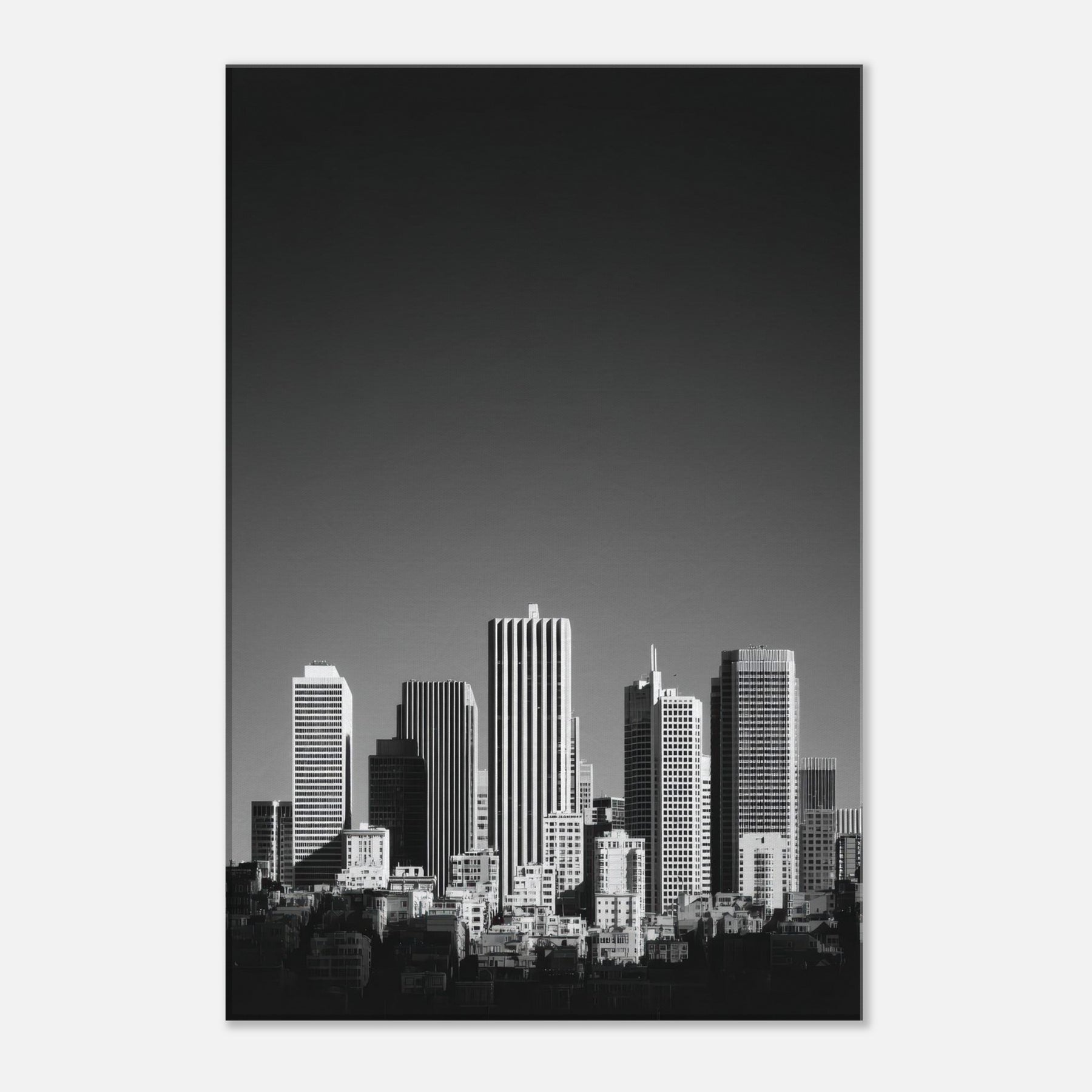 In monochrome, the San Francisco skyline becomes a meditation on light, shadow, and geometry. The tall towers rise with quiet resolve against a softly gradated sky, while the lower blocks form a rhythmic foundation you can almost hear. This black and white print brings a cool, urban breath into any living space neutral enough to pair with warm woods or industrial metals, yet dynamic enough to spark conversation.