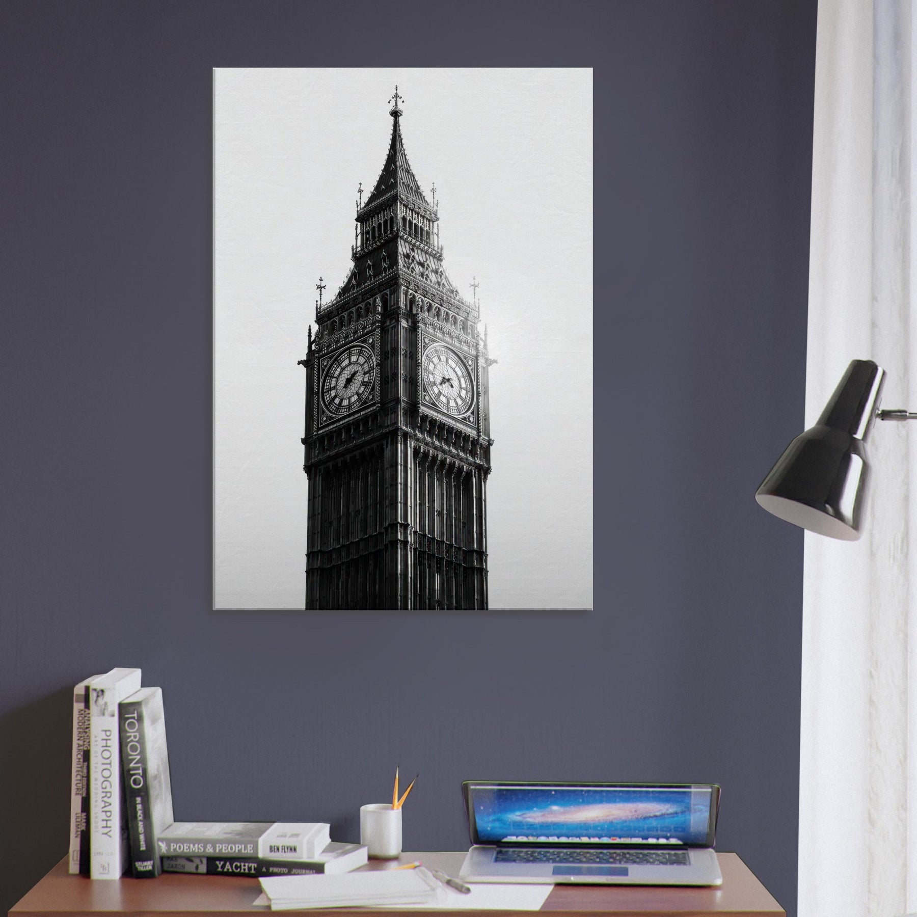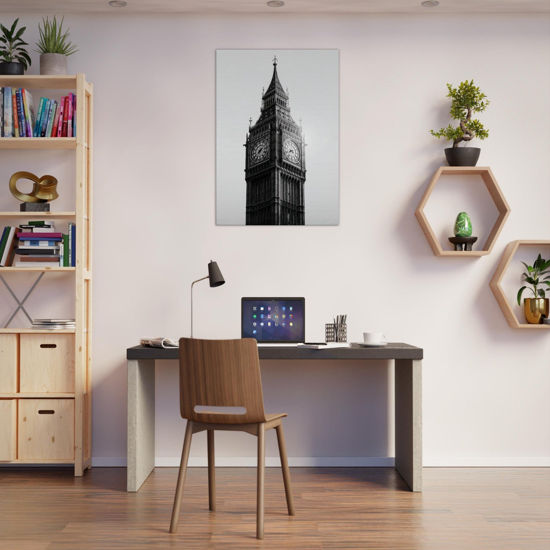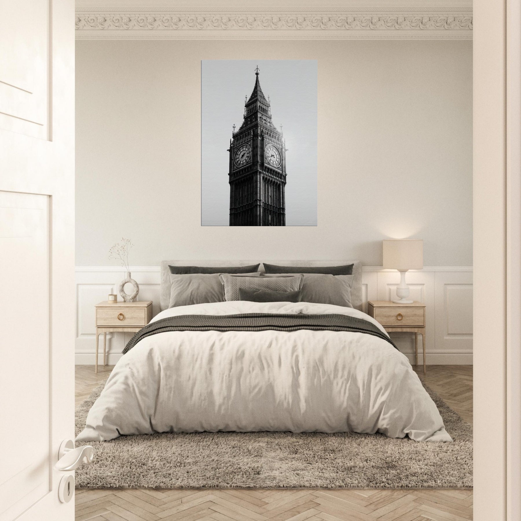 A bold, monochrome of Big Ben that invites quiet reflection. The black and white lines trace the tower’s intricate Gothic details, while the soft gradation of light evokes London’s timeless fog and twilight. This piece breathes a sense of scale and memory into any room, pairing architectural precision with human warmth. Hang it where you want a refined focal point and an everyday reminder of endurance, rhythm, and city steeped atmosphere.