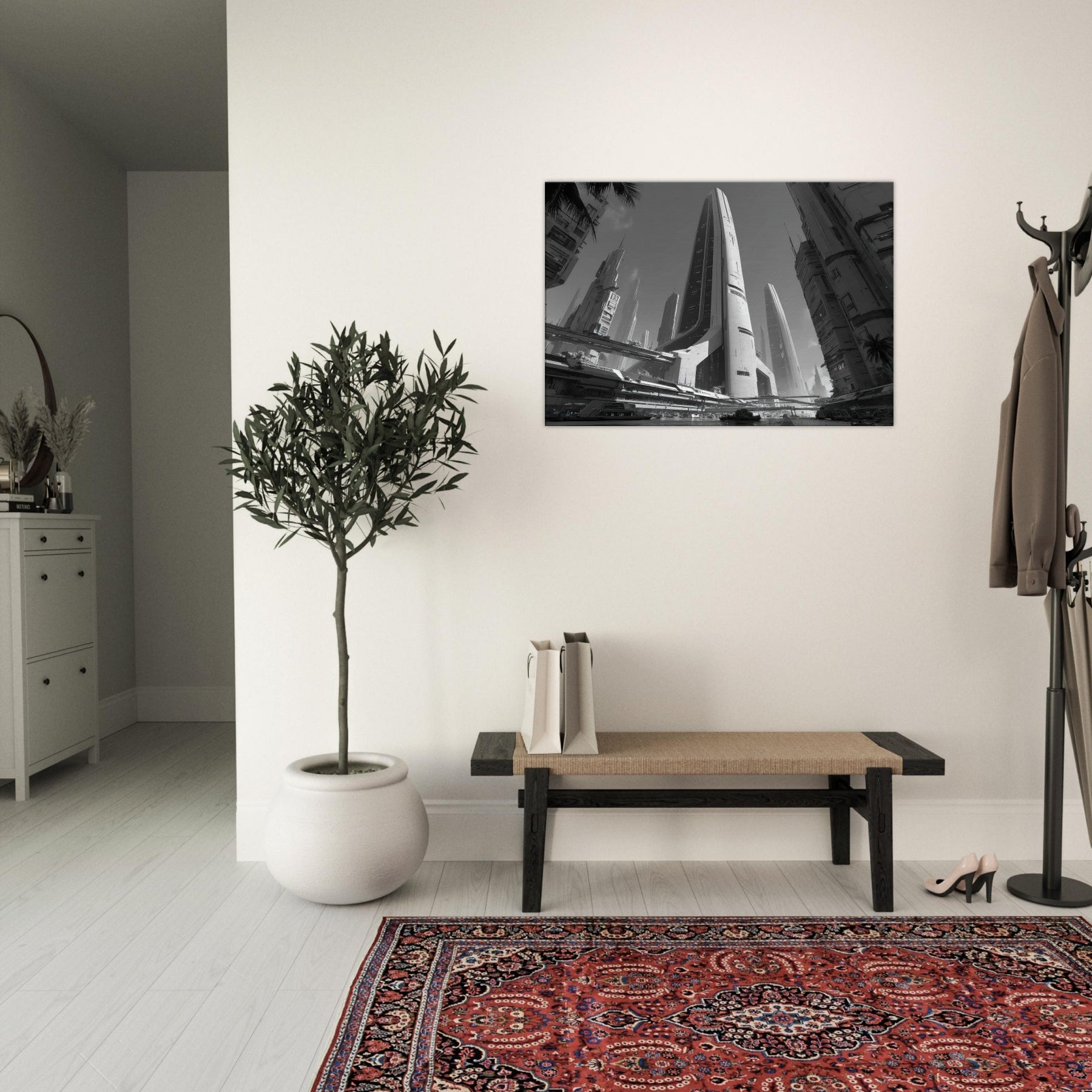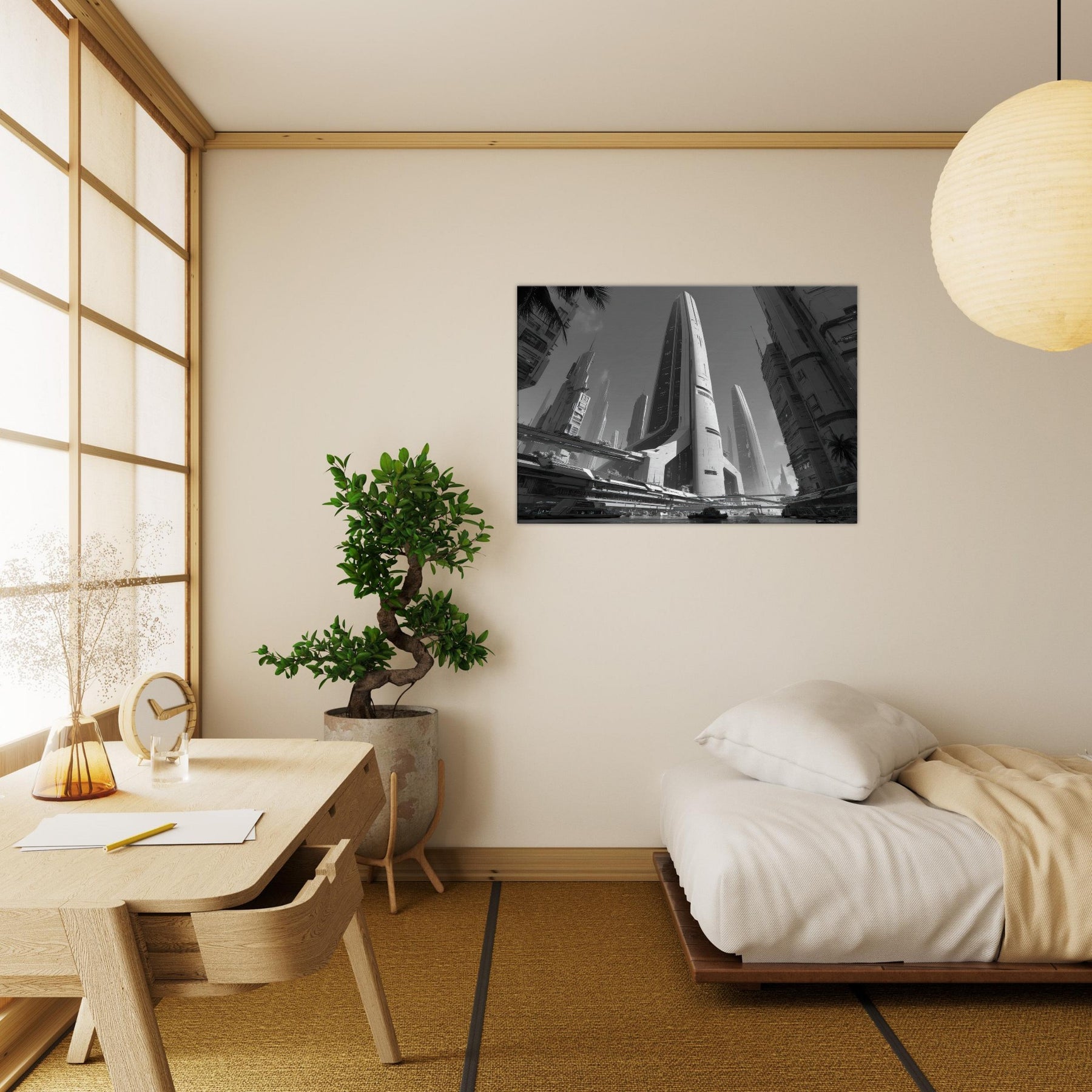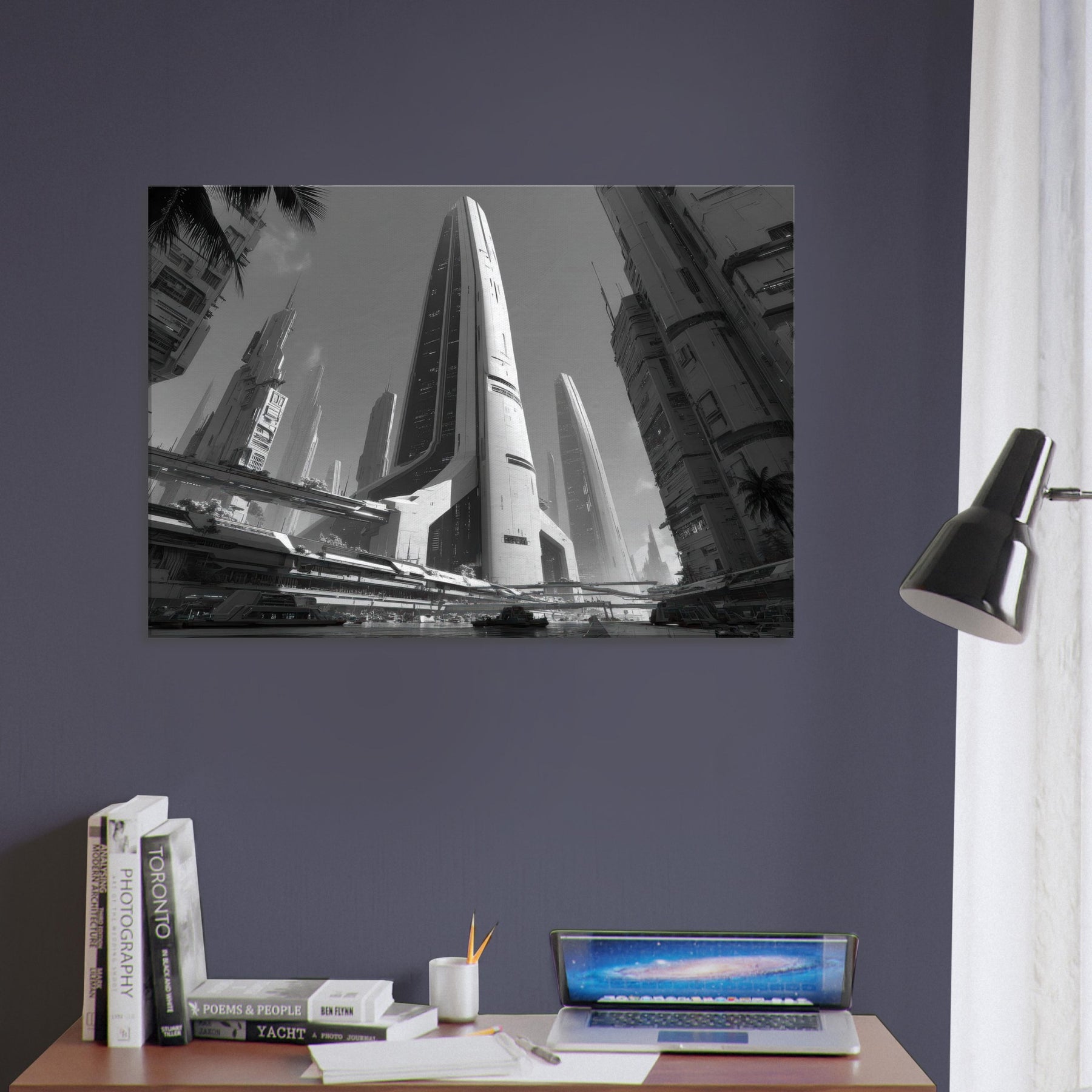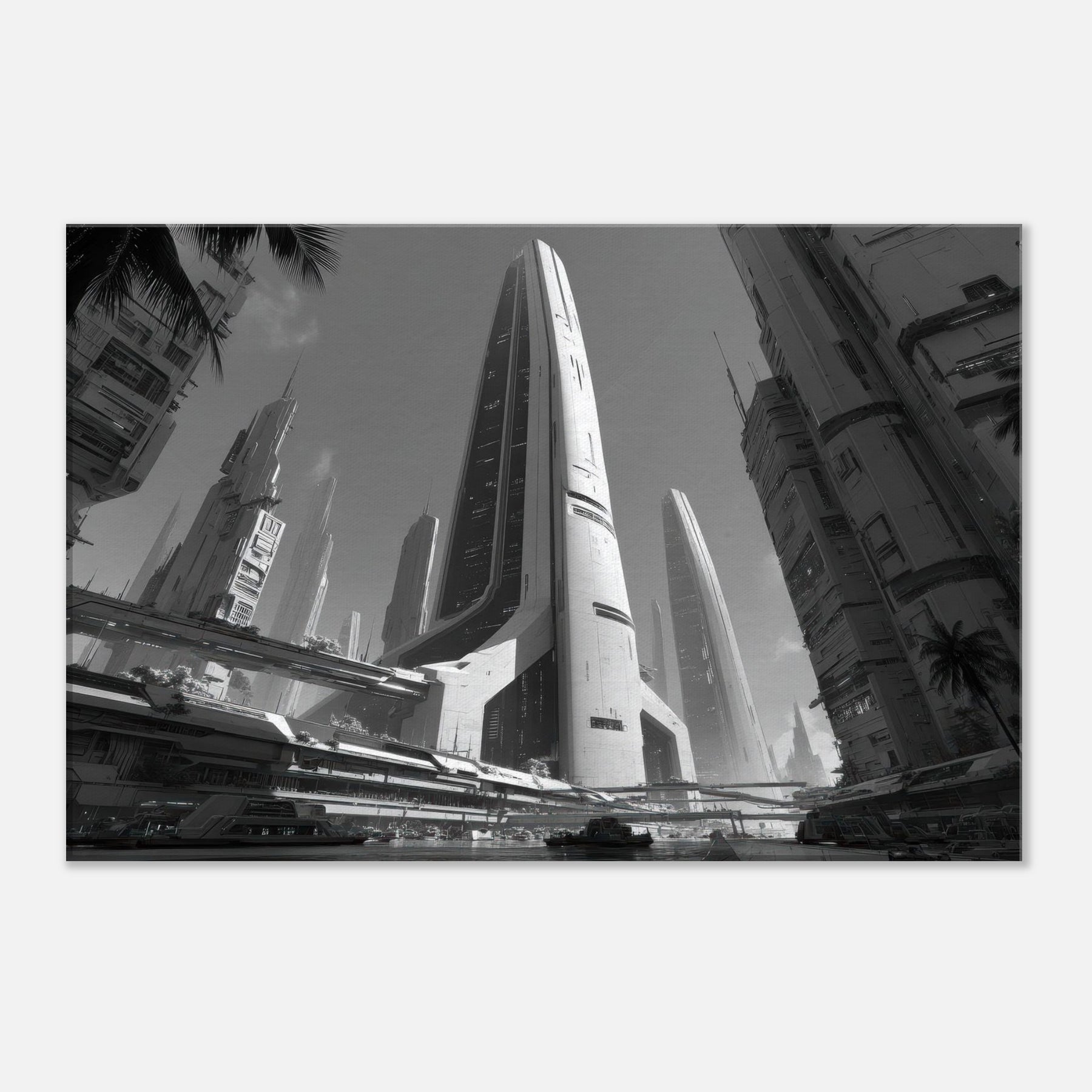 Immerse your room in a nocturnal urban reverie with Futuristic Skyscrapers standing tall in stark black and white. The composition hums with quiet momentum glints of light on glass, shadowed canyons between towers, and elevated walkways that shimmer like lines of fate. This artwork invites stillness and focus, echoing modern minimalism while enriching walls with cinematic scale, texture, and a cool, contemplative energy perfect for living rooms and studios.