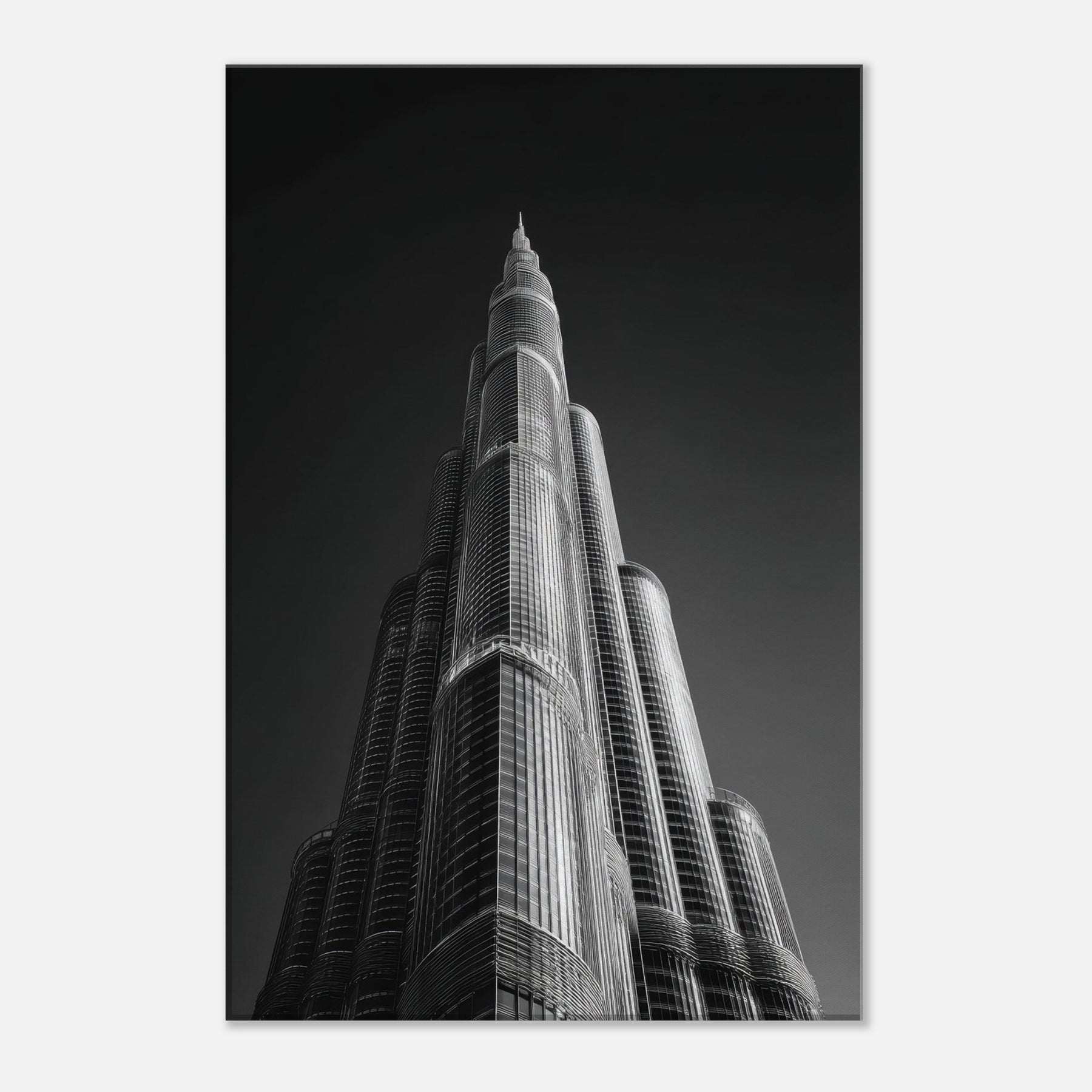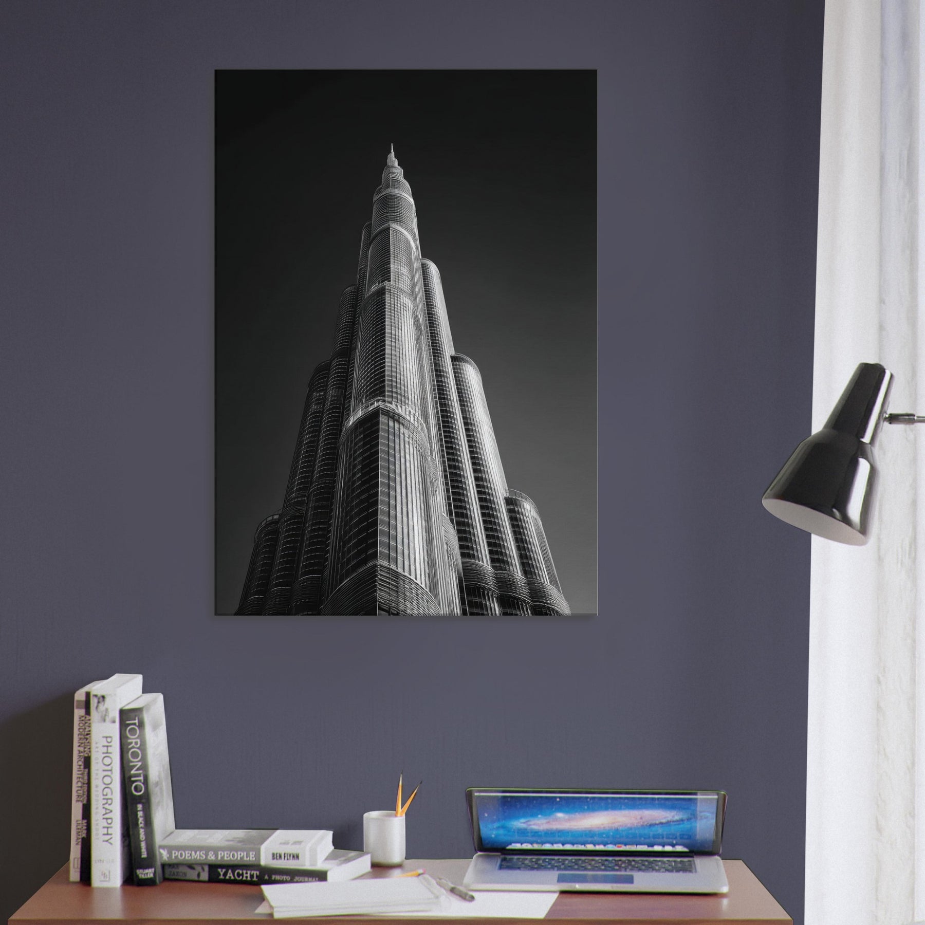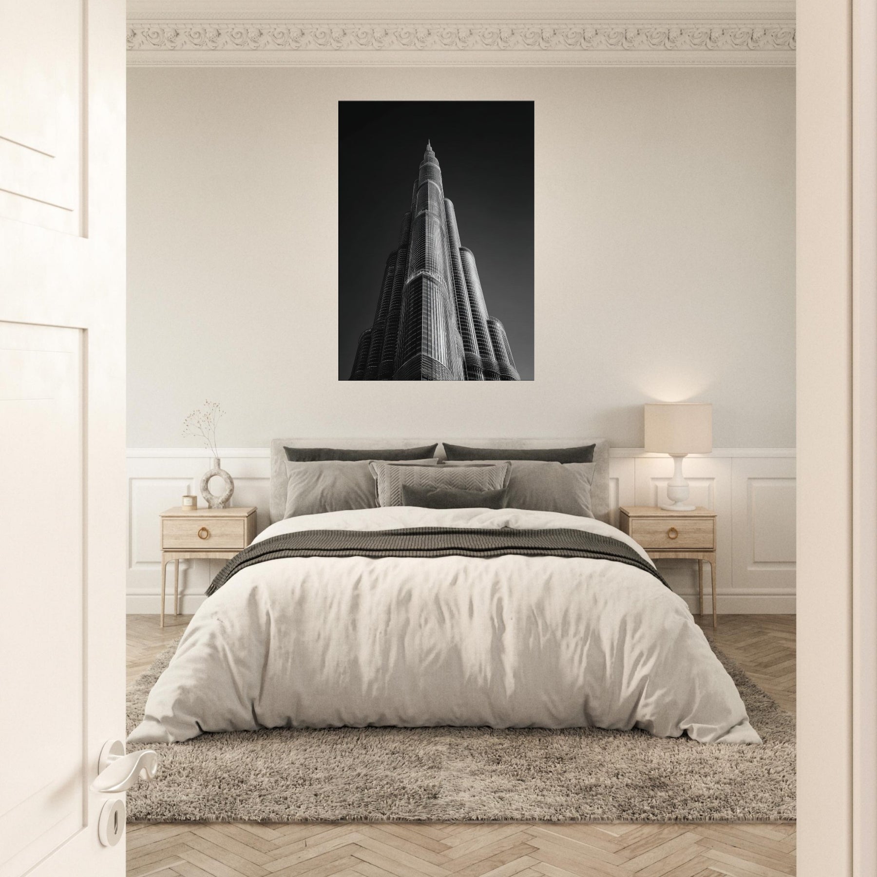 Sink into the calm of a moonlit cityscape with this black and white study of the Burj Khalifa. The tall, sculptural silhouette rises from shadows, its lines catching light in a quiet, meditative rhythm. Every contour feels deliberate, inviting a moment of stillness in a busy room. Hung as a focal point, it enriches modern interiors with graphic clarity, helping a living space breathe where glass and steel meet soft fabric and warm memories.