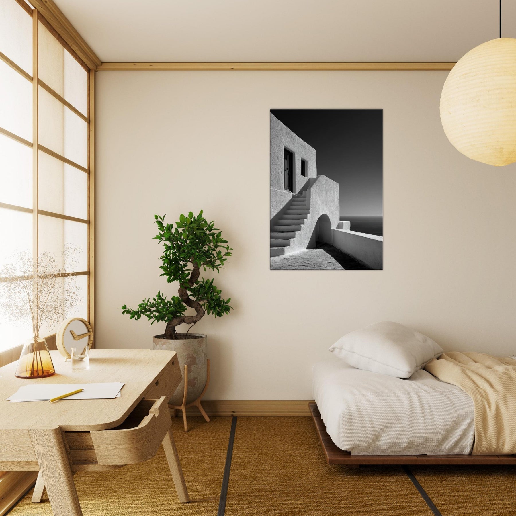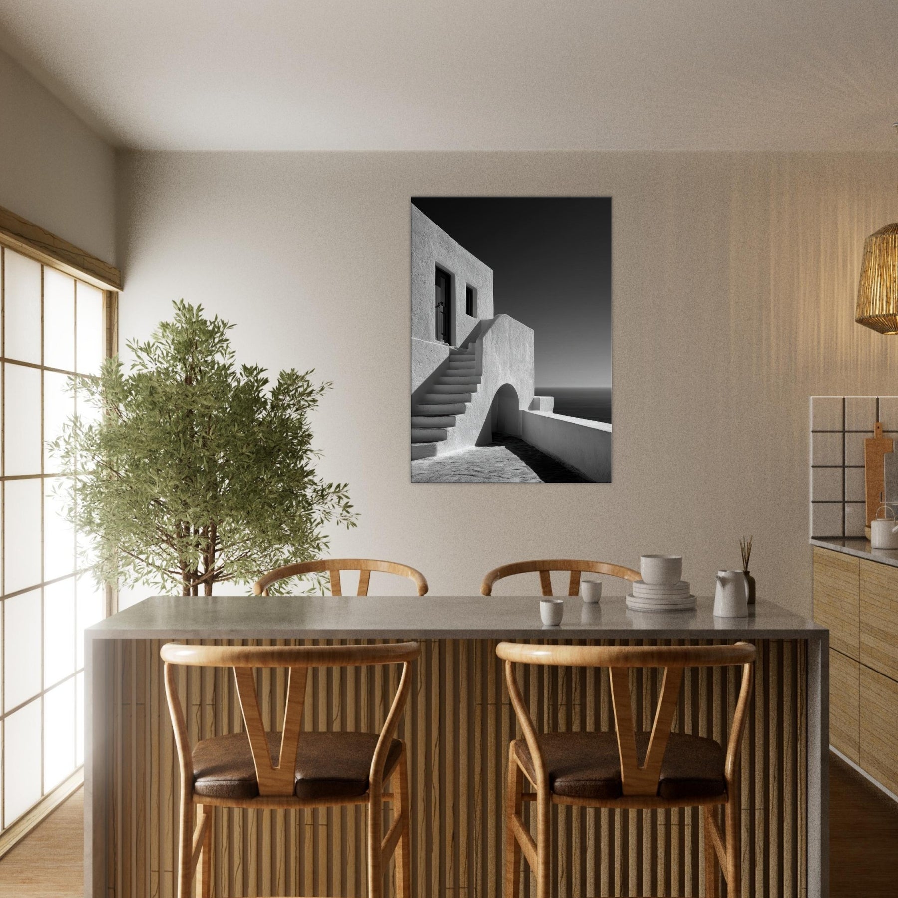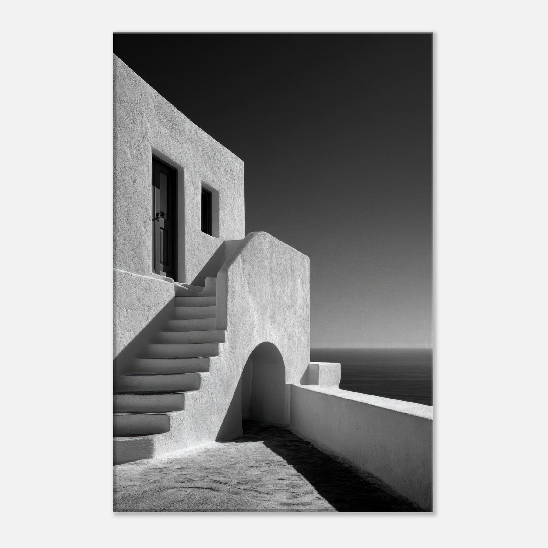 A quiet ode to Santorini, captured in stark black and white light. This architectural study glows with sun bleached walls, pale staircases, and soft shadows that whisper of sea breezes and wind kissed marble. The absence of color sharpens the geometry arches, lines, and doorways creating a serene, cinematic mood that suits a living room, study, or hallway. Framed in modern settings, it invites stillness and contemplation, turning a space into a horizon where ancient charm meets contemporary calm.