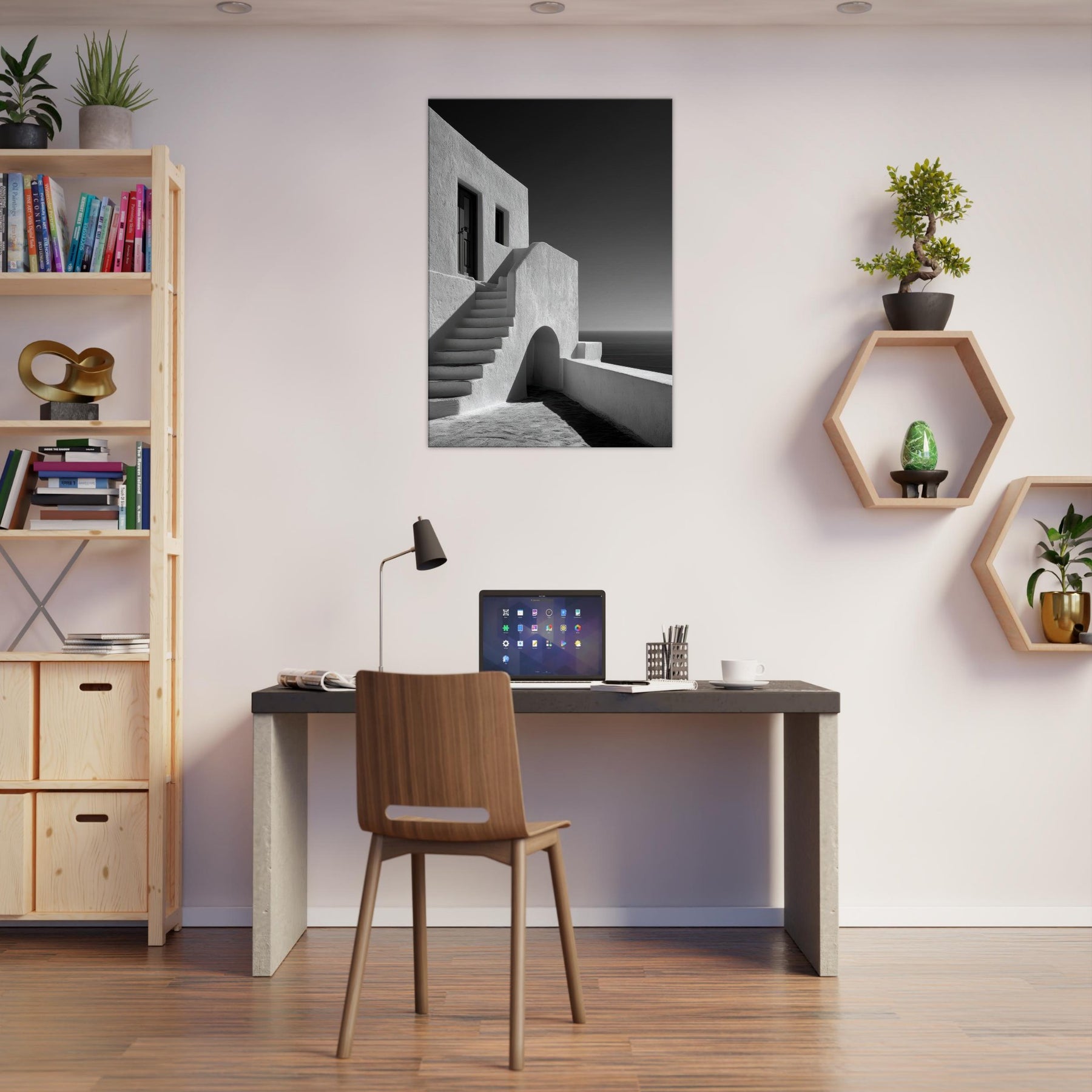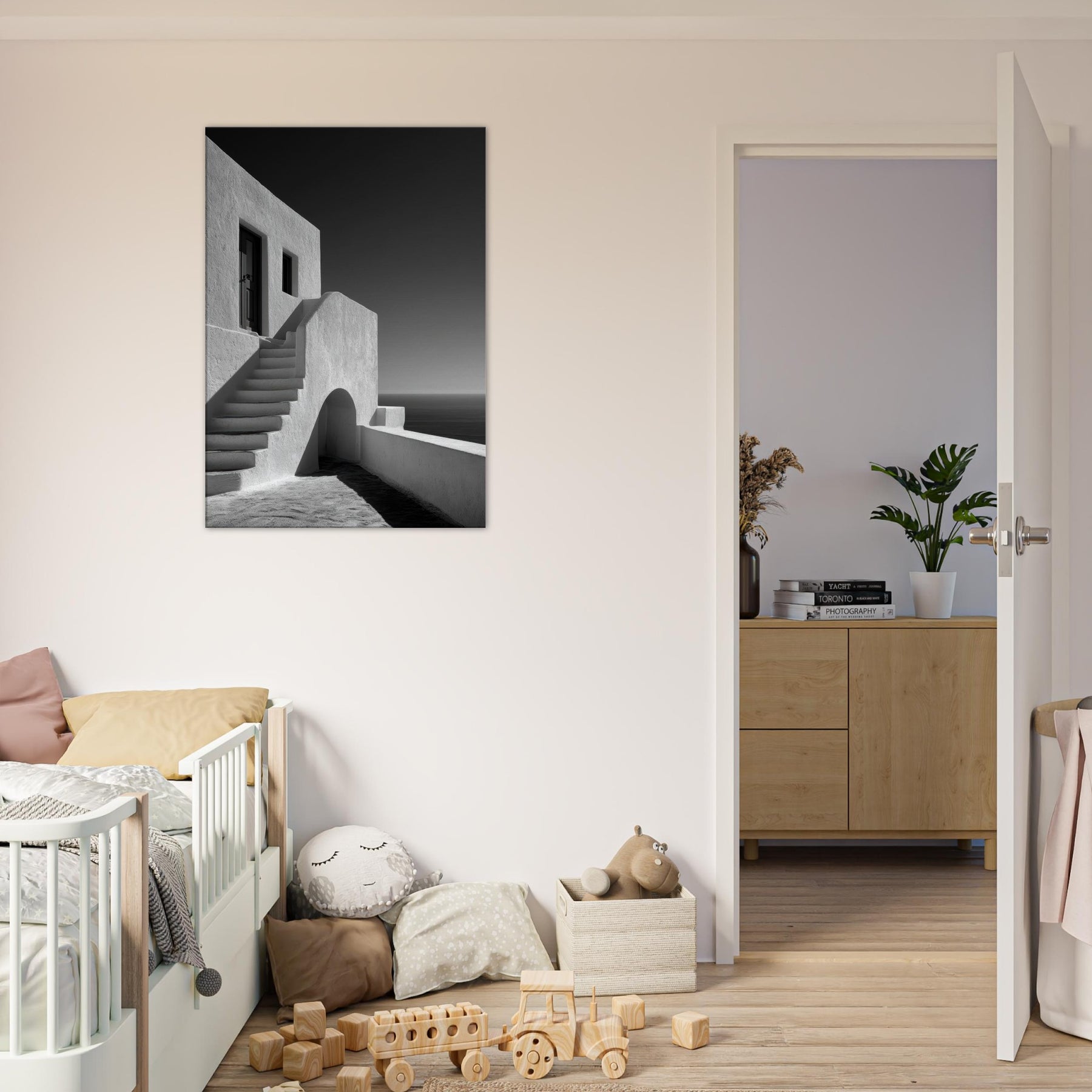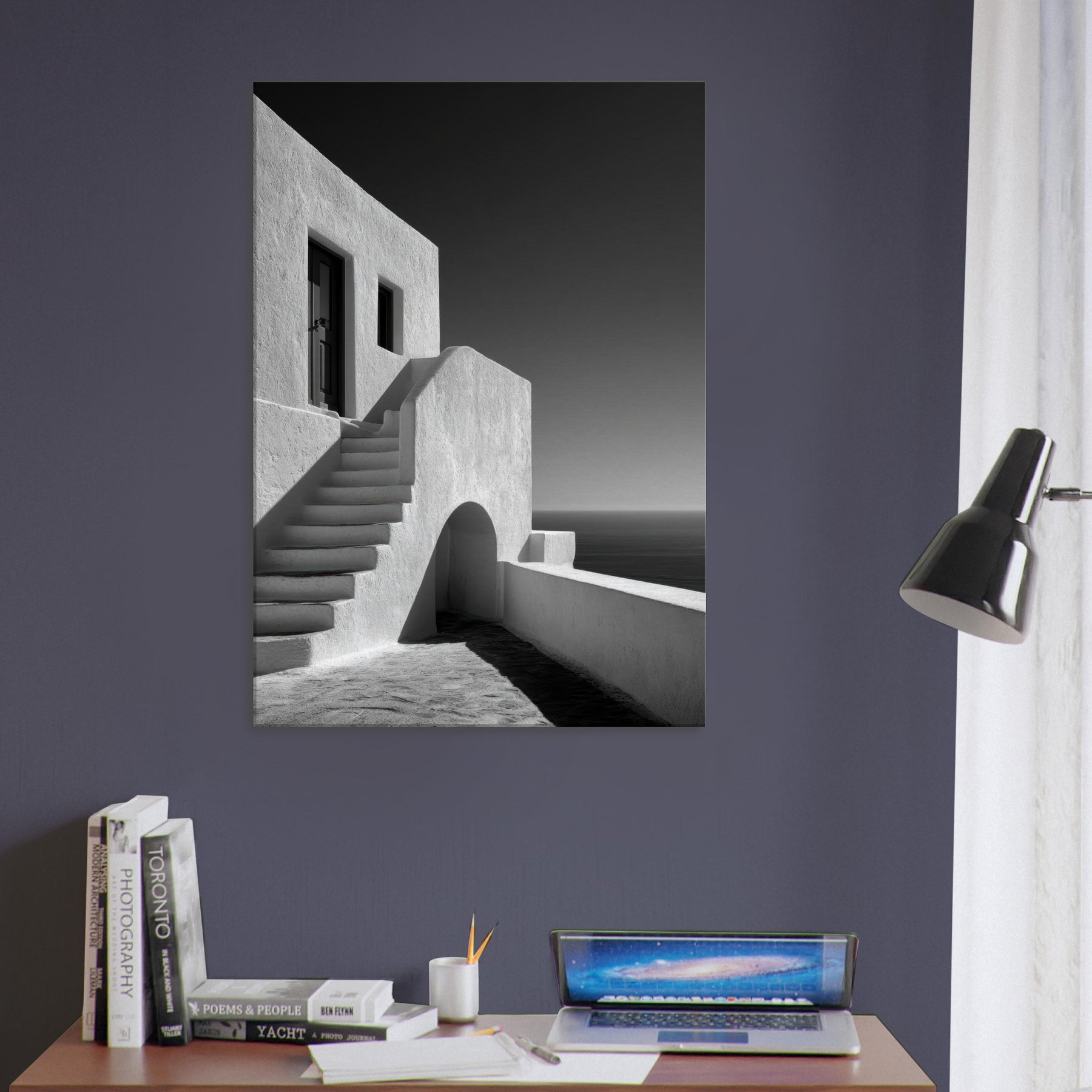 A quiet ode to Santorini, captured in stark black and white light. This architectural study glows with sun bleached walls, pale staircases, and soft shadows that whisper of sea breezes and wind kissed marble. The absence of color sharpens the geometry arches, lines, and doorways creating a serene, cinematic mood that suits a living room, study, or hallway. Framed in modern settings, it invites stillness and contemplation, turning a space into a horizon where ancient charm meets contemporary calm.