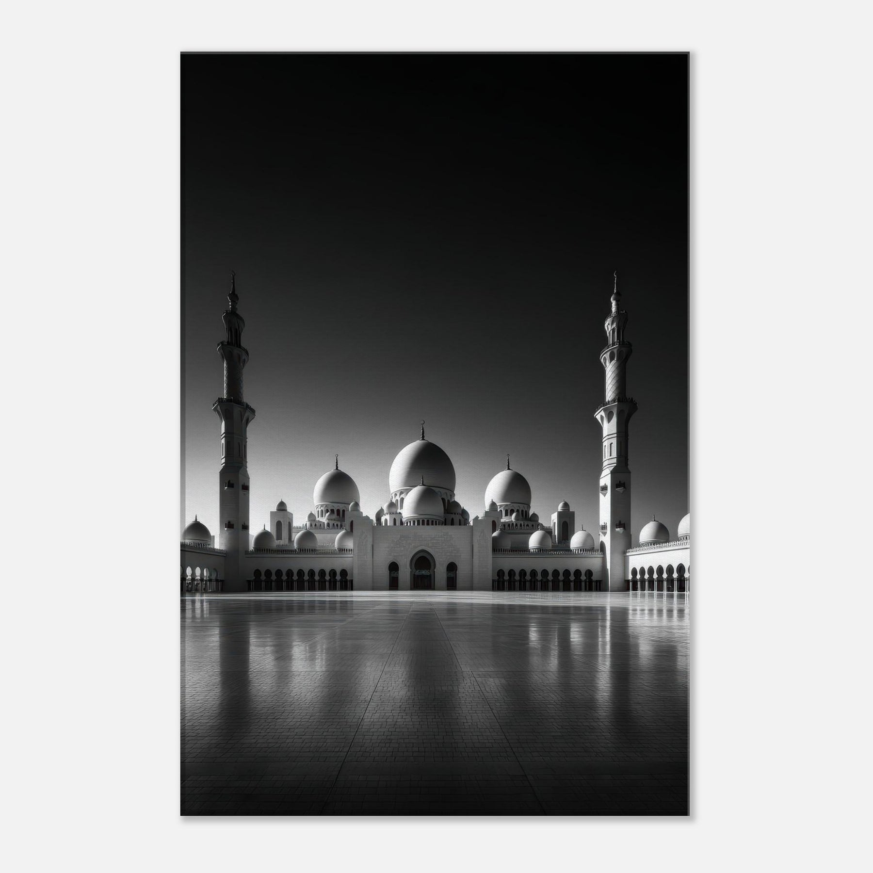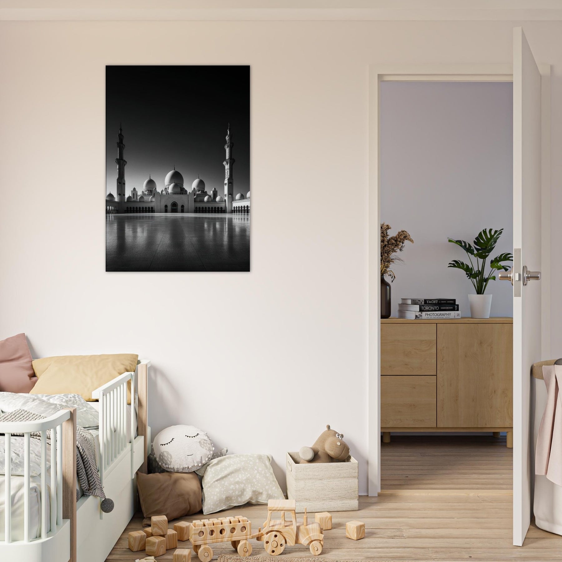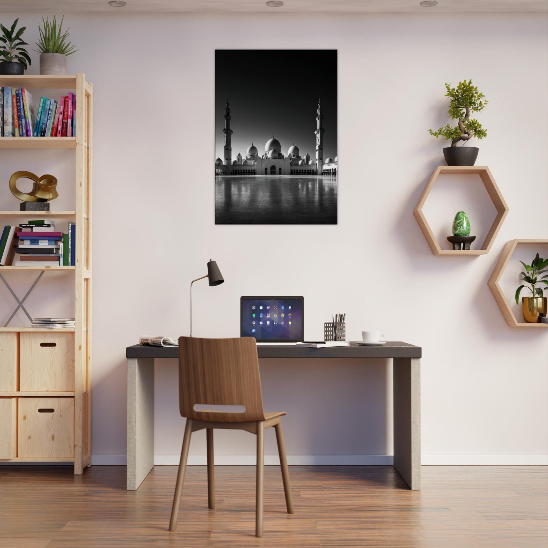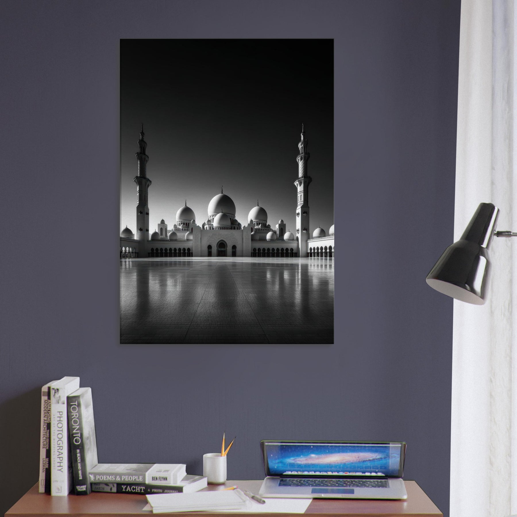 Against a radiant horizon, this monochrome Mosque captures the hush of dawn and the quiet grandeur of sacred space. The crisp lines and sweeping domes invite reflection, while the polished courtyard seems to breathe with you, echoing footsteps and distant passages. In your living room, it becomes a contemplative focal point a reminder of balance, architecture, and human scale. Let the stark contrast and soft gradients elevate conversation, lending a serene aura to everyday moments.