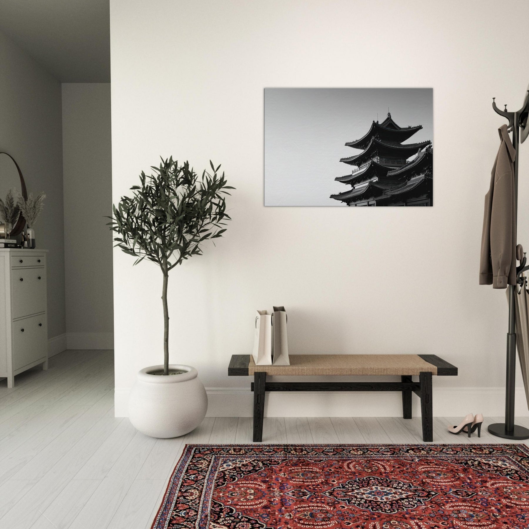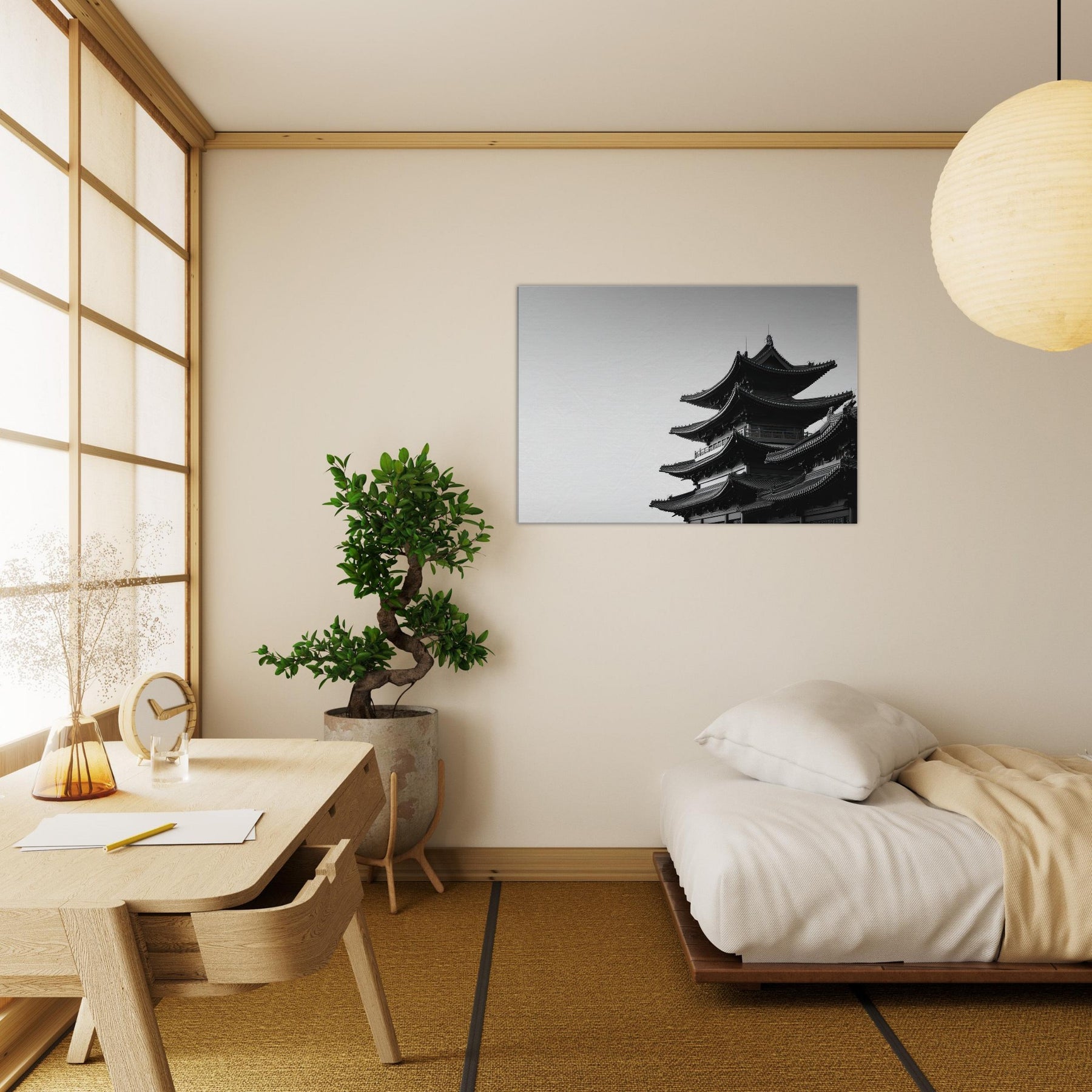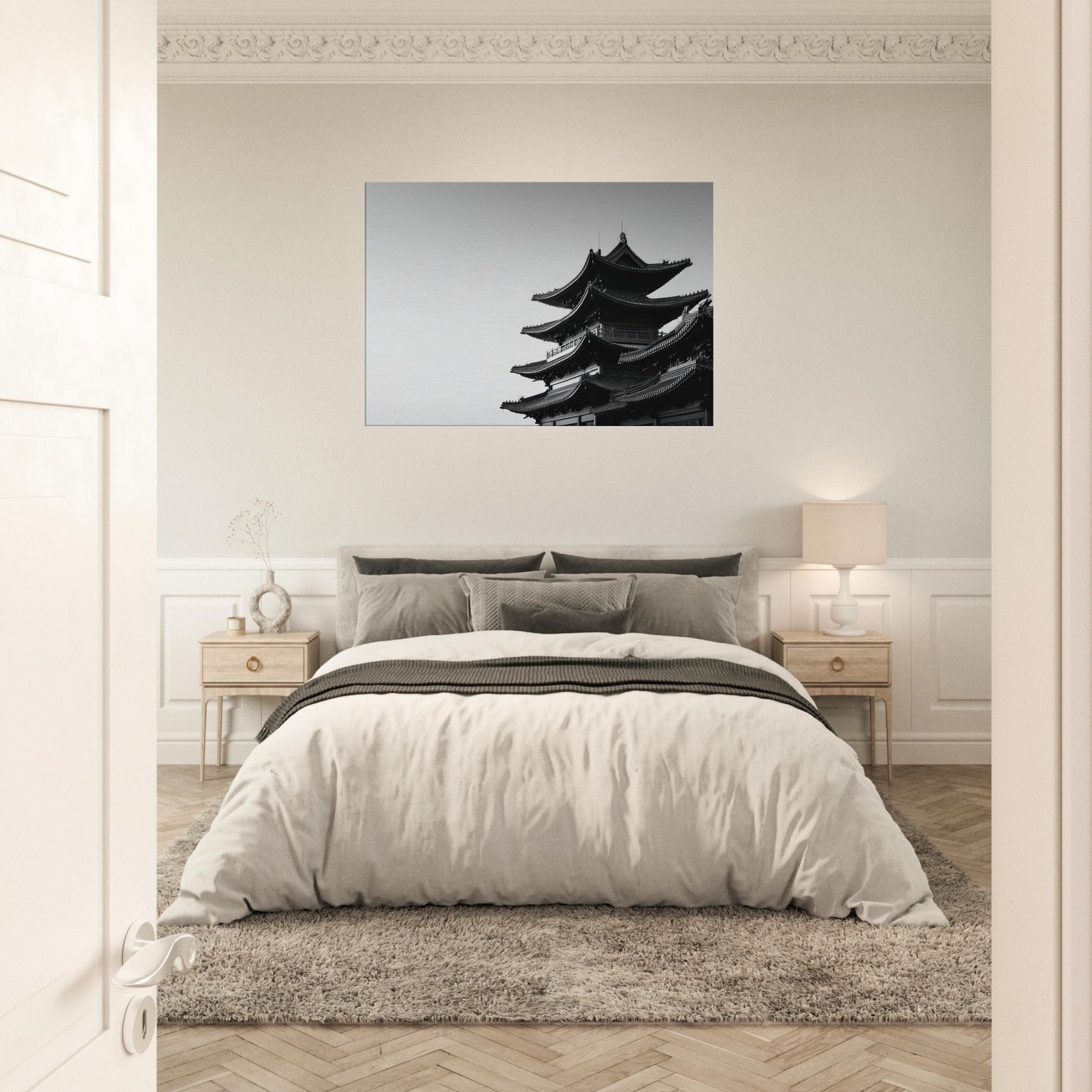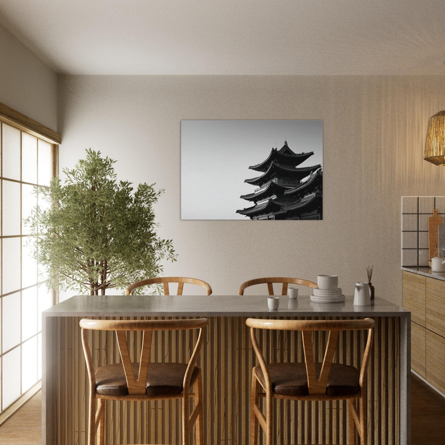 Immerse your space in the quiet drama of the Pagoda Roofline, rendered in stark black and white. This architectural silhouette invites contemplation, its curved eaves tracing a rhythm of calm against a pale, open page. The piece breathes balance into living rooms and hallways, pairing the warmth of wood tones with the cool precision of ink, casting gentle shadows that change with the light. A timeless accent for city lovers seeking serenity amid urban energy.