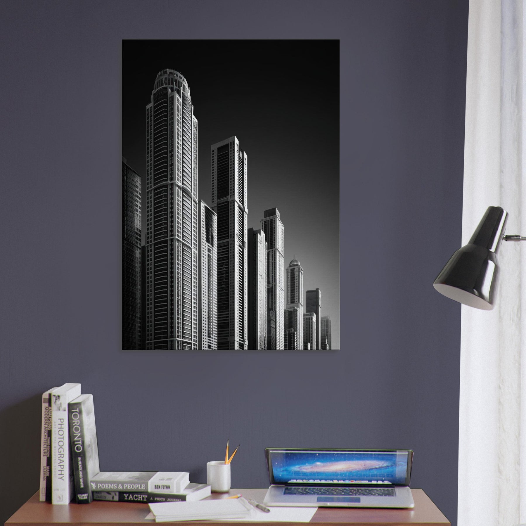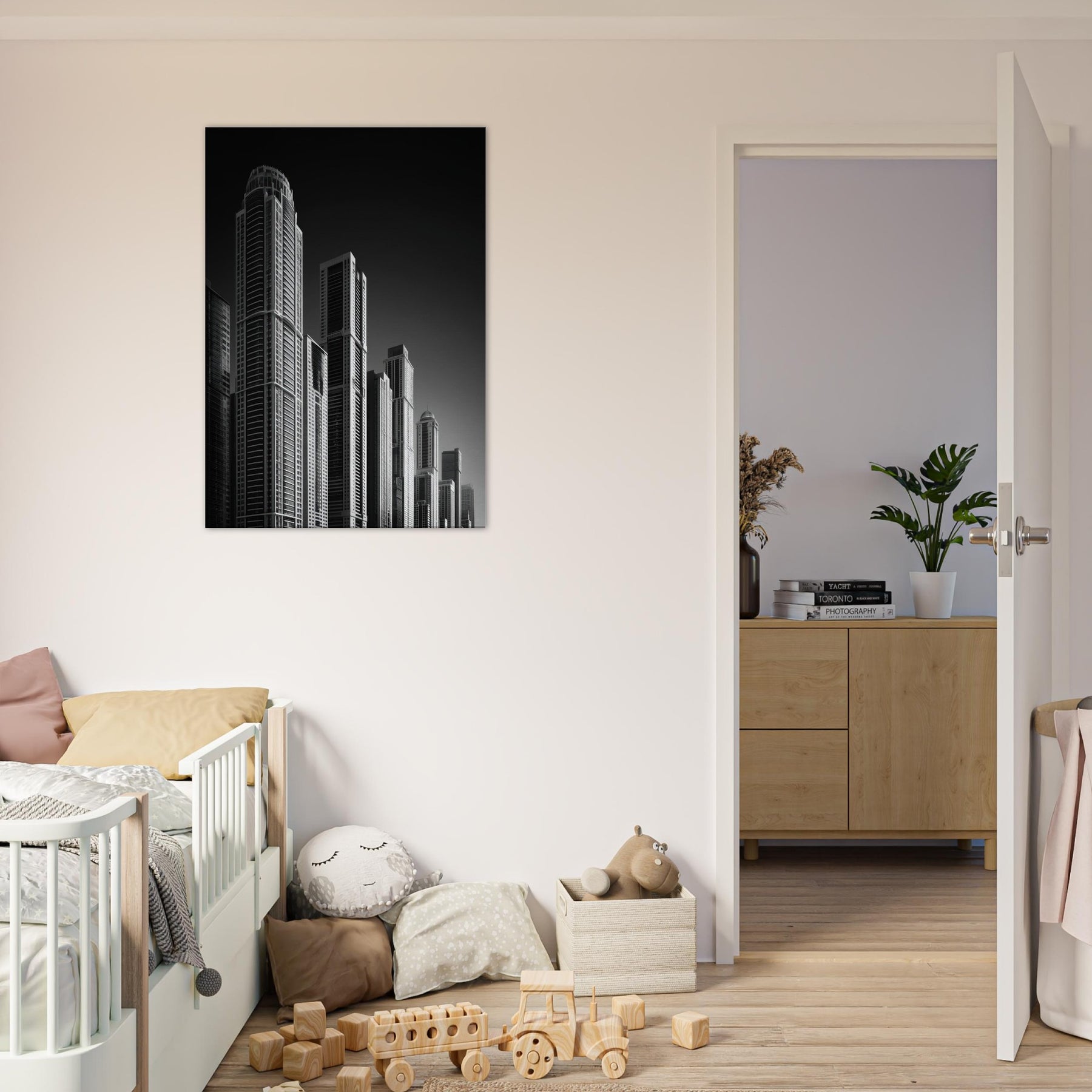 Immerse yourself in a nocturnal dream of a Cyberpunk City rendered in stark black and white. This wall art folds light into shadow, where glass towers reflect memory and momentum, and the air tastes of rain and chrome. The composition invites introspection and movement, making your living room feel expansive and cinematic. Perfect above a sofa or desk, it anchors a modern space with a pulse of urban poetry and quiet, luminous detail.