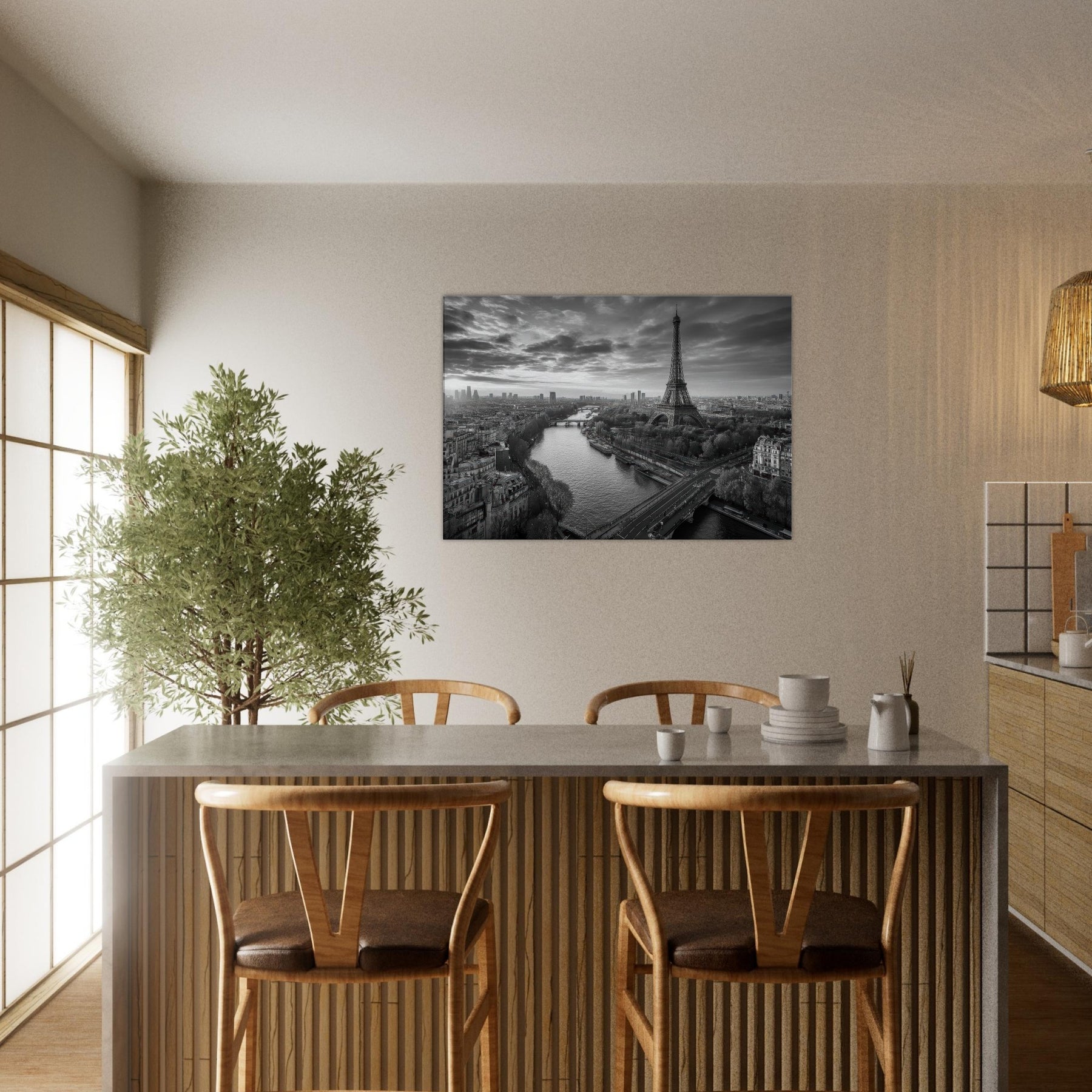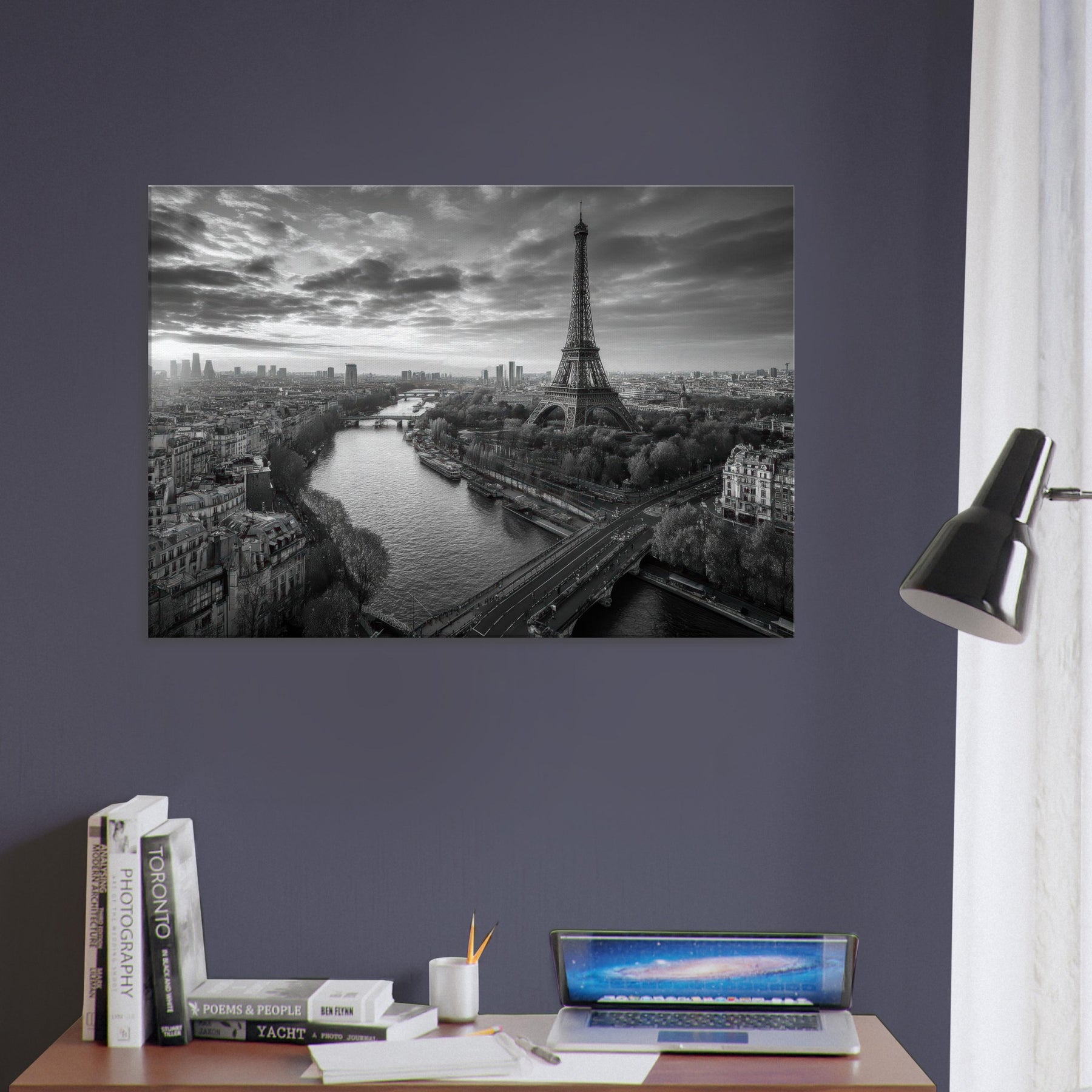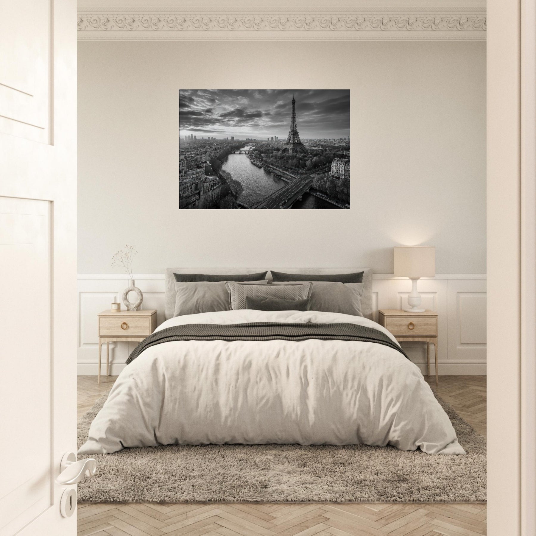 This black and white cityscape invites Paris into your living space with quiet, cinematic grace. The Seine glides beneath arching bridges as the Eiffel Tower rises in sculpted lace against a brooding sky, every line a whisper of architecture and history. In your room, the high contrast tones layer texture and mood, turning walls into a gallery of nocturnal charm. It complements modern furniture, soft lighting, and Parisian dreams an atmosphere that makes every day feel a little more illuminated.