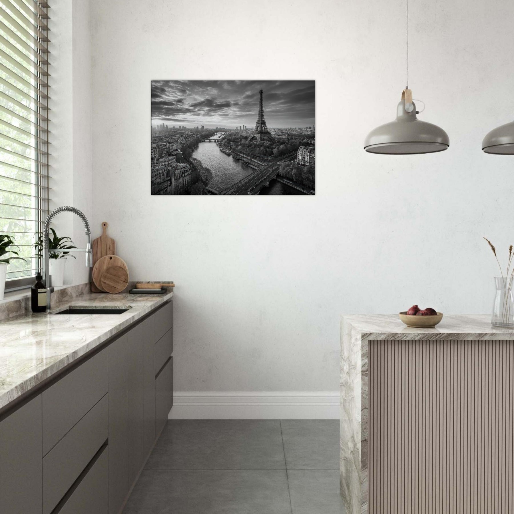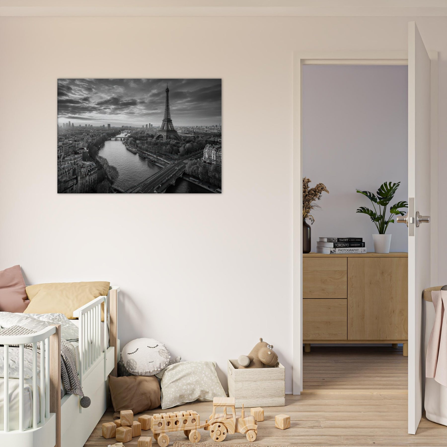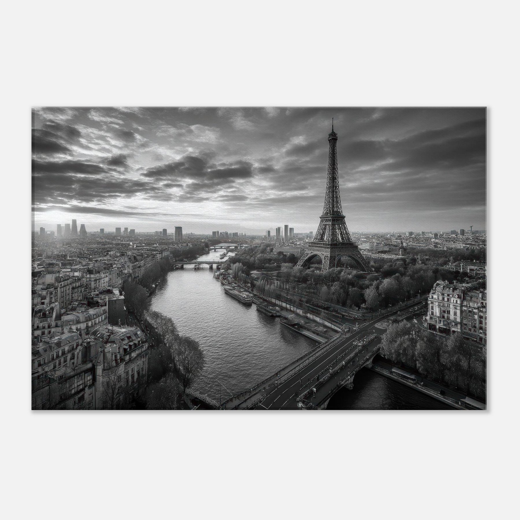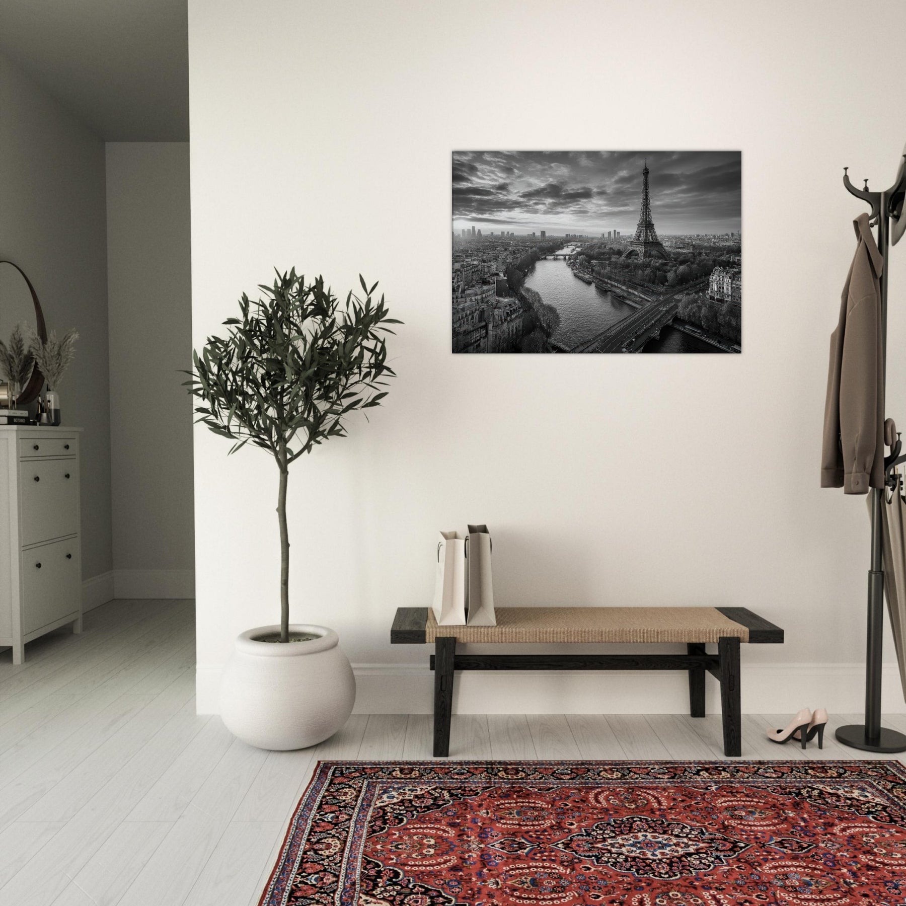 This black and white cityscape invites Paris into your living space with quiet, cinematic grace. The Seine glides beneath arching bridges as the Eiffel Tower rises in sculpted lace against a brooding sky, every line a whisper of architecture and history. In your room, the high contrast tones layer texture and mood, turning walls into a gallery of nocturnal charm. It complements modern furniture, soft lighting, and Parisian dreams an atmosphere that makes every day feel a little more illuminated.