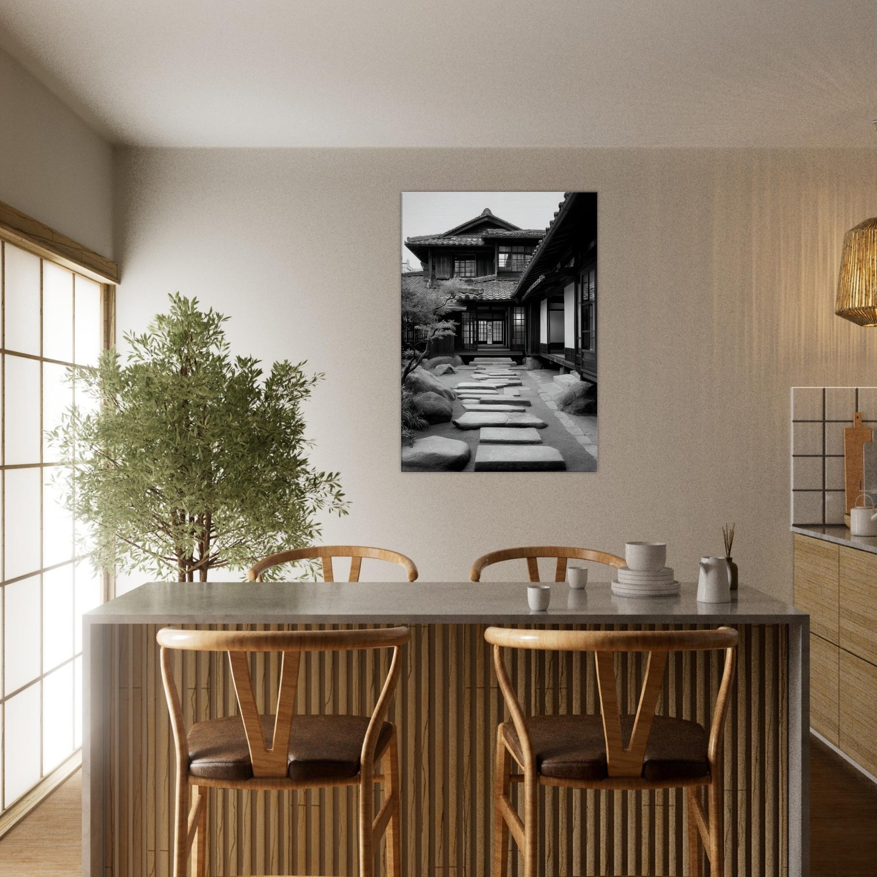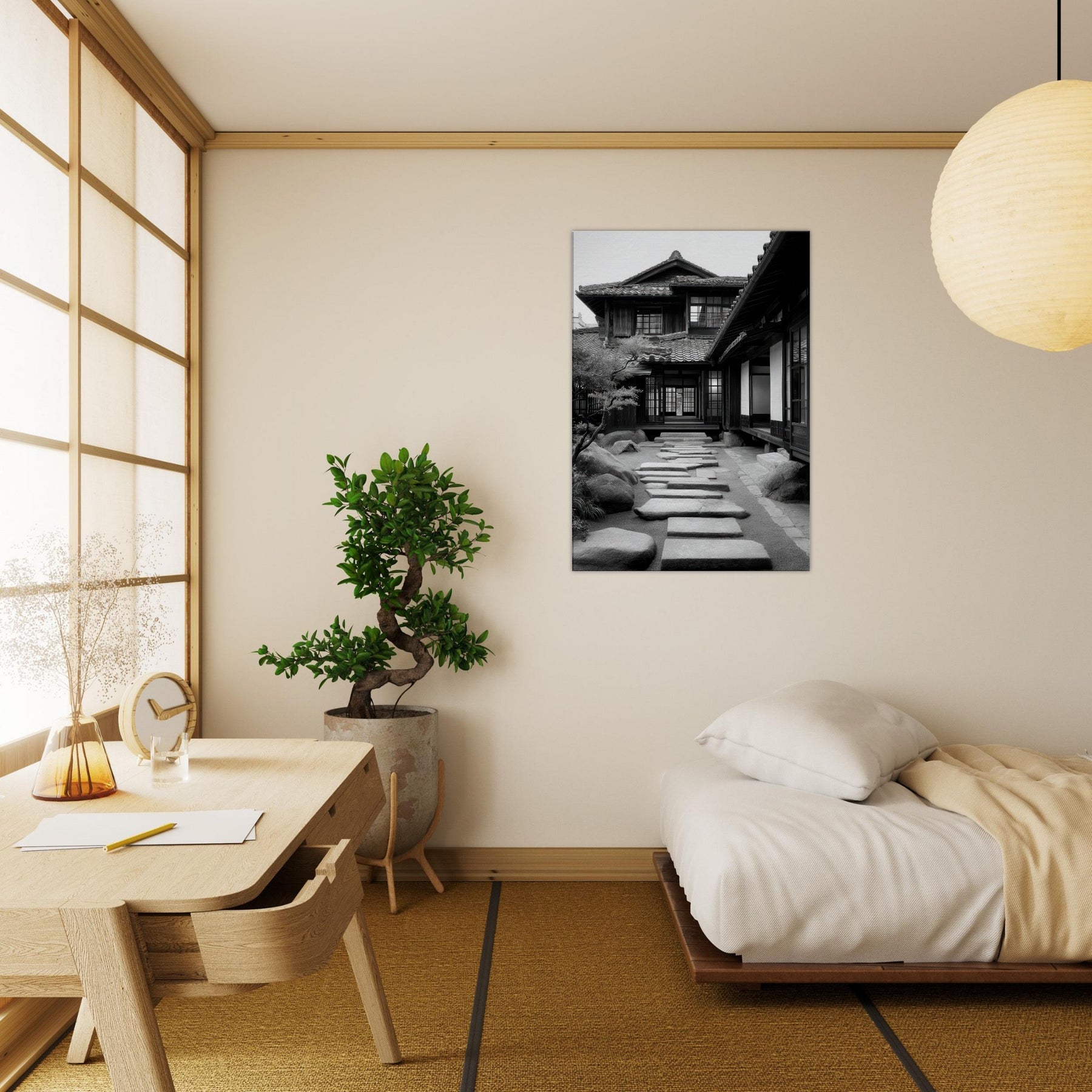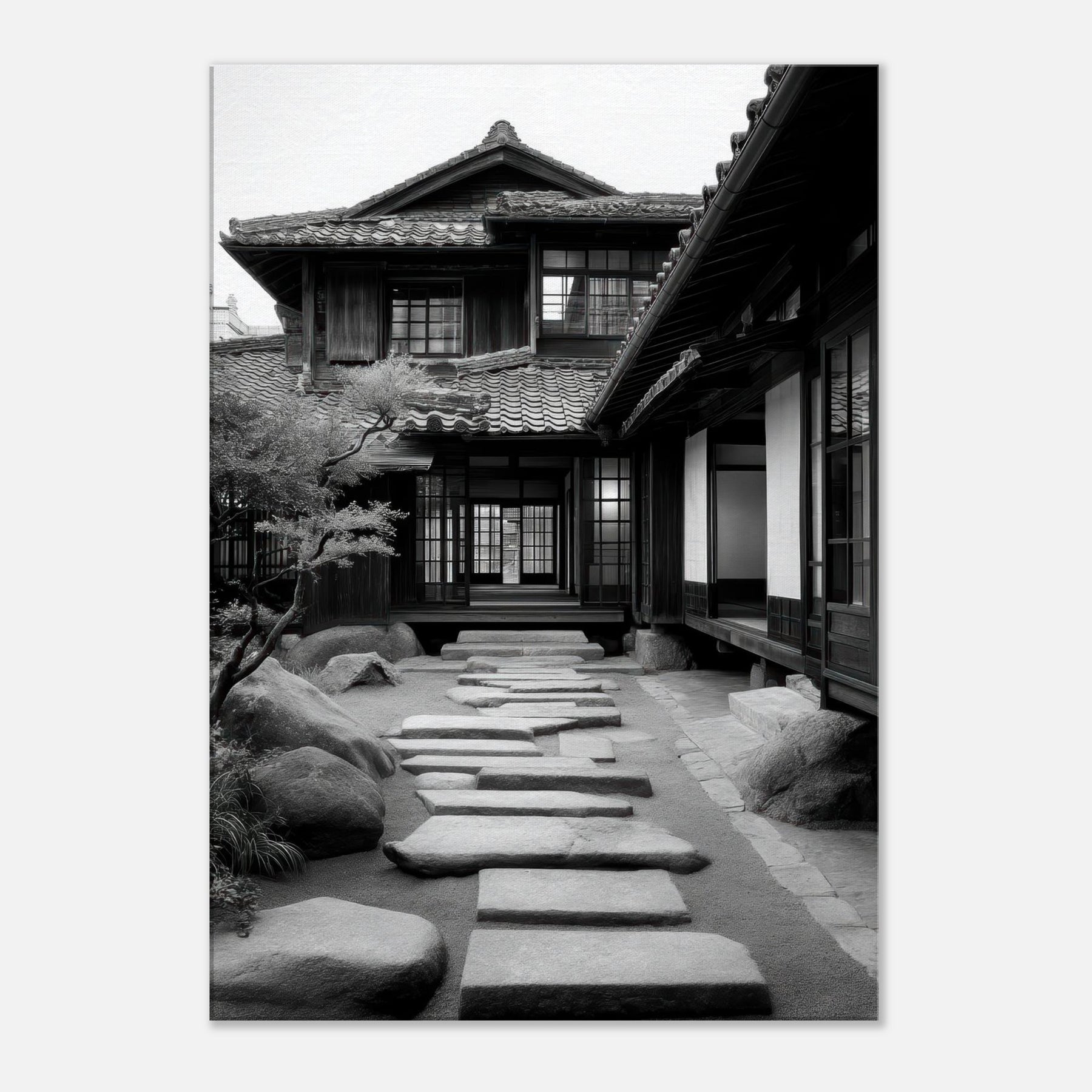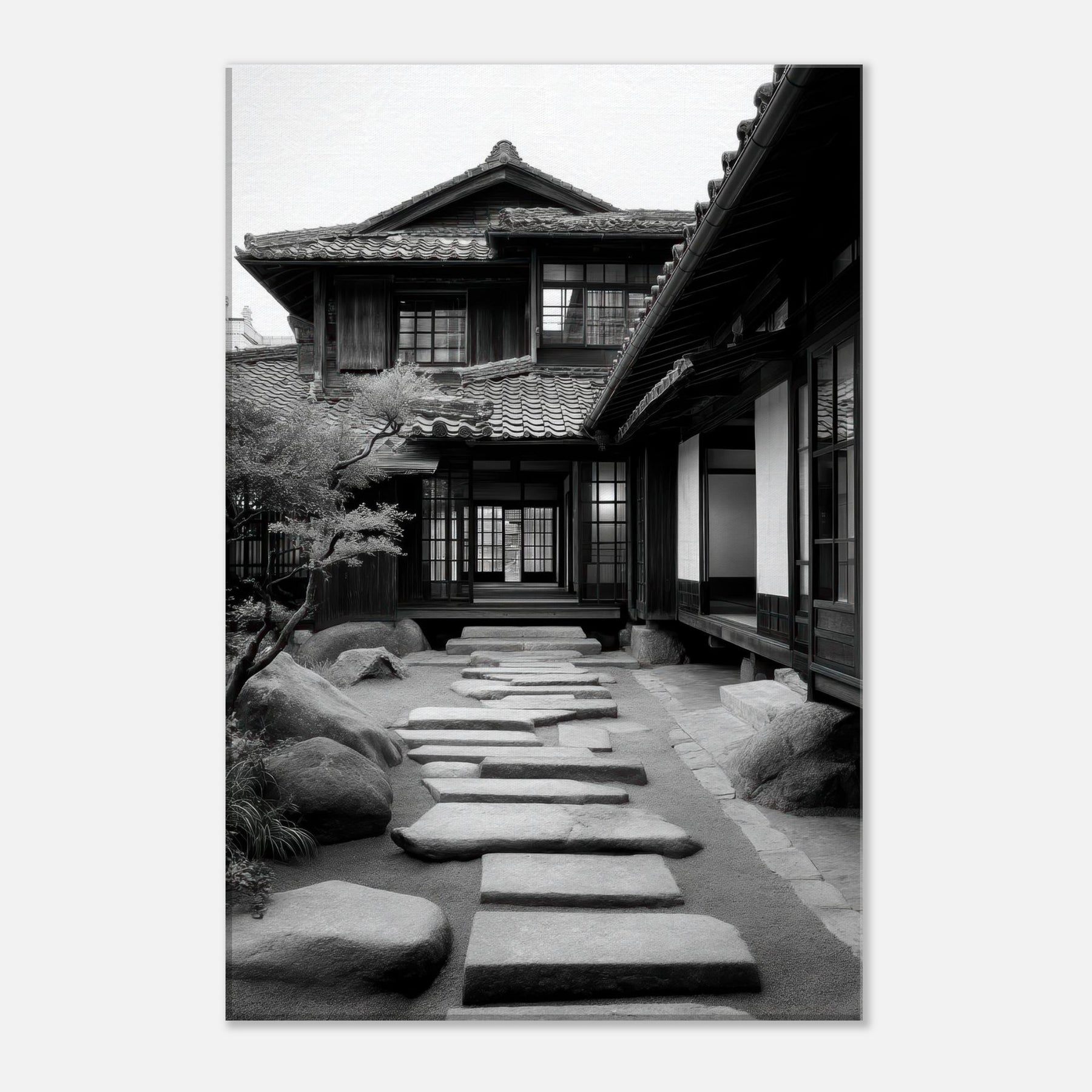 Step into a tranquil passage where light and shadow sketch a living poem across Japanese Houses. This black and white scene dissolves time into architectural whispers: wooden lattices, sliding shoji, stepping stones leading toward a calm interior courtyard. The air feels cool and still, the memory of rain on tile; the stone path invites slow footsteps and quiet reflection. Hang this in a living room or study to evoke refined restraint, thoughtful spacing, and a subtle, everlasting urban serenity.