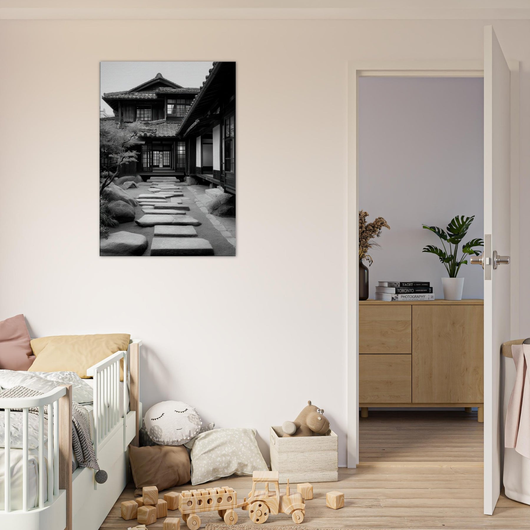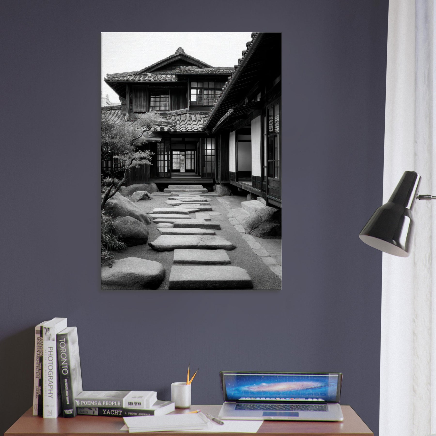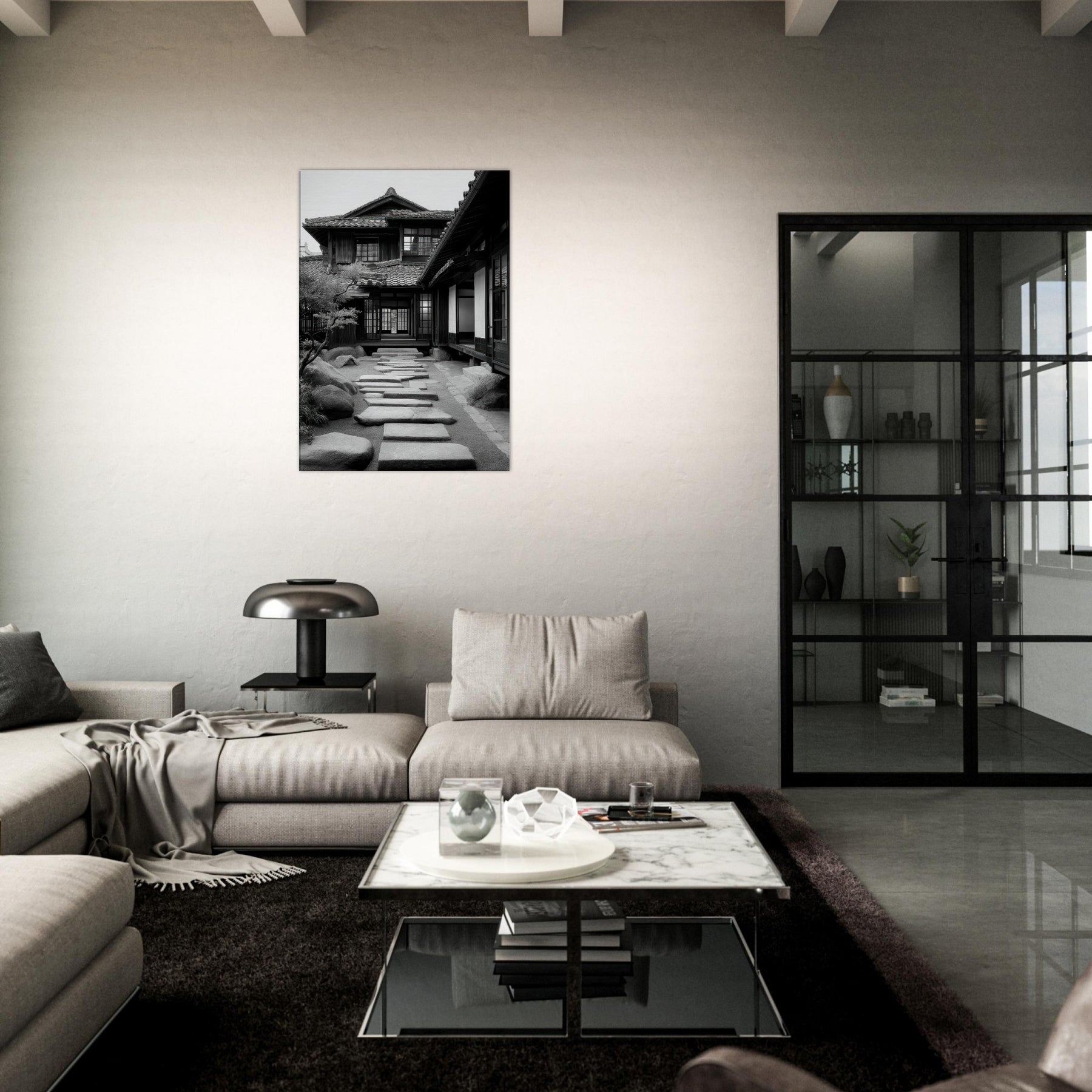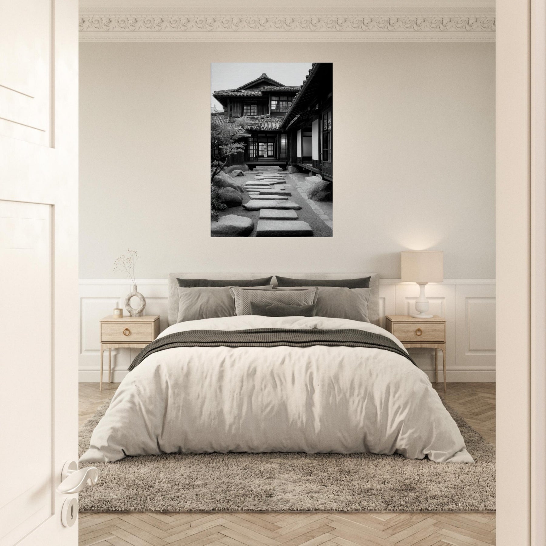 Step into a tranquil passage where light and shadow sketch a living poem across Japanese Houses. This black and white scene dissolves time into architectural whispers: wooden lattices, sliding shoji, stepping stones leading toward a calm interior courtyard. The air feels cool and still, the memory of rain on tile; the stone path invites slow footsteps and quiet reflection. Hang this in a living room or study to evoke refined restraint, thoughtful spacing, and a subtle, everlasting urban serenity.