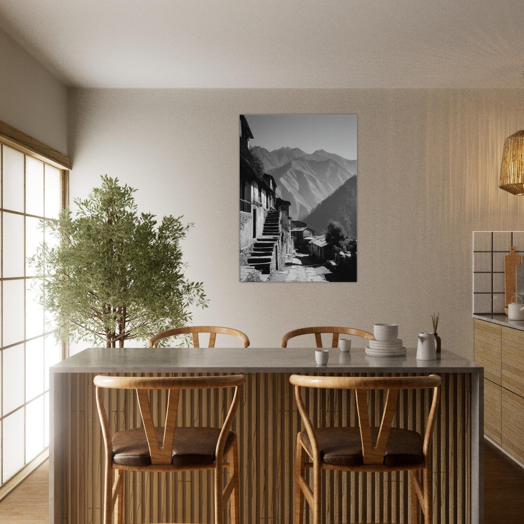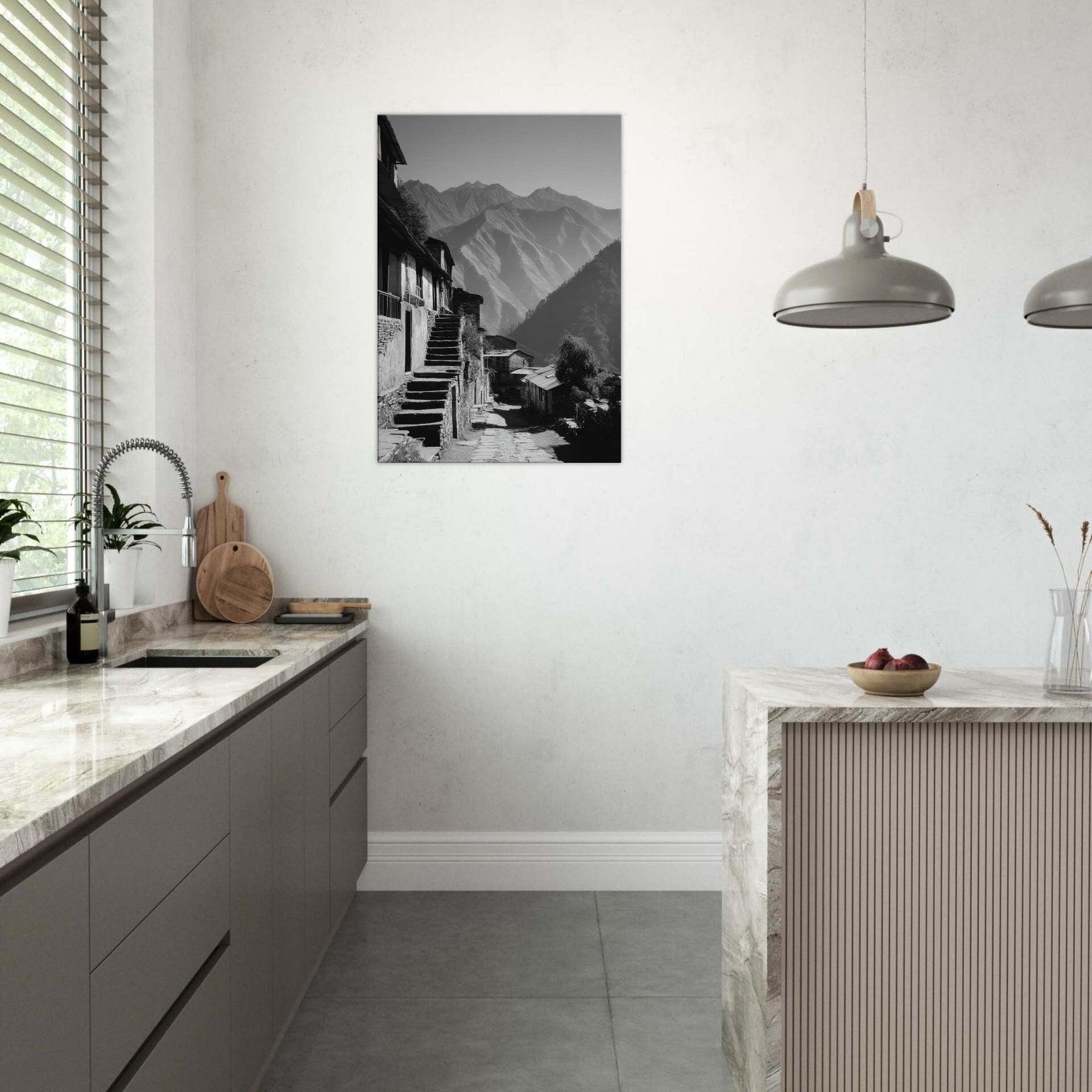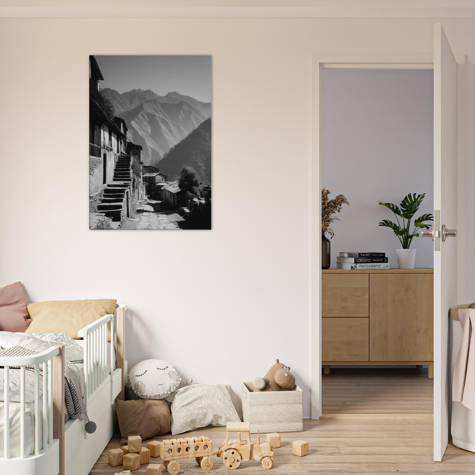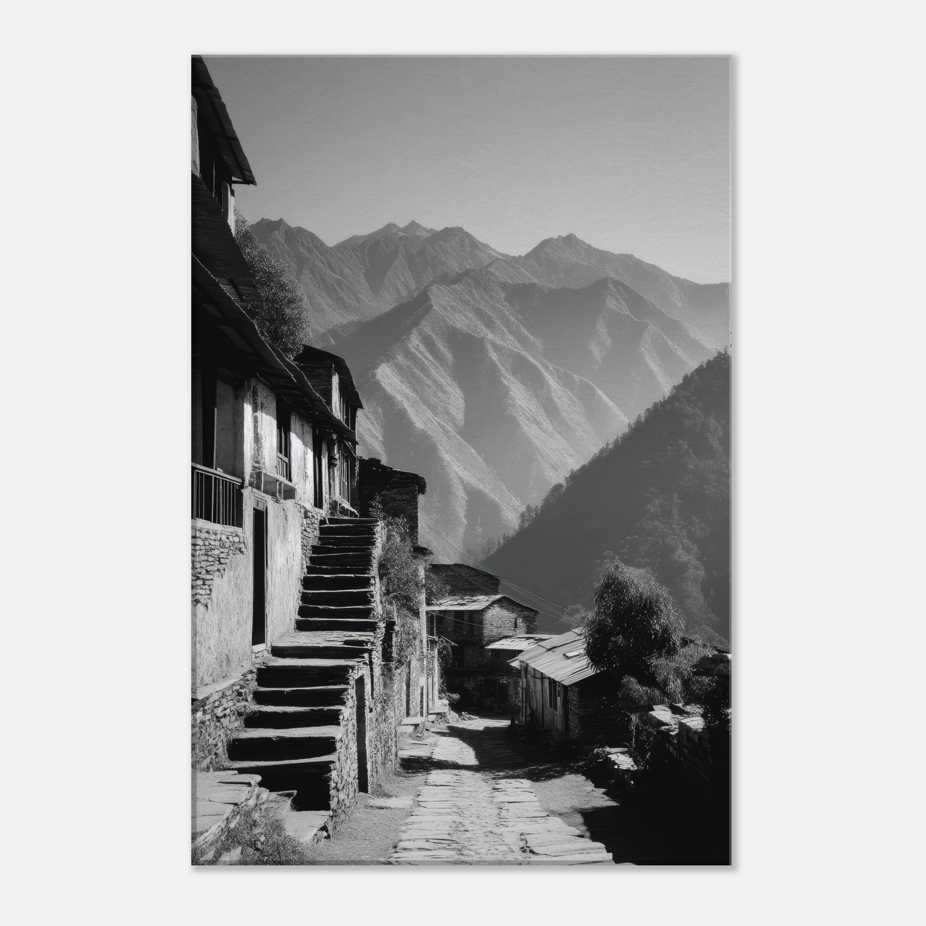 Black and white and richly atmospheric, Mountain Village unfolds along a rugged hillside where stone stairs ascend between time worn homes. Light threads through narrow alleys, casting tactile shadows on cobblestones and wooden balconies. The mood is quiet, contemplative, and timeless a vignette of climb, memory, and place. In a living room or study, this piece anchors the room with architectural grace, heightening textures and contrasts while inviting the eye to wander, returning again to the charm and discipline of Mountain Village.
