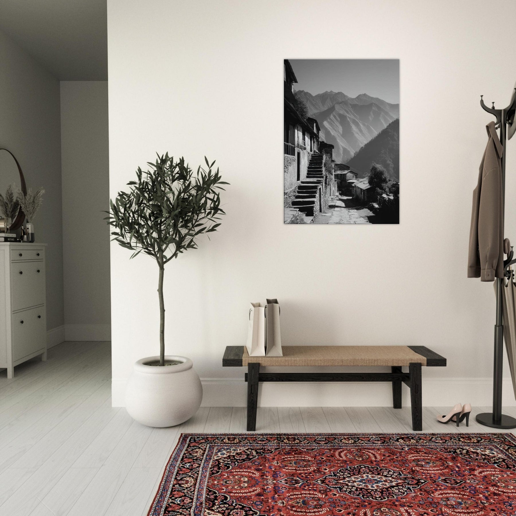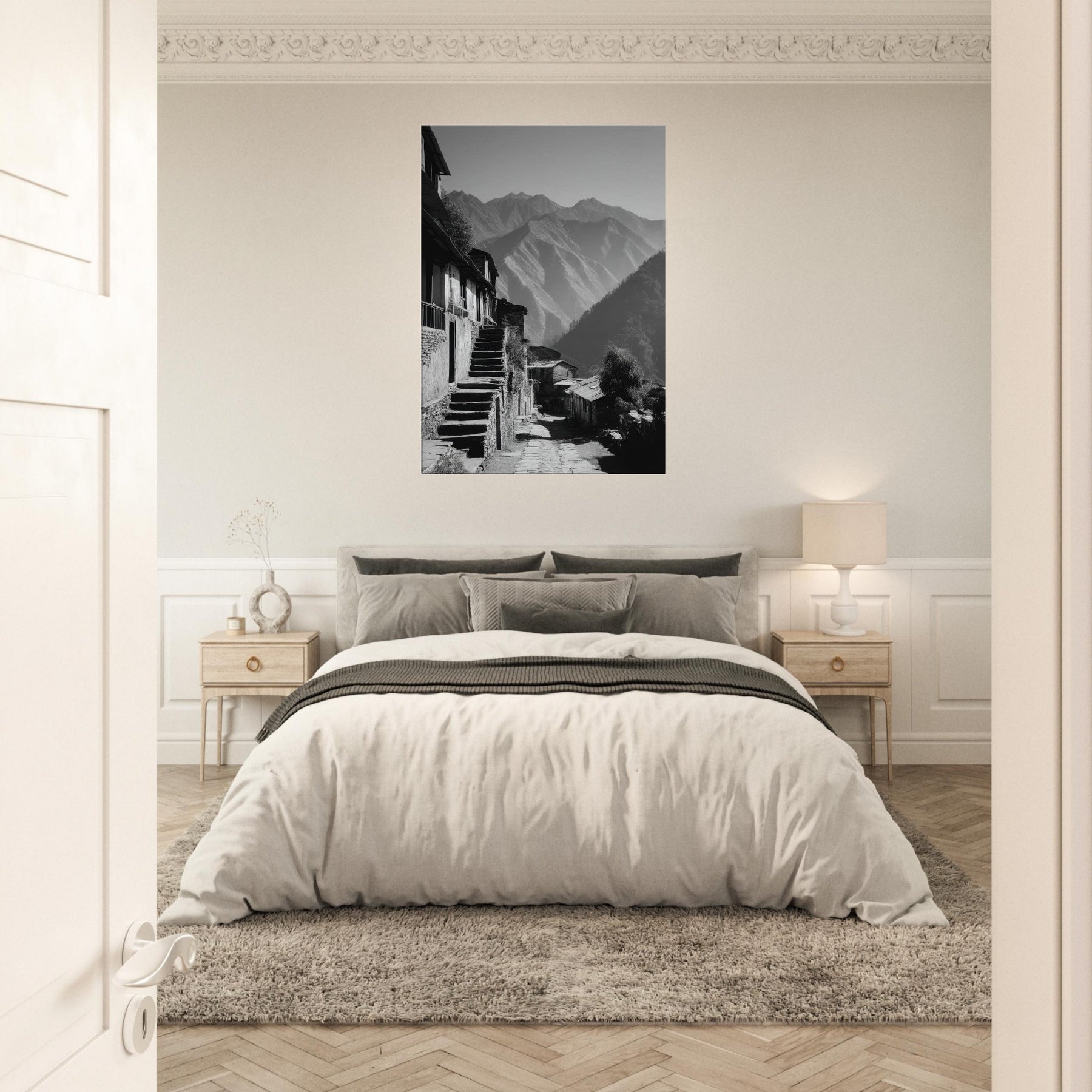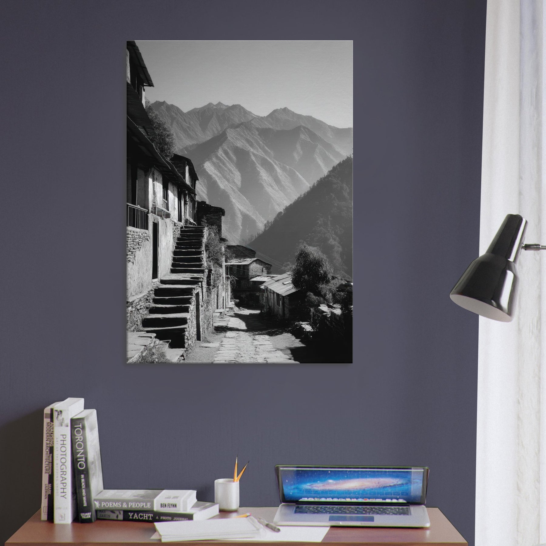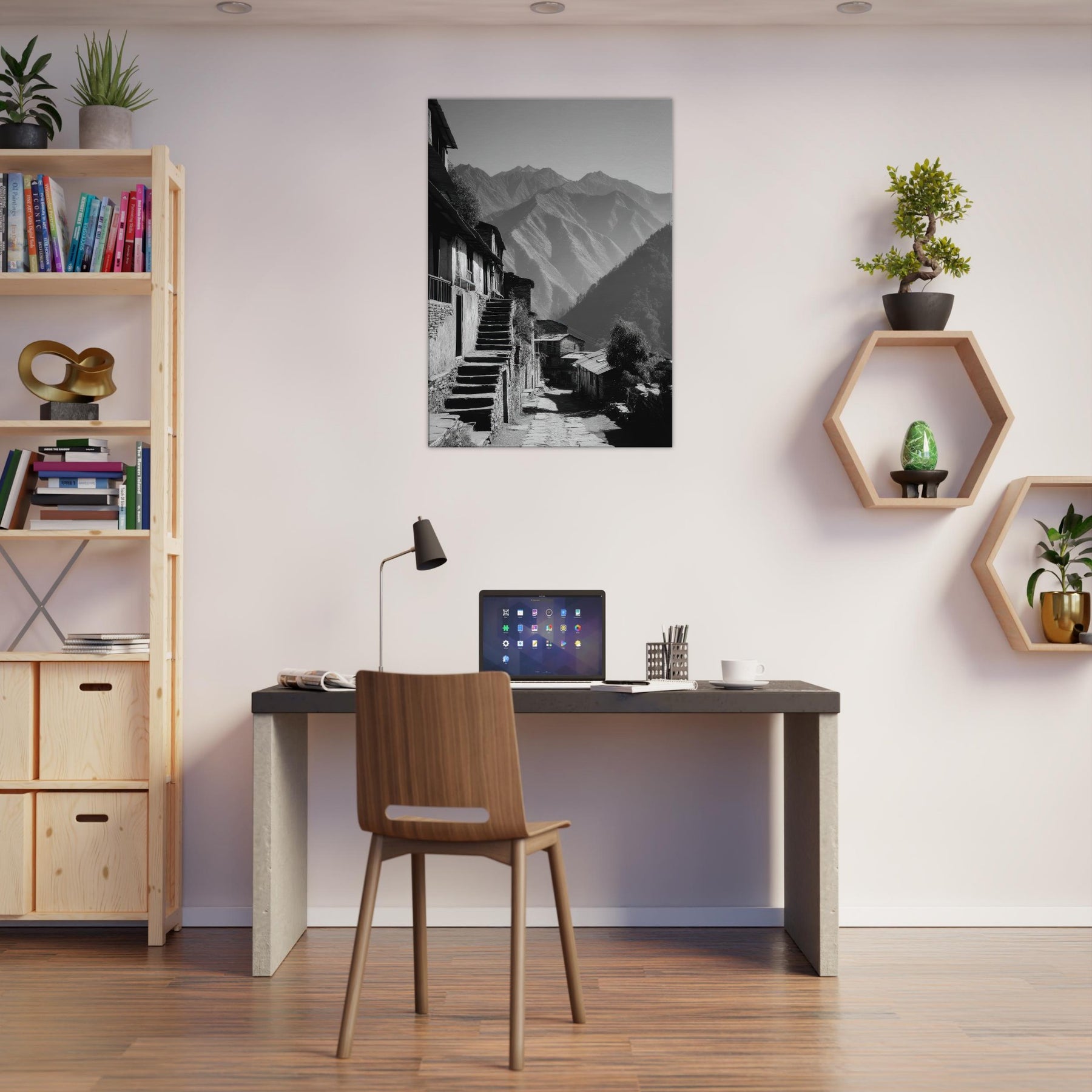 Black and white and richly atmospheric, Mountain Village unfolds along a rugged hillside where stone stairs ascend between time worn homes. Light threads through narrow alleys, casting tactile shadows on cobblestones and wooden balconies. The mood is quiet, contemplative, and timeless a vignette of climb, memory, and place. In a living room or study, this piece anchors the room with architectural grace, heightening textures and contrasts while inviting the eye to wander, returning again to the charm and discipline of Mountain Village.