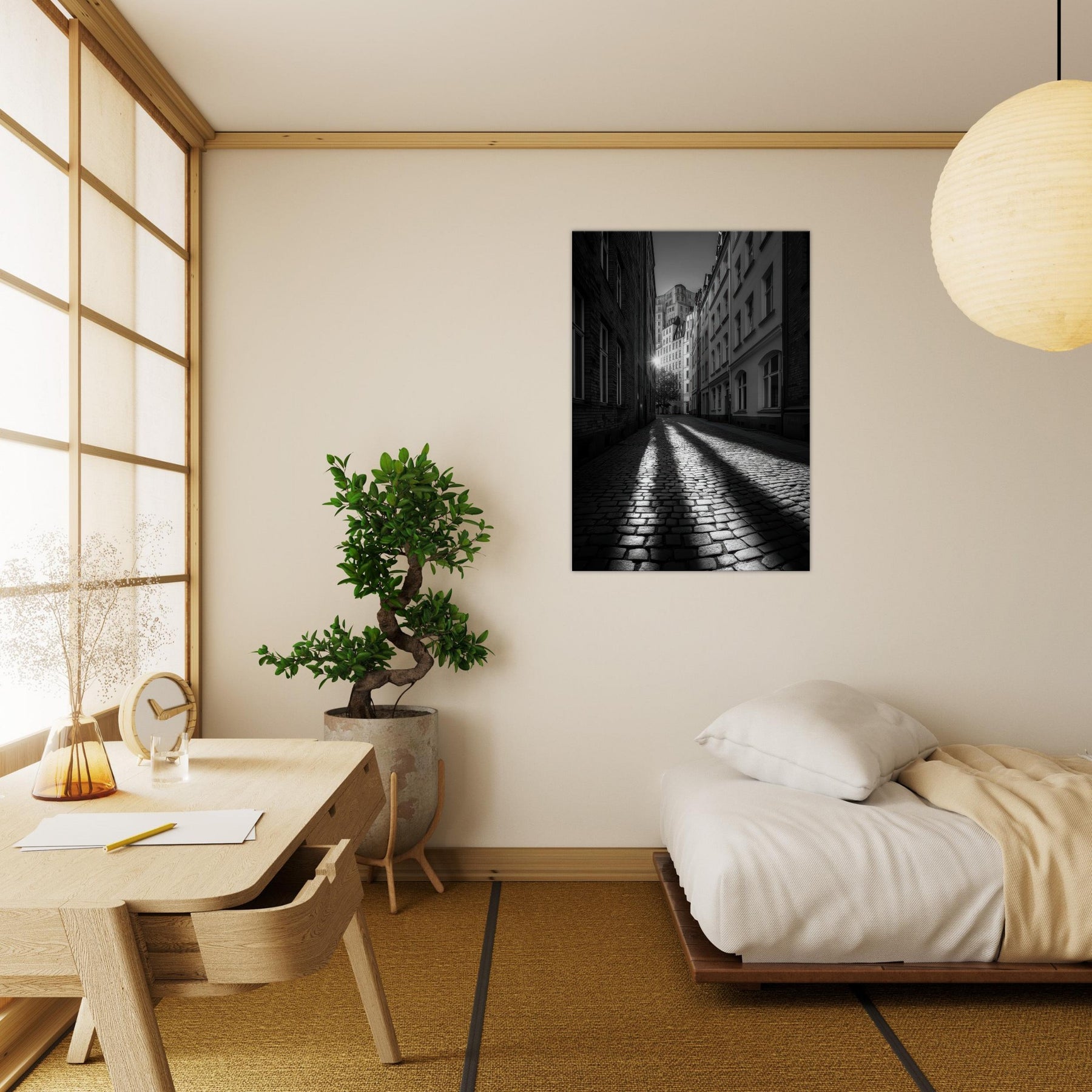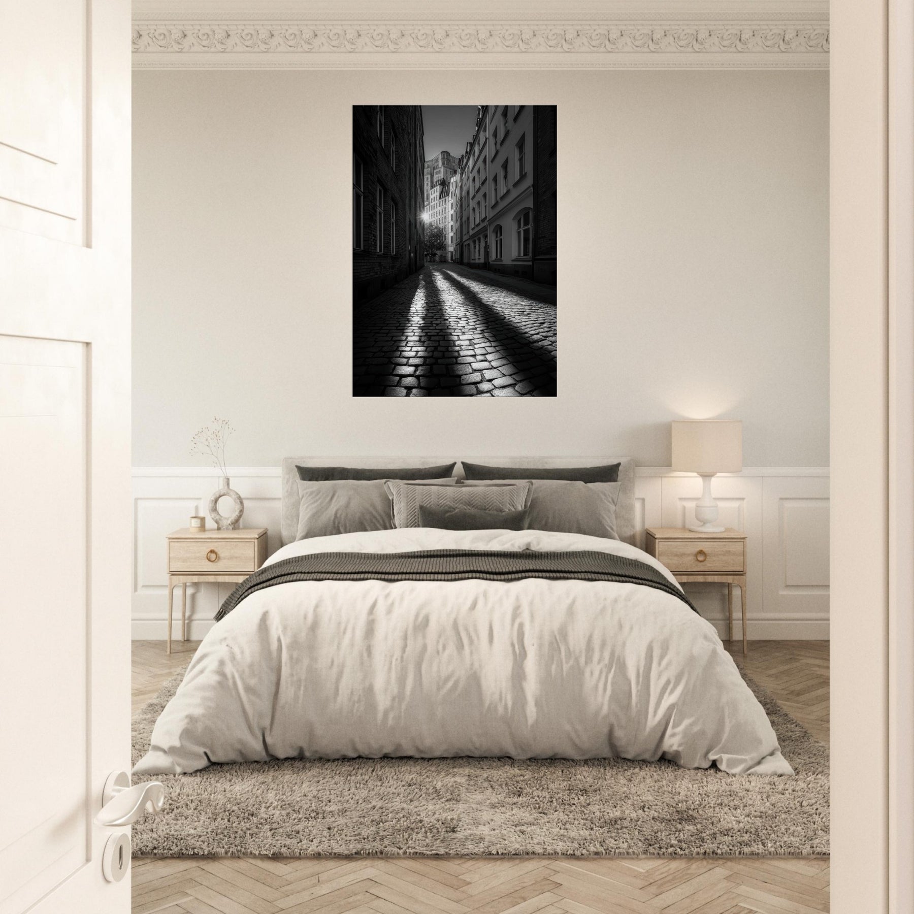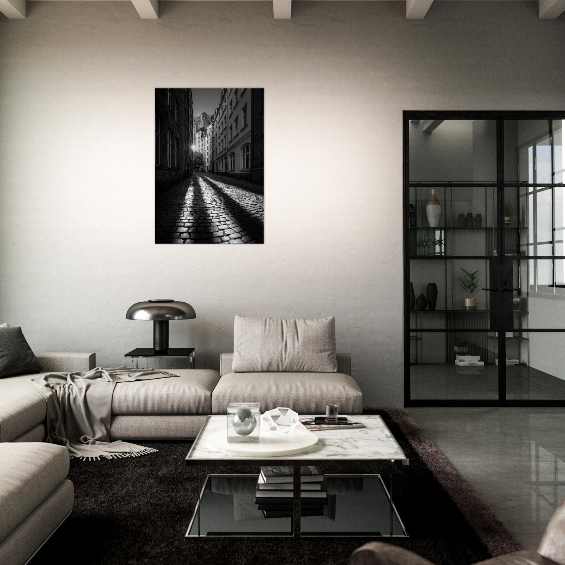 European Streets unfold in monochrome, where narrow lanes reflect the pulse of the city. This photograph invites quiet contemplation, the sun's last rays tracing cobblestones and lifting architectural silhouettes into timeless dialogue. It warms a living space with a cinematic stillness, turning hallways into intimate avenues and walls into a window to distant places. Let the soft contrasts and shadows guide conversation, as urban memory and modern design meet in one elegant, evocative composition.