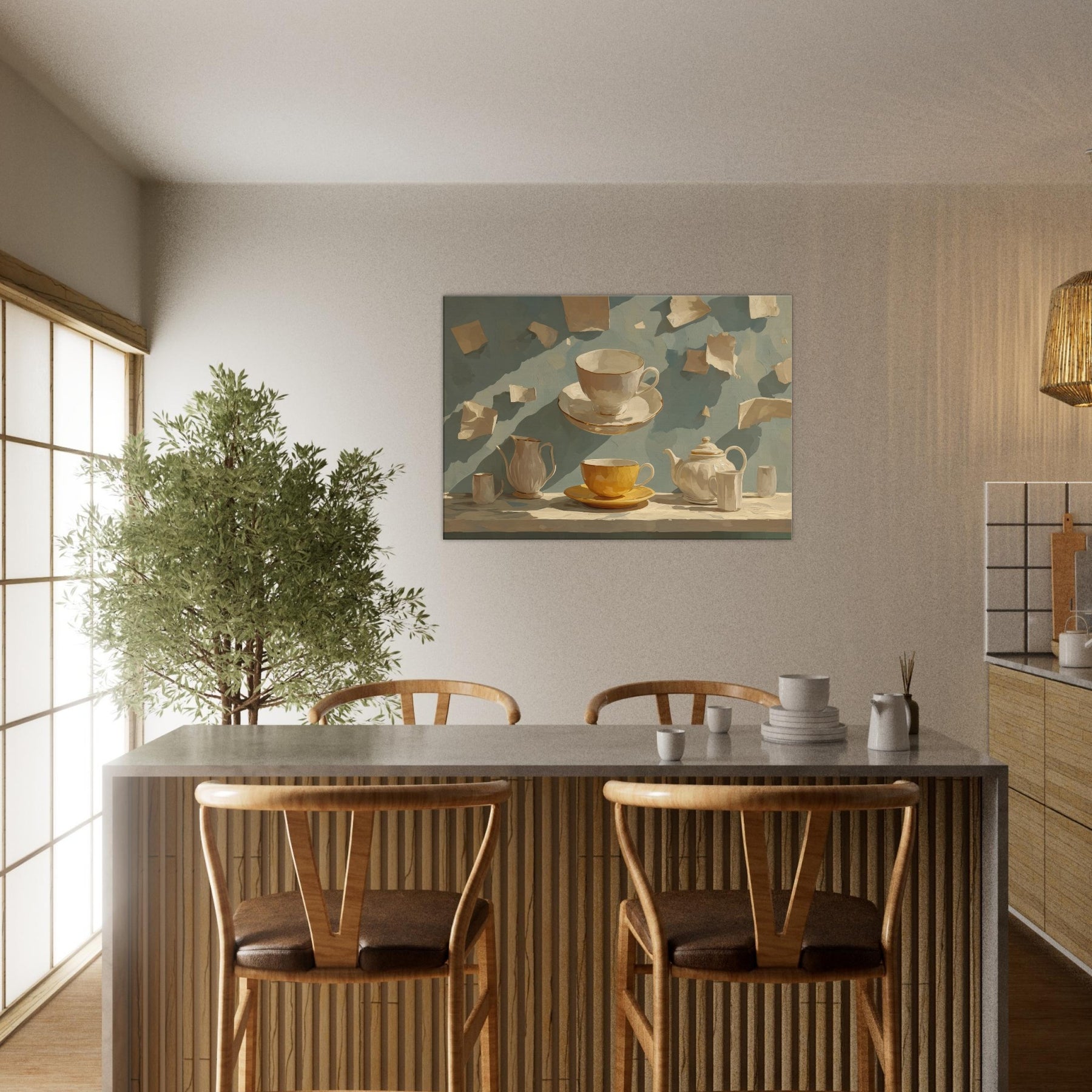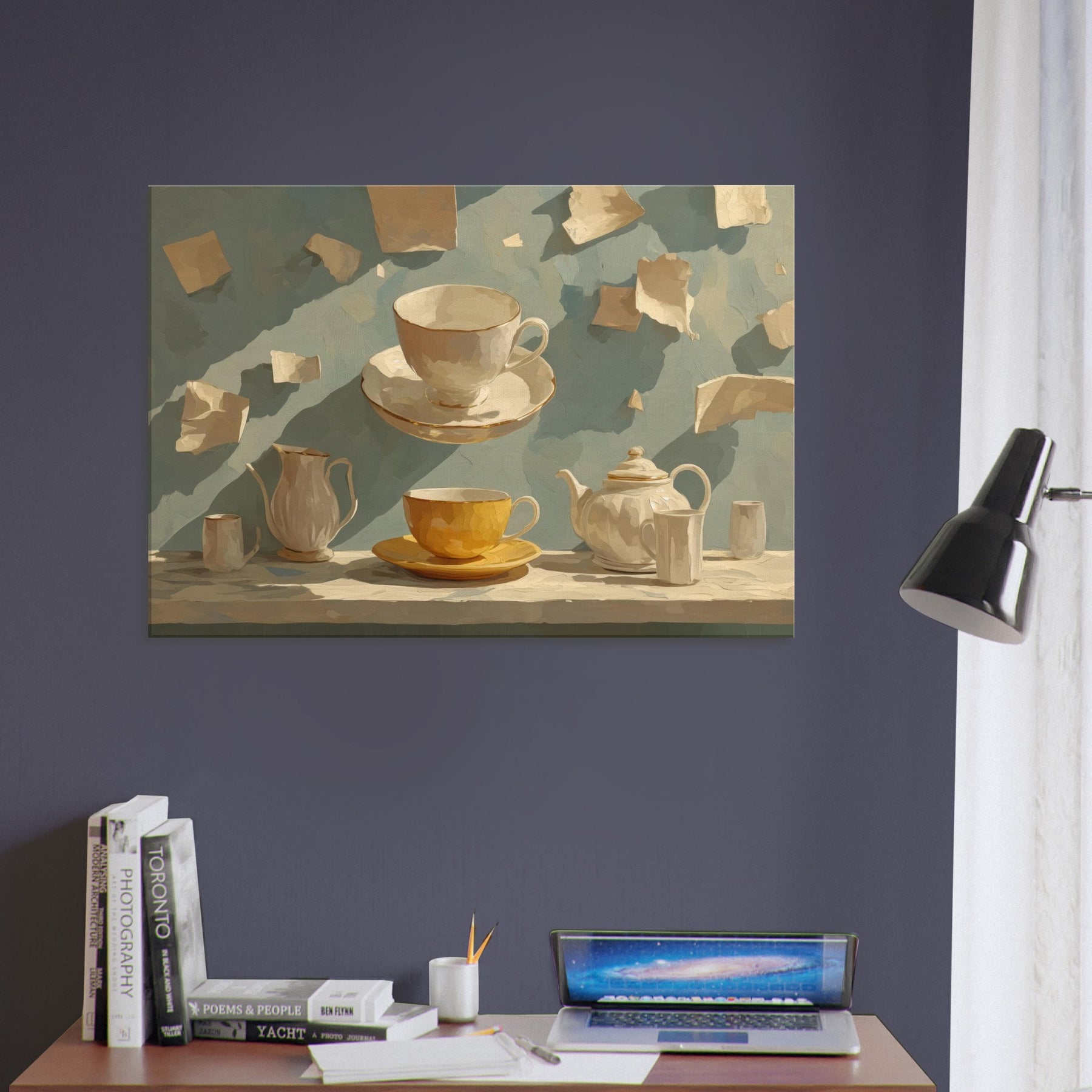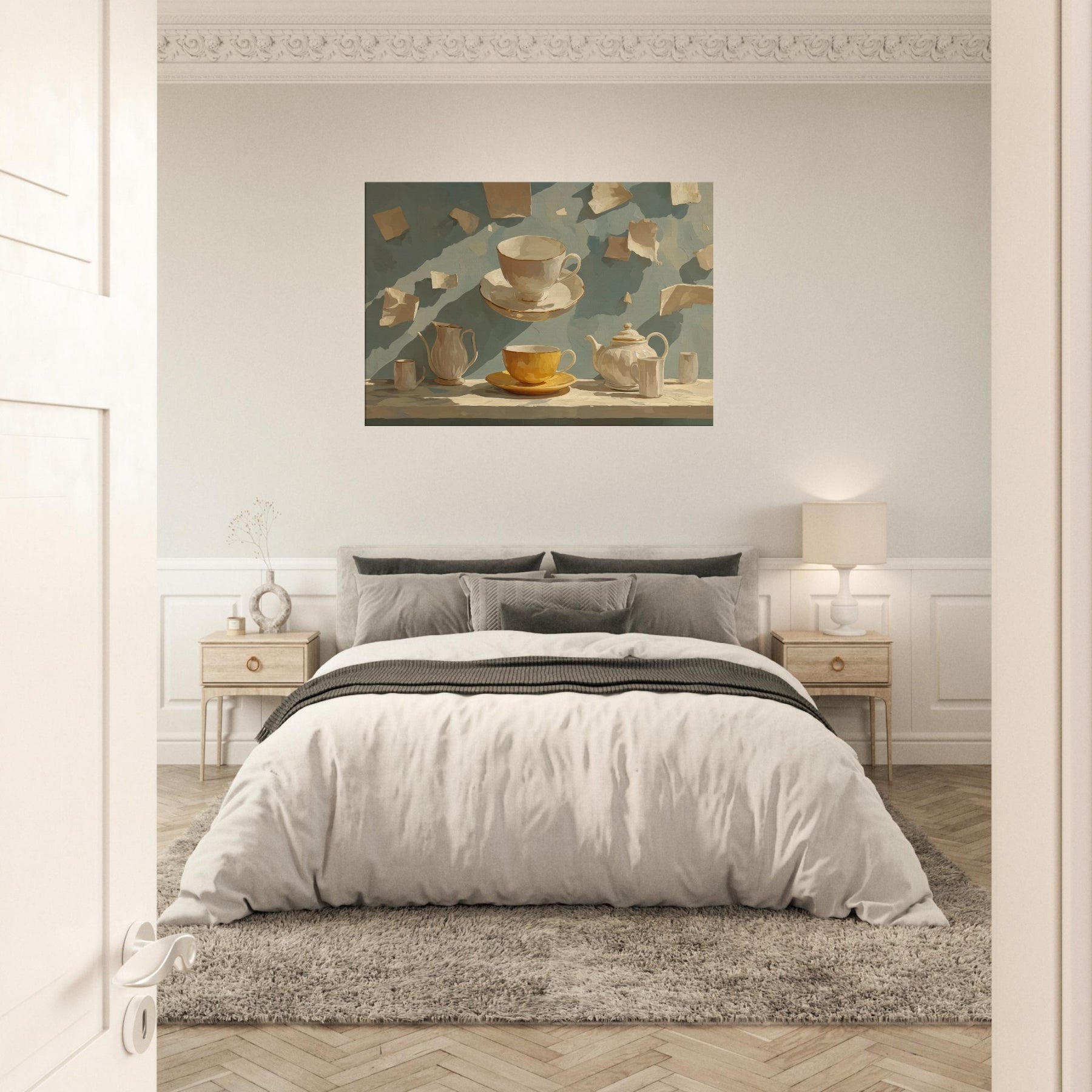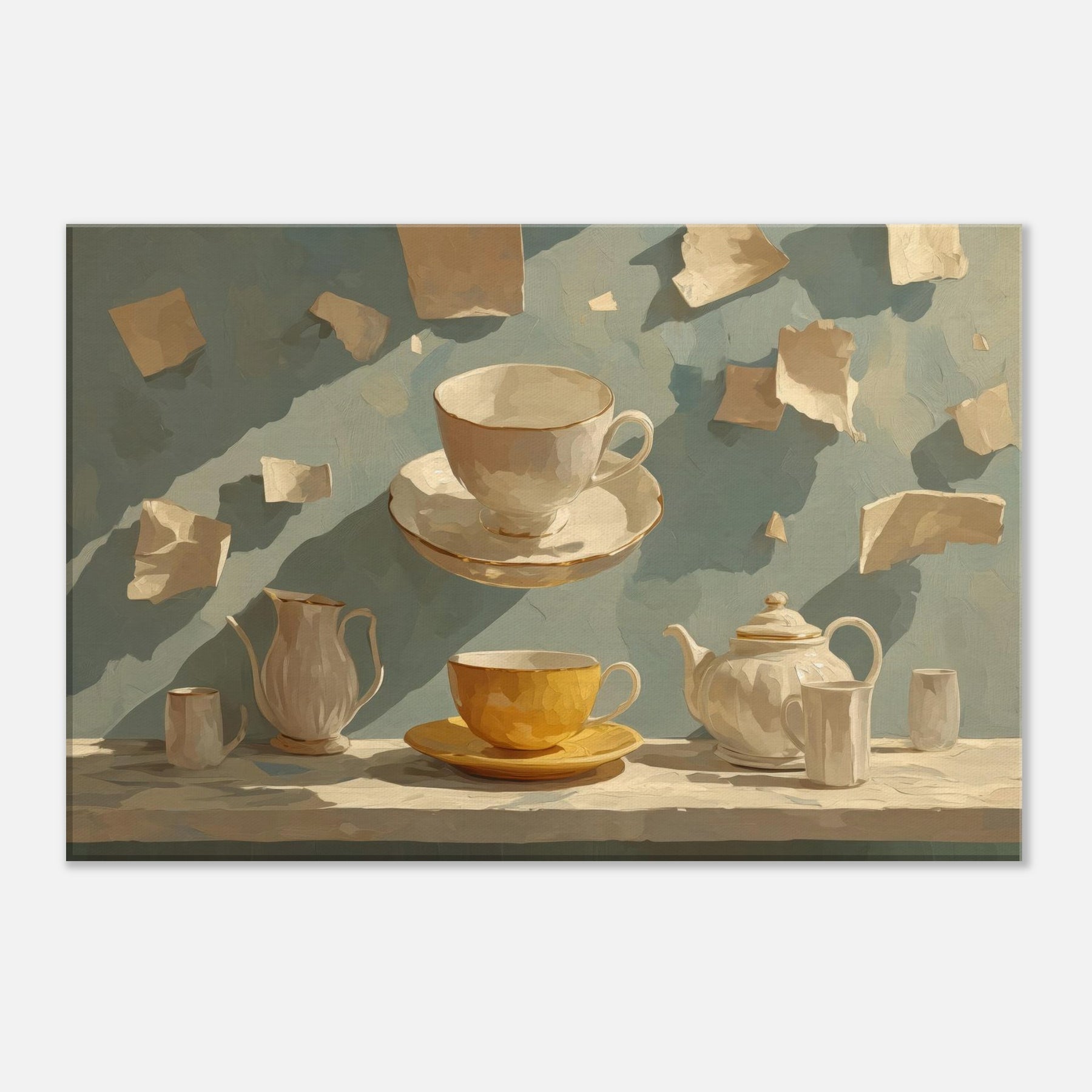 From a quiet table to a dreamscape, this Tea Set scene dissolves the ordinary into a soft, porcelain dusk. Surreal shapes drift across a pale backdrop as cups, a teapot, and saucers hover with serene gravity. The Tea Set anchors the composition, while parchment like scraps drift like memories rearranged. The painterly light and warm creams invite a slow, sensorial gaze, turning any living space into a contemplative sanctuary where conversation slows and imagination lingers, inviting daily rituals to become acts of quiet wonder.