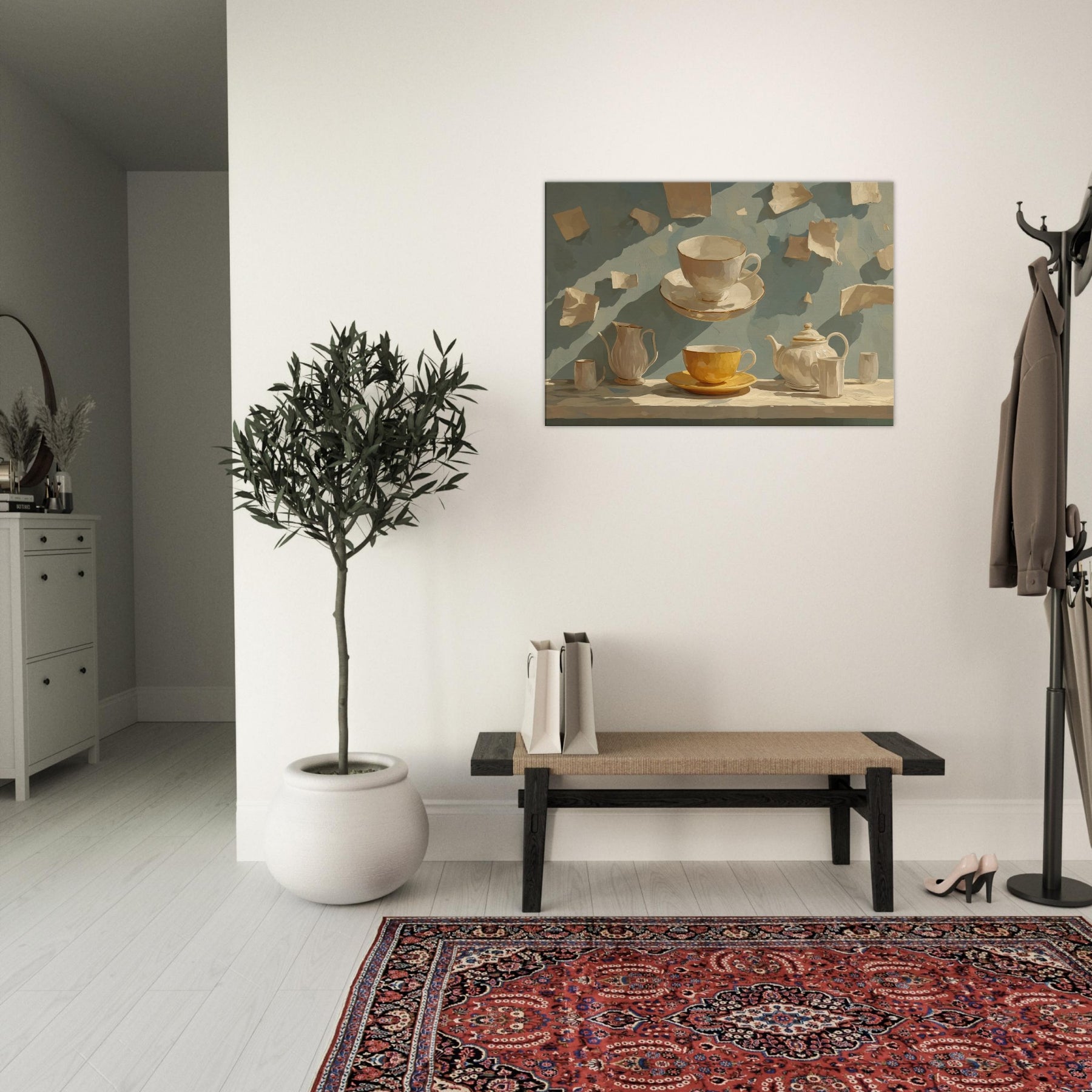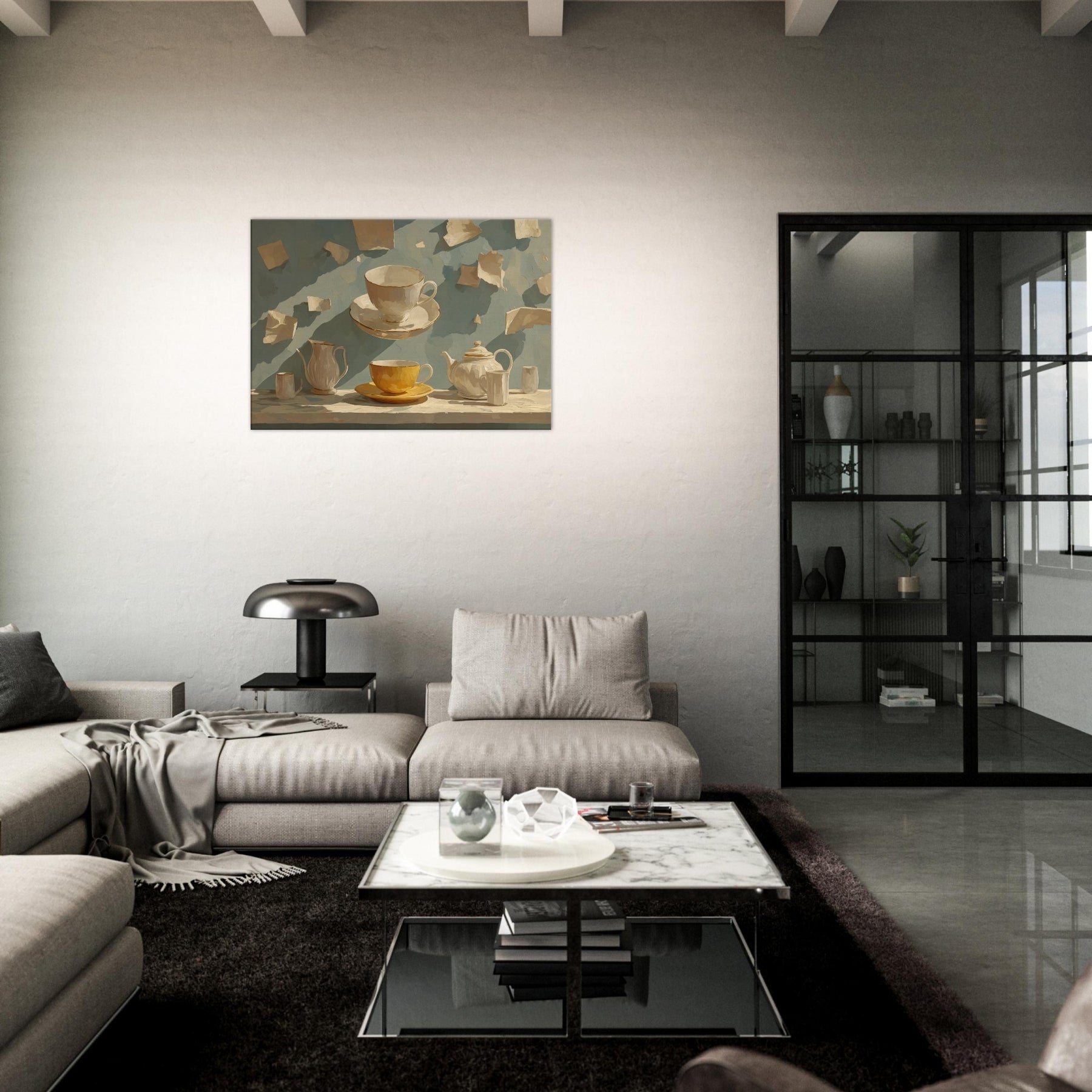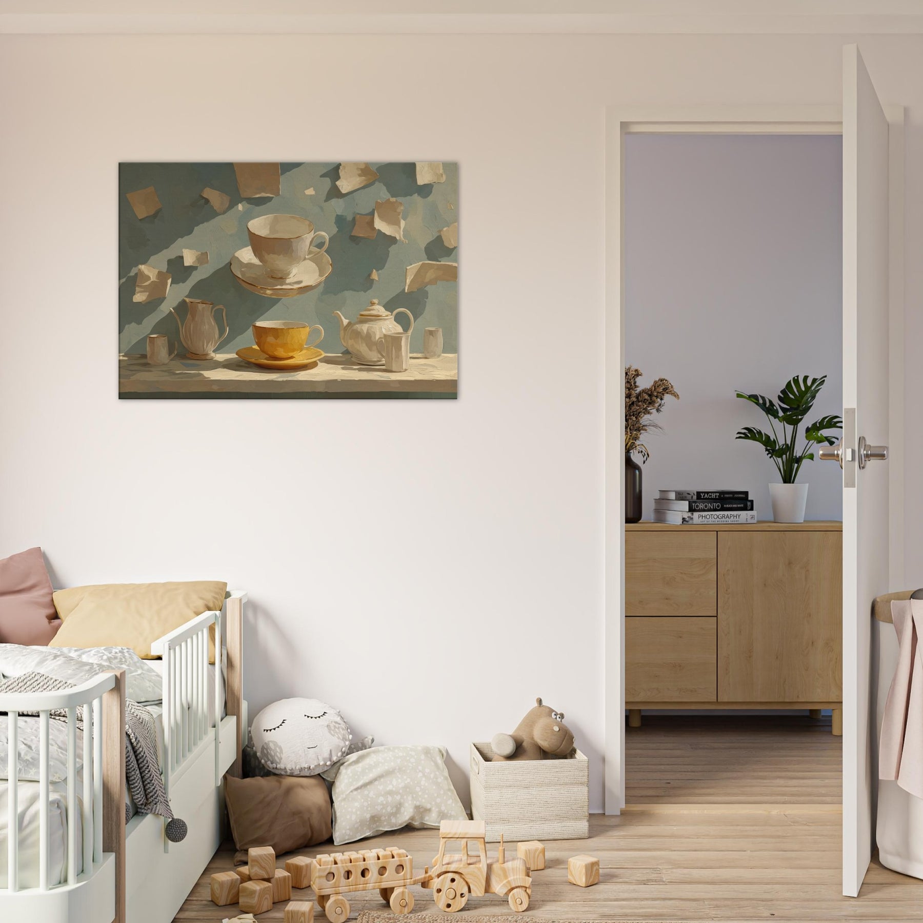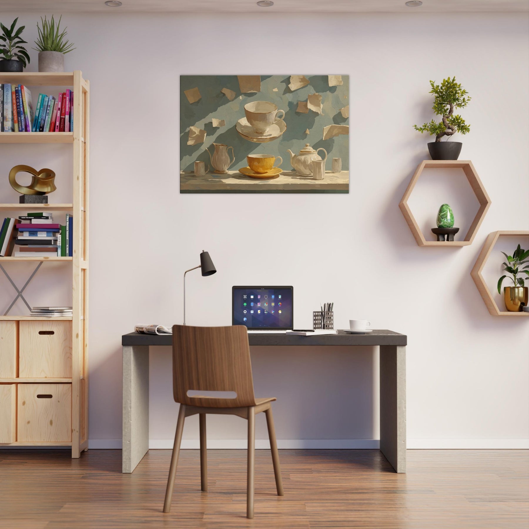 From a quiet table to a dreamscape, this Tea Set scene dissolves the ordinary into a soft, porcelain dusk. Surreal shapes drift across a pale backdrop as cups, a teapot, and saucers hover with serene gravity. The Tea Set anchors the composition, while parchment like scraps drift like memories rearranged. The painterly light and warm creams invite a slow, sensorial gaze, turning any living space into a contemplative sanctuary where conversation slows and imagination lingers, inviting daily rituals to become acts of quiet wonder.