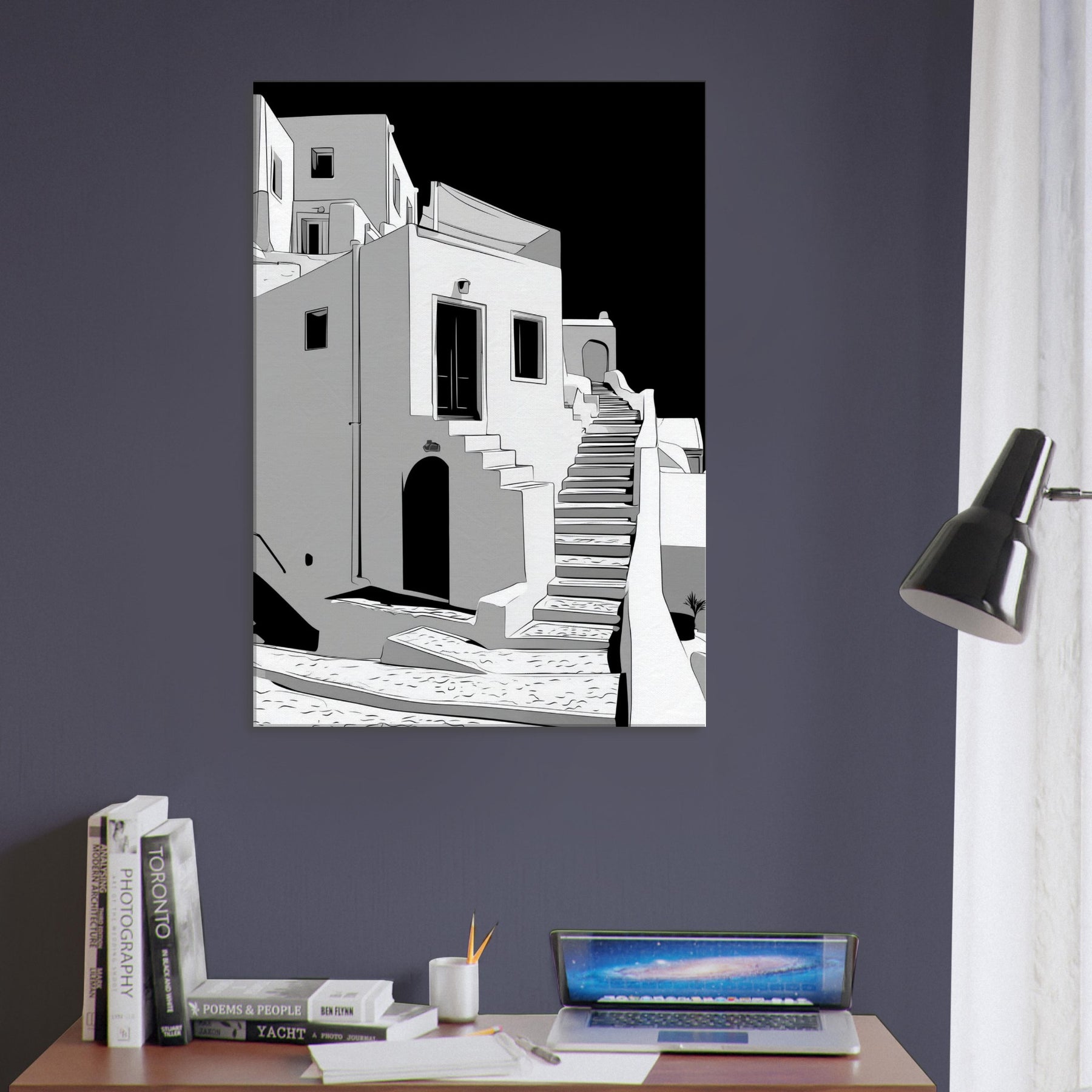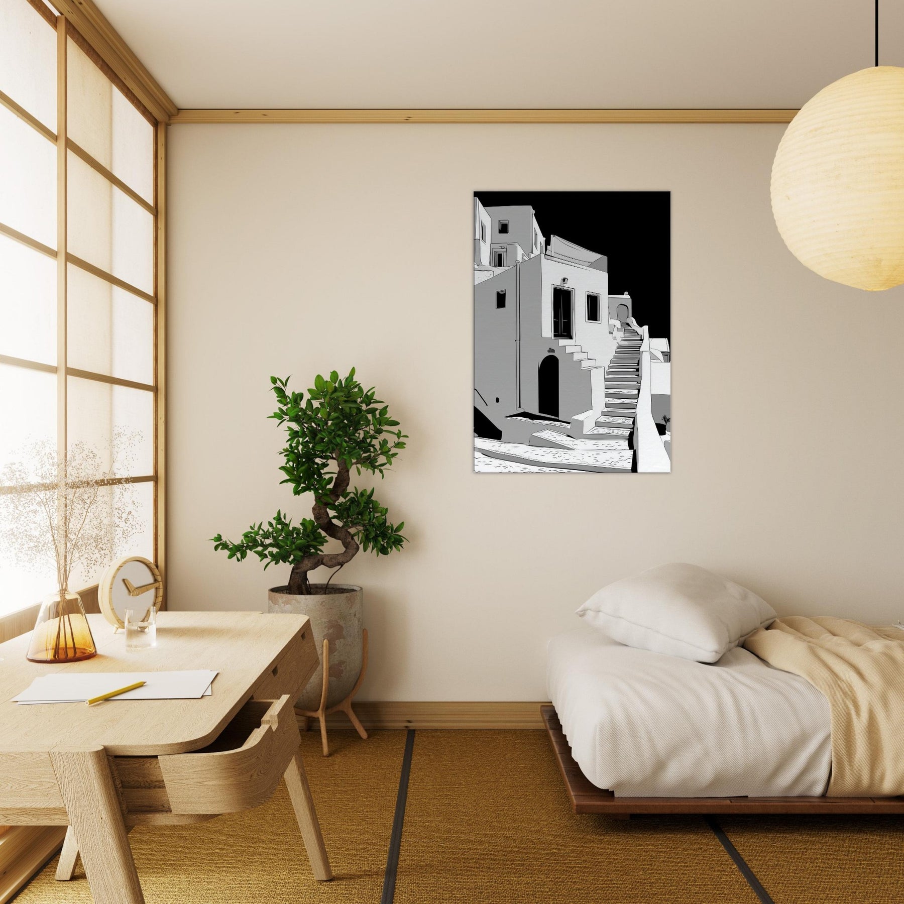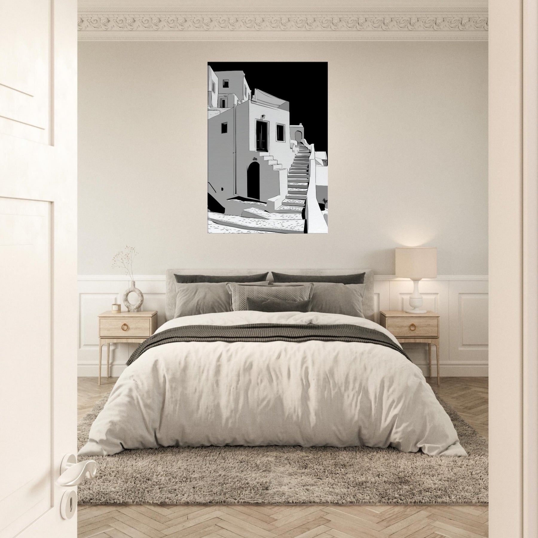 Toward the whitewashed horizons of Santorini, this line art study distills the island’s sculpted terraces into a serene procession of steps and arches. The clean black and white contrasts invite light to spill across your space, turning a quiet corner into a sunlit balcony. As you gaze, the cooling rhythm of the strokes evokes sea breeze and whitewashed stone, offering a minimalist mood that pairs effortlessly with living rooms, bedrooms, or study nooks encouraging calm, clarity, and a touch of Aegean magic.