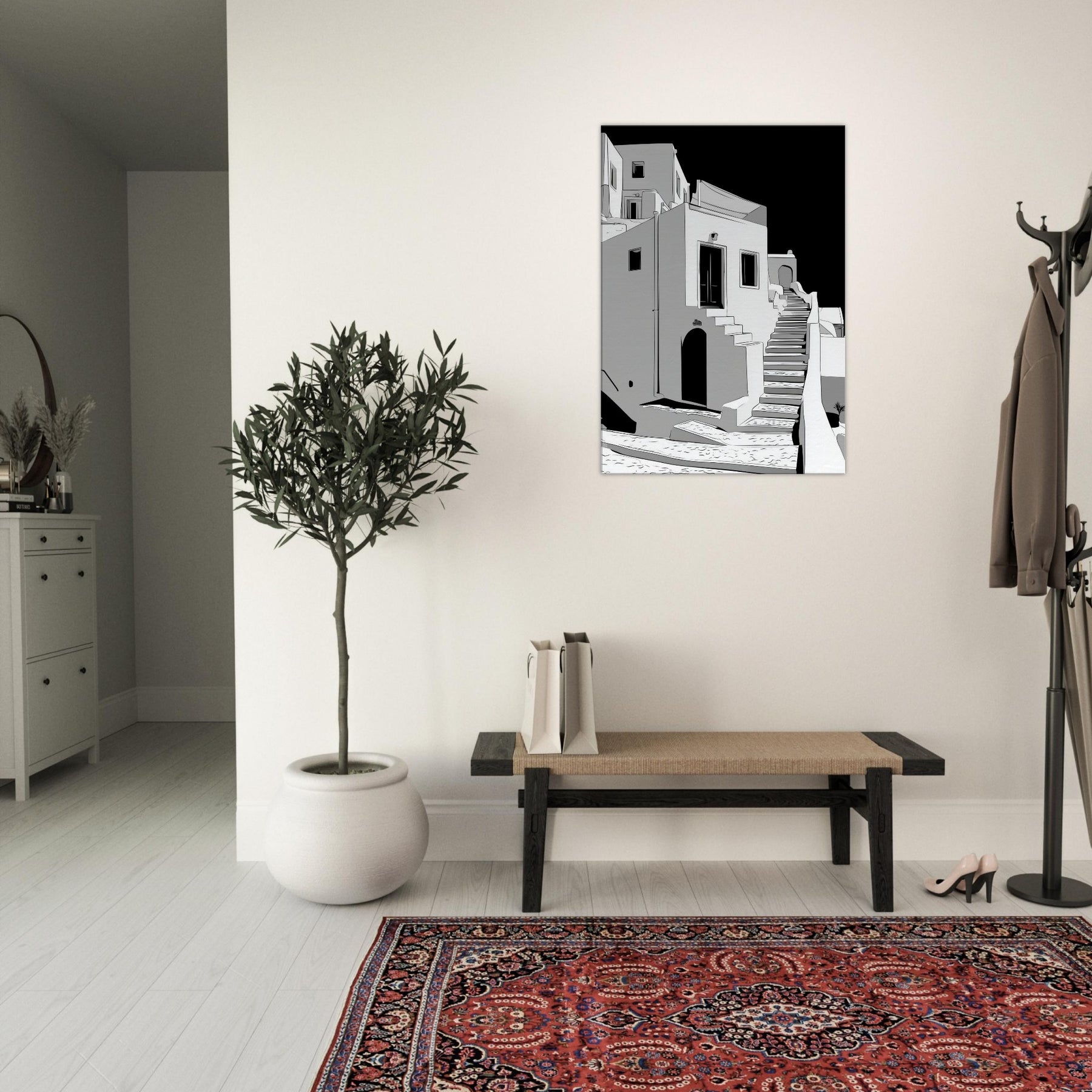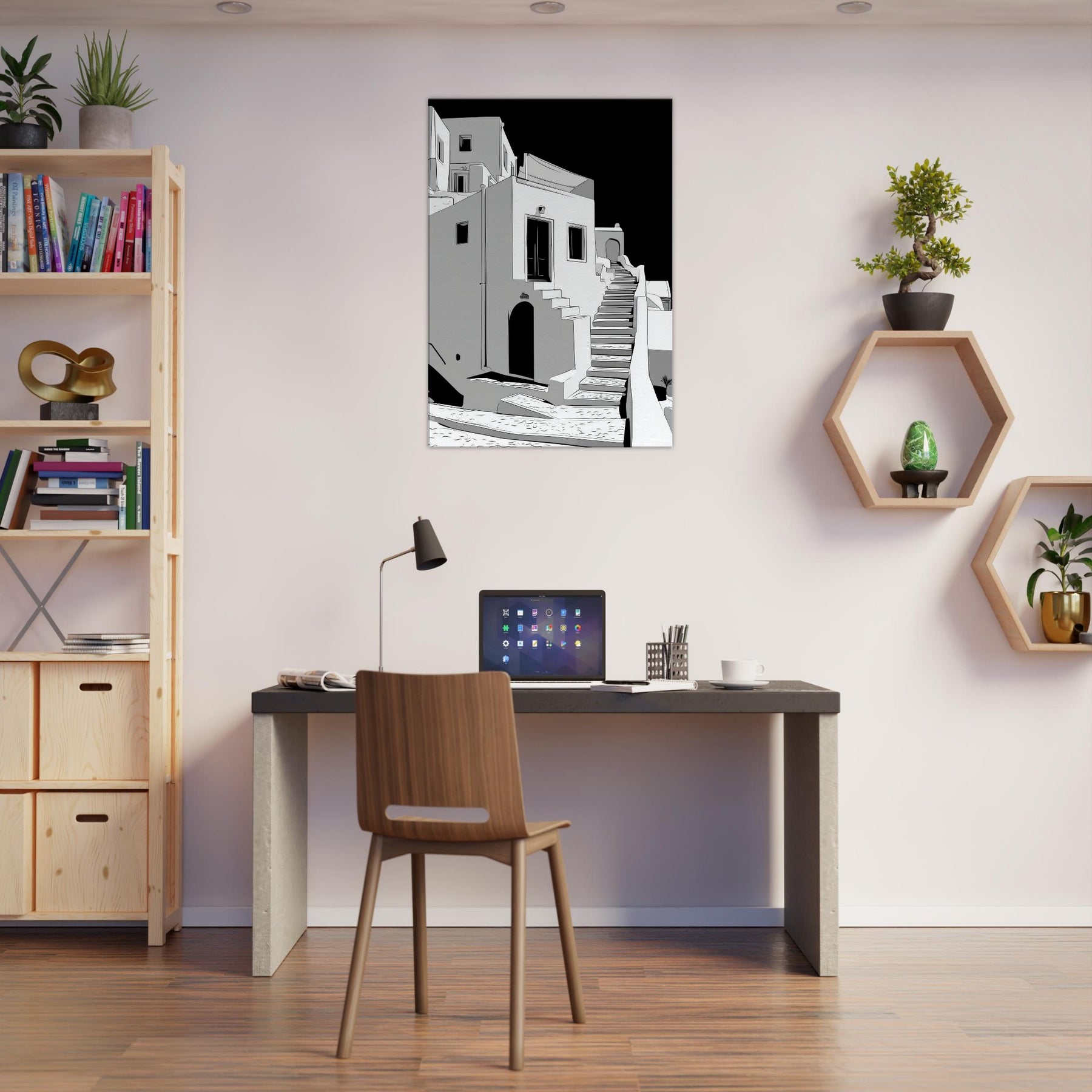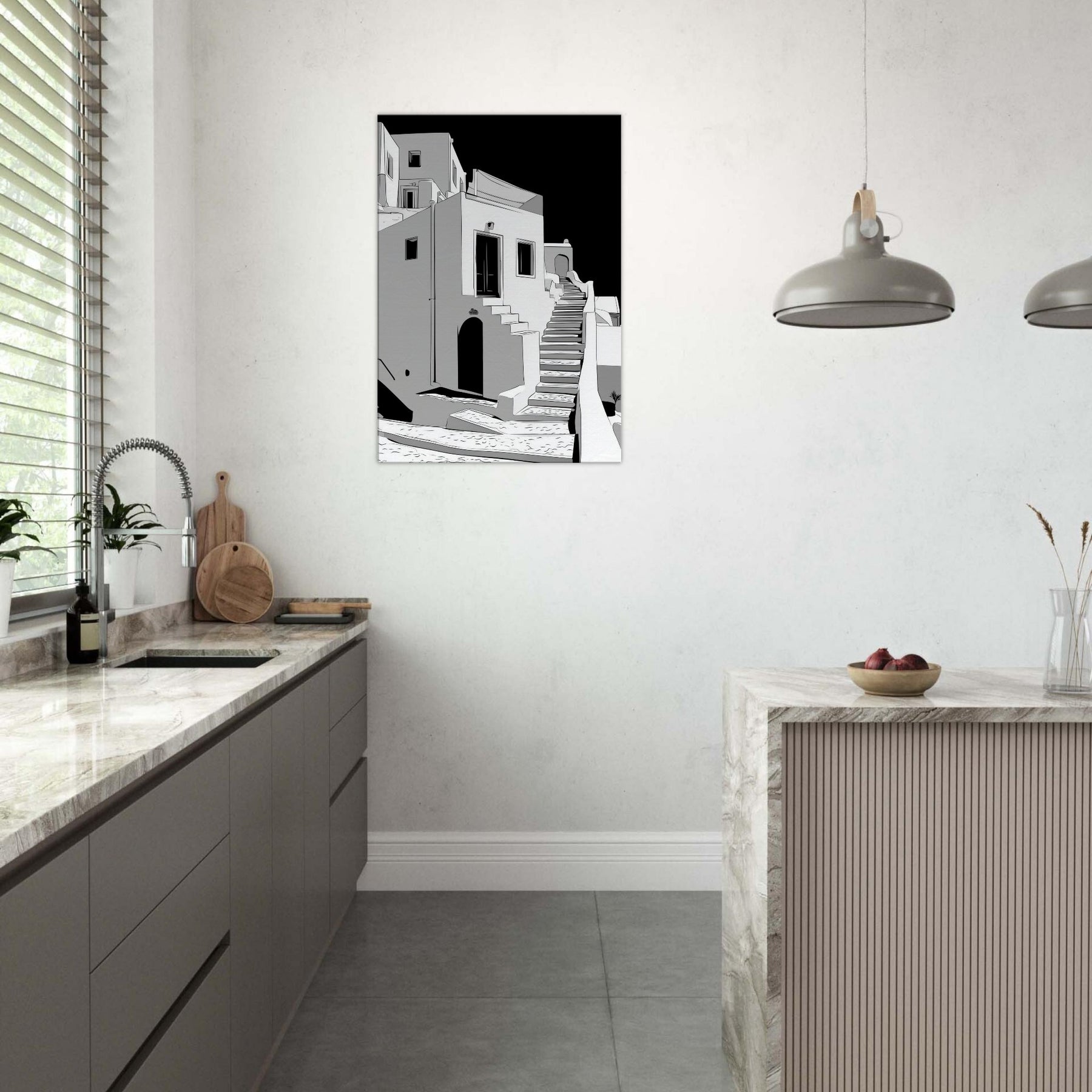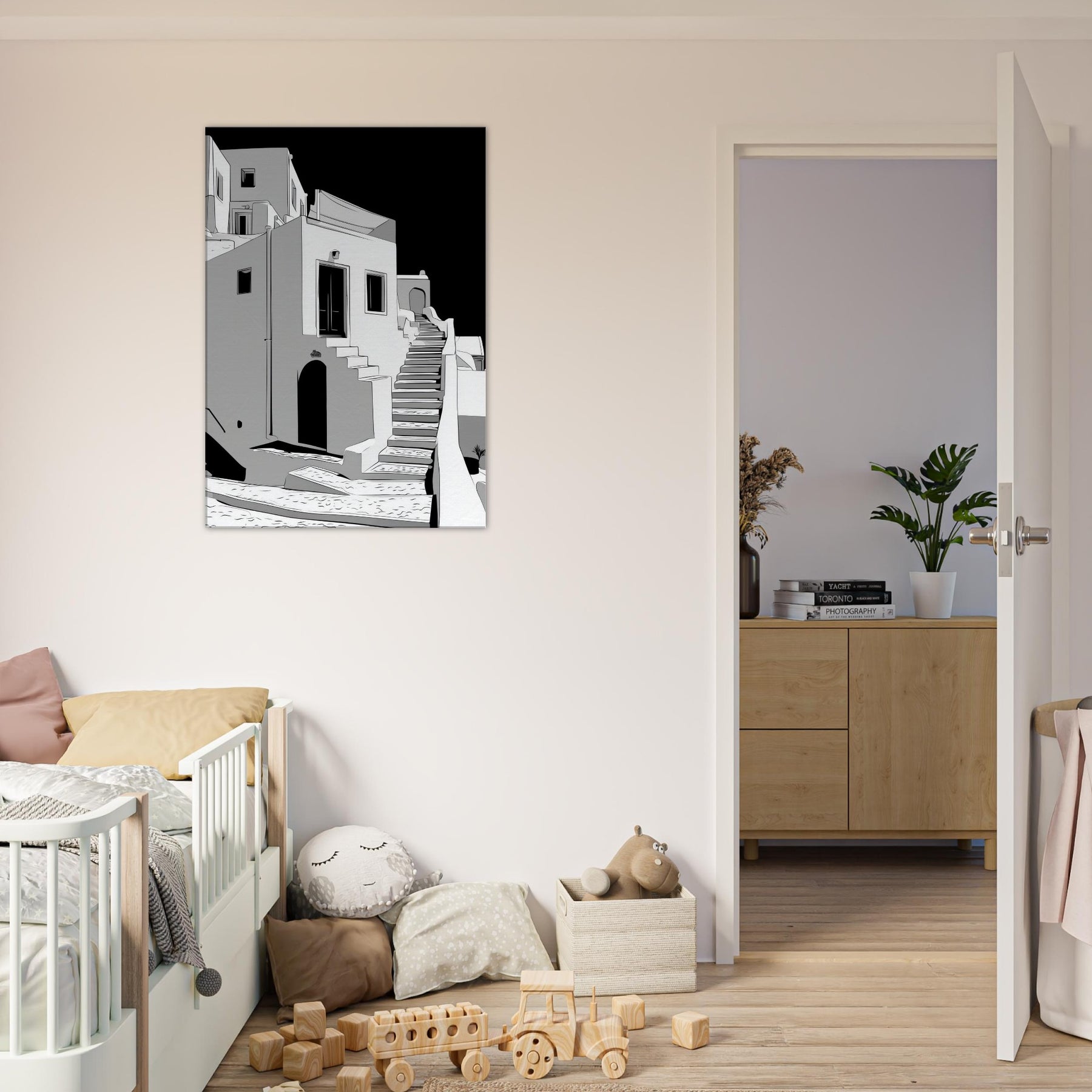 Toward the whitewashed horizons of Santorini, this line art study distills the island’s sculpted terraces into a serene procession of steps and arches. The clean black and white contrasts invite light to spill across your space, turning a quiet corner into a sunlit balcony. As you gaze, the cooling rhythm of the strokes evokes sea breeze and whitewashed stone, offering a minimalist mood that pairs effortlessly with living rooms, bedrooms, or study nooks encouraging calm, clarity, and a touch of Aegean magic.