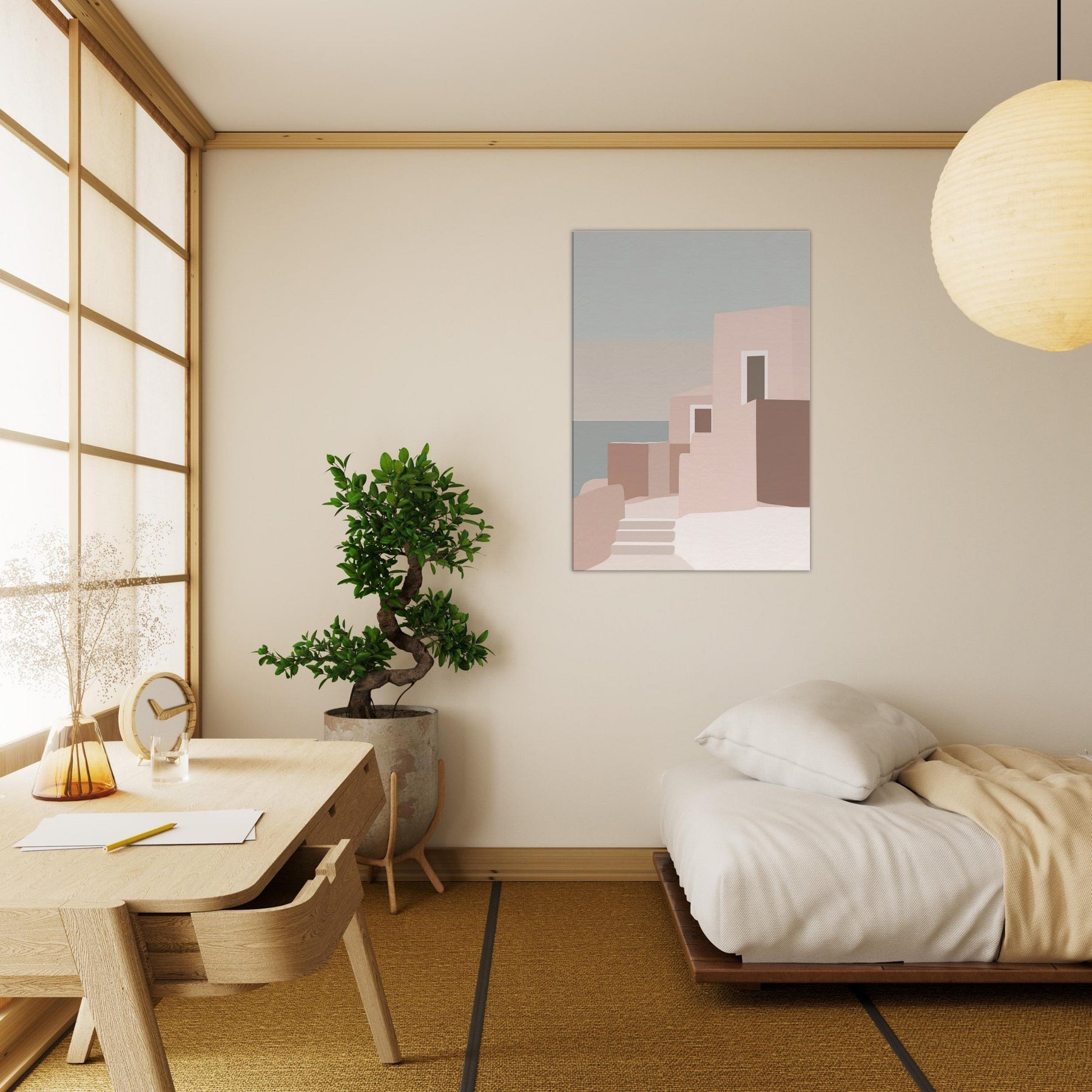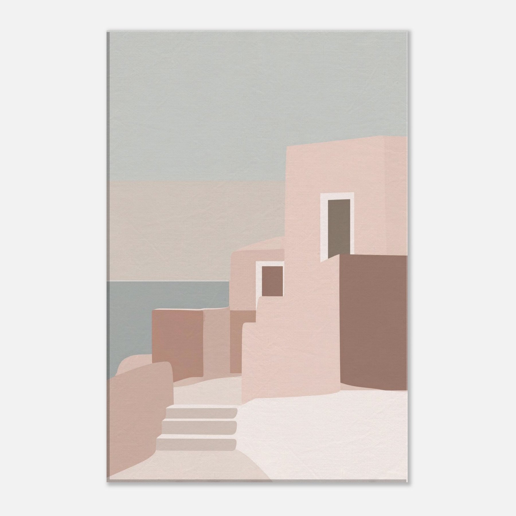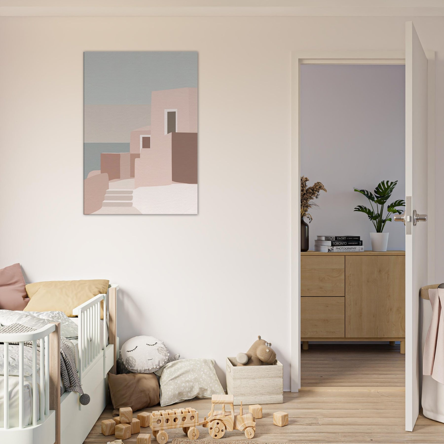 Santorini rises in soft, sunlit blocks of color, captured in a minimalist chorus of blush pinks and powdered blues. This wall art invites the eye to wander along quiet stairways and doorway frames, where every edge breathes calm and clarity. Hang it in a living room or bedroom to bathe the space in airy light, to feel the island breeze without leaving home. The composition's serene geometry pairs with muted tones to create balance, warmth, and a subtle coastal mood that lingers.