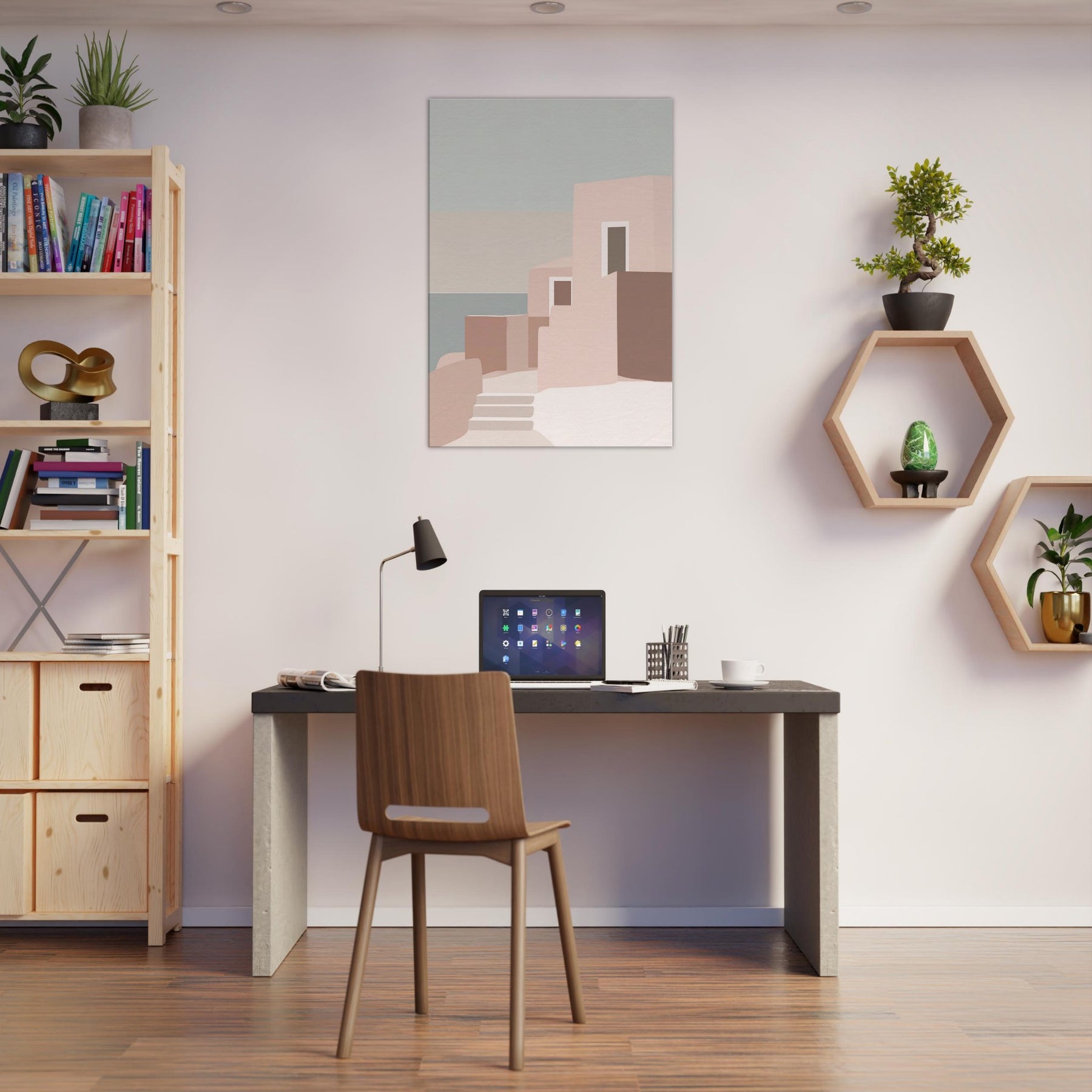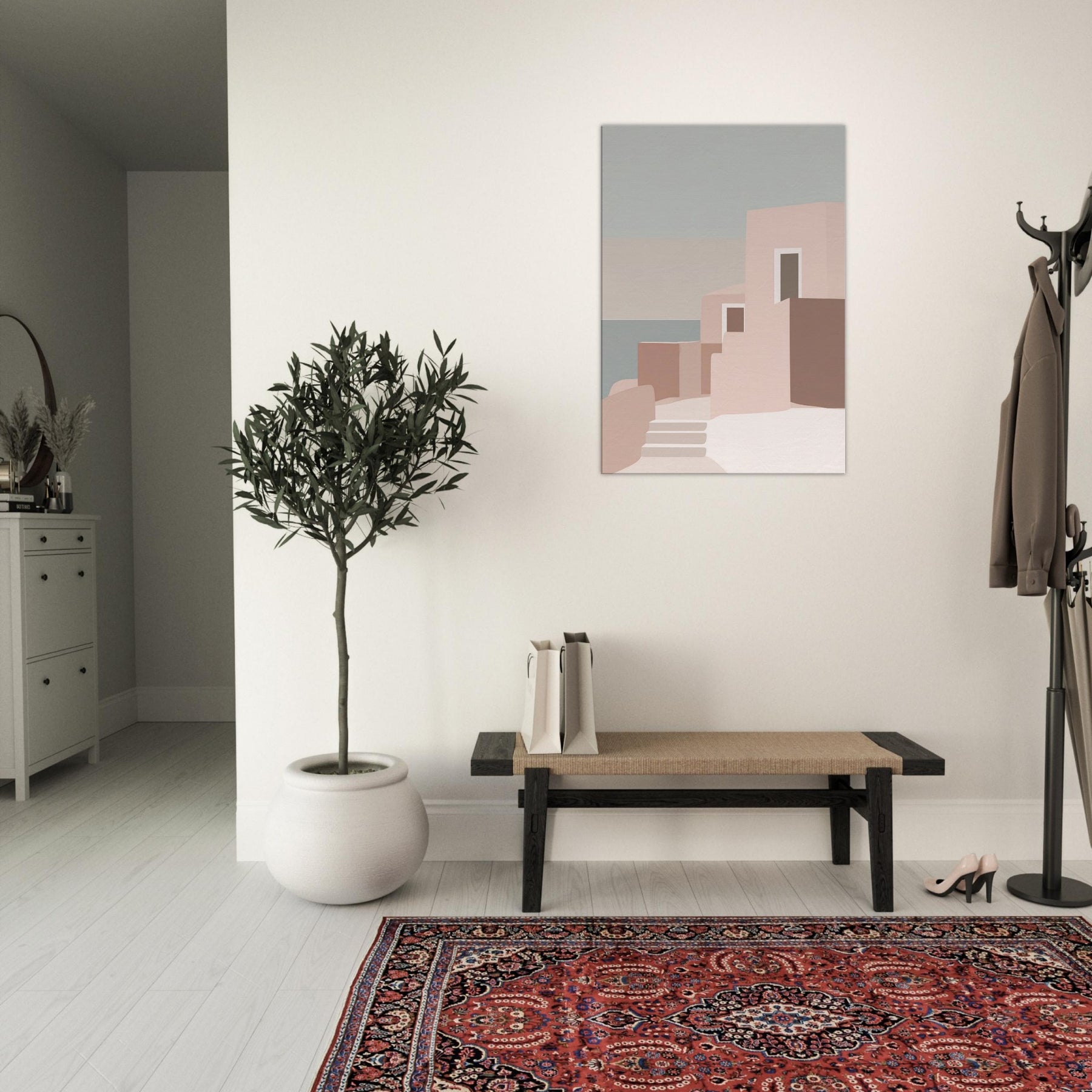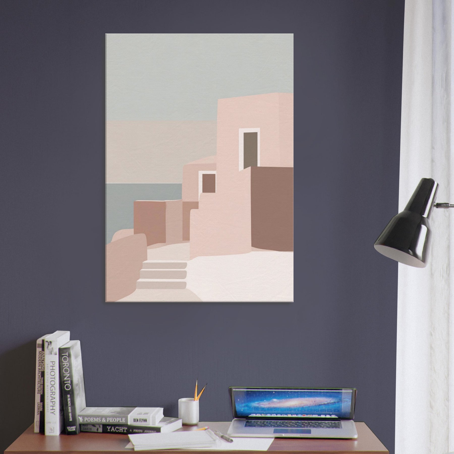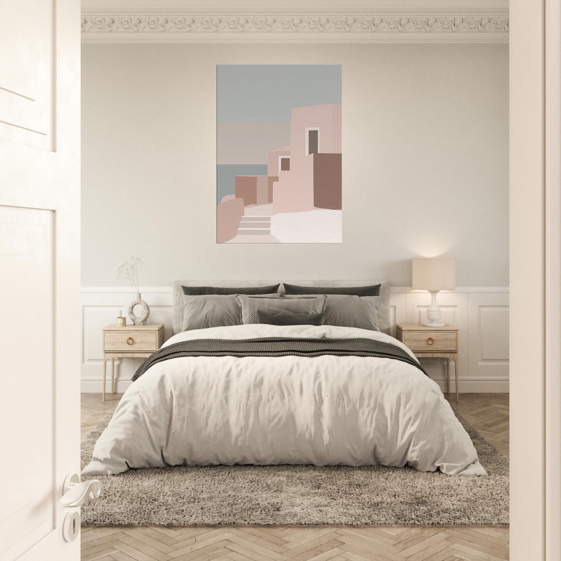 Santorini rises in soft, sunlit blocks of color, captured in a minimalist chorus of blush pinks and powdered blues. This wall art invites the eye to wander along quiet stairways and doorway frames, where every edge breathes calm and clarity. Hang it in a living room or bedroom to bathe the space in airy light, to feel the island breeze without leaving home. The composition's serene geometry pairs with muted tones to create balance, warmth, and a subtle coastal mood that lingers.