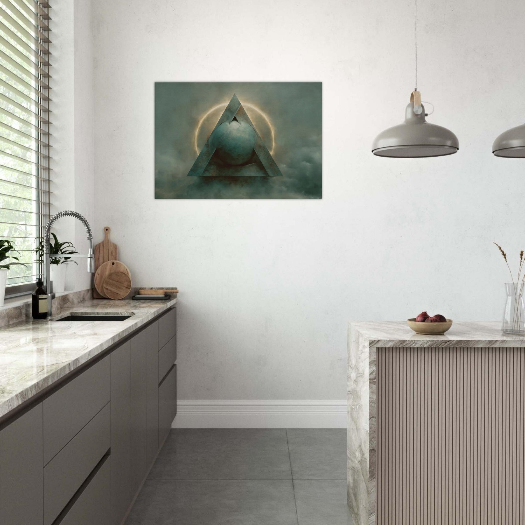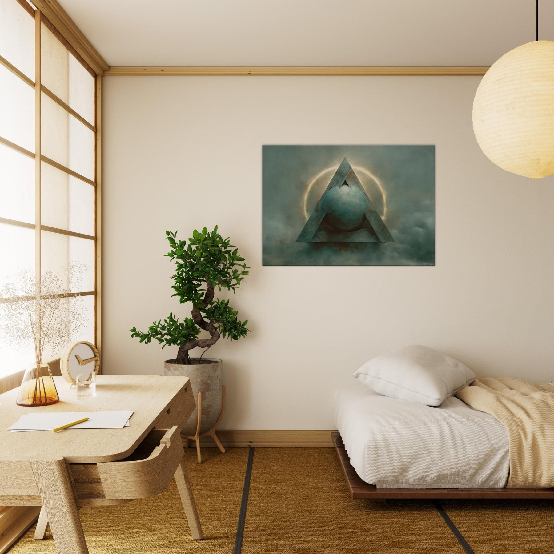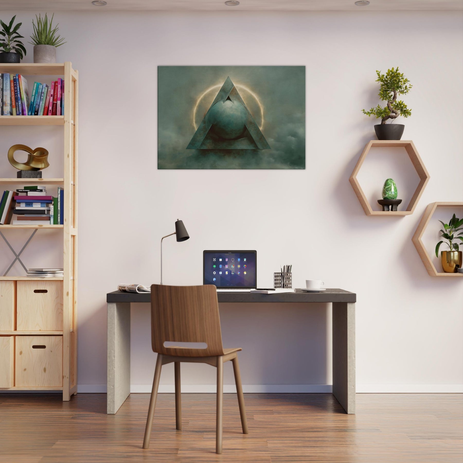 Let your wall breathe with the hush of arcane science. This piece conjures the Alchemy Symbols (Salt, Sulfur, Mercury) as a floating enigma: a teal green sphere anchored within a translucent triangle, haloed by a soft, celestial ring. Surreal textures mingle with weathered copper tones, inviting reflection and calm. The atmosphere settles like dusk in a quiet study or living room, turning everyday spaces into a chamber of mysteries where intention, balance, and wonder gather at a single focal point.