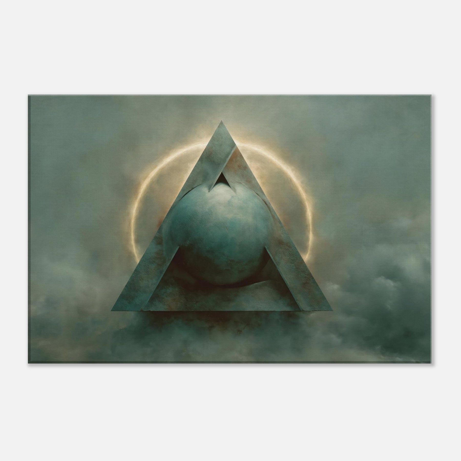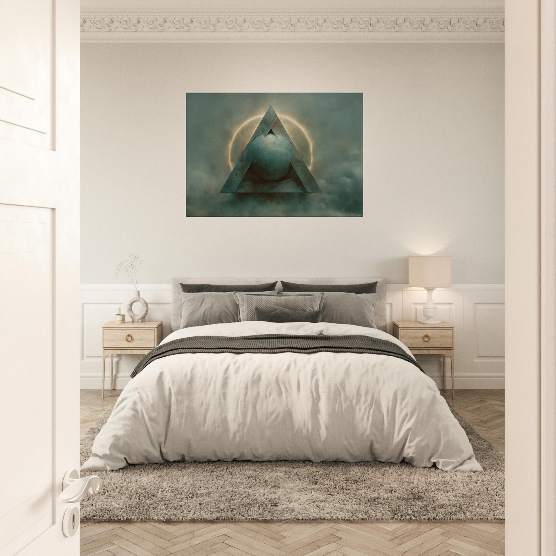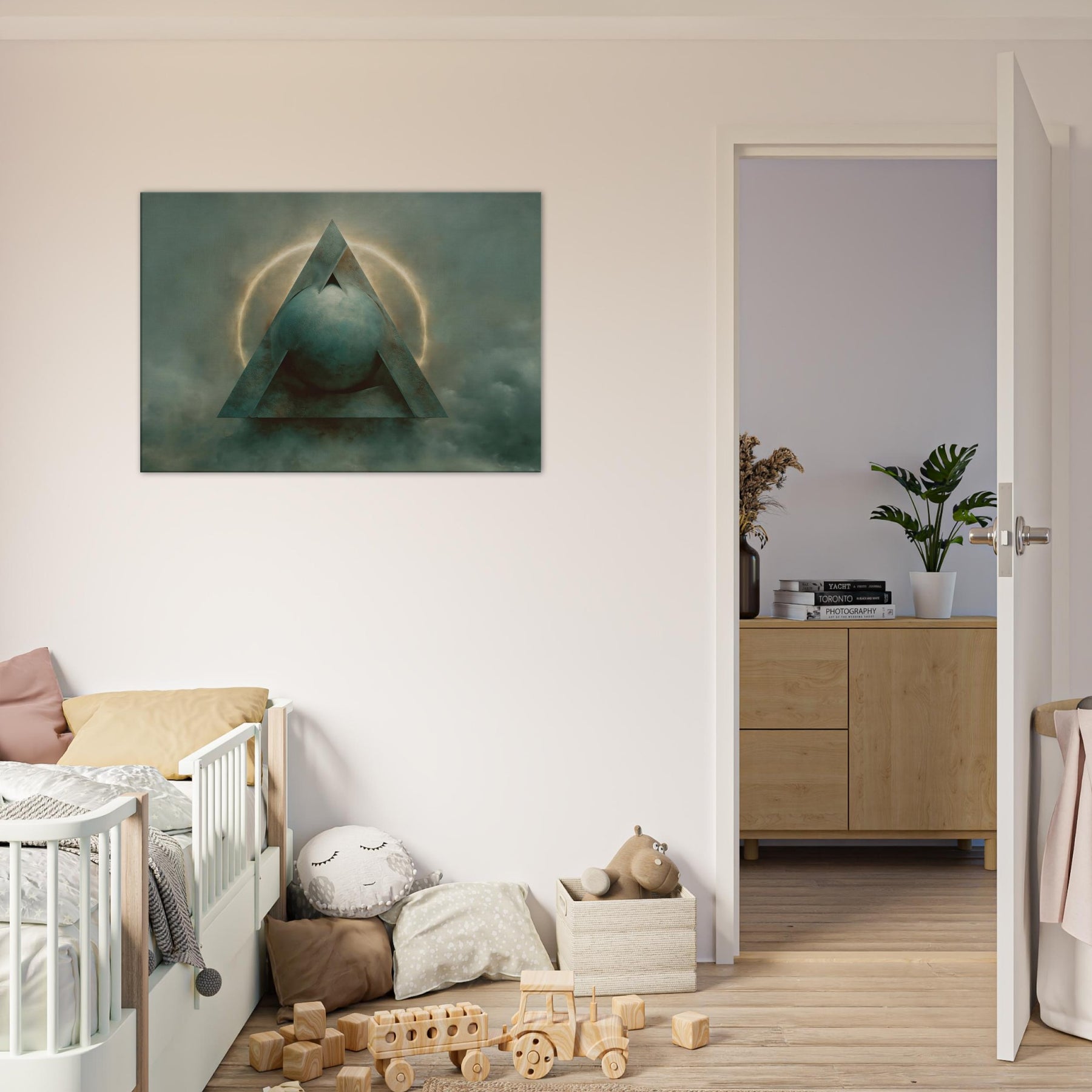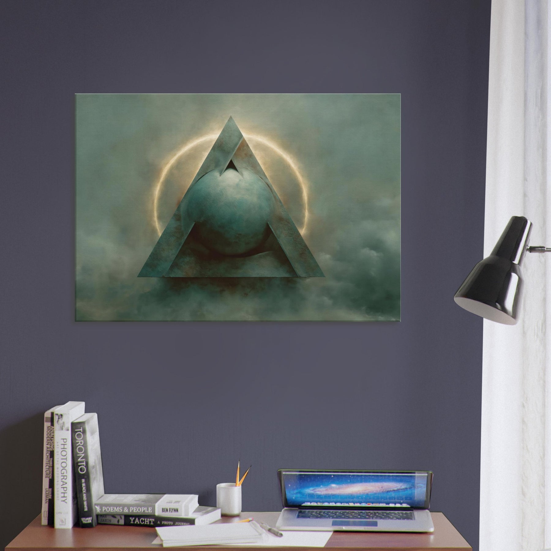 Let your wall breathe with the hush of arcane science. This piece conjures the Alchemy Symbols (Salt, Sulfur, Mercury) as a floating enigma: a teal green sphere anchored within a translucent triangle, haloed by a soft, celestial ring. Surreal textures mingle with weathered copper tones, inviting reflection and calm. The atmosphere settles like dusk in a quiet study or living room, turning everyday spaces into a chamber of mysteries where intention, balance, and wonder gather at a single focal point.