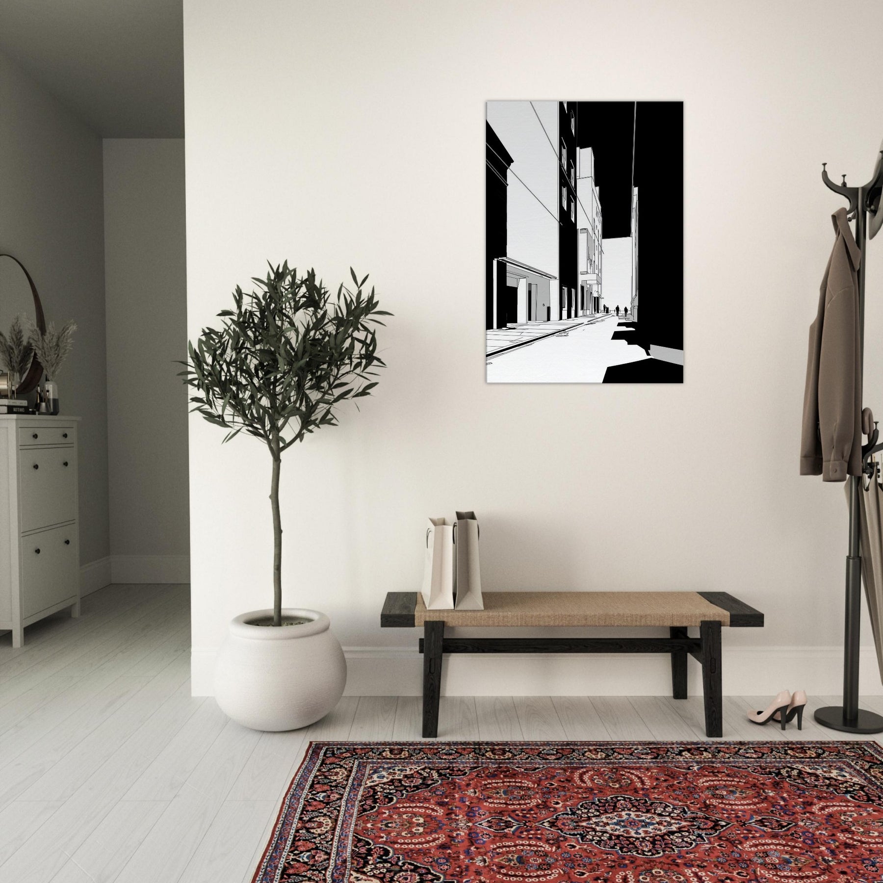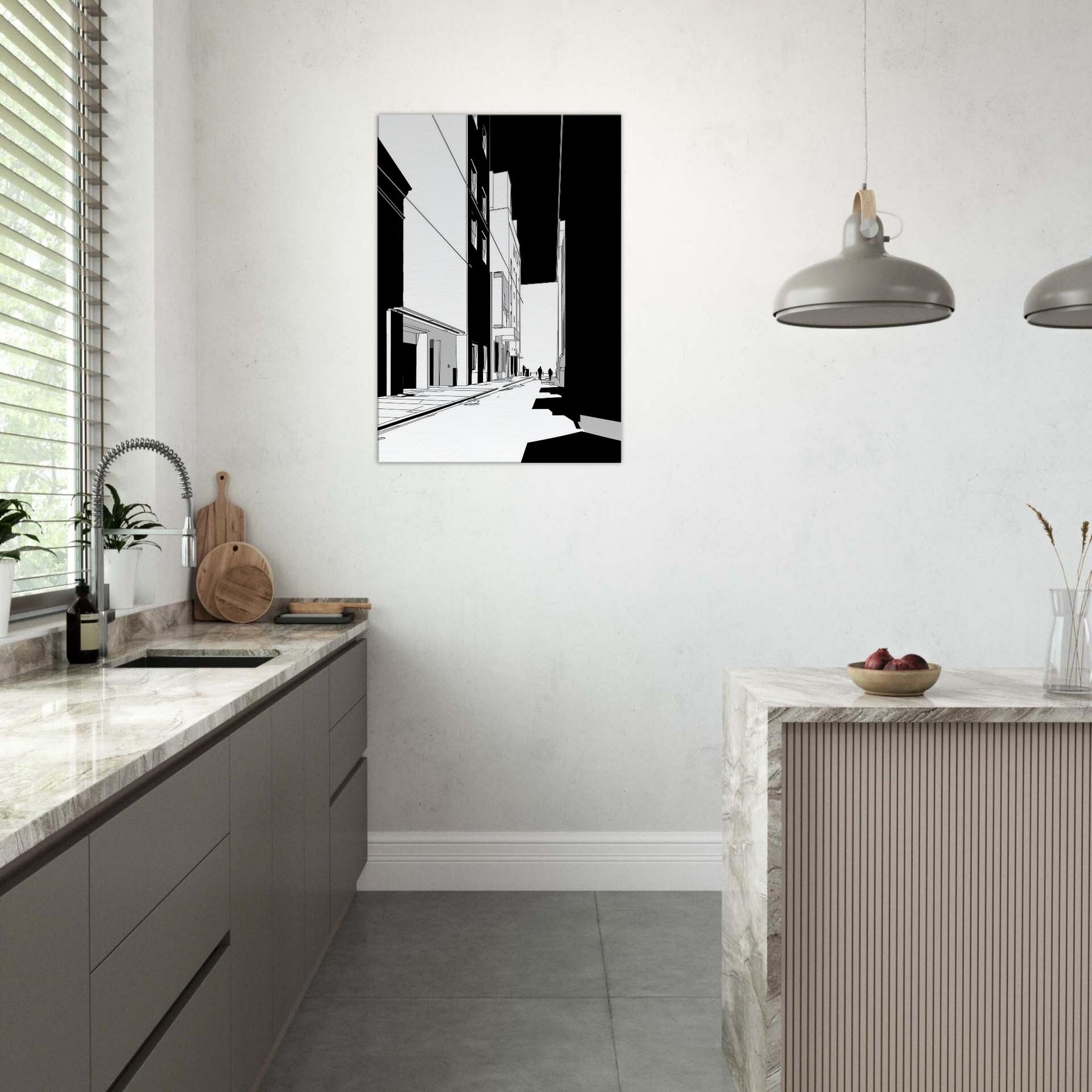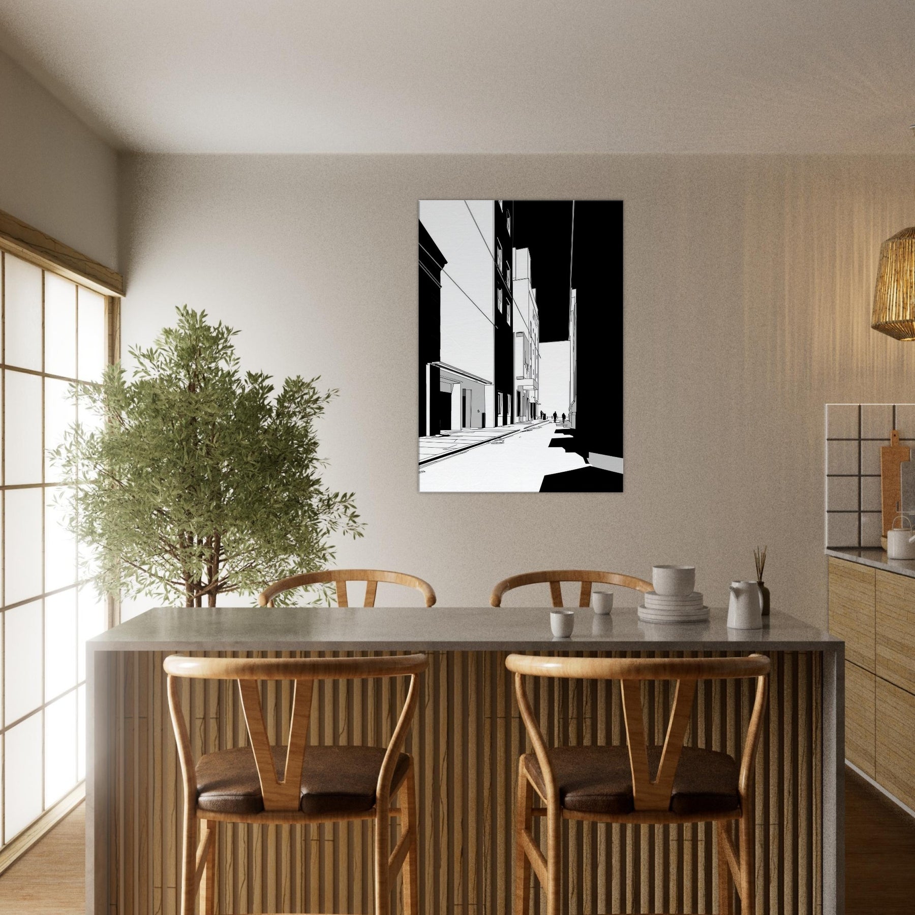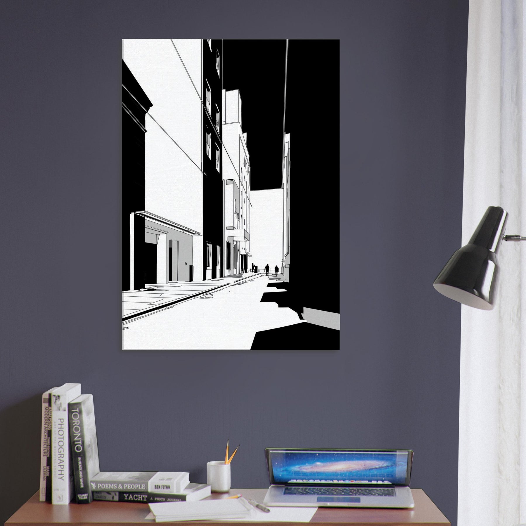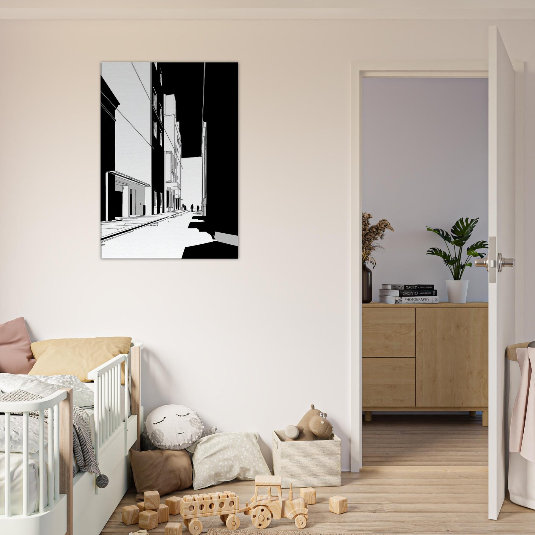 This striking Alley Perspective line drawing trims the city to its essential edges white avenues, ink dark shadows, and crisp architectural silhouettes. The bold contrasts and clean lines create a sense of quiet, spacious air that lengthens walls and invites slow, reflective moments. In a living room or hallway, the piece acts as a window to the city, coaxing light to dance along your furniture and turning everyday spaces into contemplative architectural poetry.